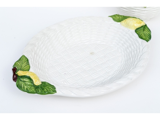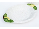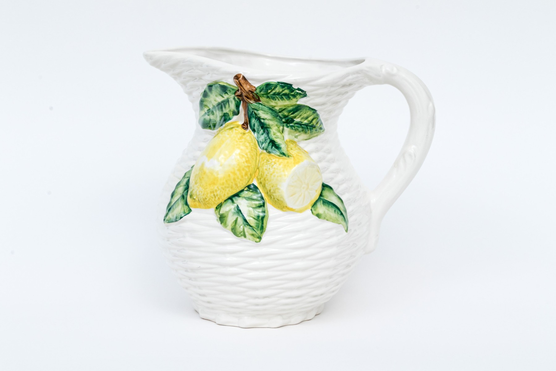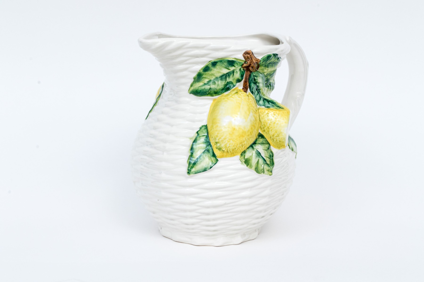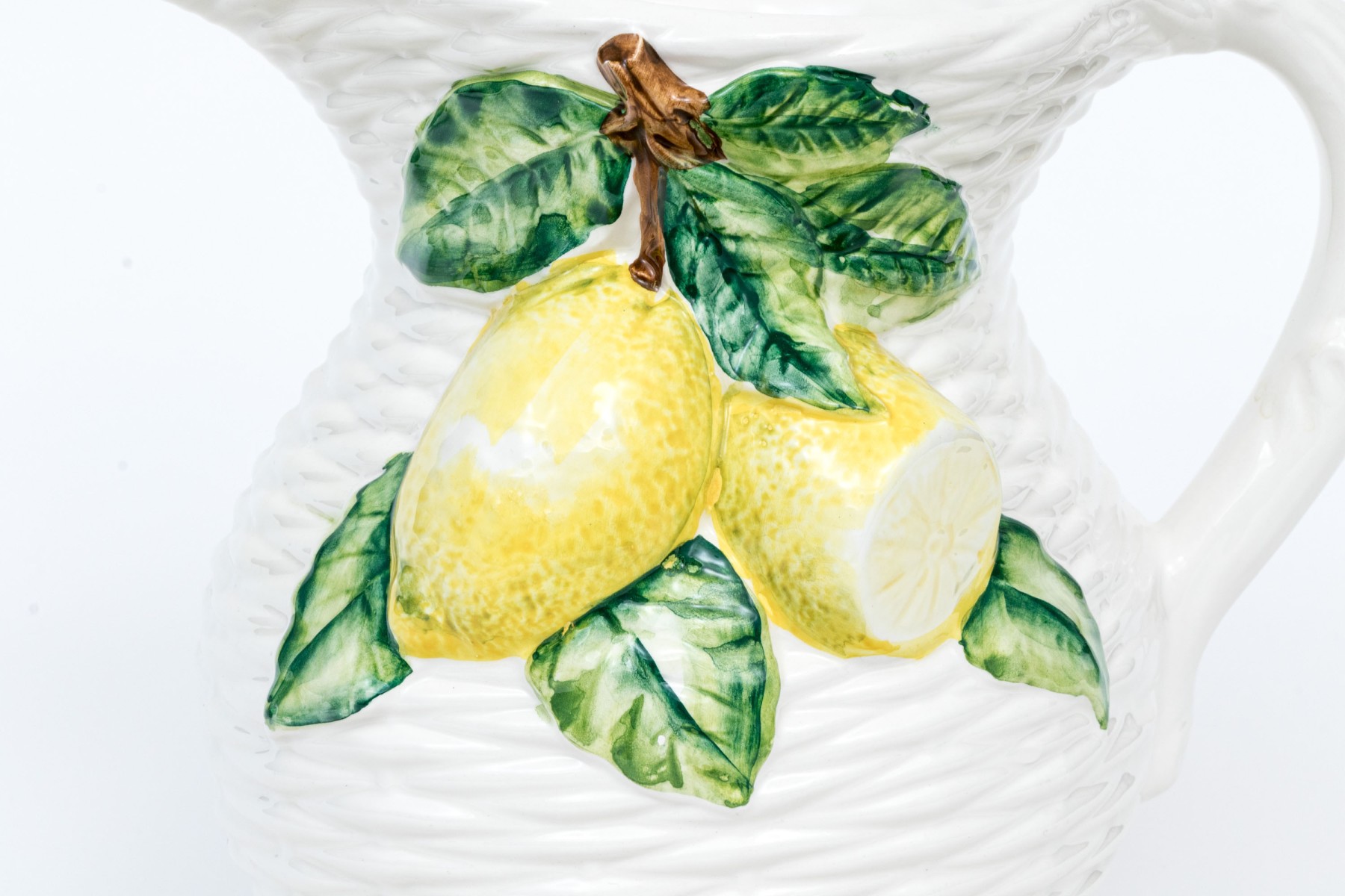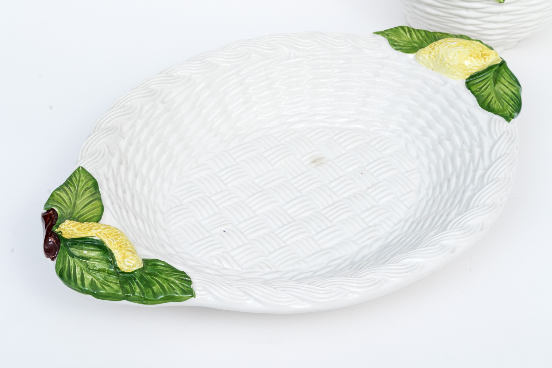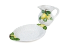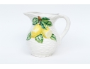 Basket weave ceramic pieces with lemon detail. Platter: 15” long x 10” wide, small nick to the lemon leaf on the top; Pitcher measures: 8” high