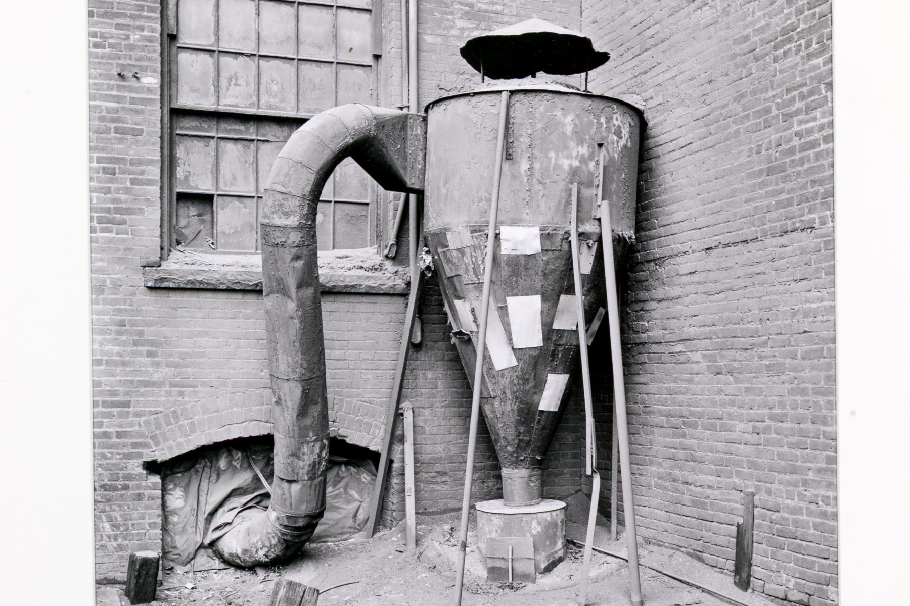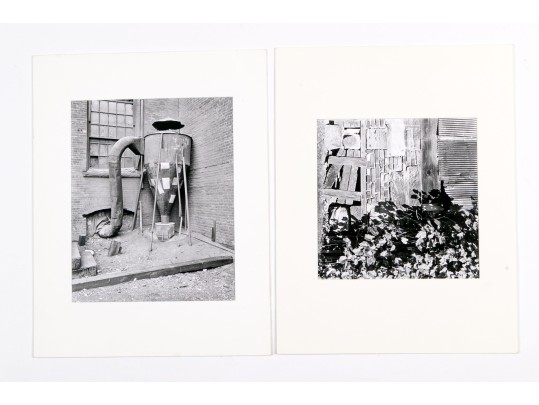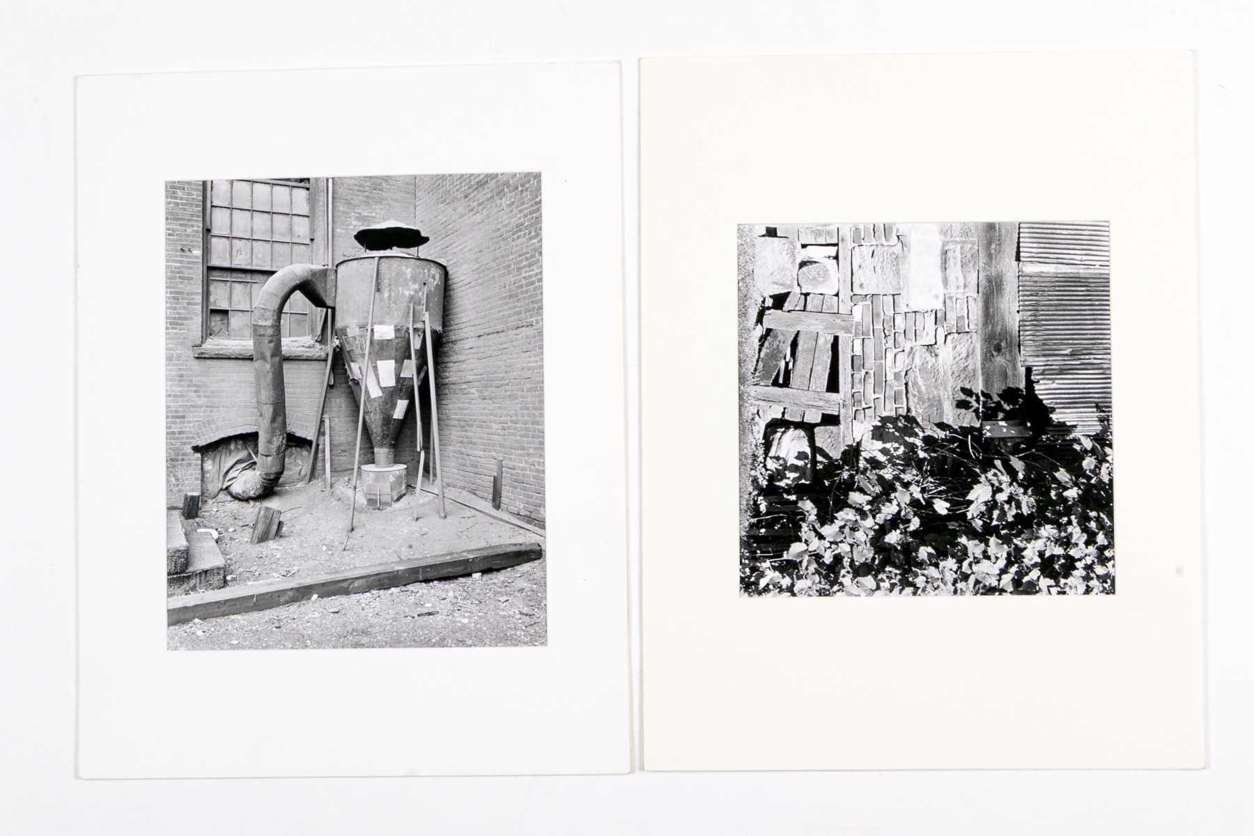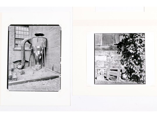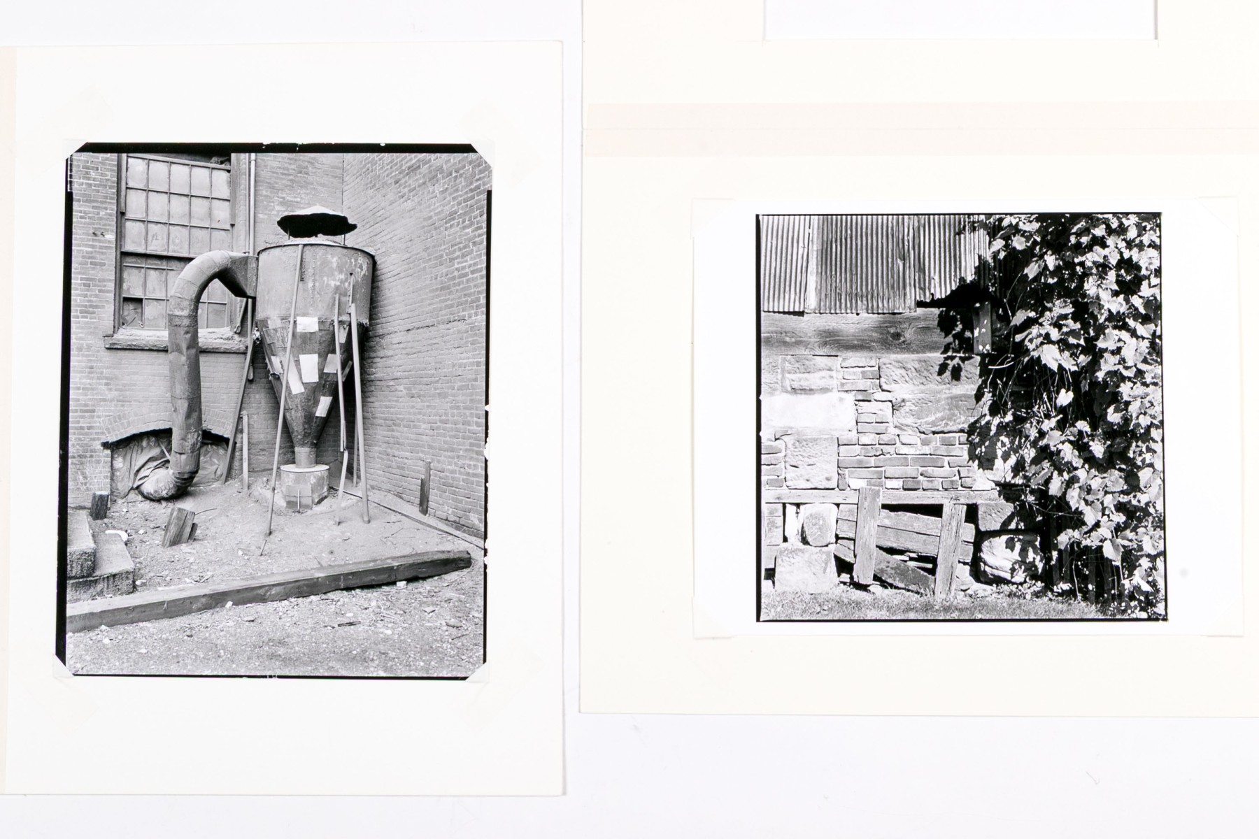 A duo of gelatin silver prints by Michael Miller depicting vintage architectural scenes, including one with a cyclone dust collector and another with foliage in front of a brick, wood, and sheet metal facade. Unframed.