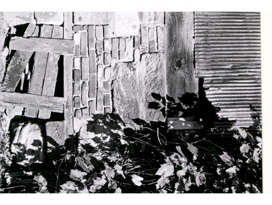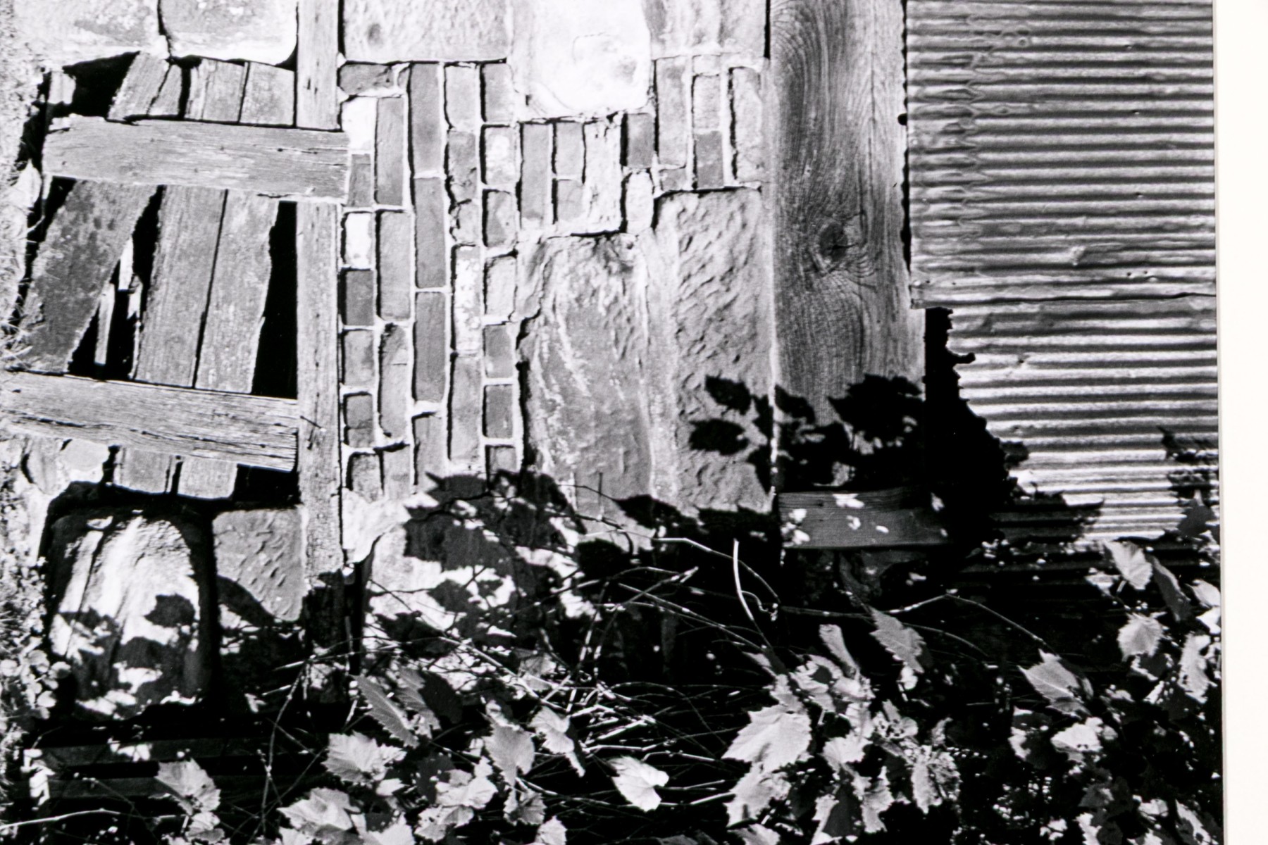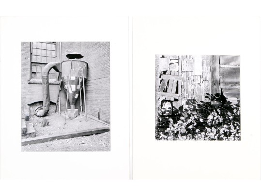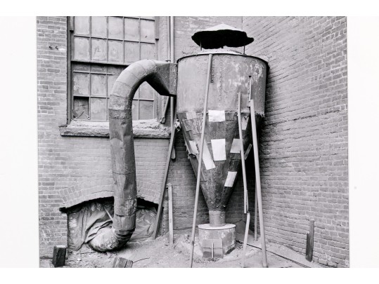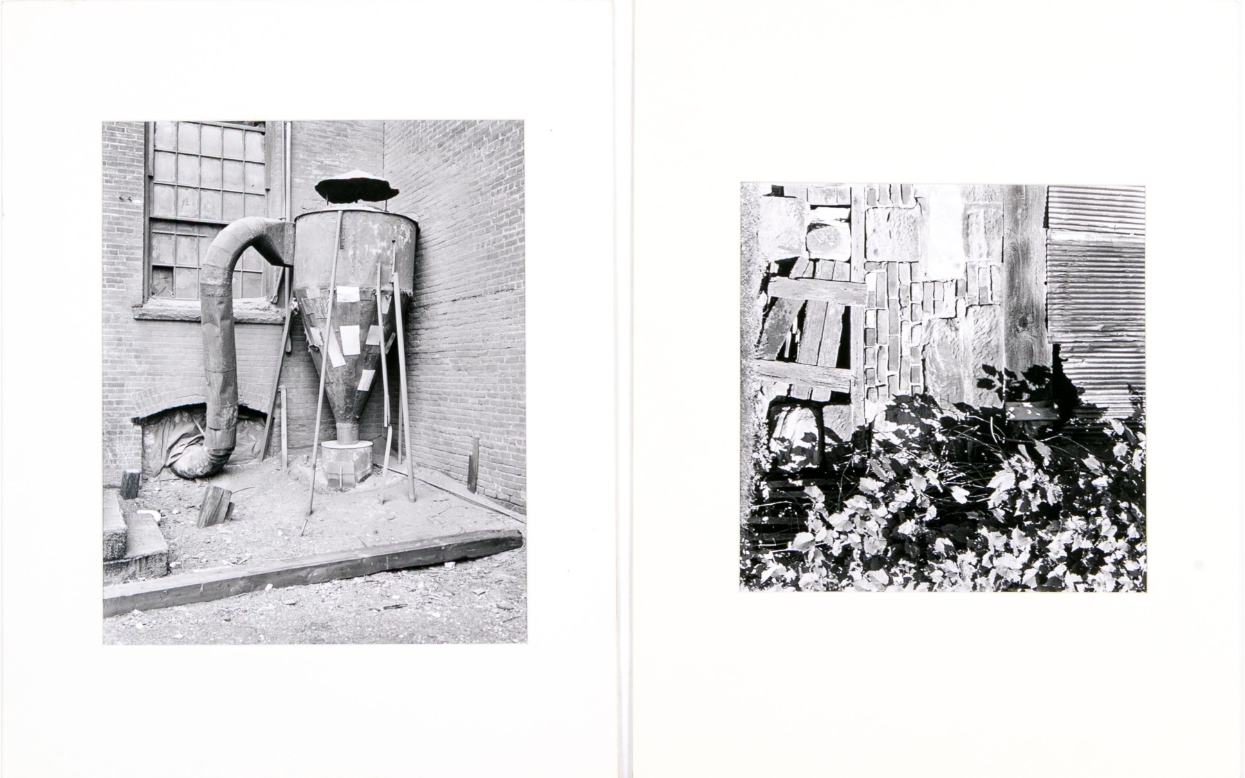 A duo of gelatin silver prints by Michael Miller depicting vintage architectural scenes, including one with a cyclone dust collector and another with foliage in front of a brick, wood, and sheet metal facade. Unframed.