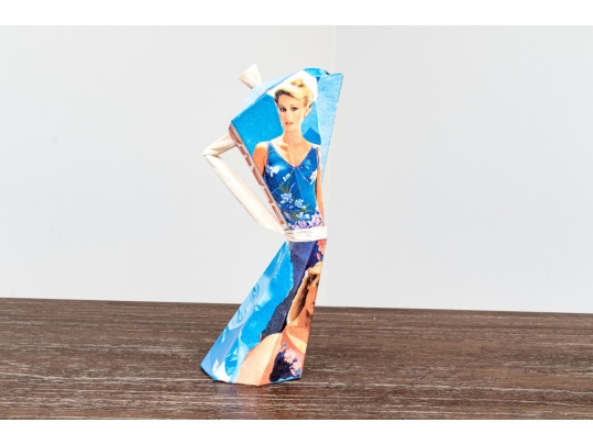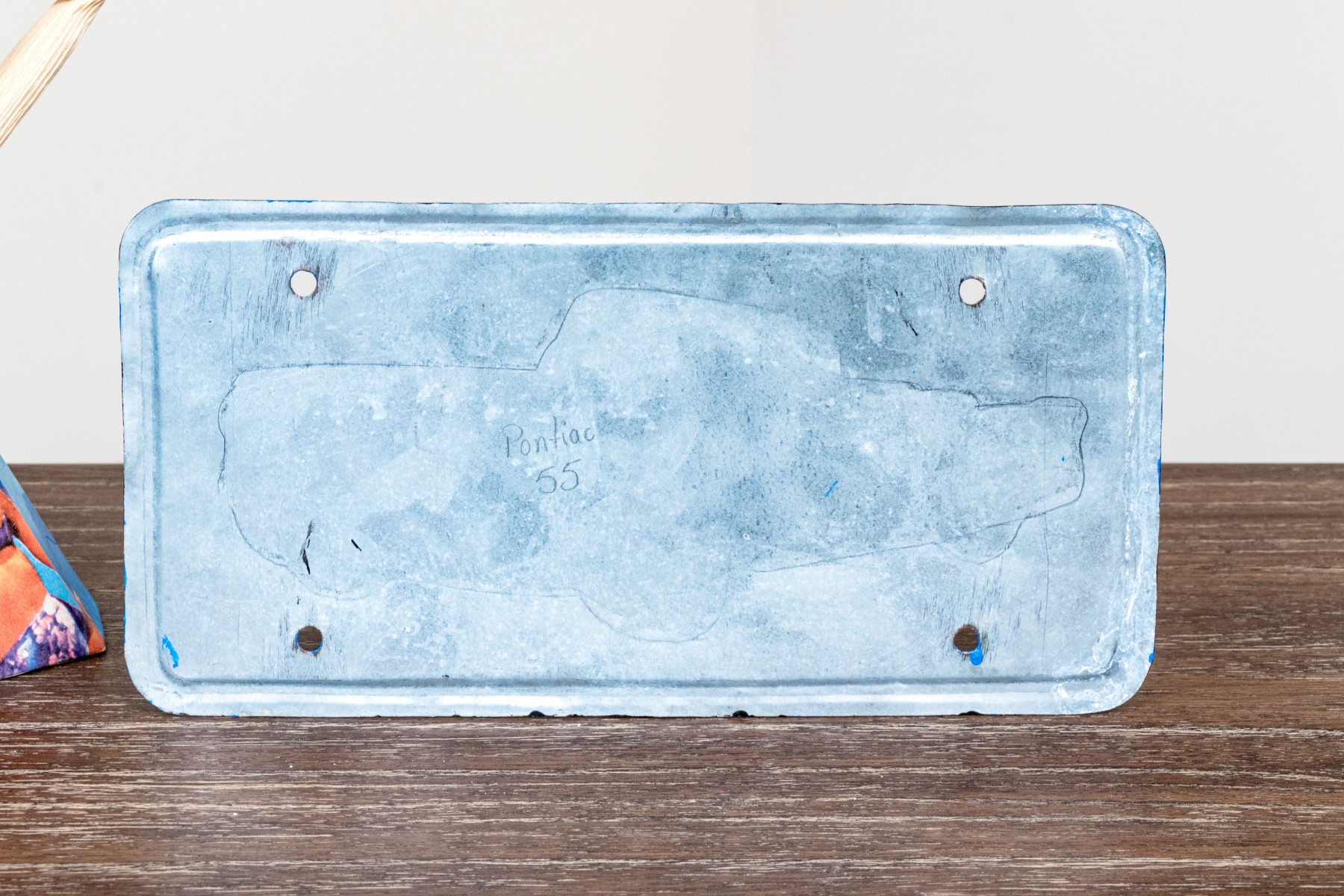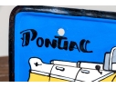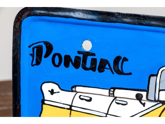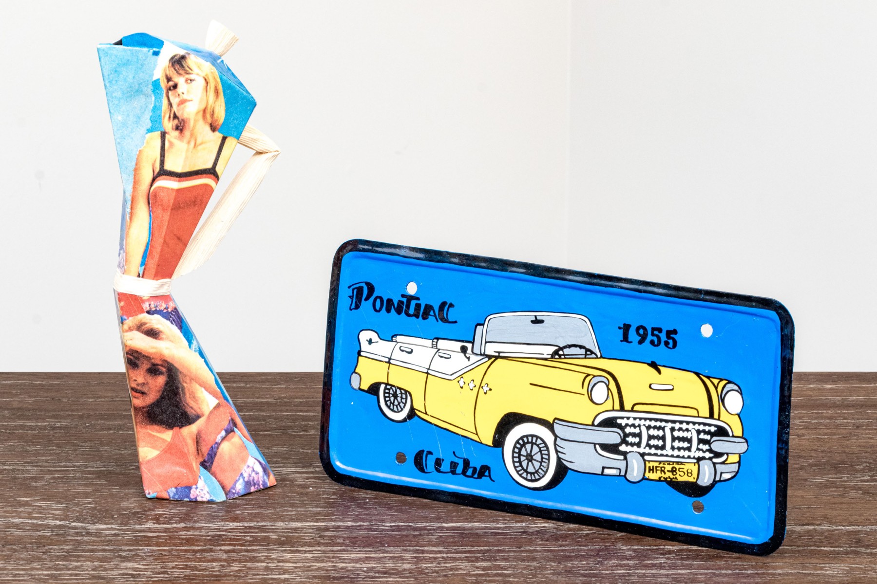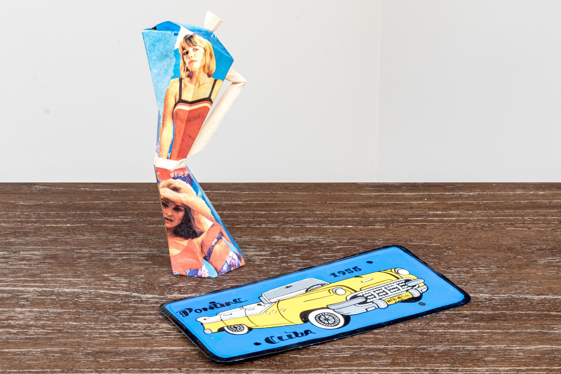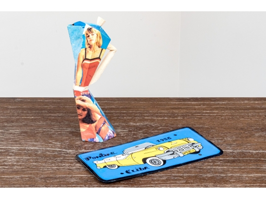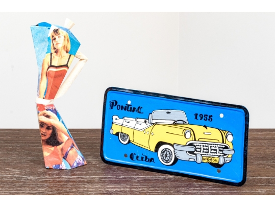 A fun lot of decorative items including a license plate styled plaque featuring a yellow Pontac over a blue background, and a paper origami styled kettle sculpture with vintage imagery of swimsuit models.