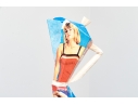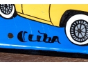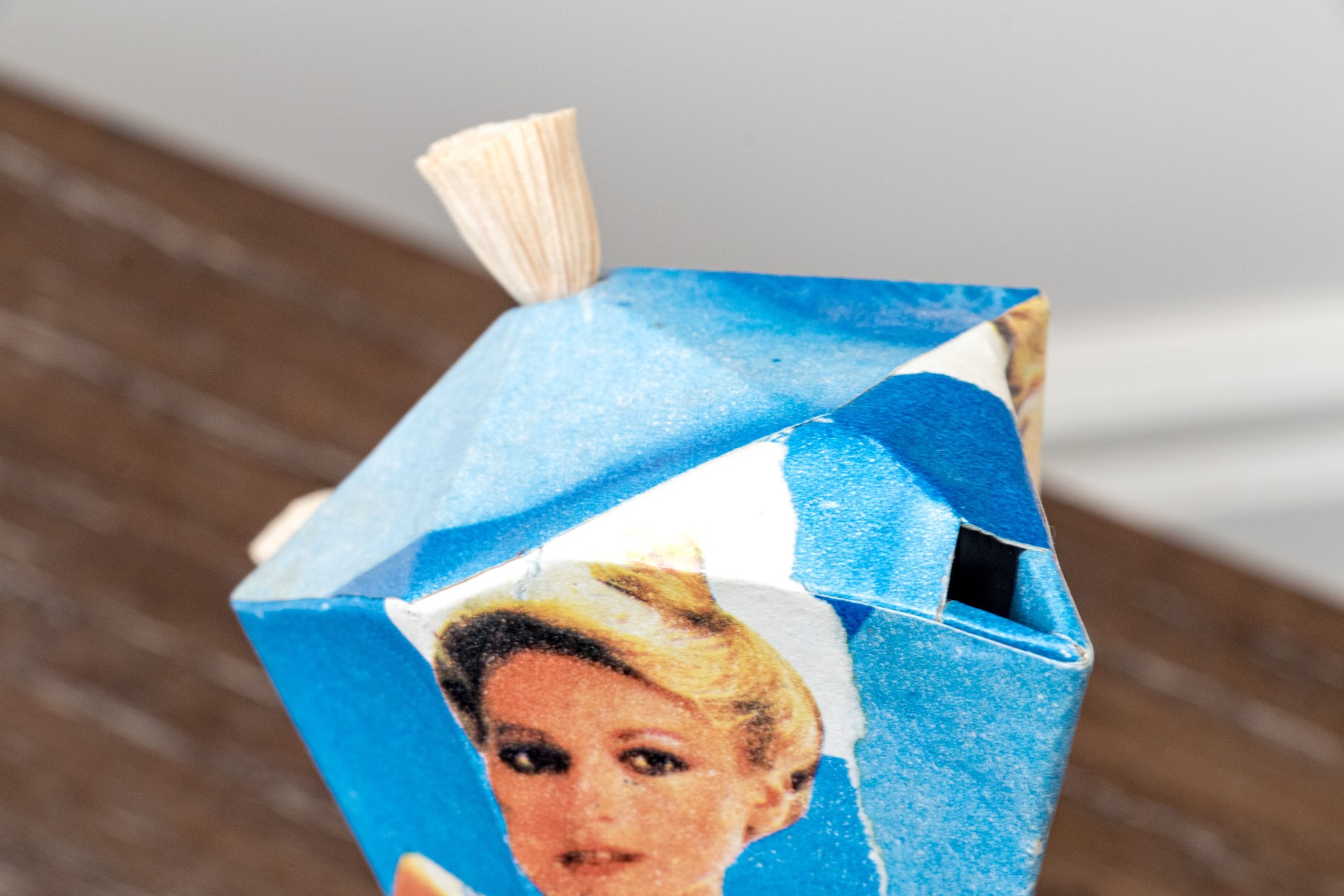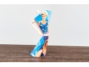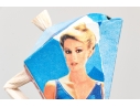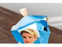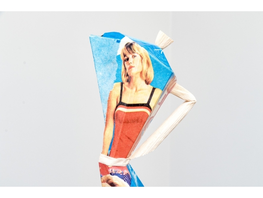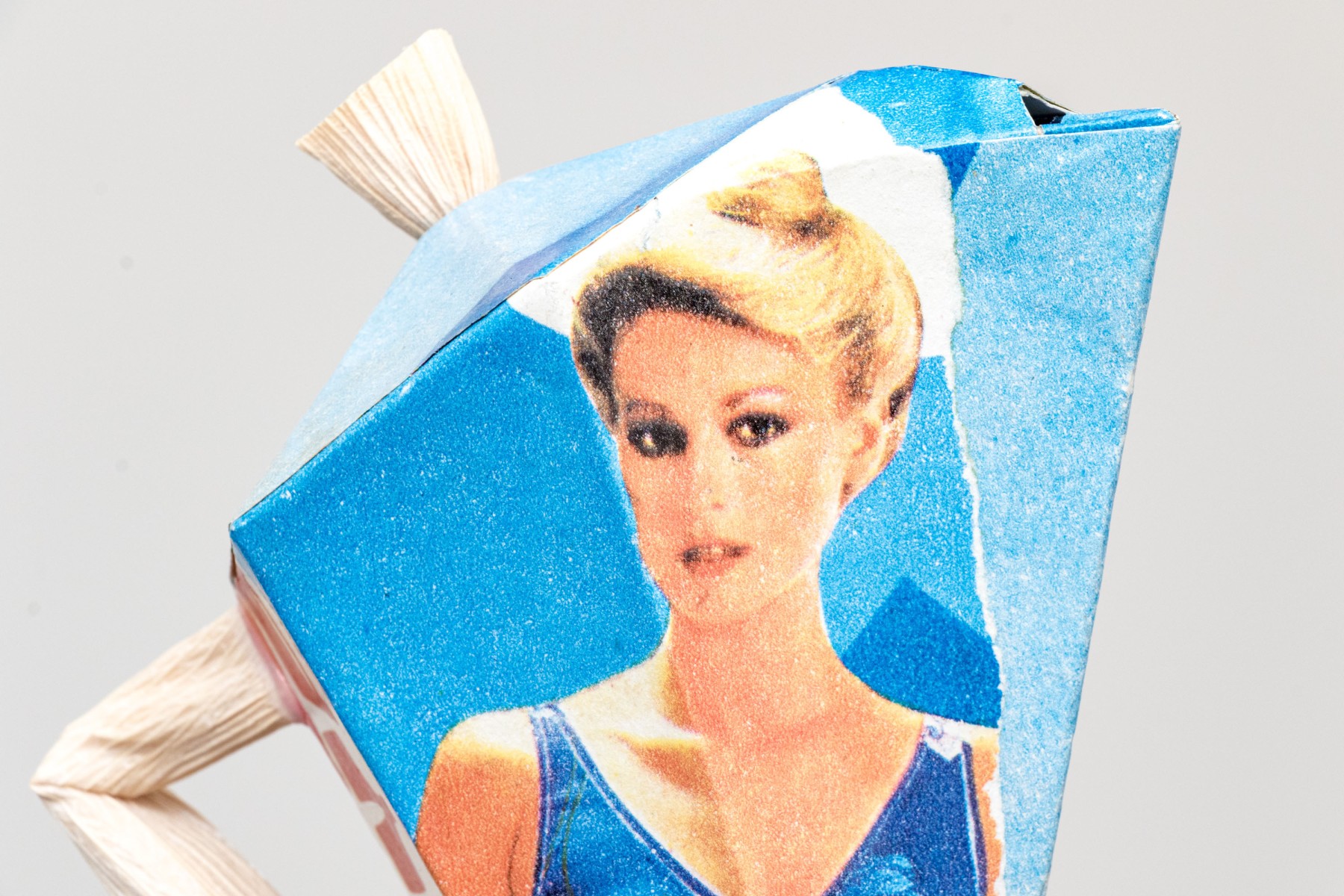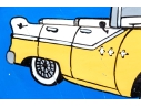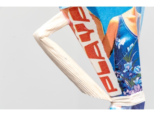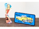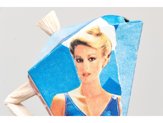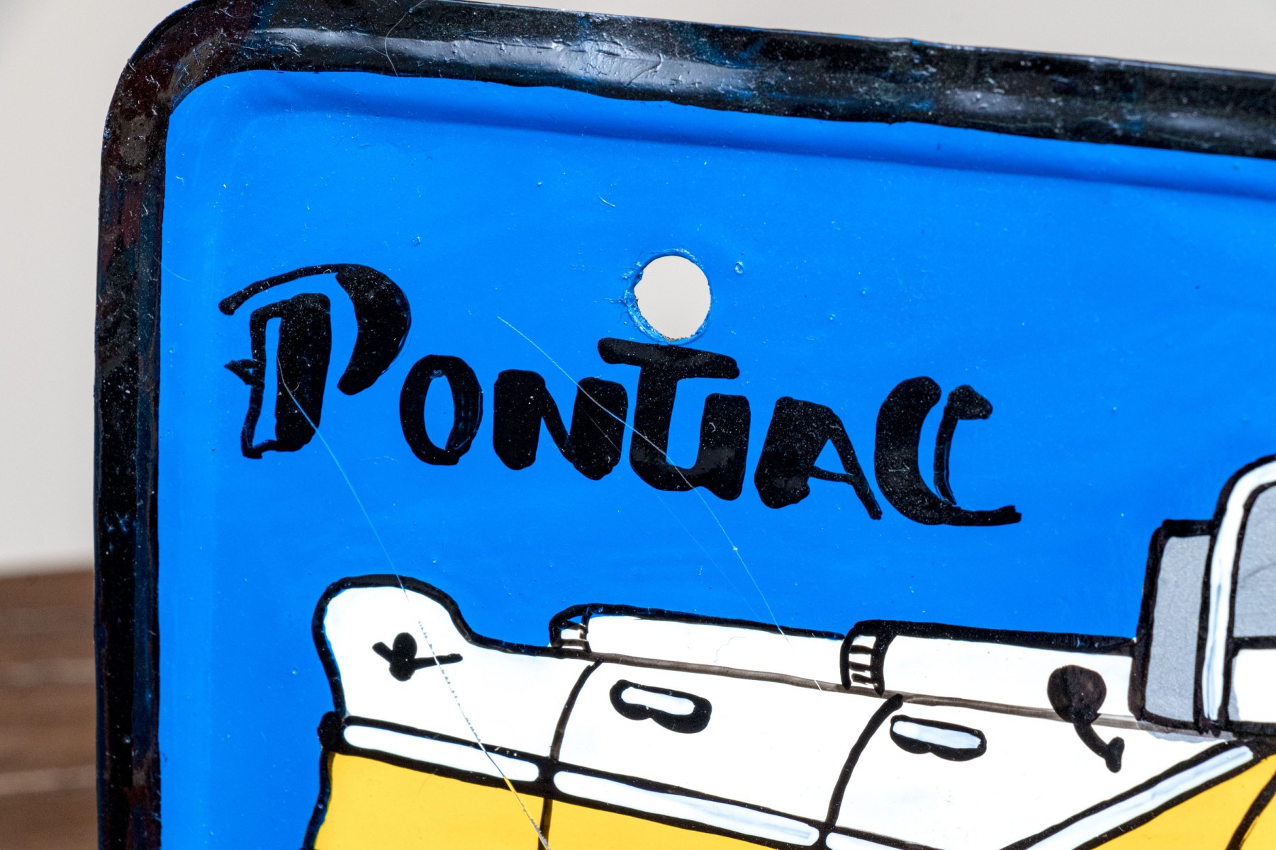 A fun lot of decorative items including a license plate styled plaque featuring a yellow Pontac over a blue background, and a paper origami styled kettle sculpture with vintage imagery of swimsuit models.