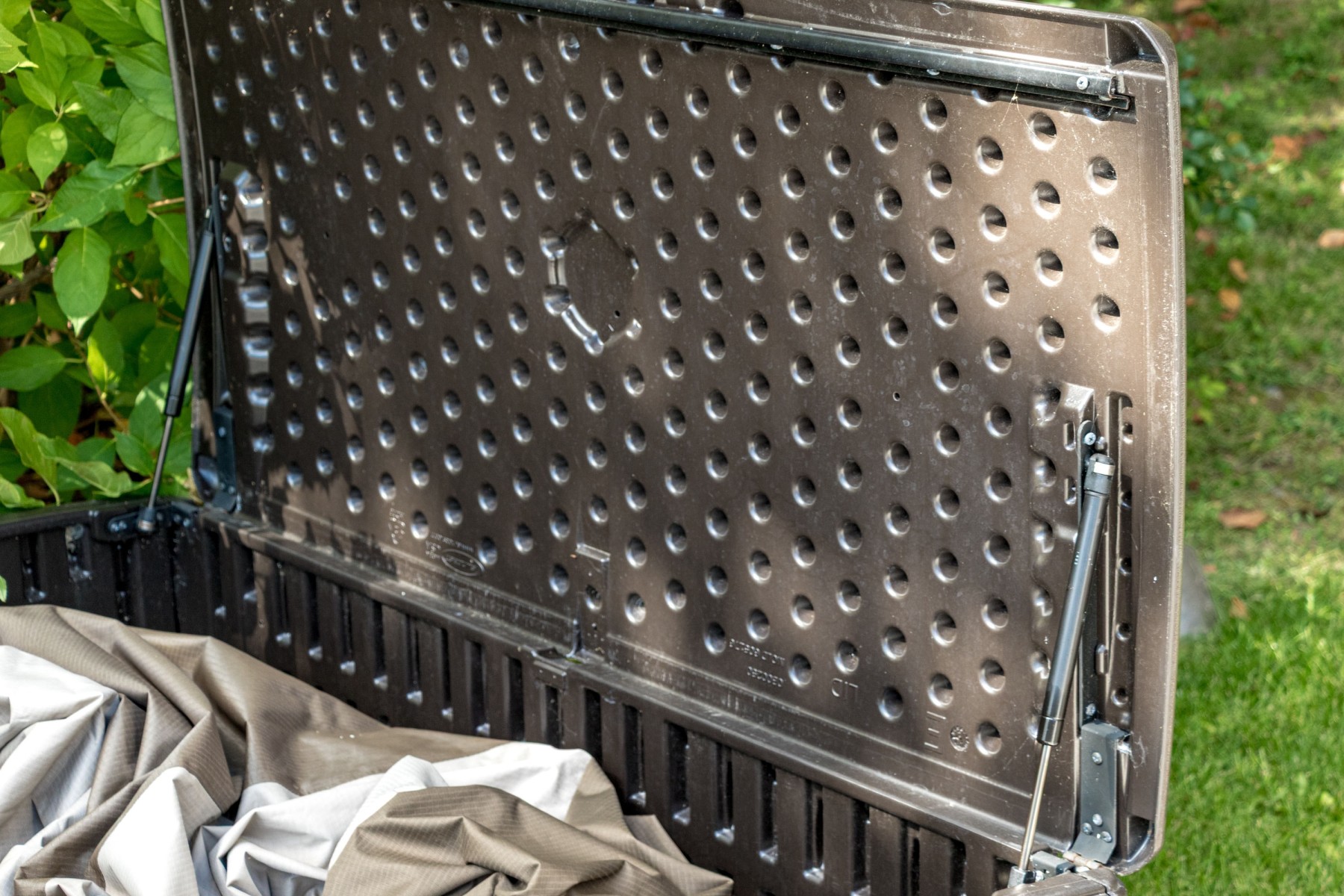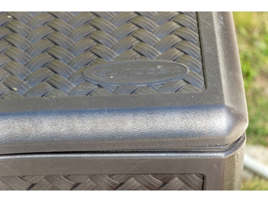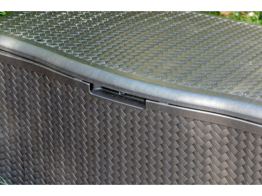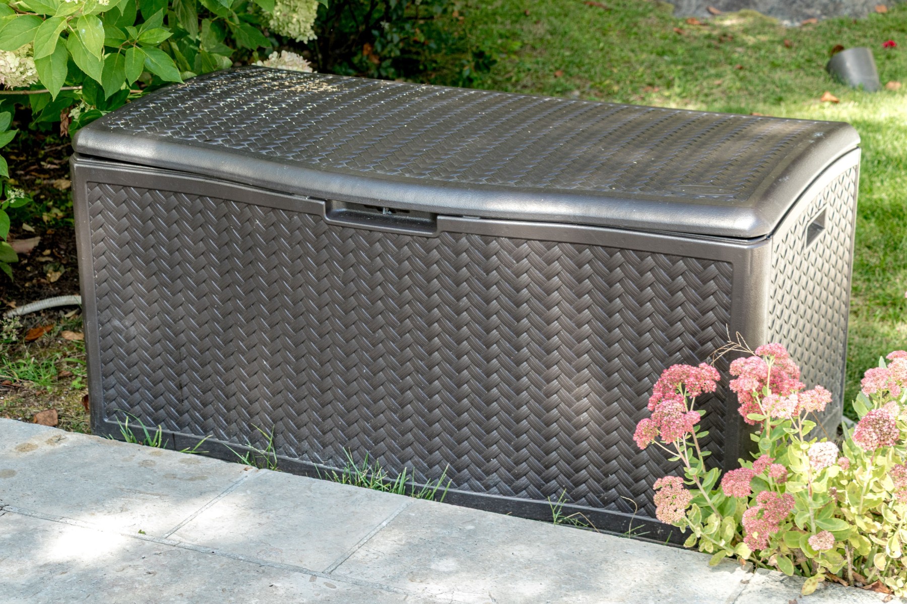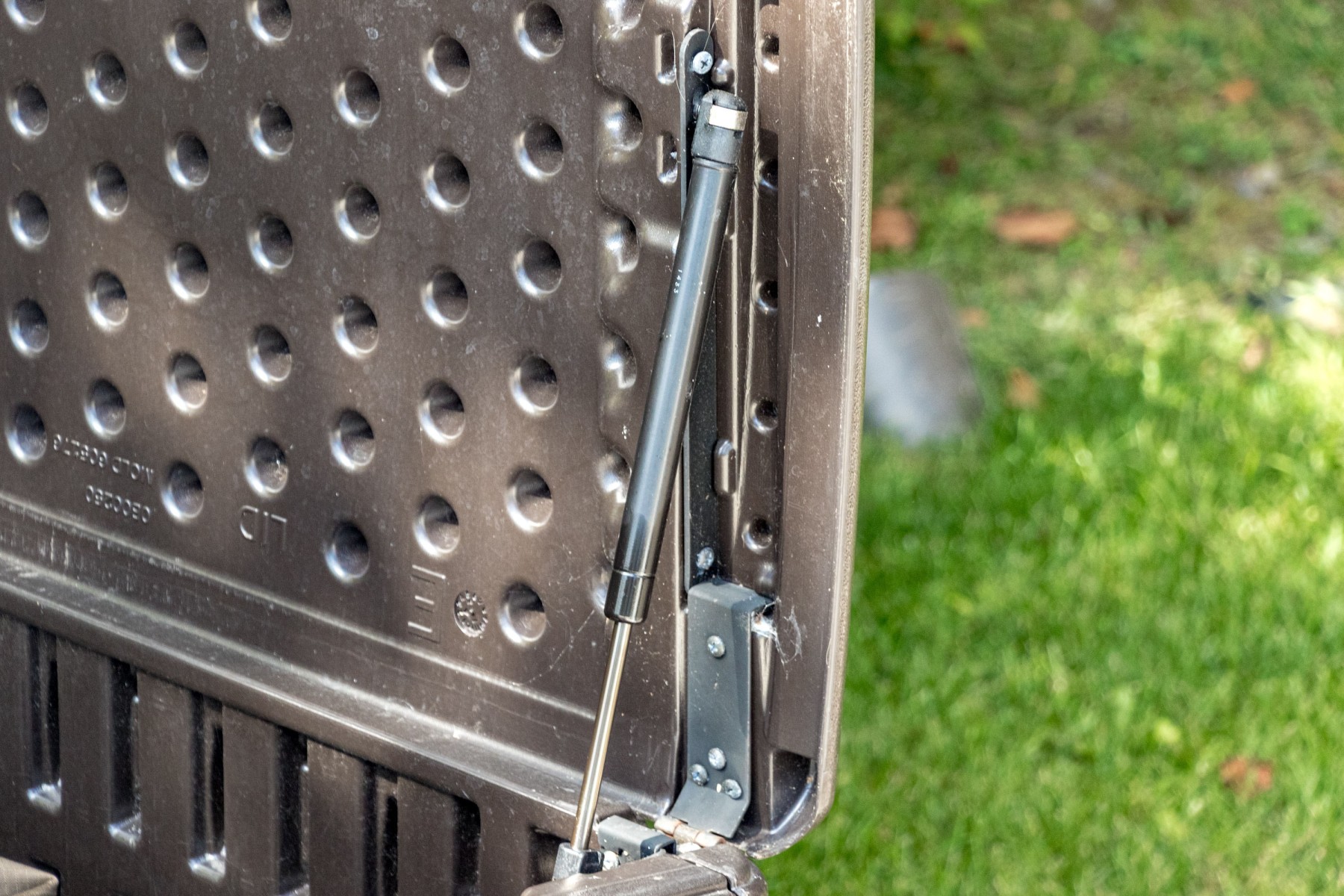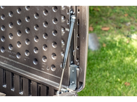 A wonderful resin Suncast storage bin with a hydraulic opening mechanism.