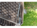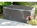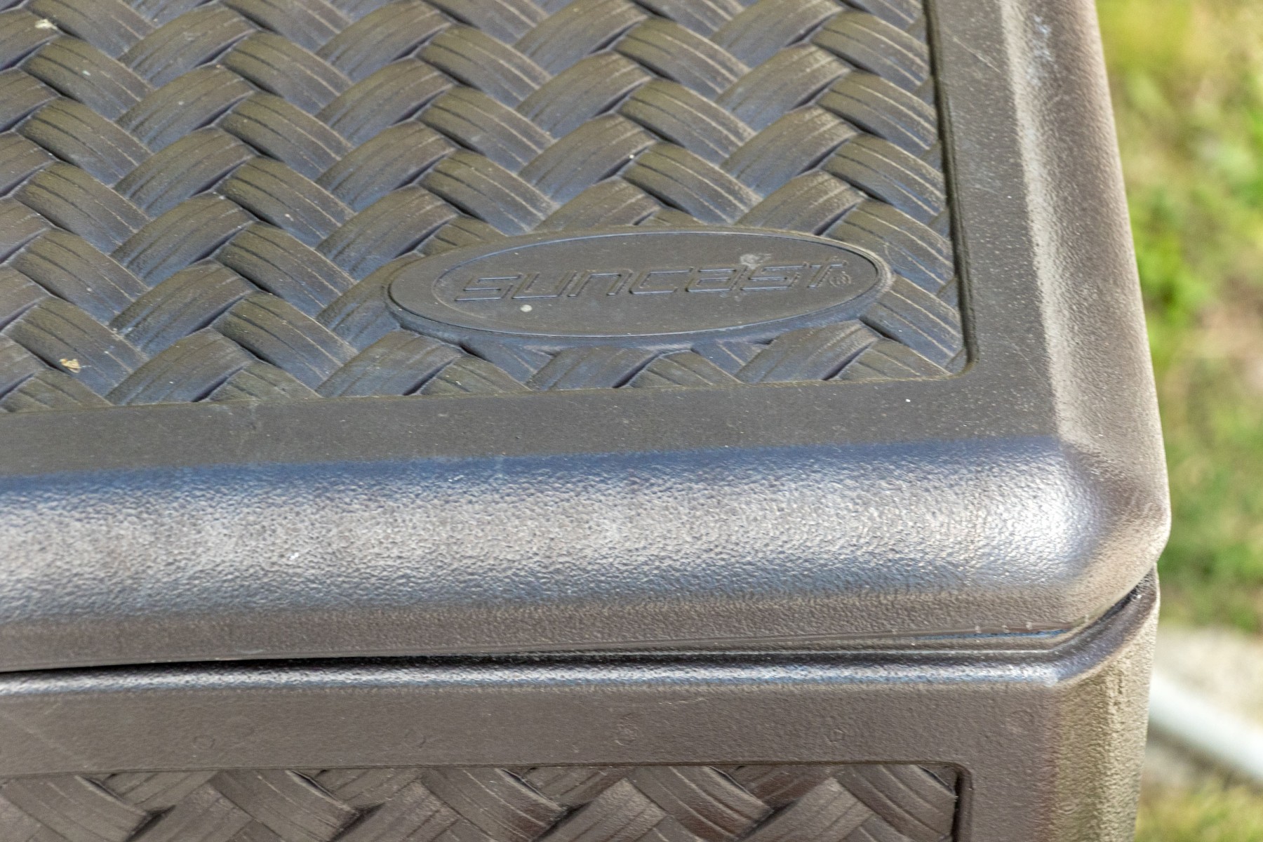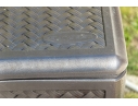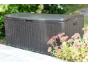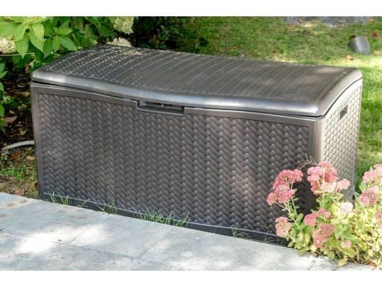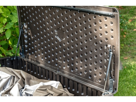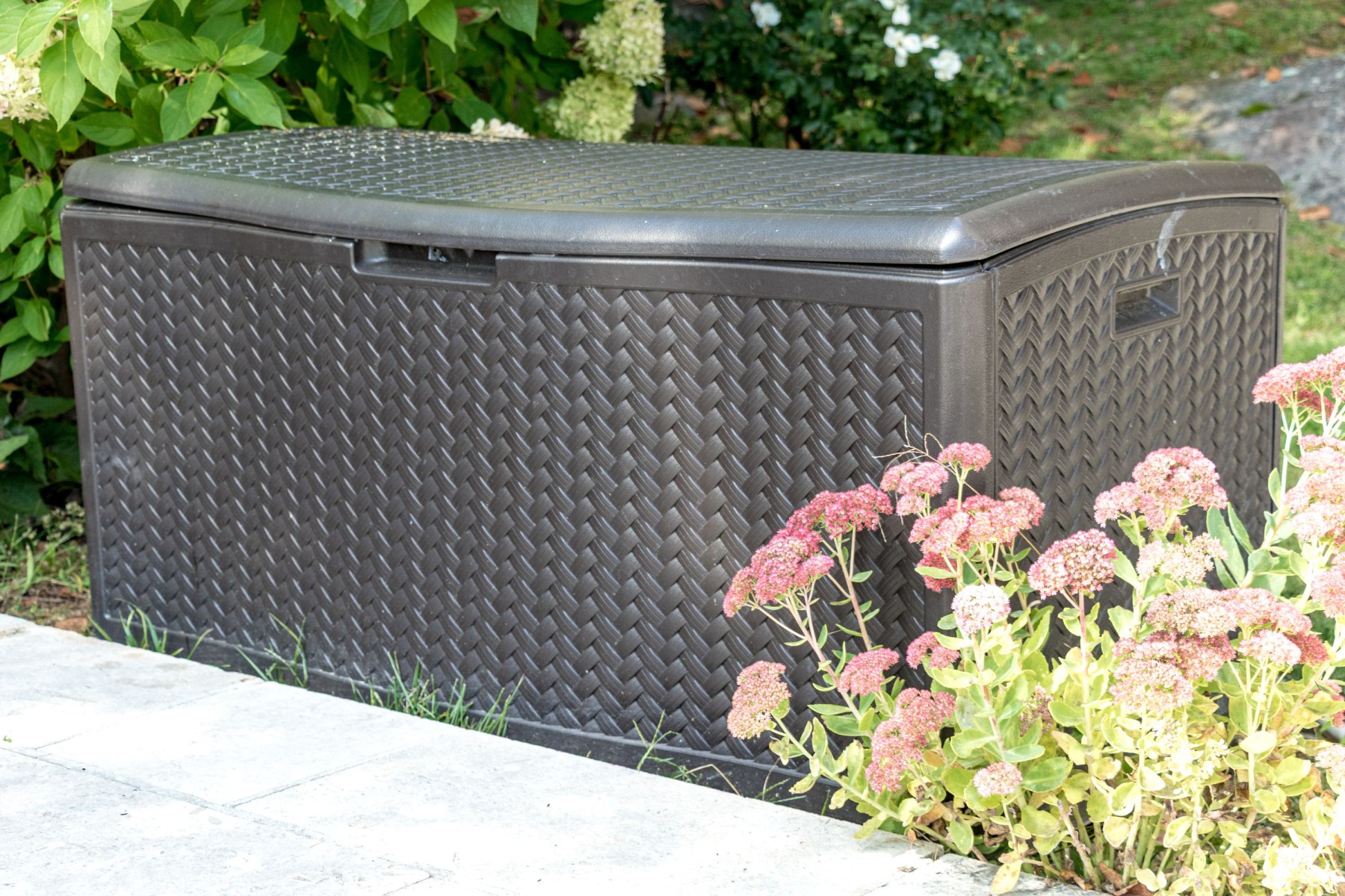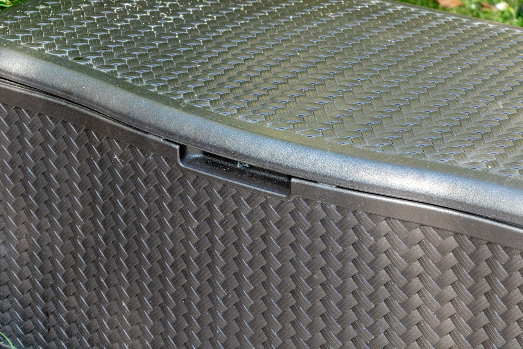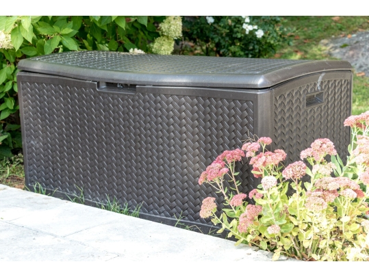 A wonderful resin Suncast storage bin with a hydraulic opening mechanism.