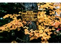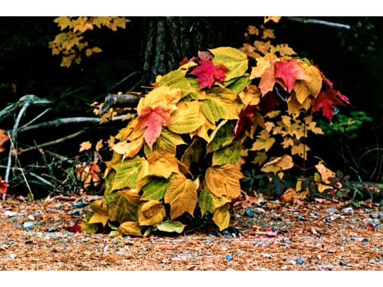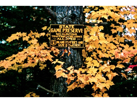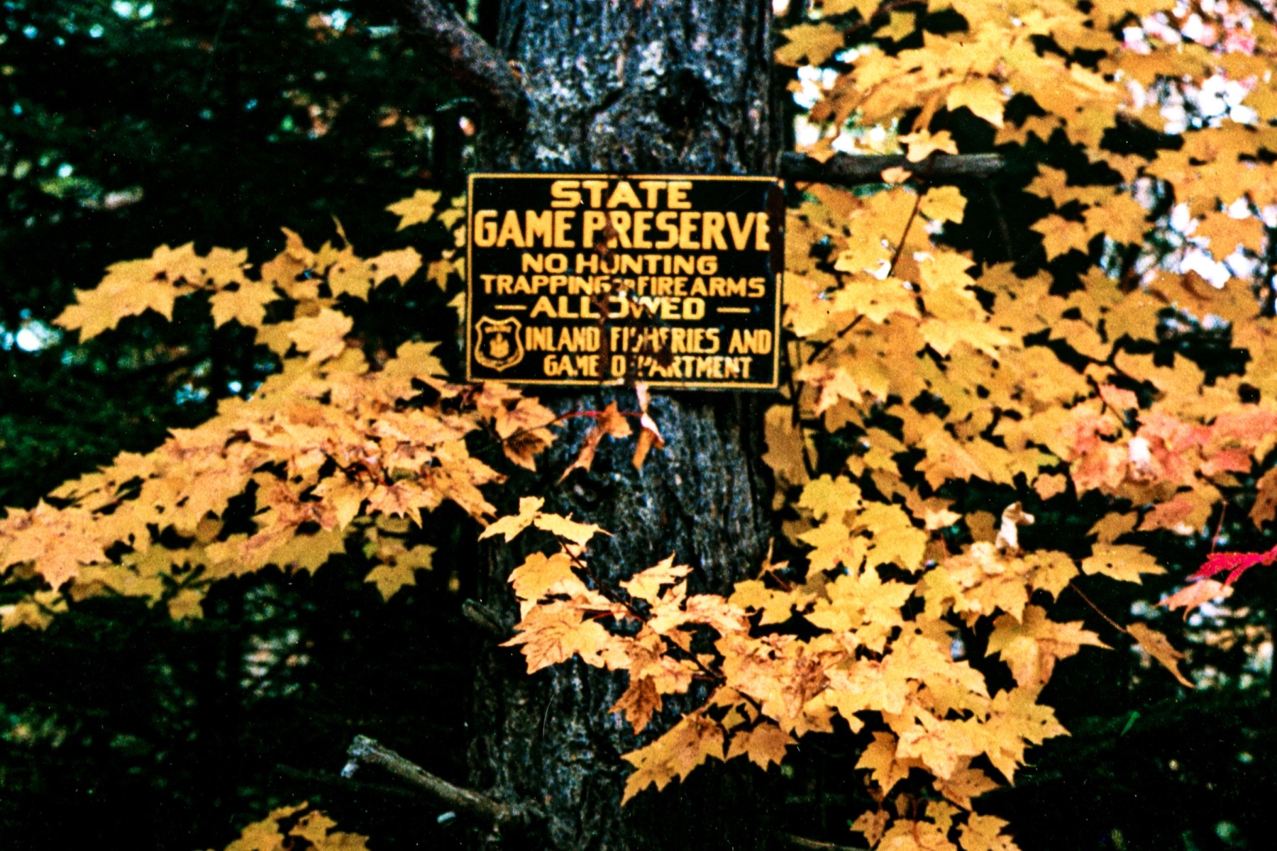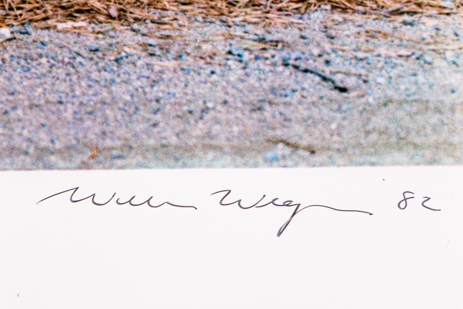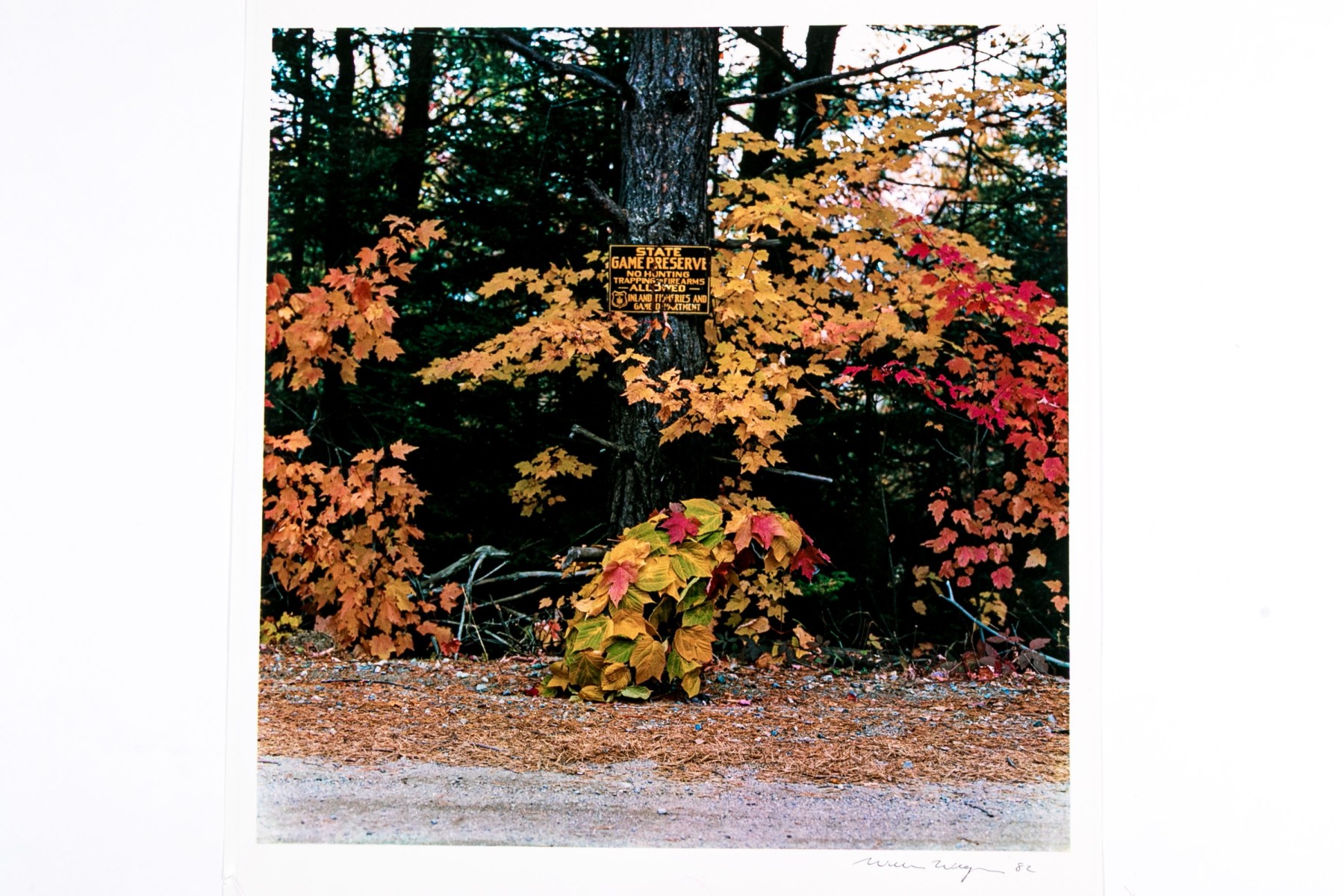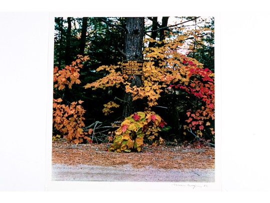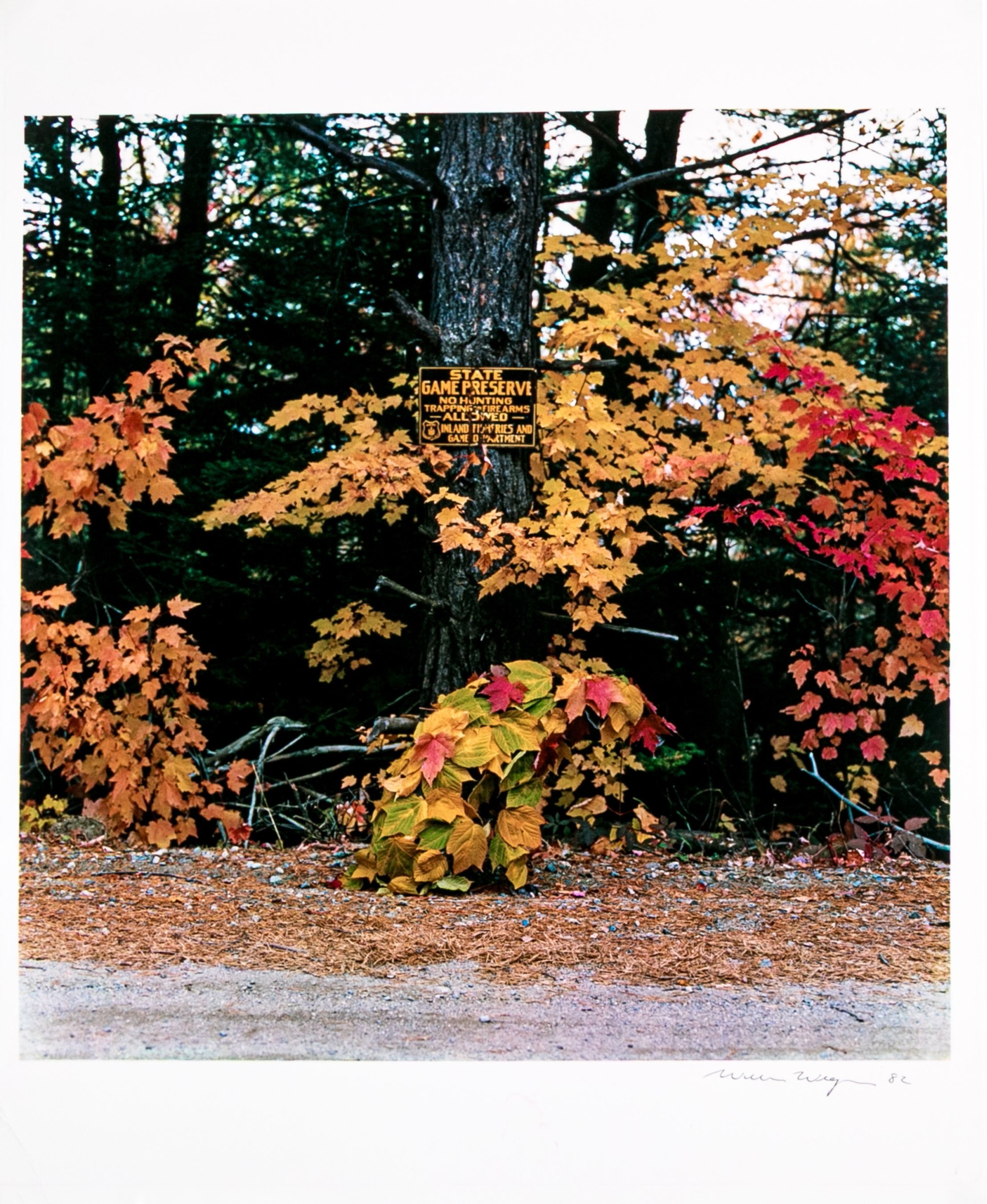 William Wegman (American, b. 1943) "Rangely Maine" (1981) Dye-transfer depicting a vibrant Autumn landscape with a State Game Preserve sign mounted to a tree at the center of the composition echoing the warn orange and red hues of surrounding foliage. Pencil signed and dated '82 lower right. Unframed.