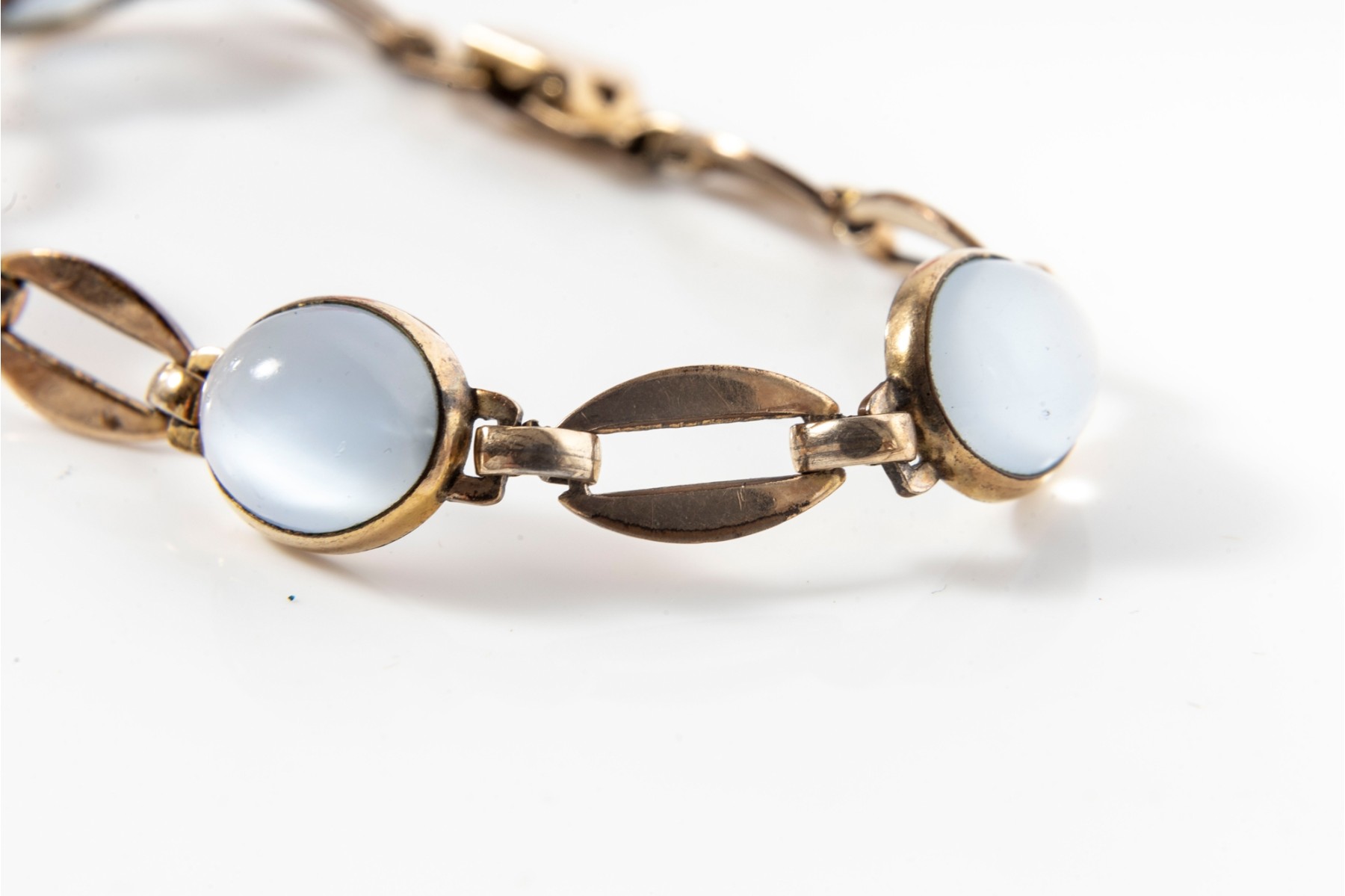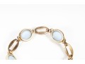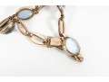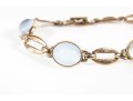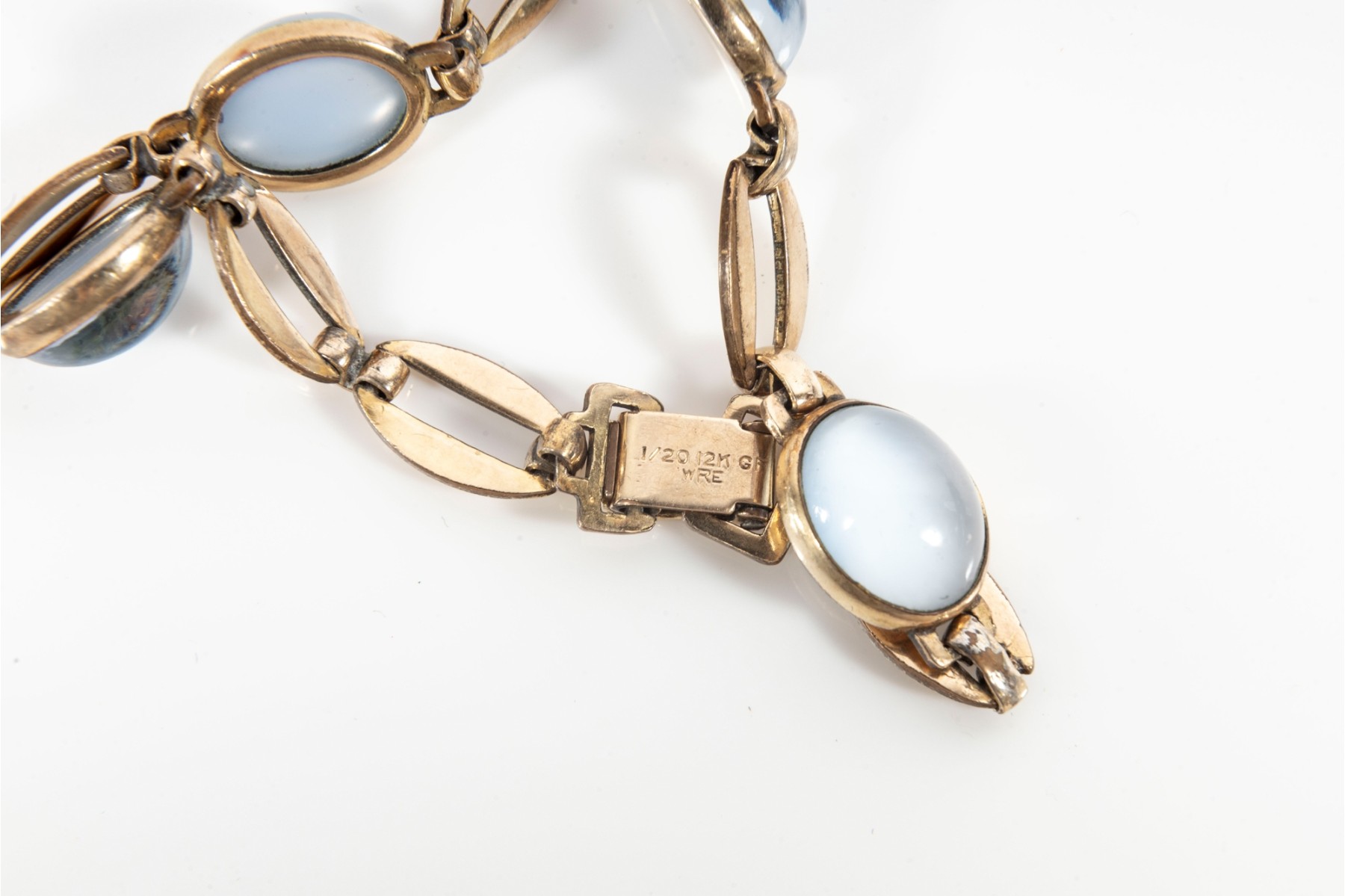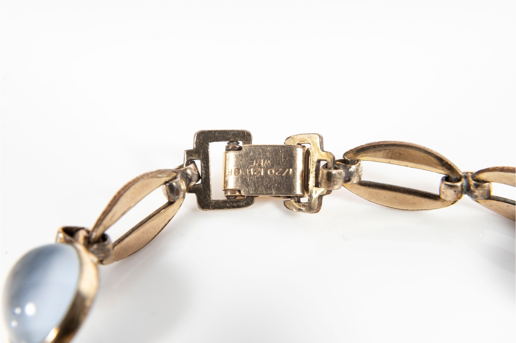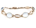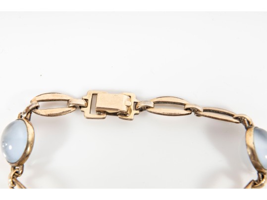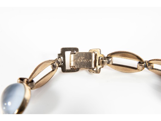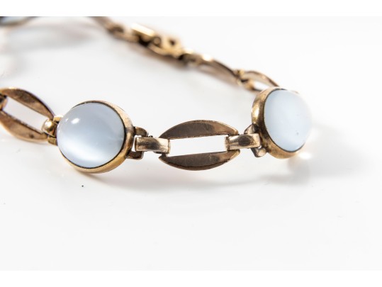 Made with 12K gold-filled material, this limited edition bracelet produced by W.E. Richards features enchanting cat's eye moonstone cabochons, each stone exhibiting a soft, ethereal glow with subtle chatoyancy.