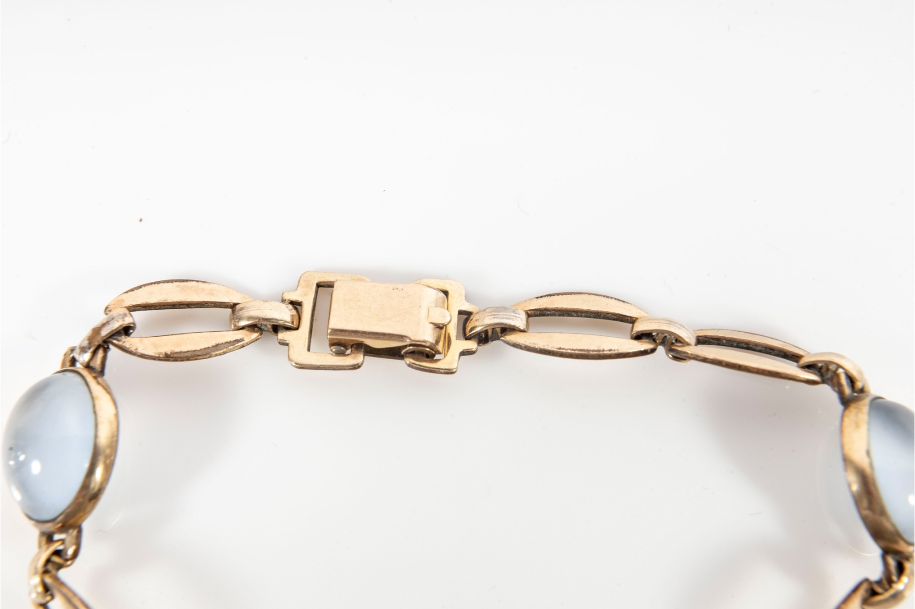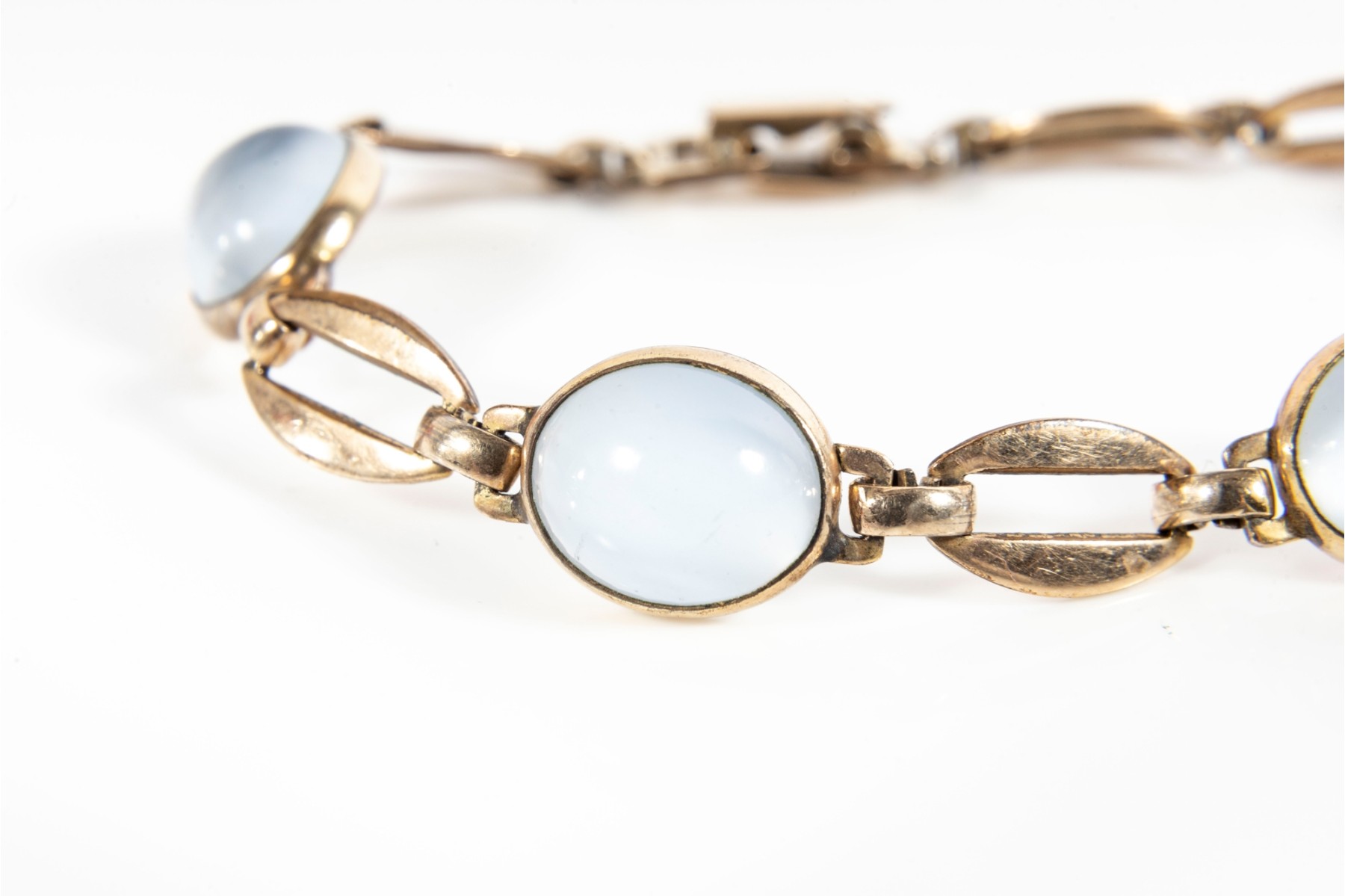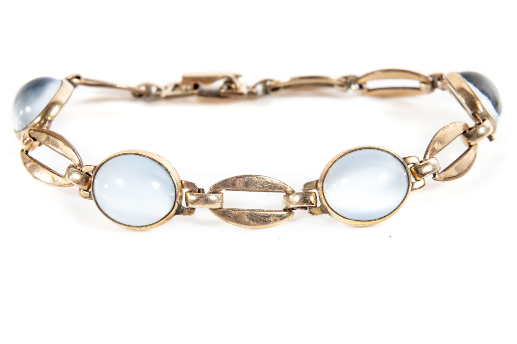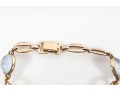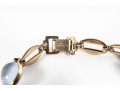 Made with 12K gold-filled material, this limited edition bracelet produced by W.E. Richards features enchanting cat's eye moonstone cabochons, each stone exhibiting a soft, ethereal glow with subtle chatoyancy.