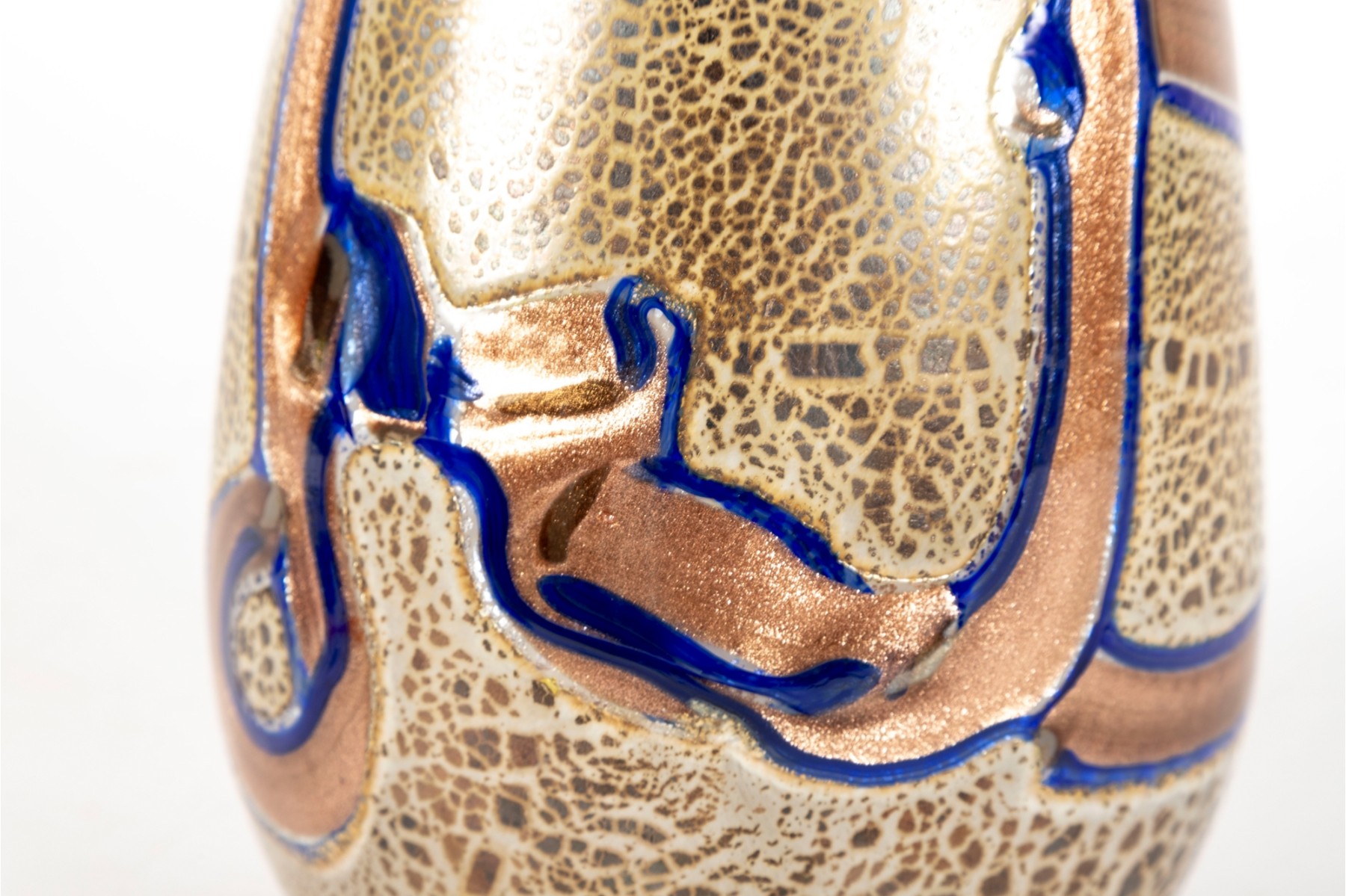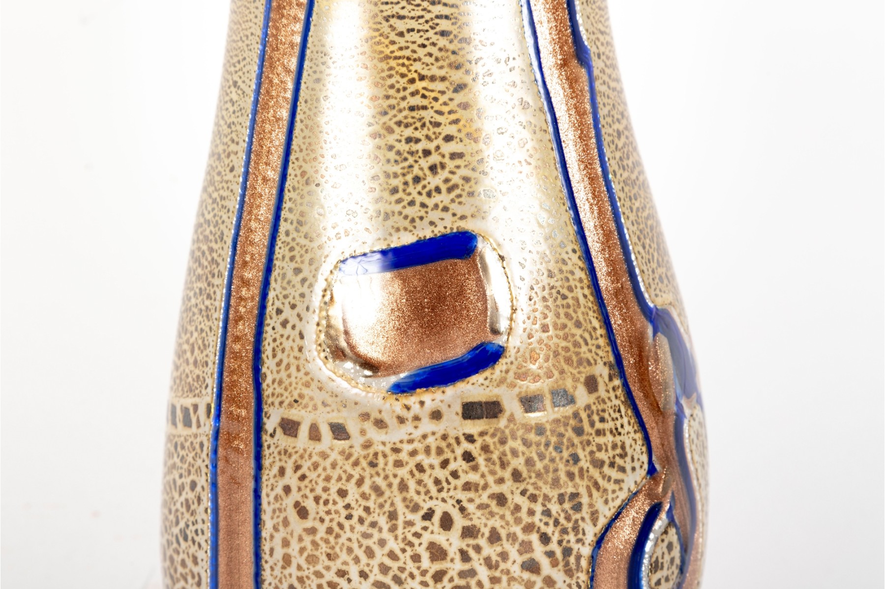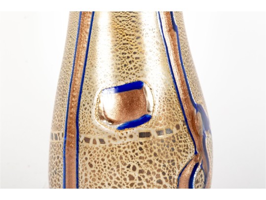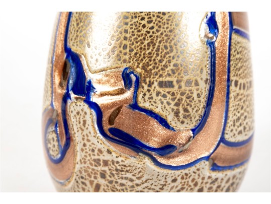This glass vase with a textured, speckled beige base and an abstract raised design in metallic bronze and cobalt blue features geometric elements add a modern artistic flair.