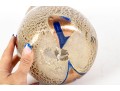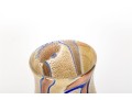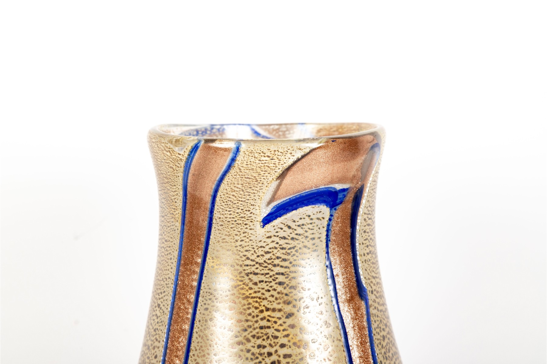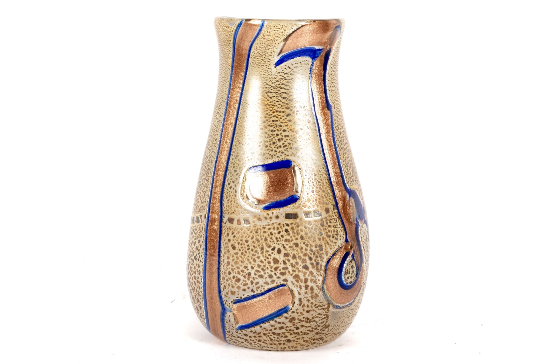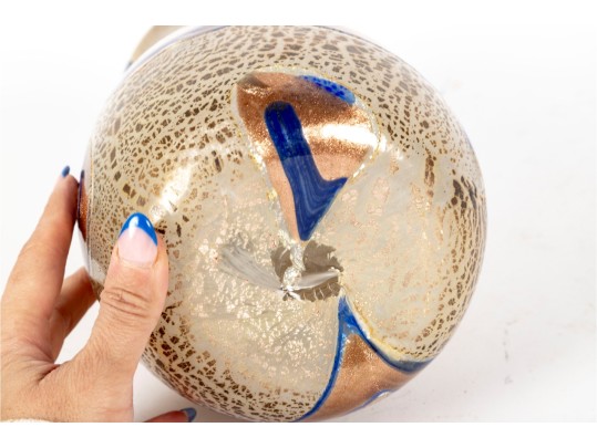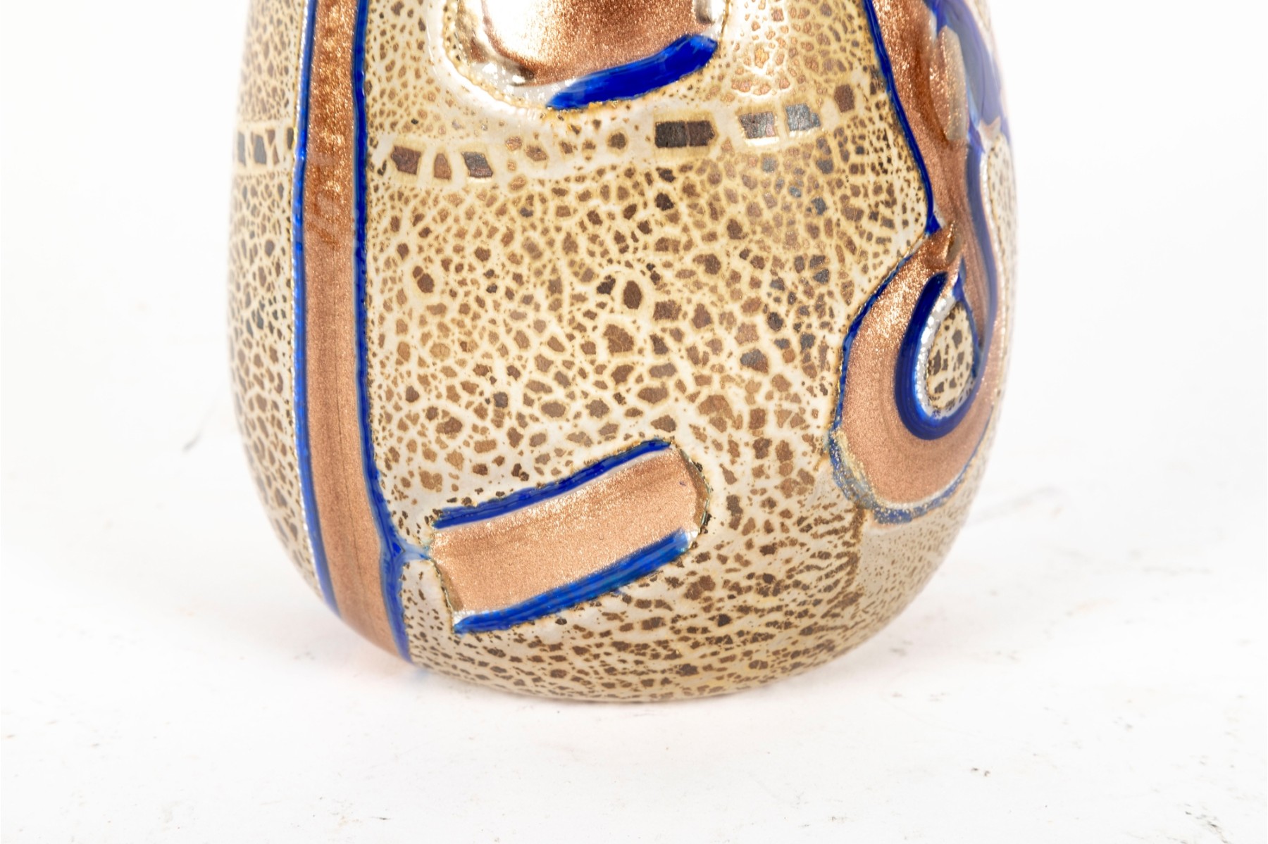 This glass vase with a textured, speckled beige base and an abstract raised design in metallic bronze and cobalt blue features geometric elements add a modern artistic flair.