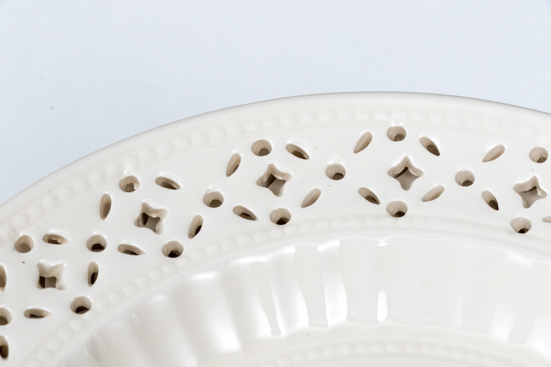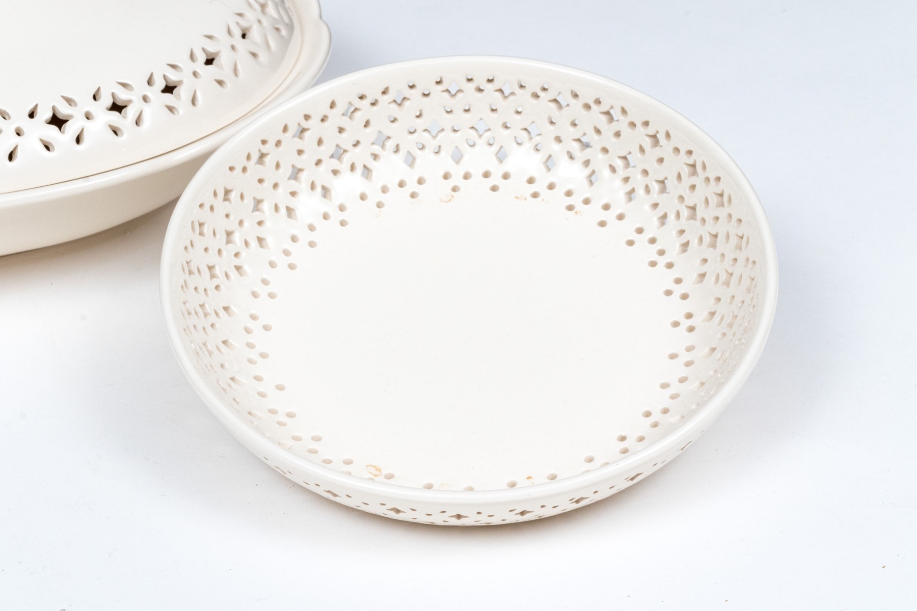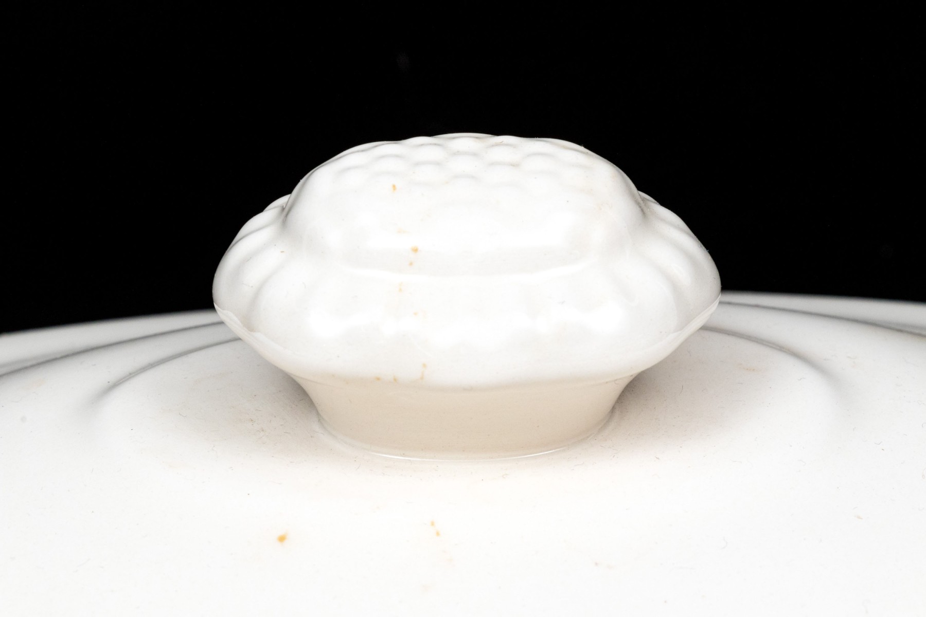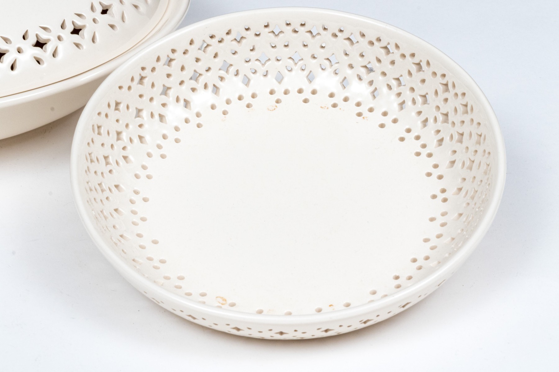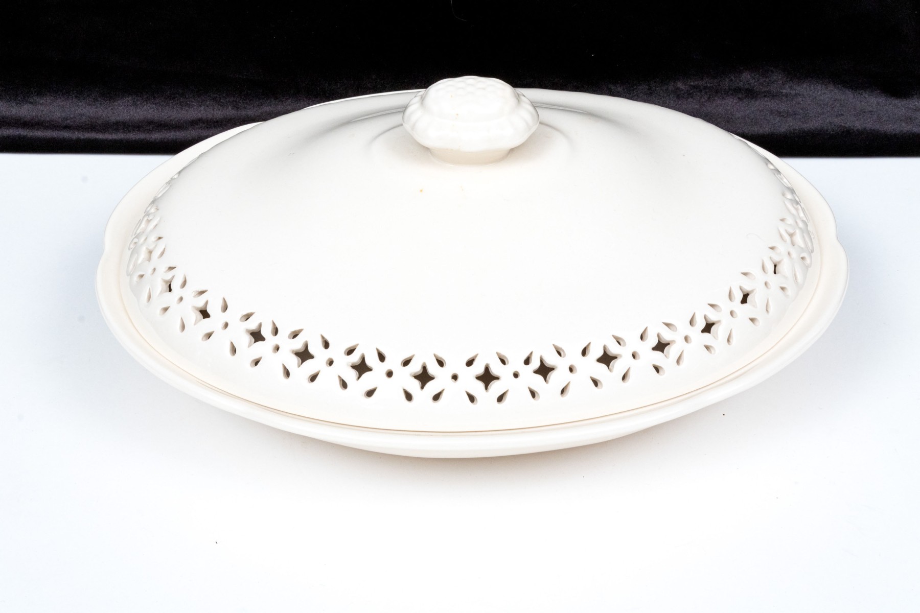 Comprised of a lidded and pierced oval lidded vegetable dish with foliate form finial,