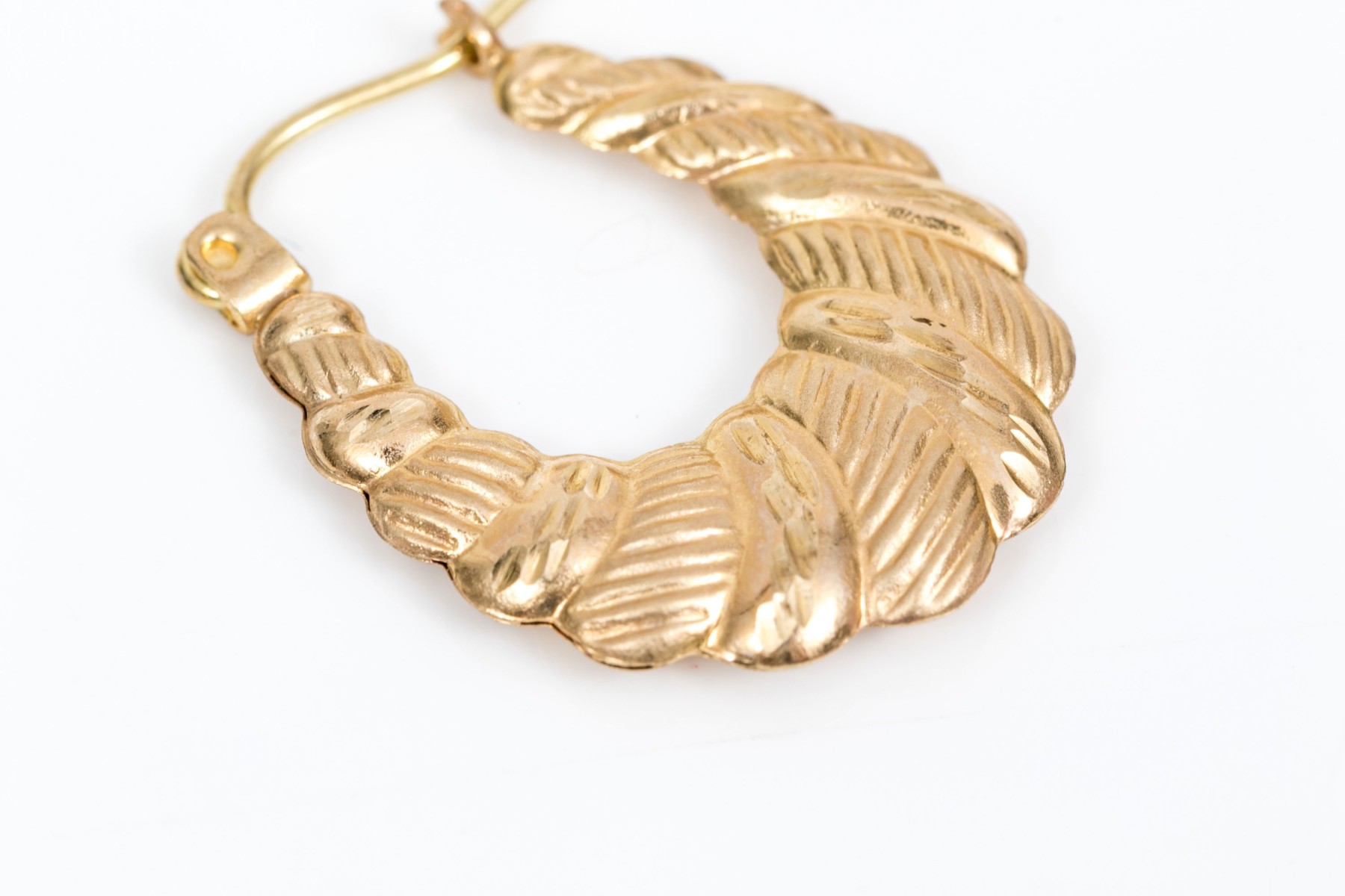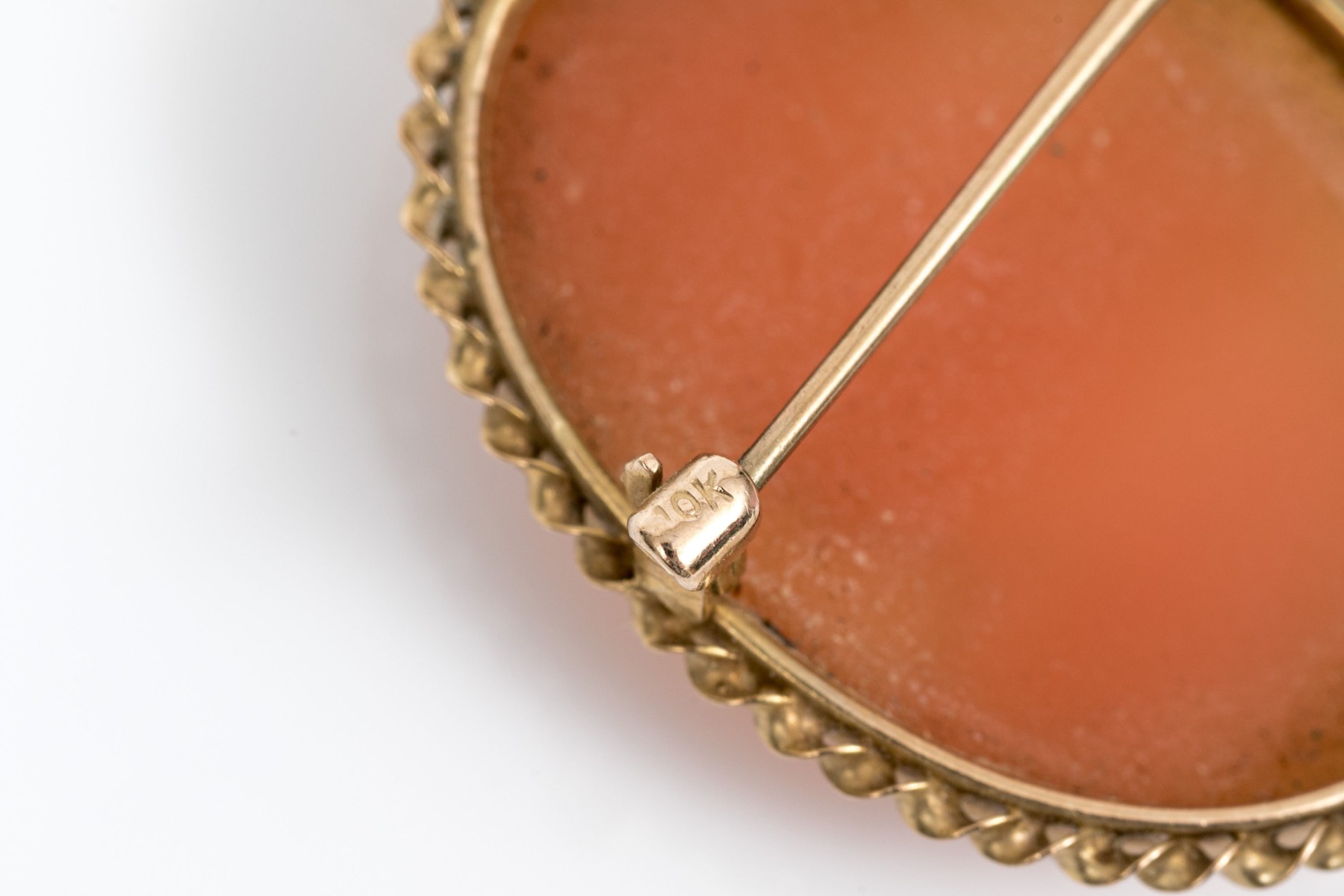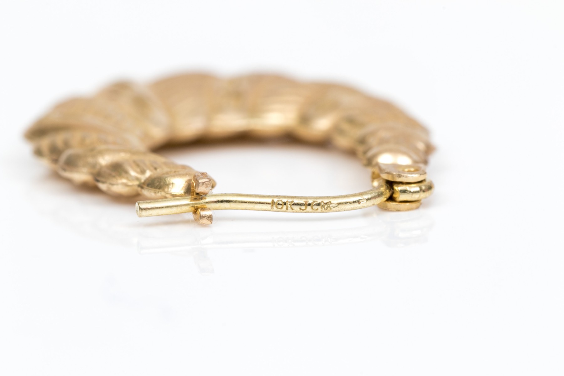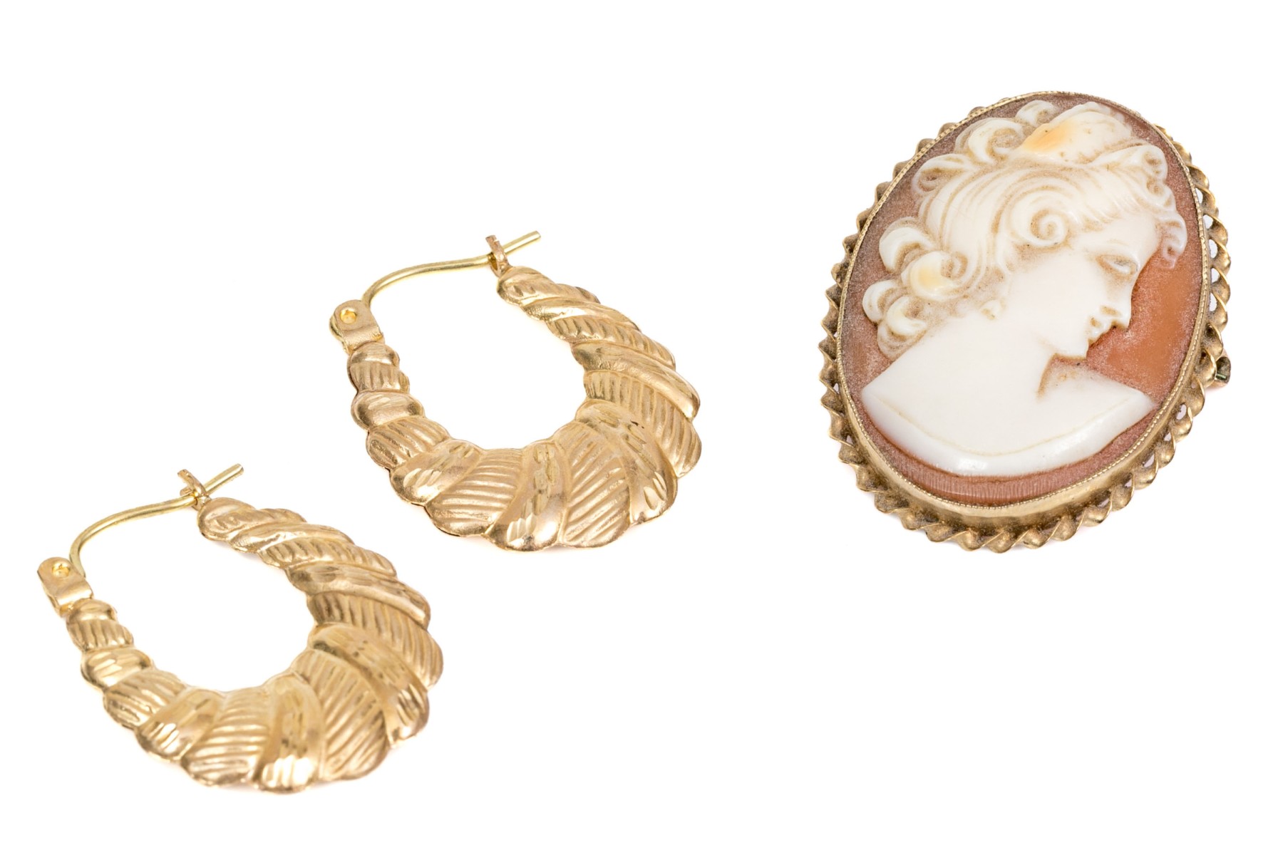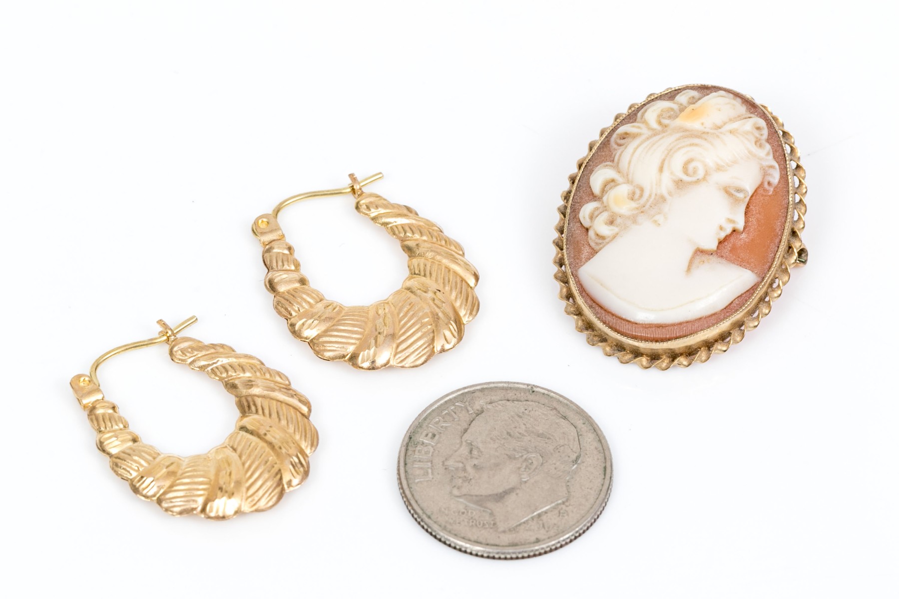 10K yellow gold. A pair of elongated puff hoop earrings with diamond-cut accents, leaver post backings. Cameo brooch/pendant featuring right facing feminine figure.