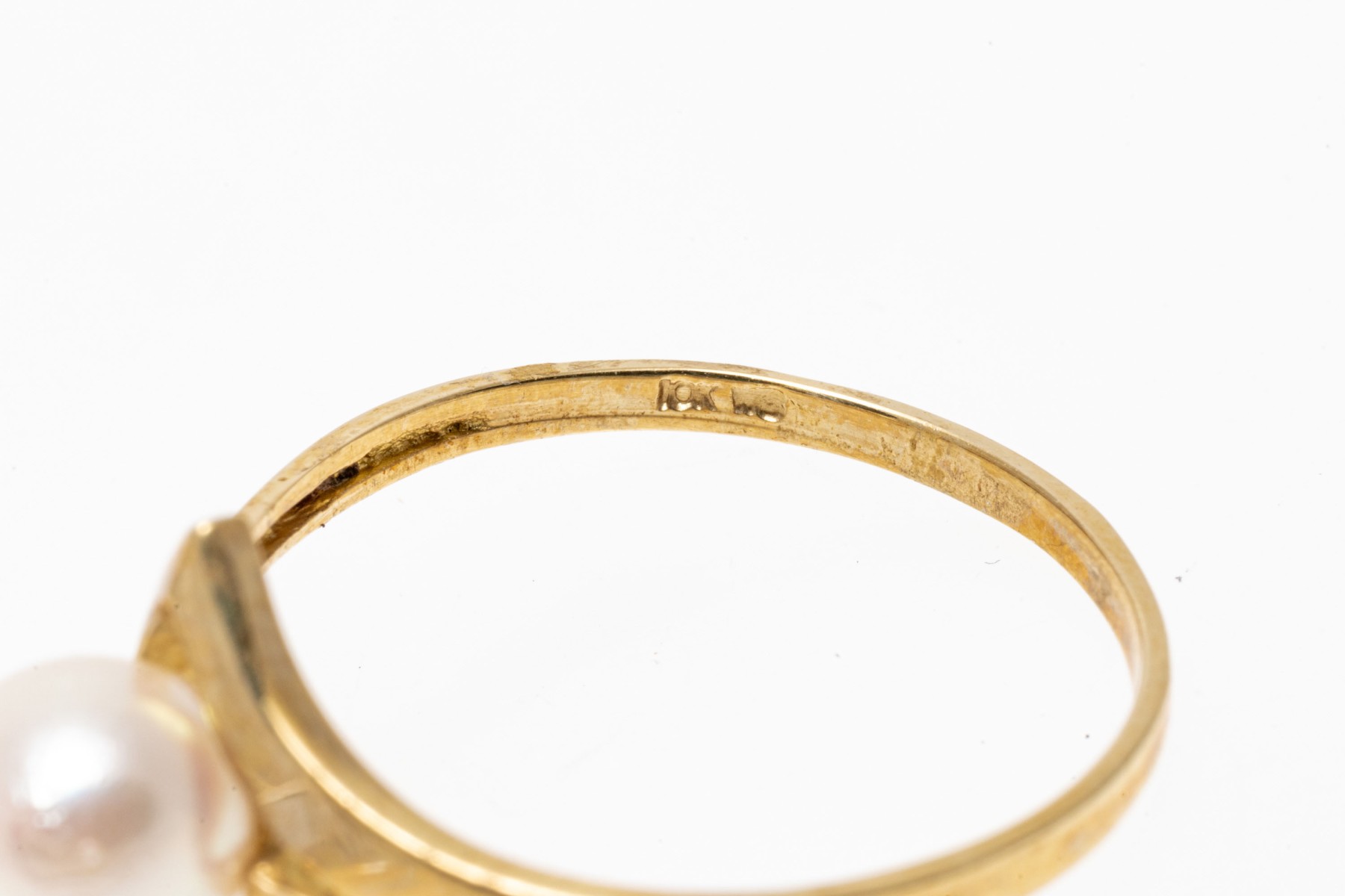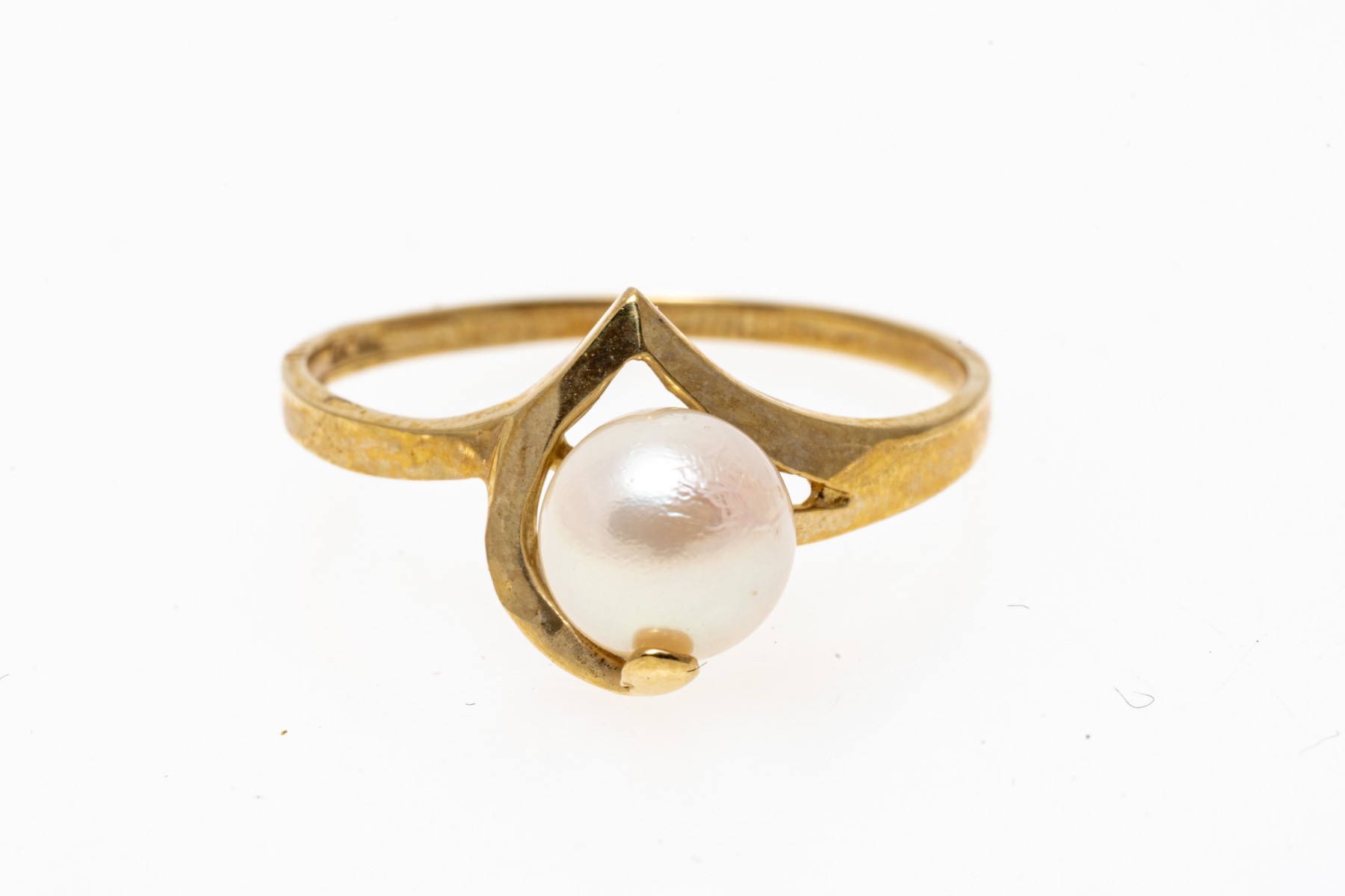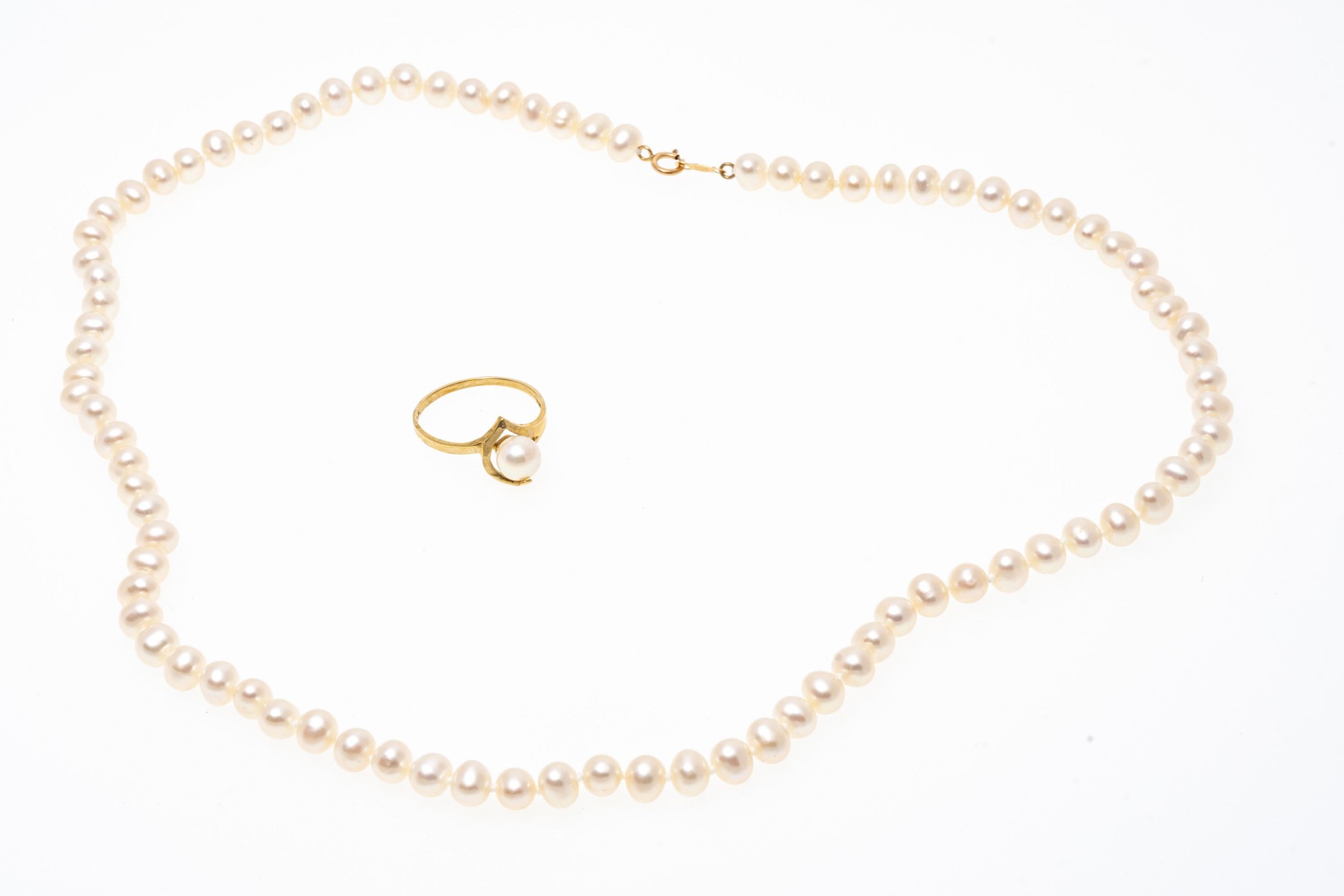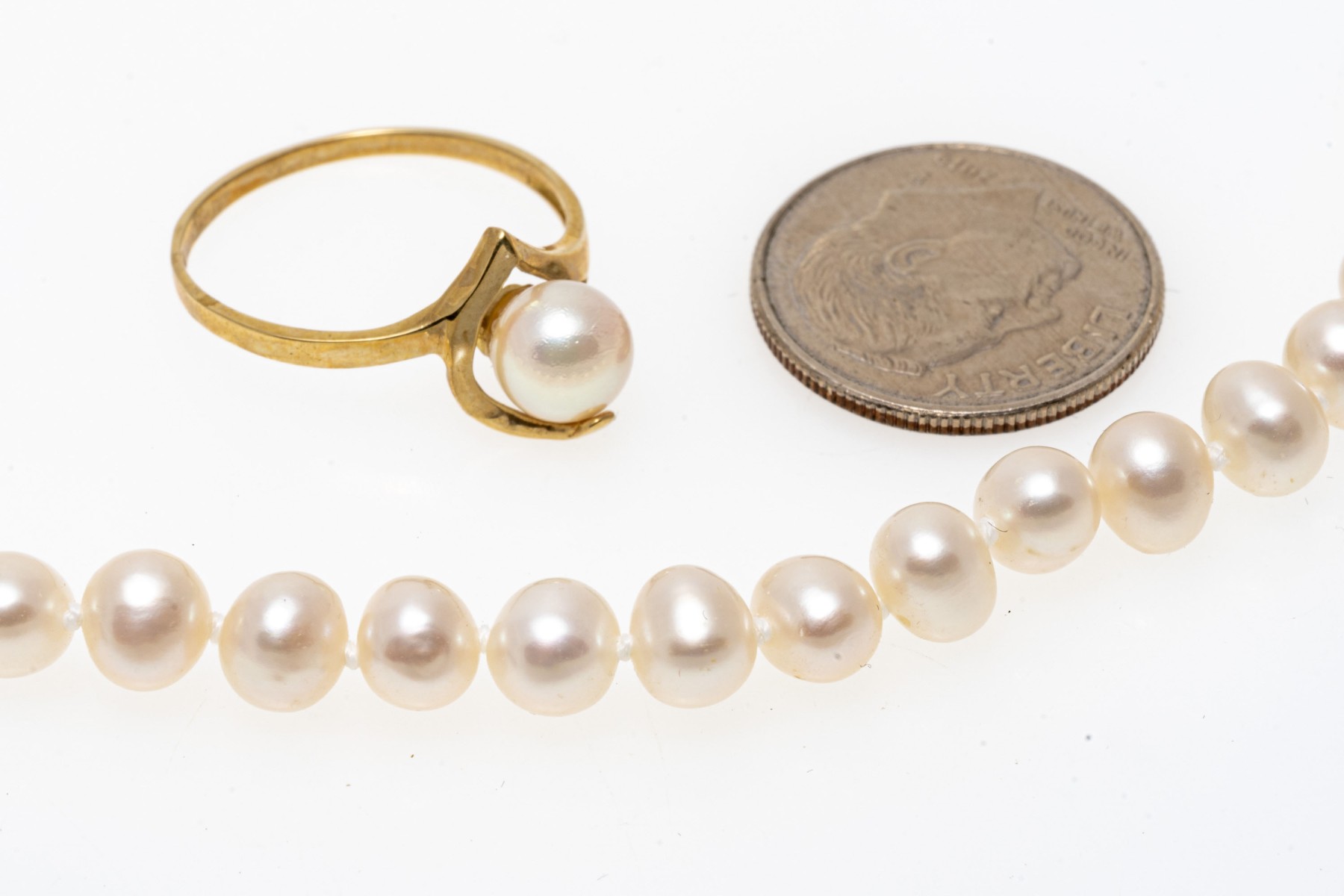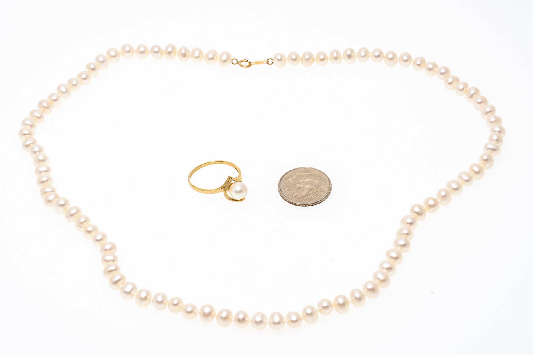 Strung cultured bright white pearl necklace with 10K yellow gold spring ring clasp, pearls average 5.5mm. With the necklace is a complimentary 10K yellow gold ring set with a single 6mm cultured freshwater pearl, ring size 5.75+.