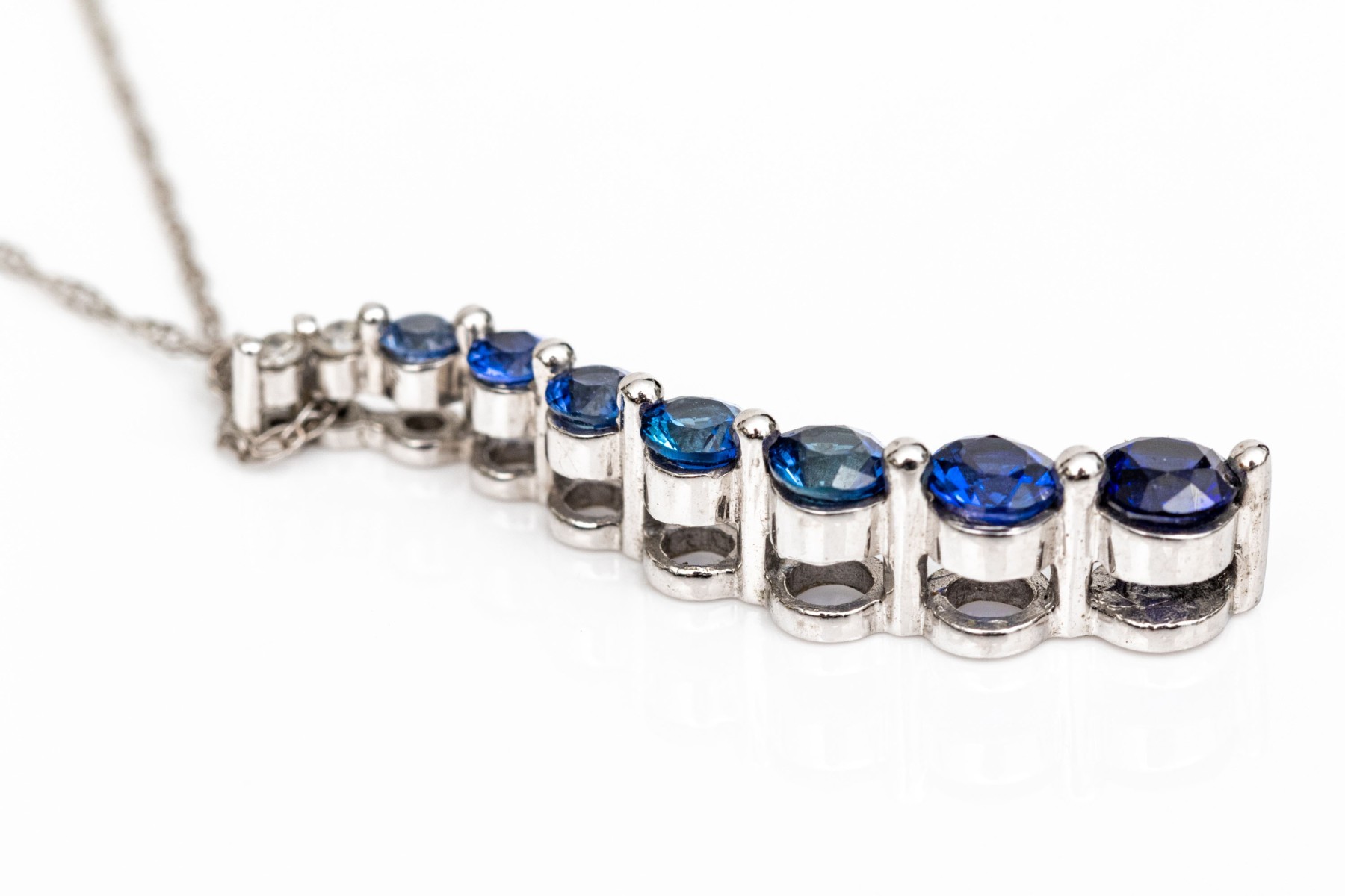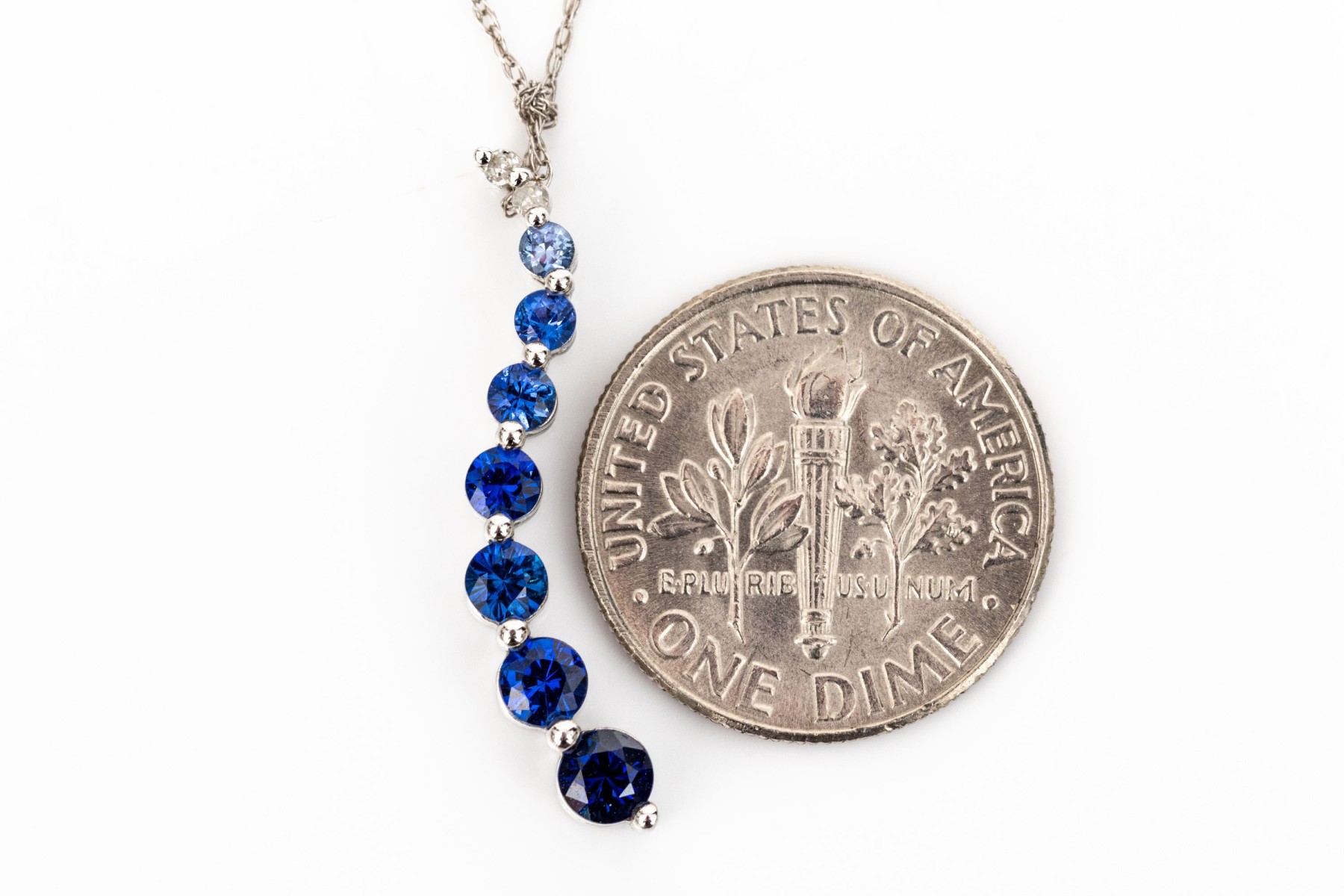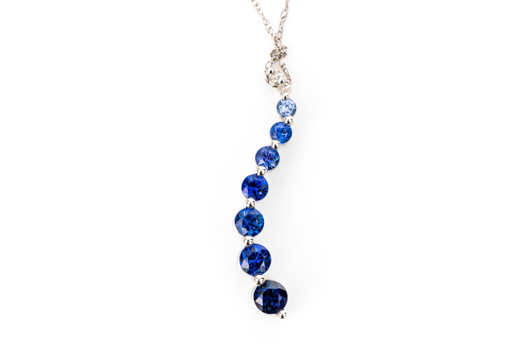 10k gold fabulous graduated ombre sapphire curved stack pendant, app. 0.80, with chain. This handsome pendant is a stack style, set with an integral bale and finished with a fine cable chain with a spring ring style clasp. Topped with accent diamonds