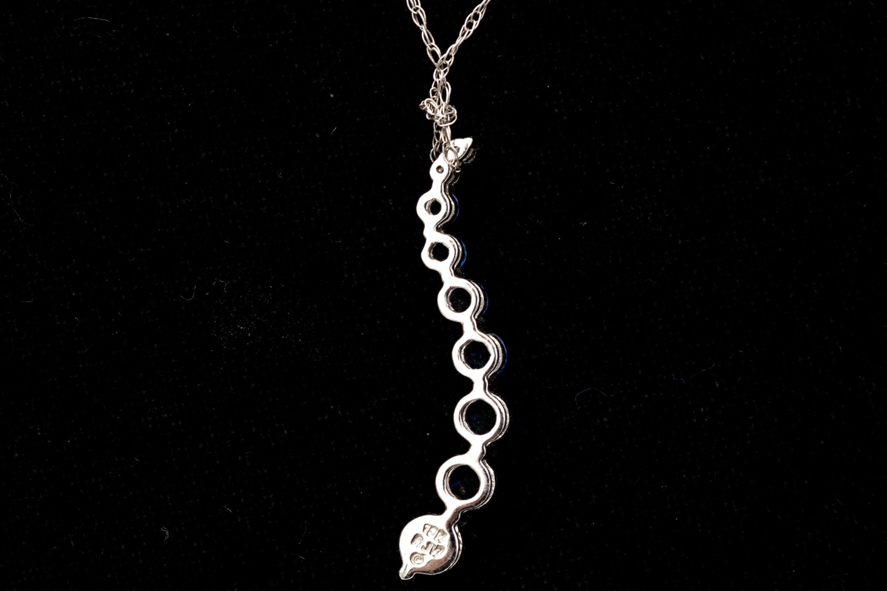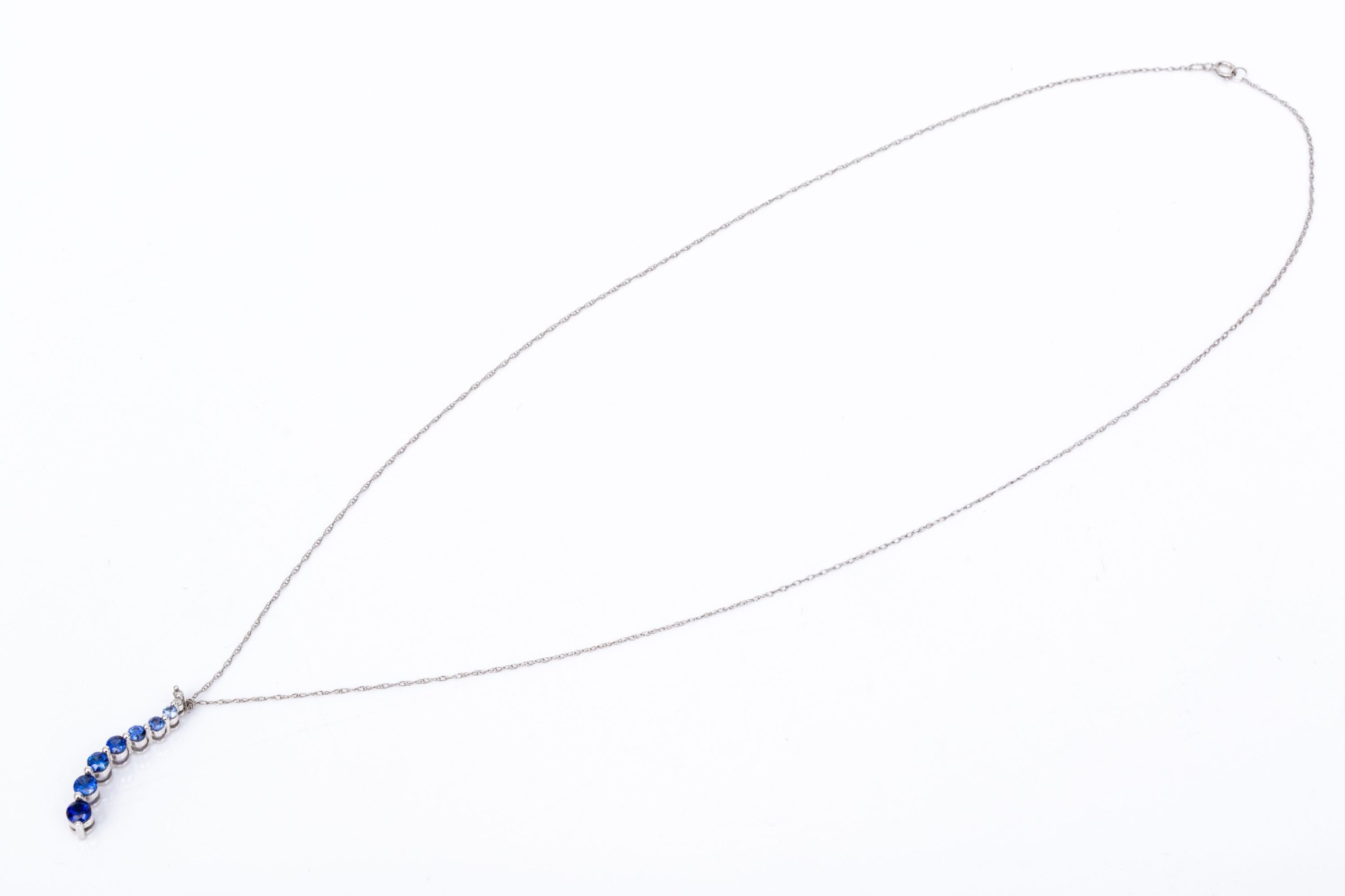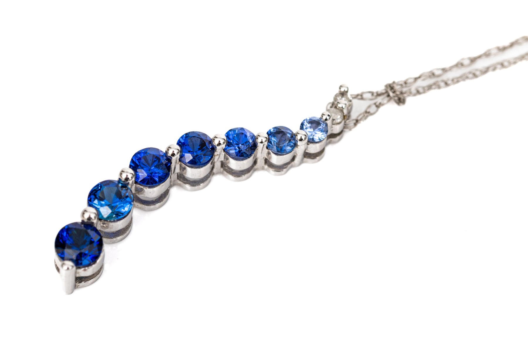 10k gold fabulous graduated ombre sapphire curved stack pendant, app. 0.80, with chain. This handsome pendant is a stack style, set with an integral bale and finished with a fine cable chain with a spring ring style clasp. Topped with accent diamonds