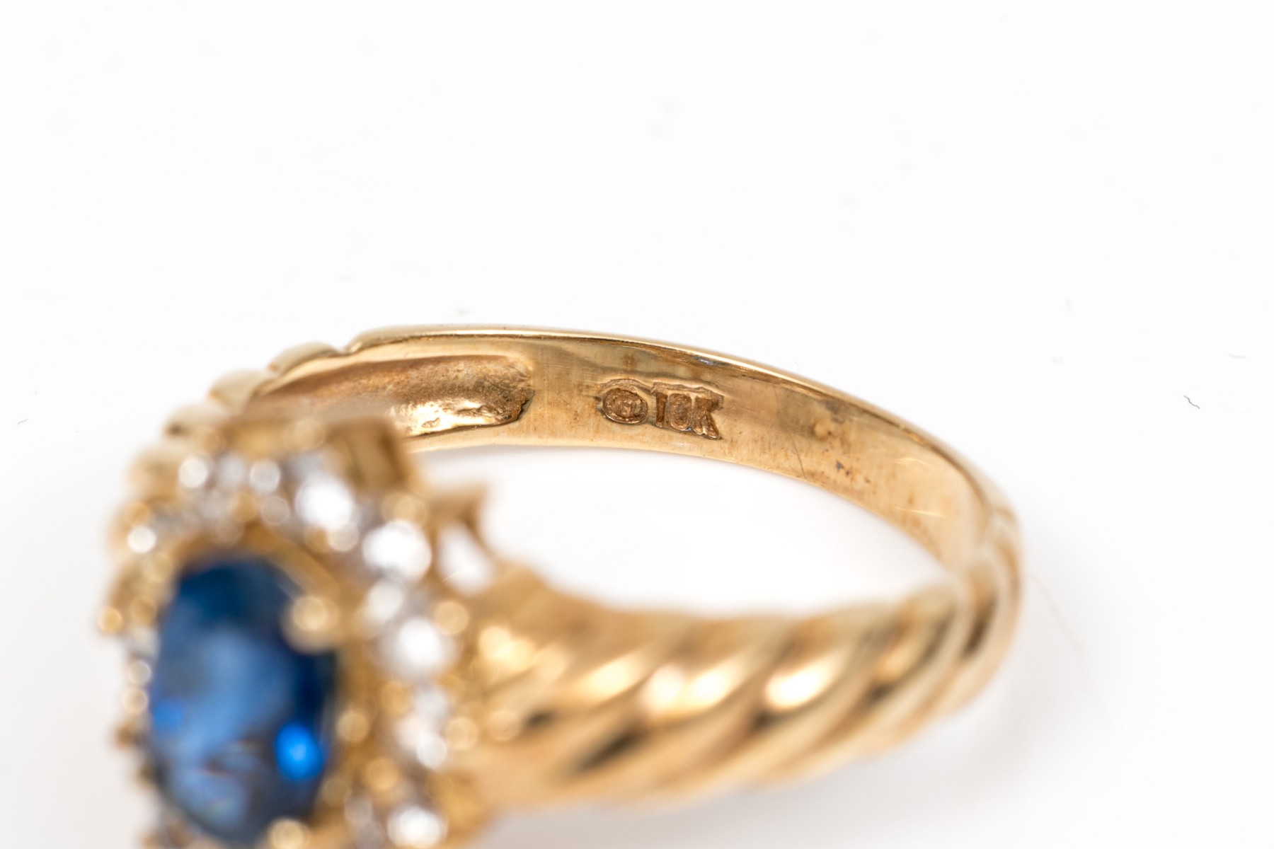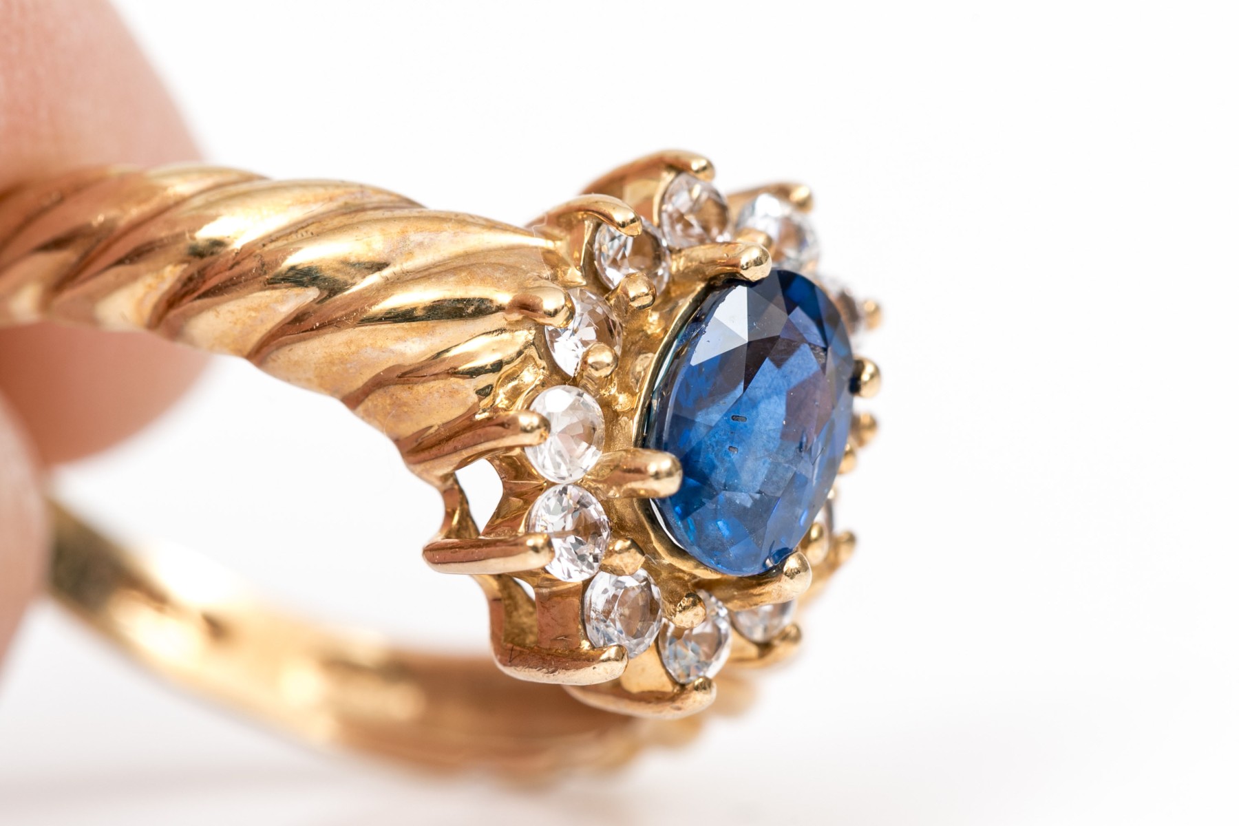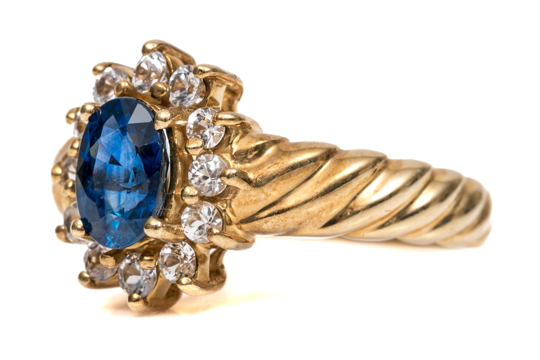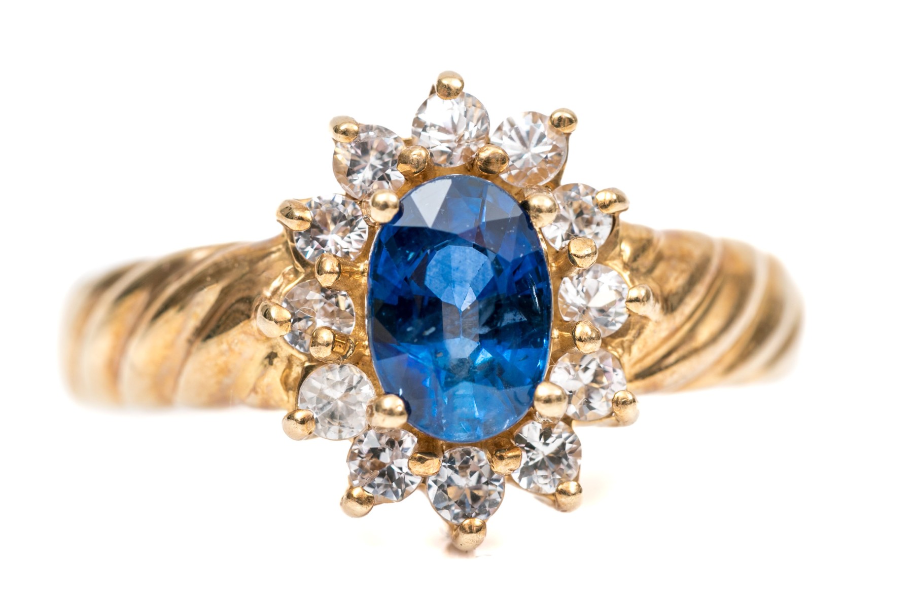 10k gold lovely oval blue sapphire and white sapphire ribbed halo ring, size 7+. The total blue sapphire weight is app. 0.92, prong set