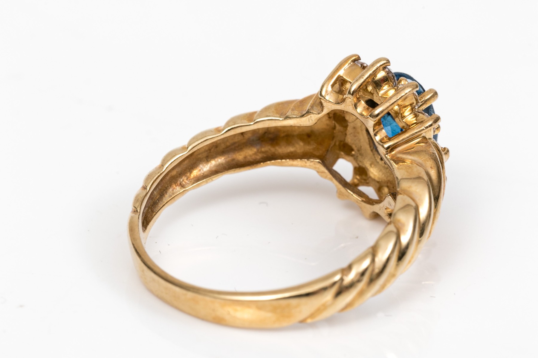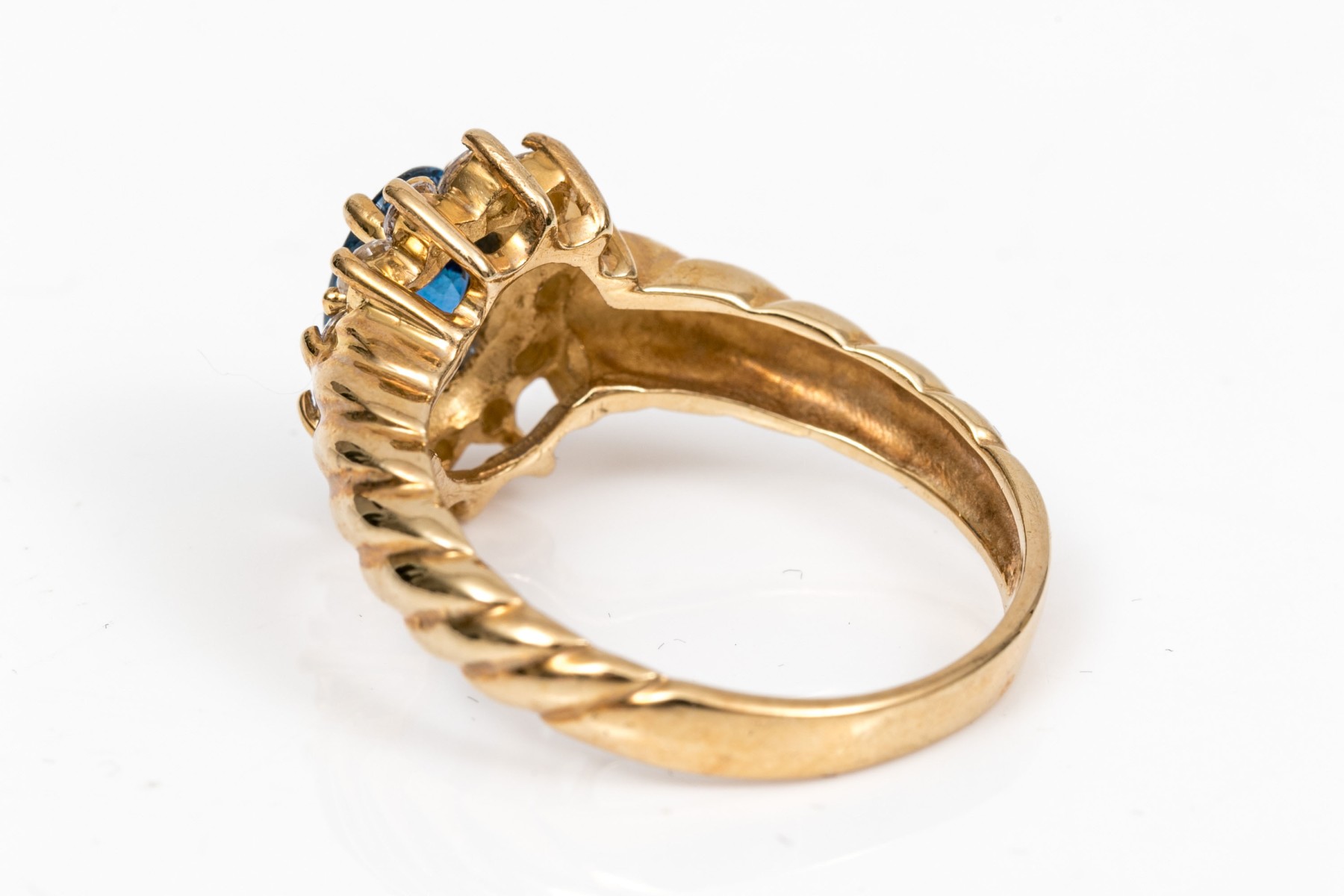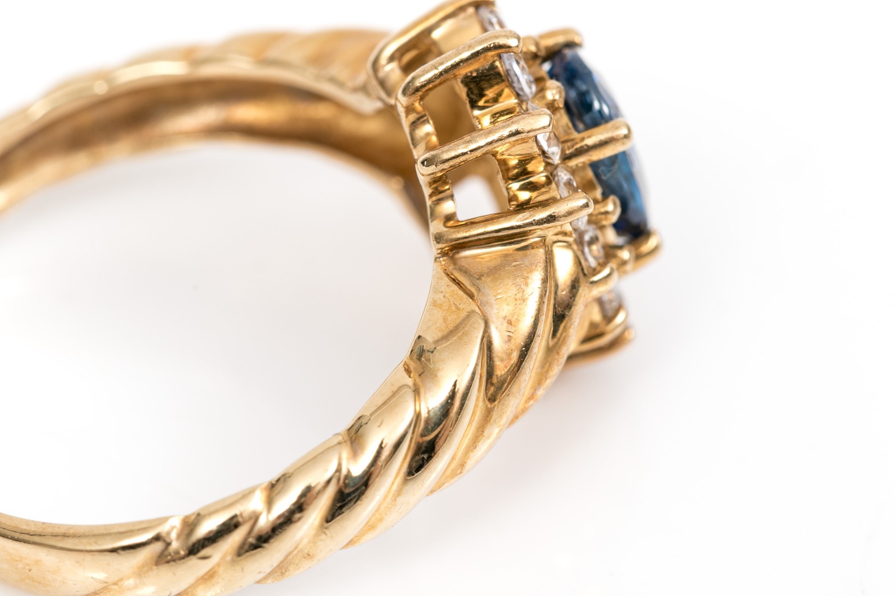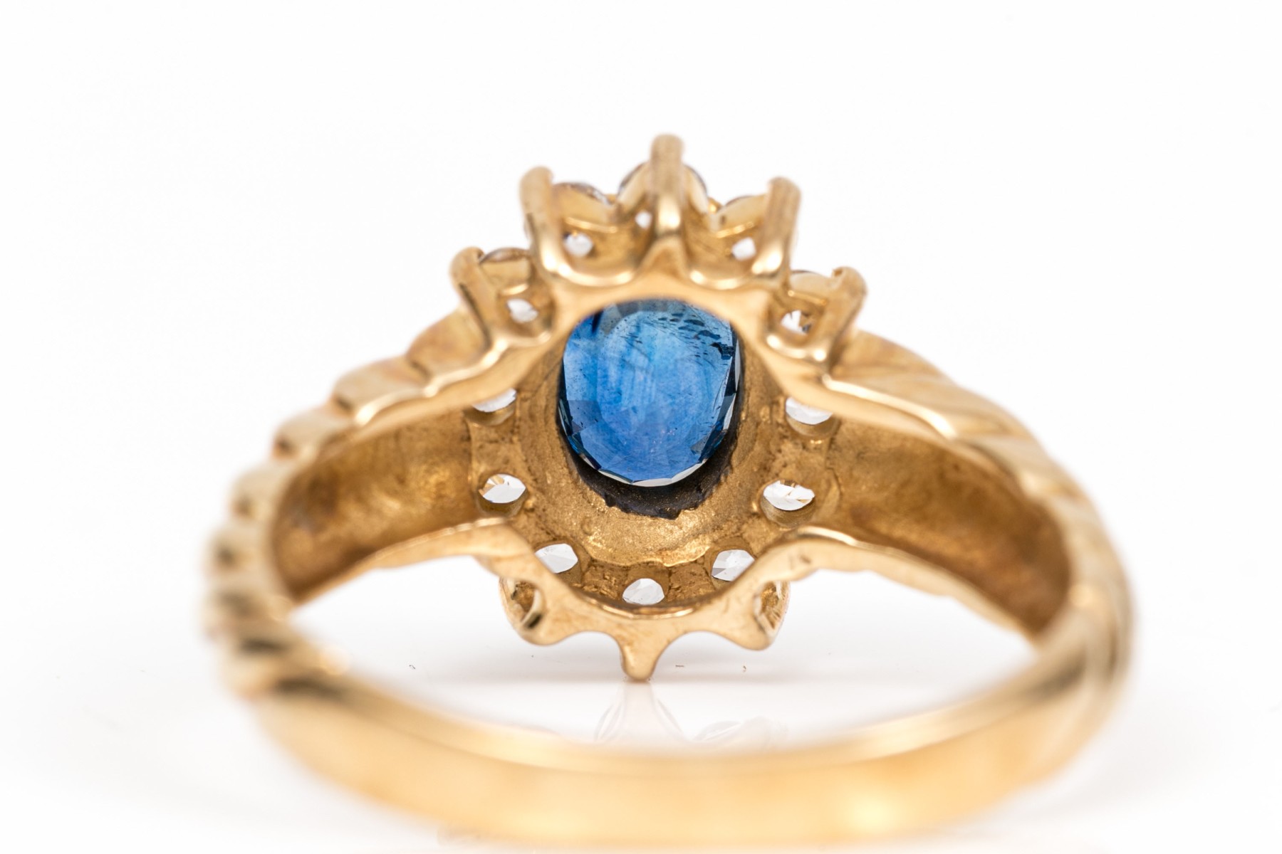 10k gold lovely oval blue sapphire and white sapphire ribbed halo ring, size 7+. The total blue sapphire weight is app. 0.92, prong set