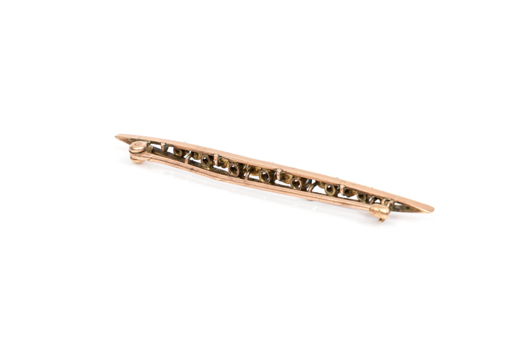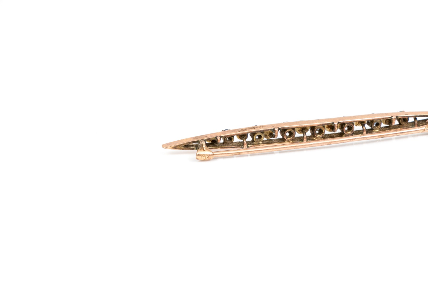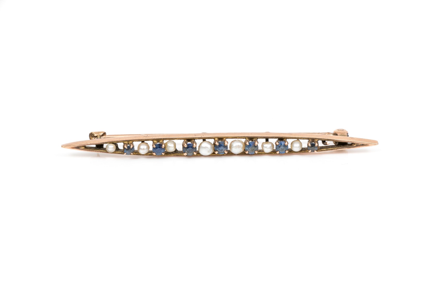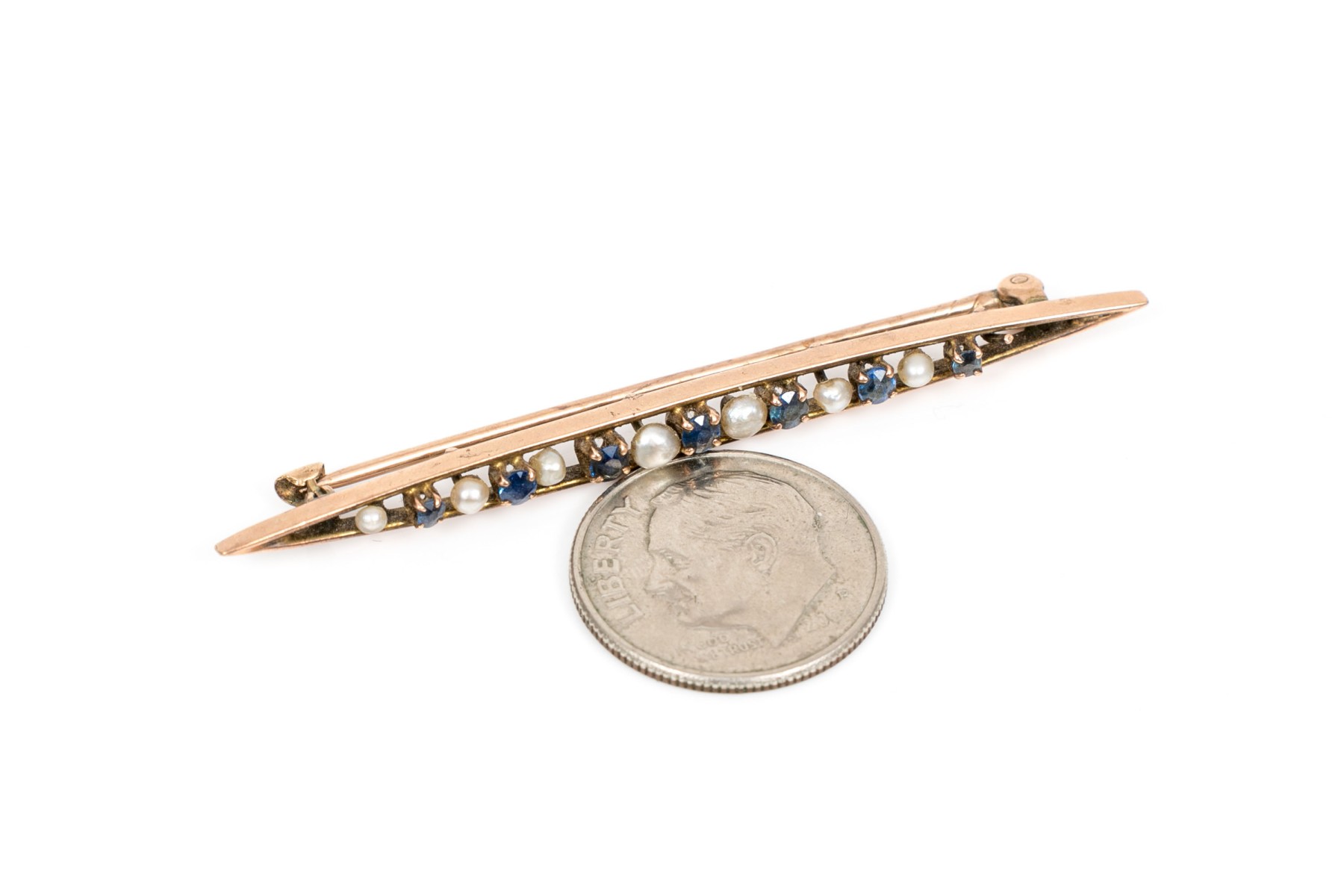 10k gold pretty vintage seed pearl and sapphire bar pin, app. 0.23 TCW, prong set