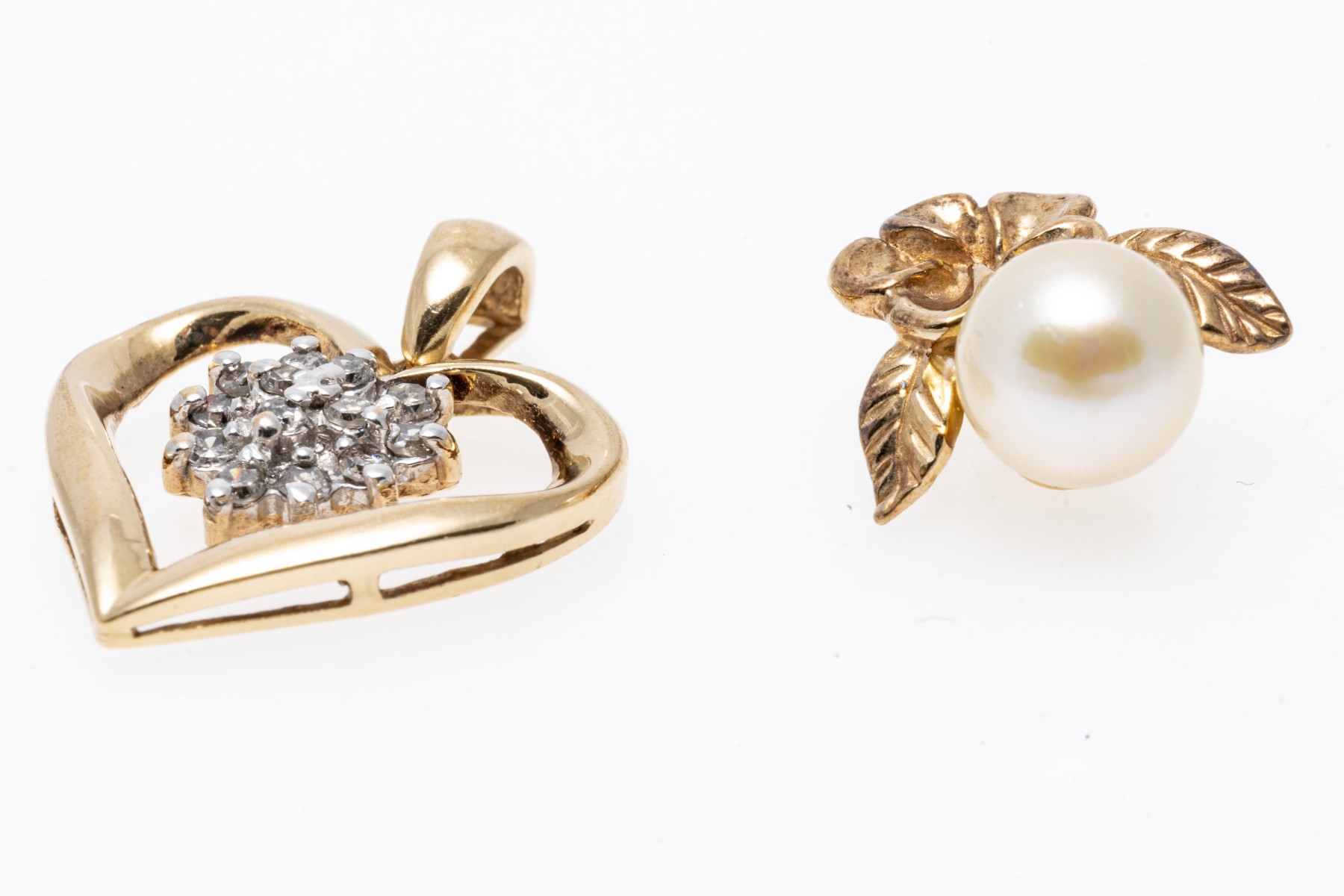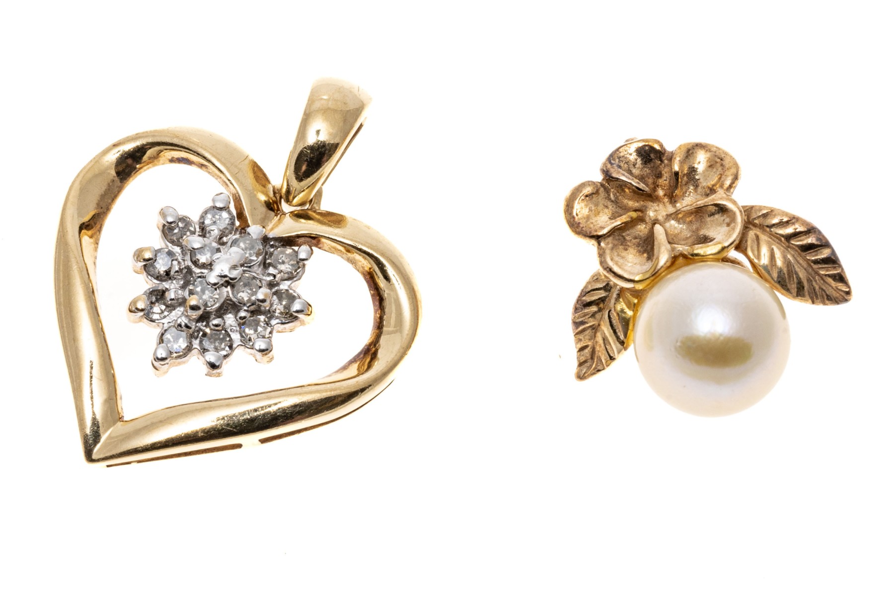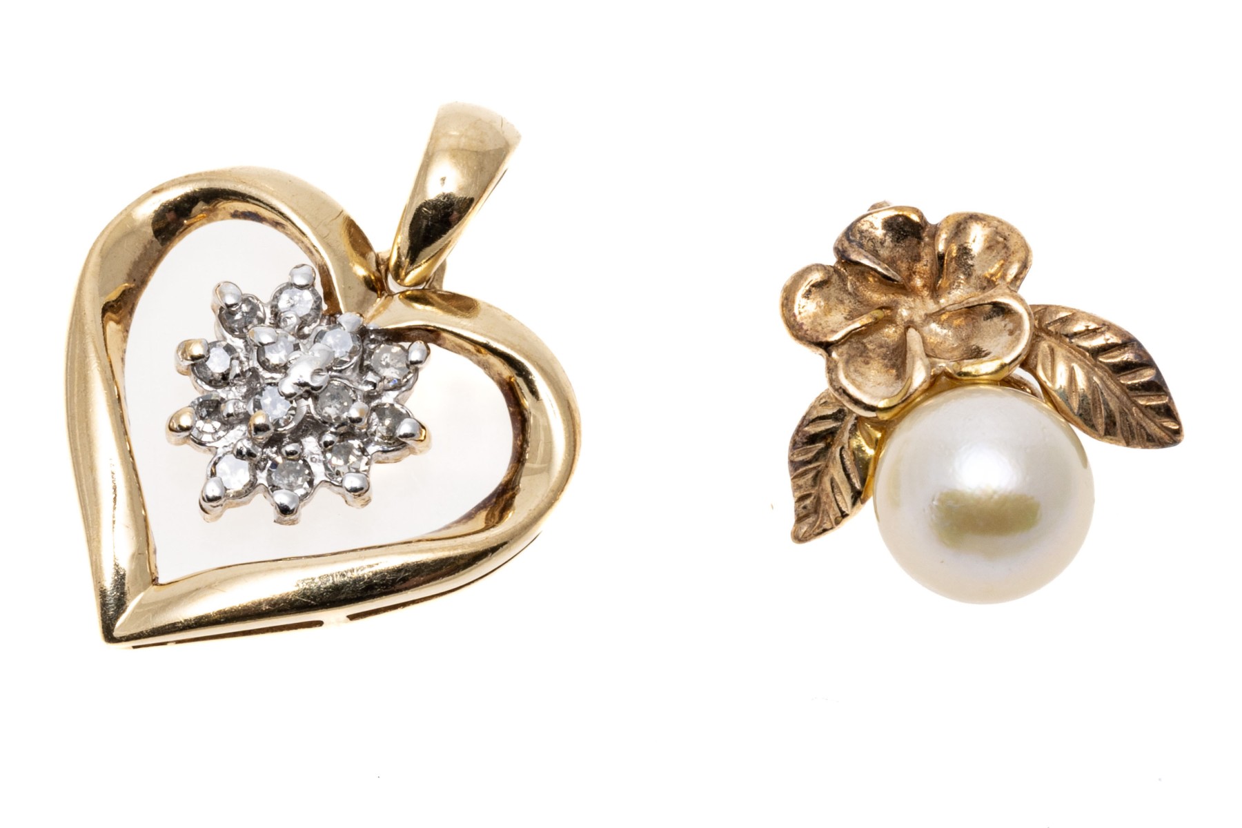 Two 10K yellow gold pendants. The first pendant is an open heart form set with accent diamonds, approximately 0.14 TCW. The second pendant has a floral design with a single 6.2mm ivory white cultured pearl.
