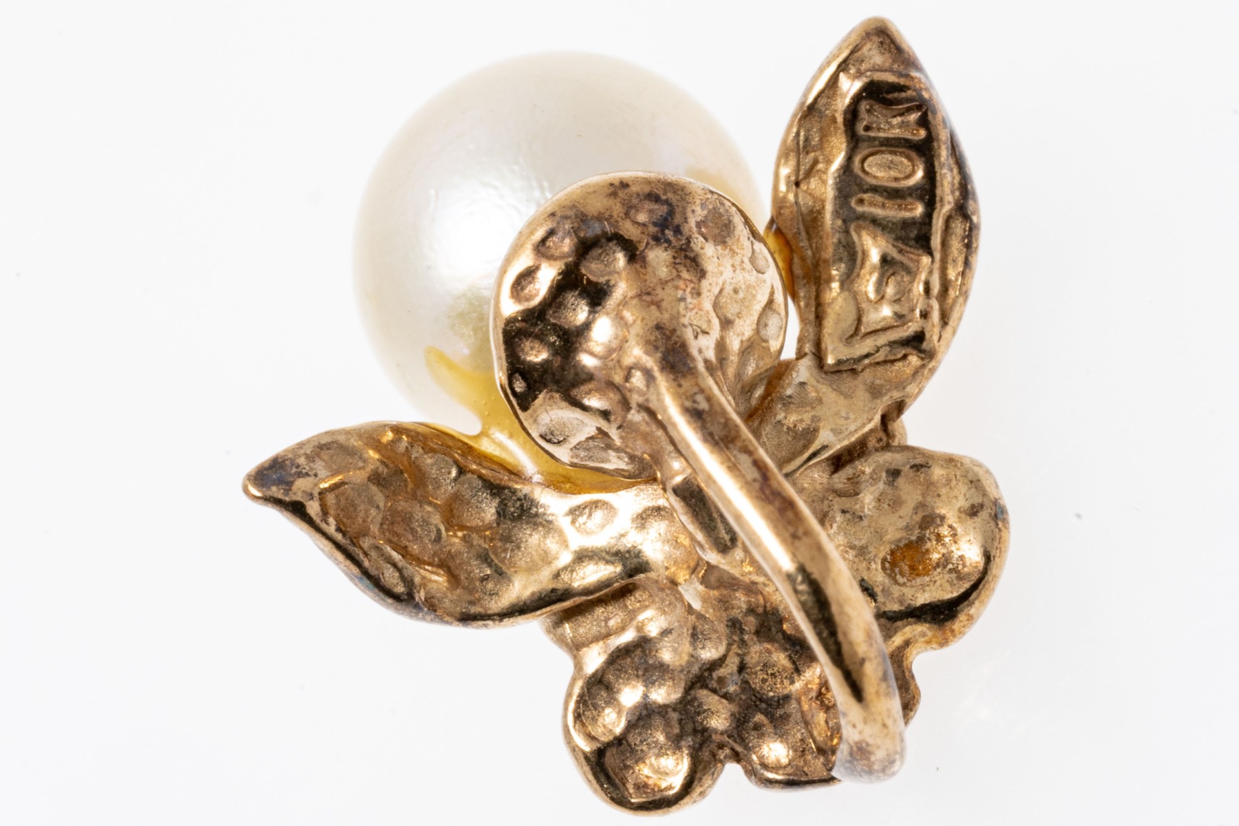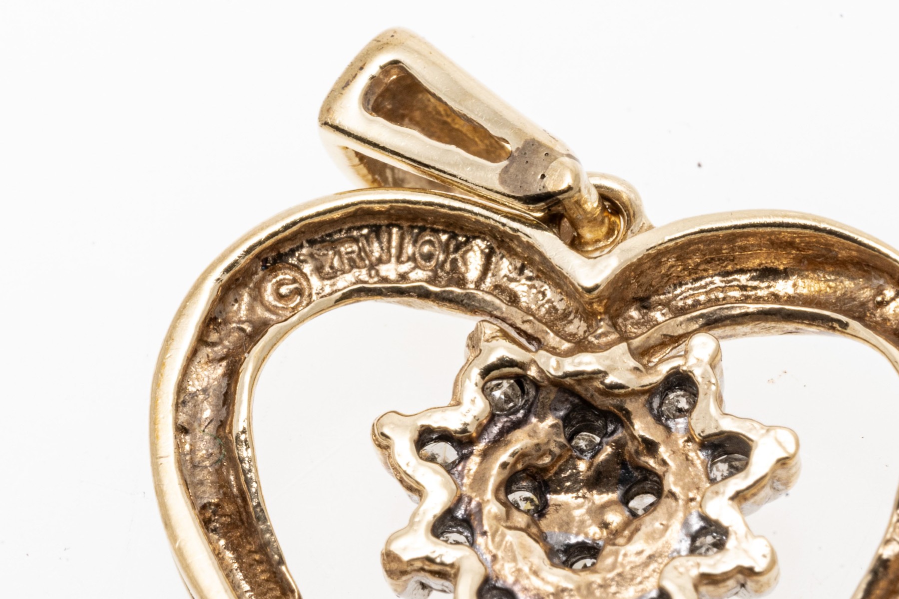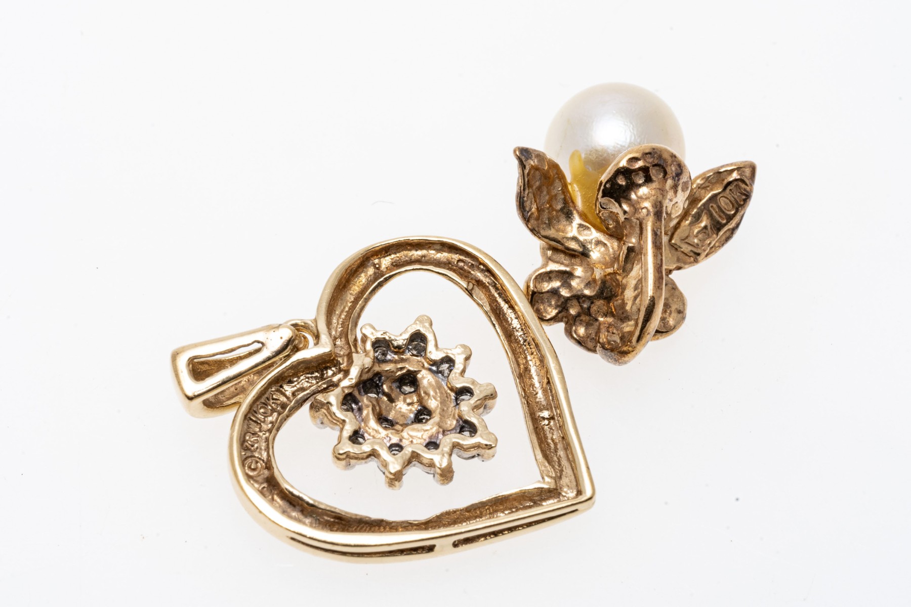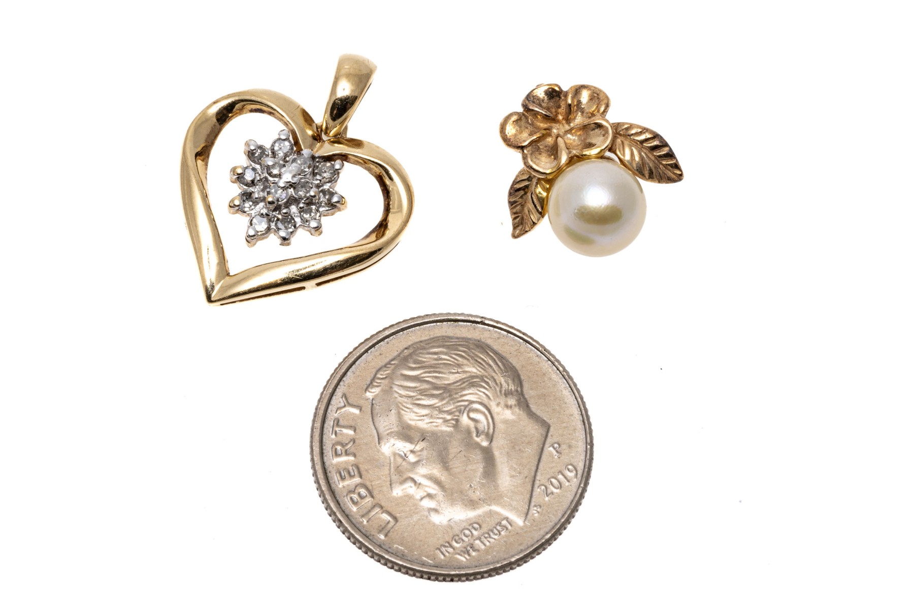 Two 10K yellow gold pendants. The first pendant is an open heart form set with accent diamonds, approximately 0.14 TCW. The second pendant has a floral design with a single 6.2mm ivory white cultured pearl.