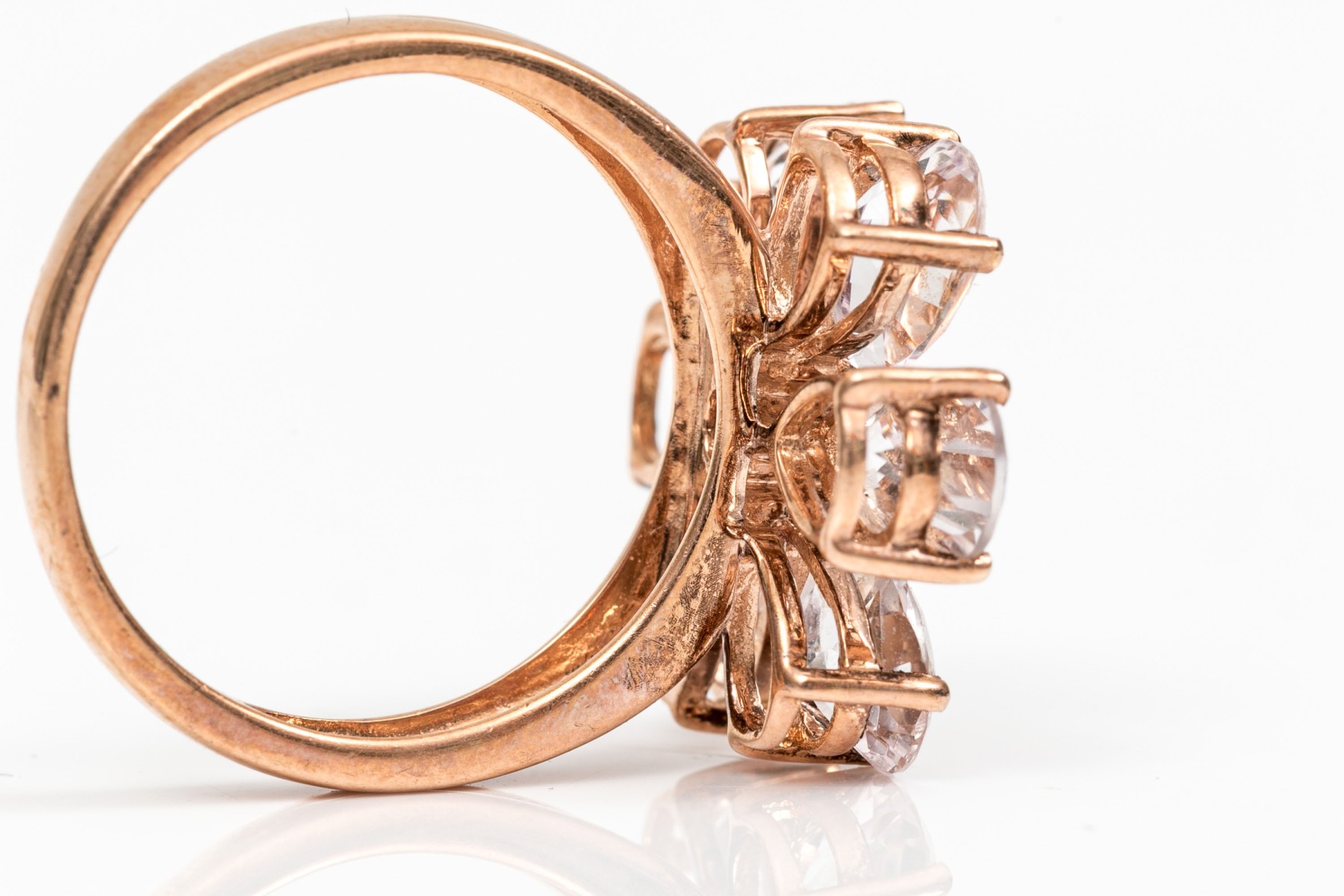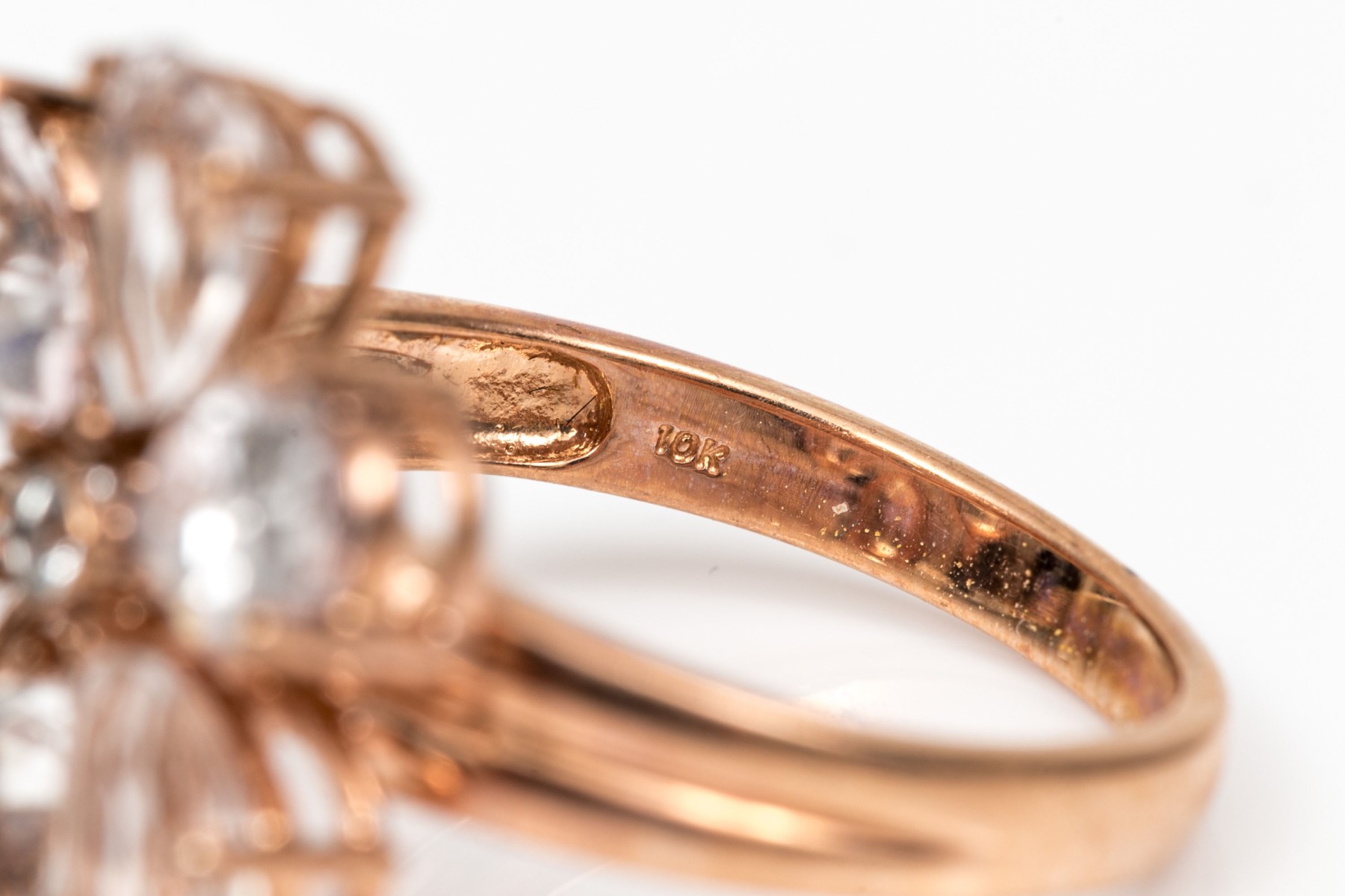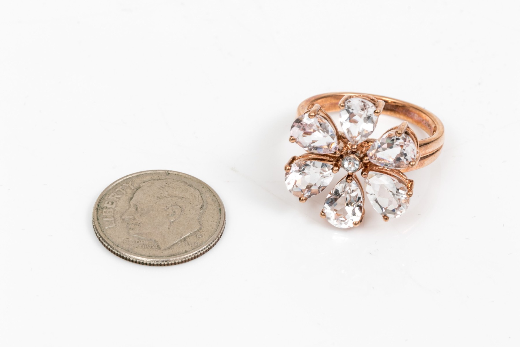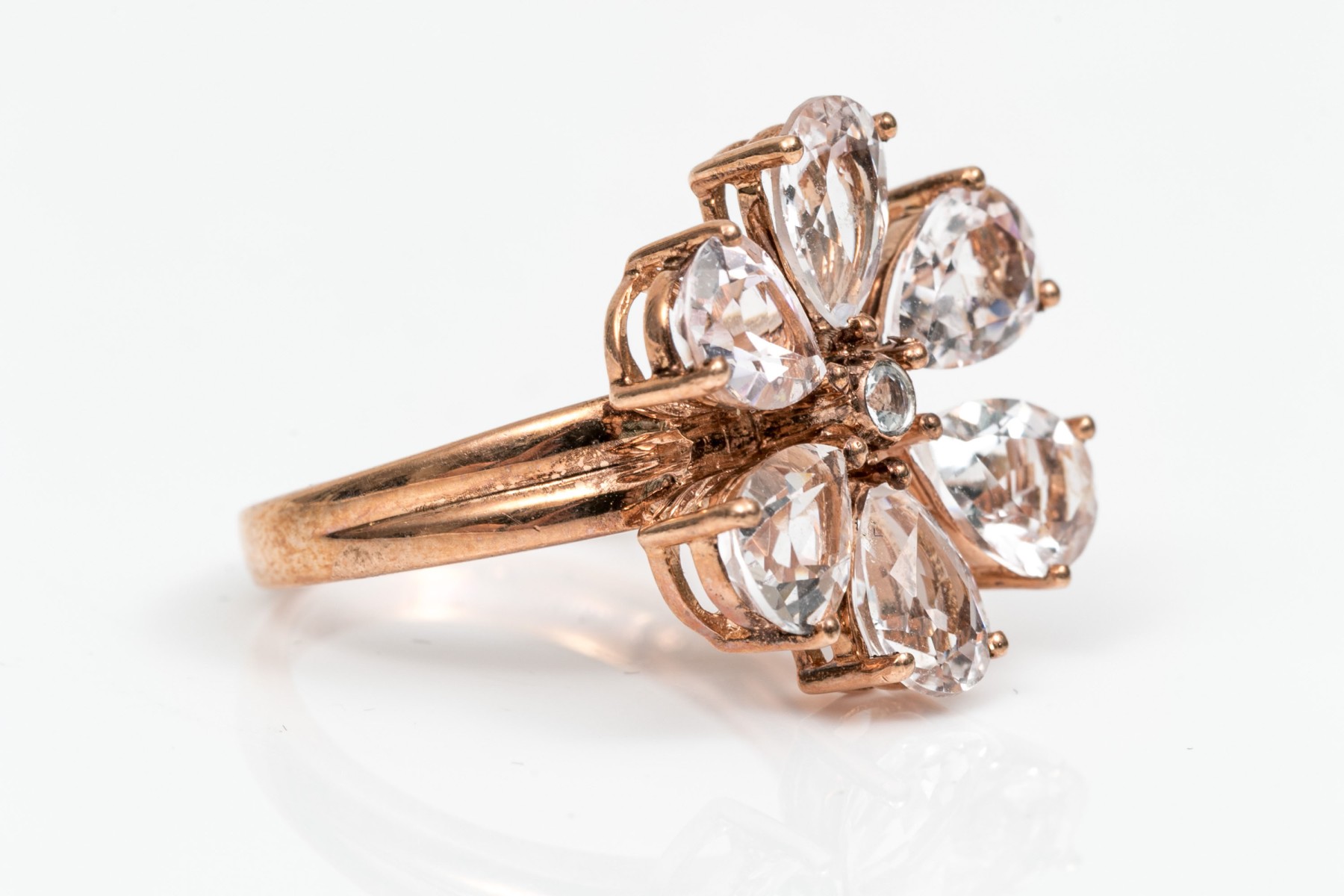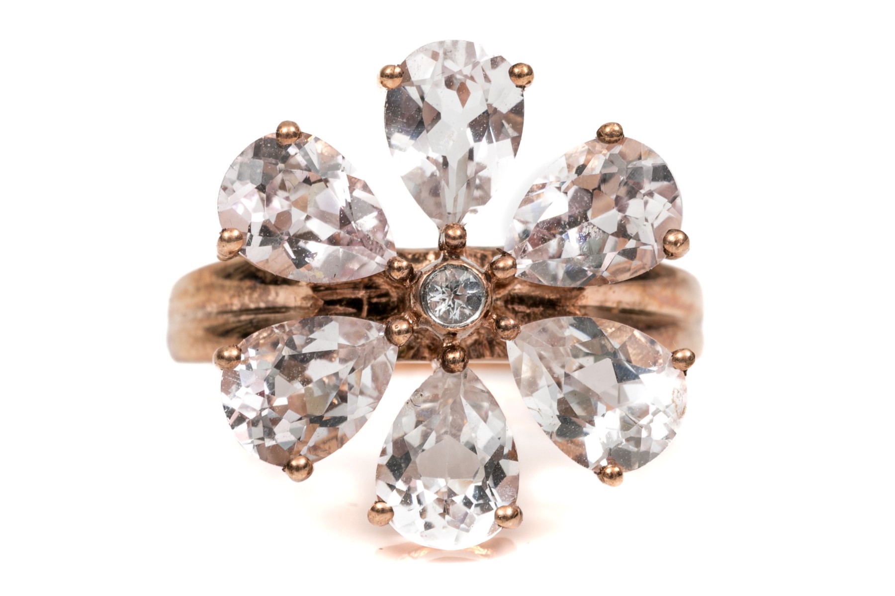 10k rose gold beautiful flower motif faceted white topaz ring, size 7+