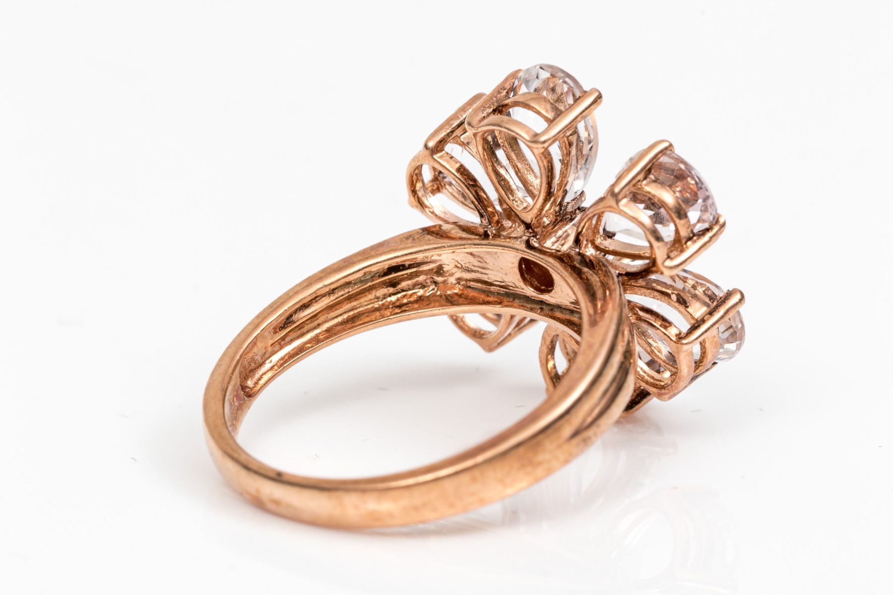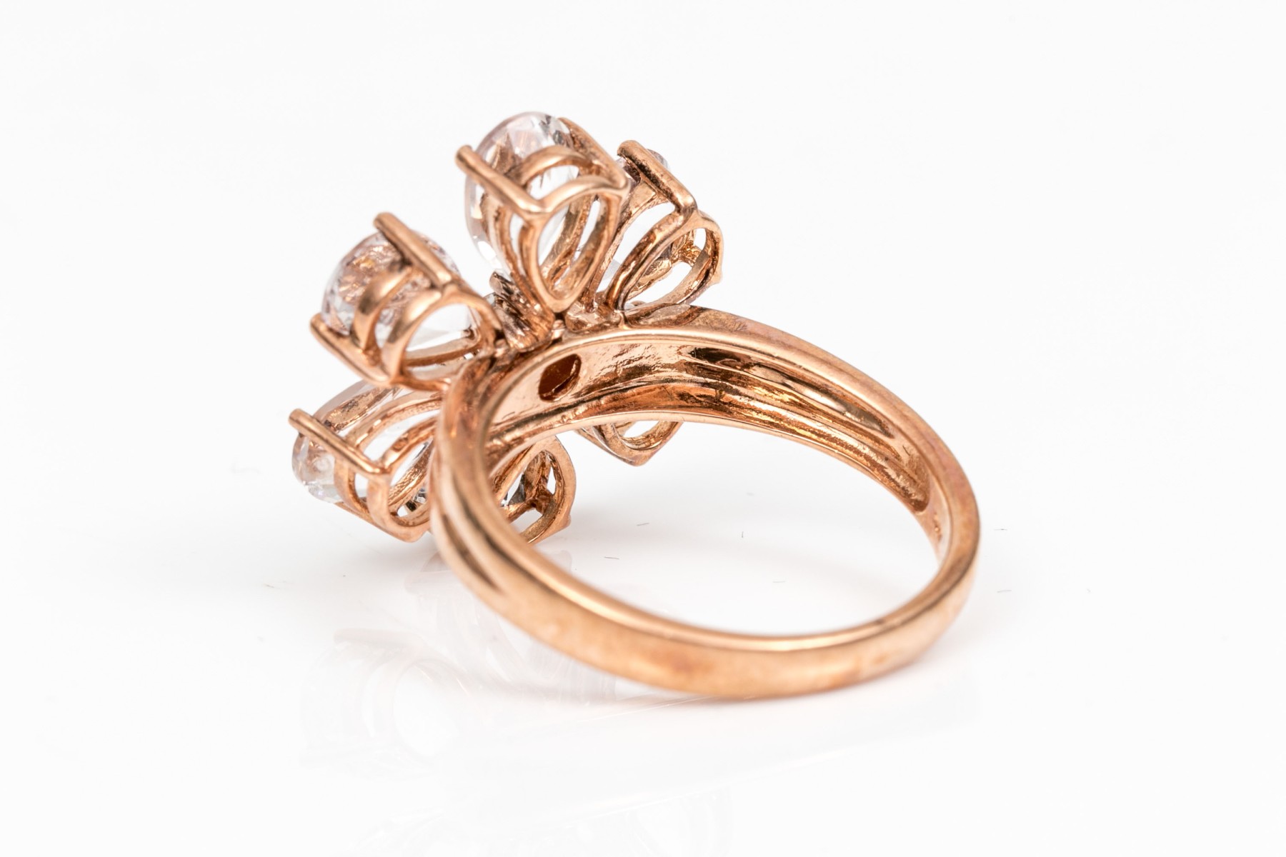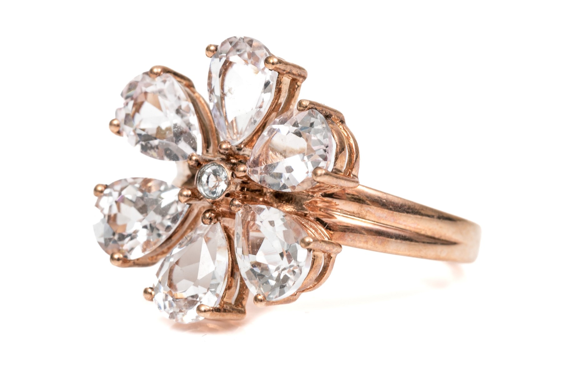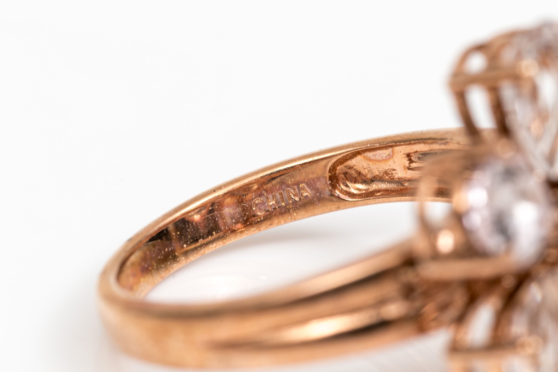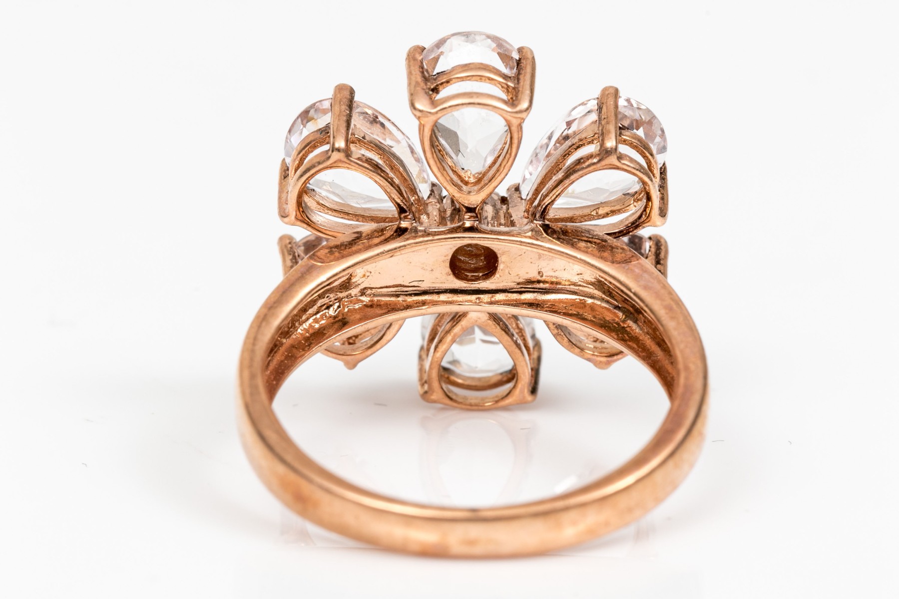 10k rose gold beautiful flower motif faceted white topaz ring, size 7+