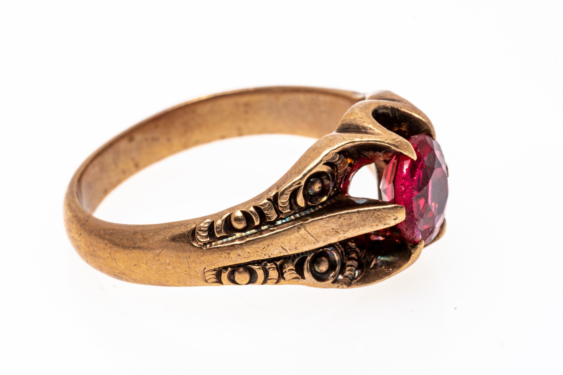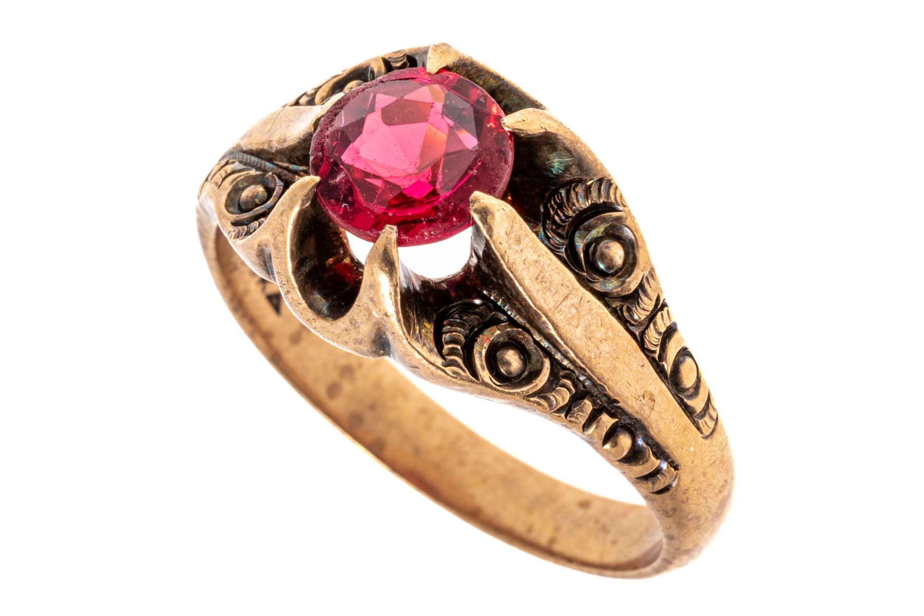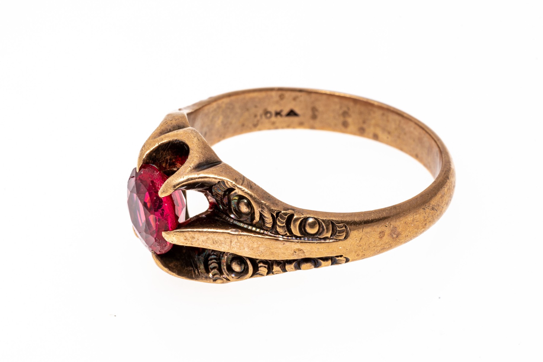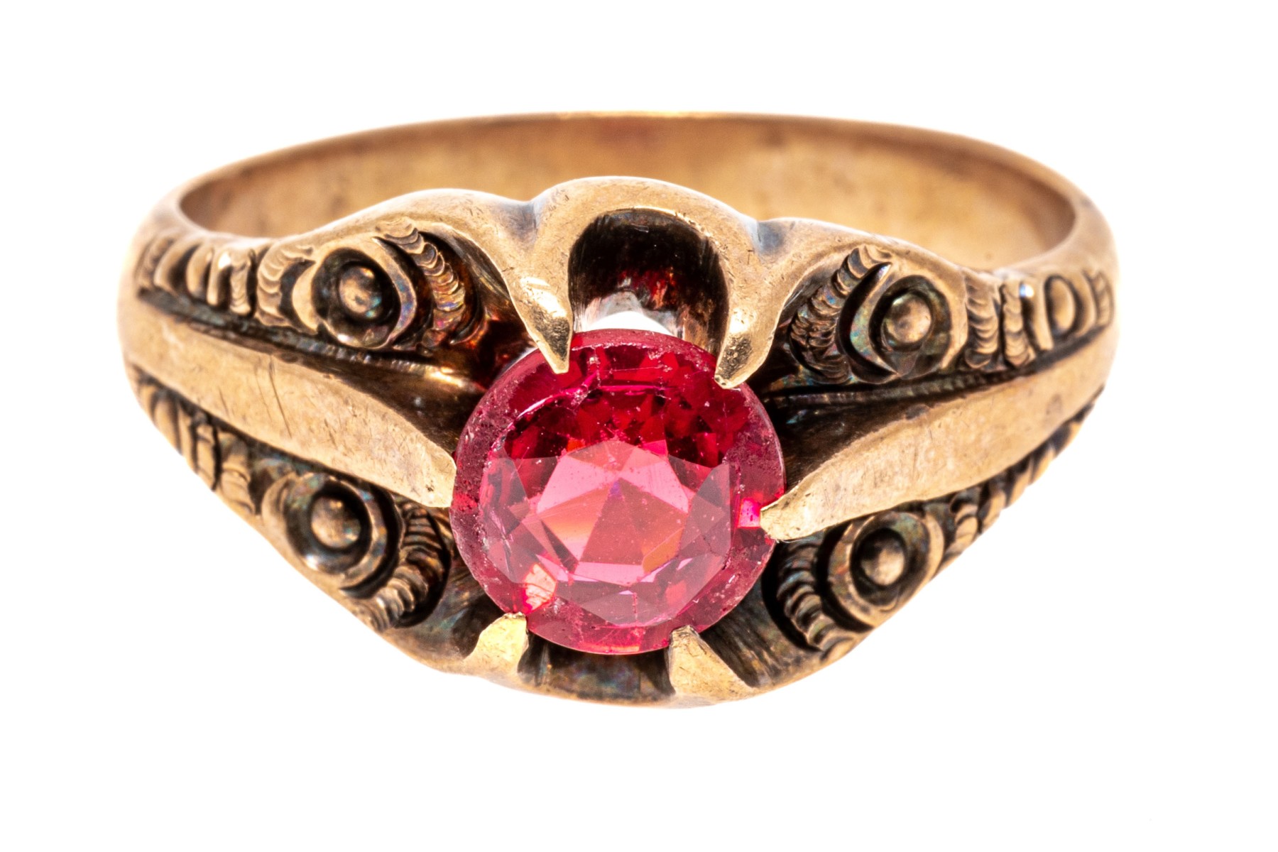10k rose gold handsome vintage chased chunky solitaire ring, with red glass center, prong set
