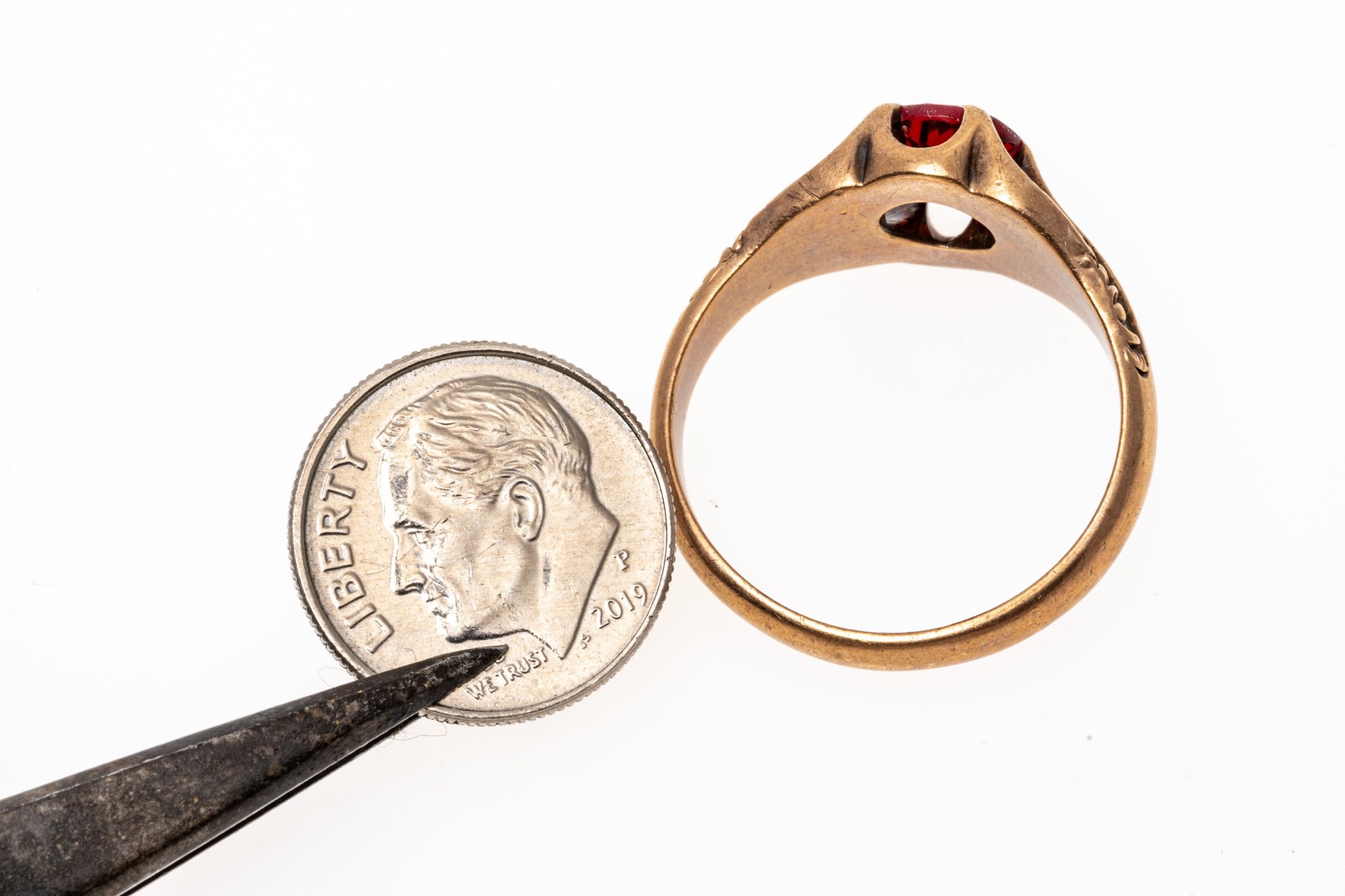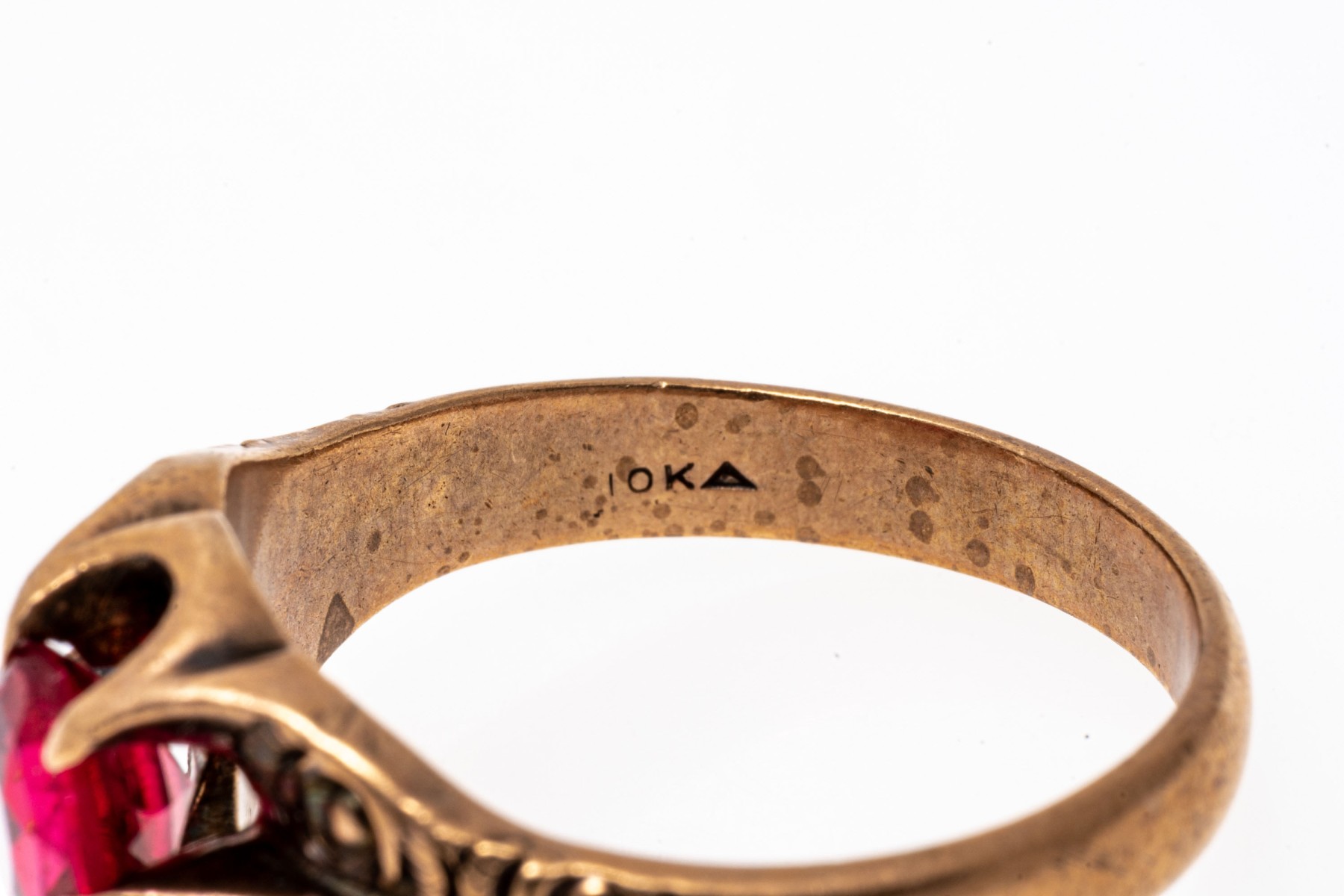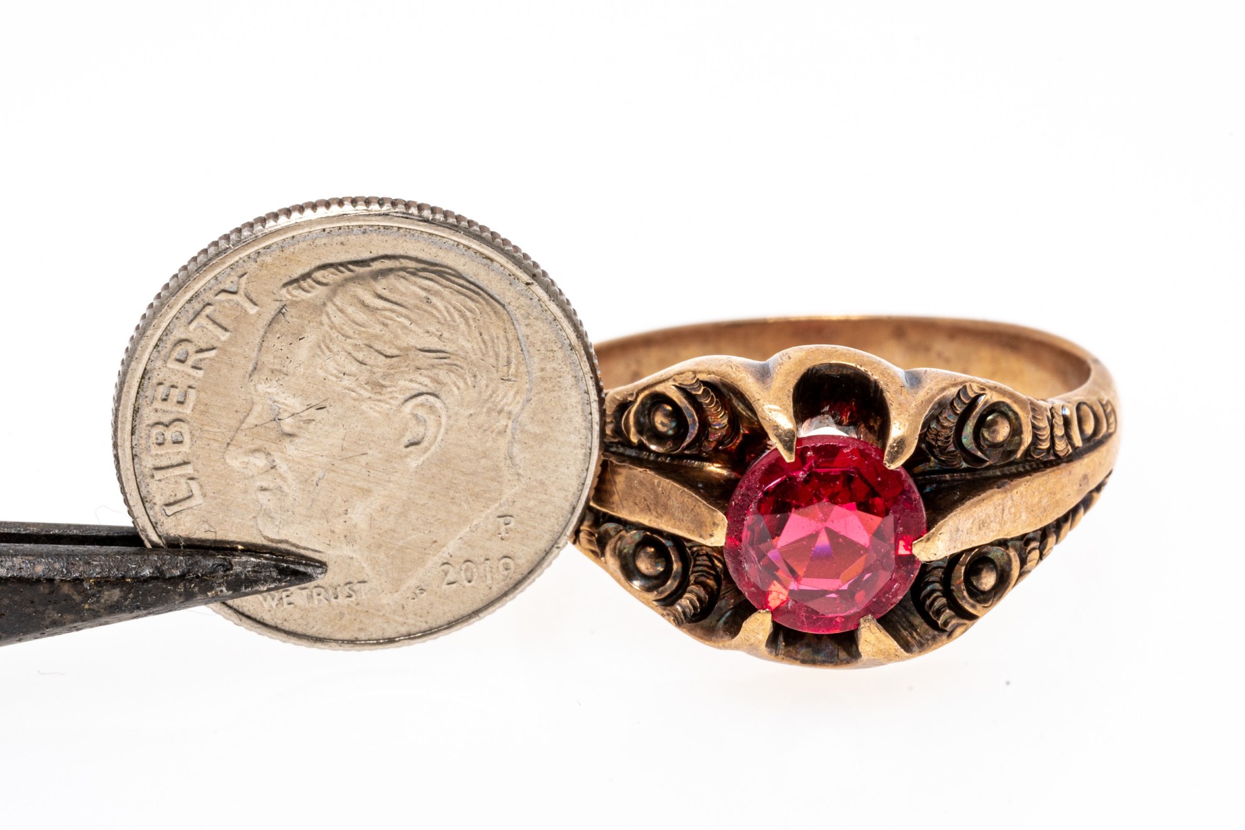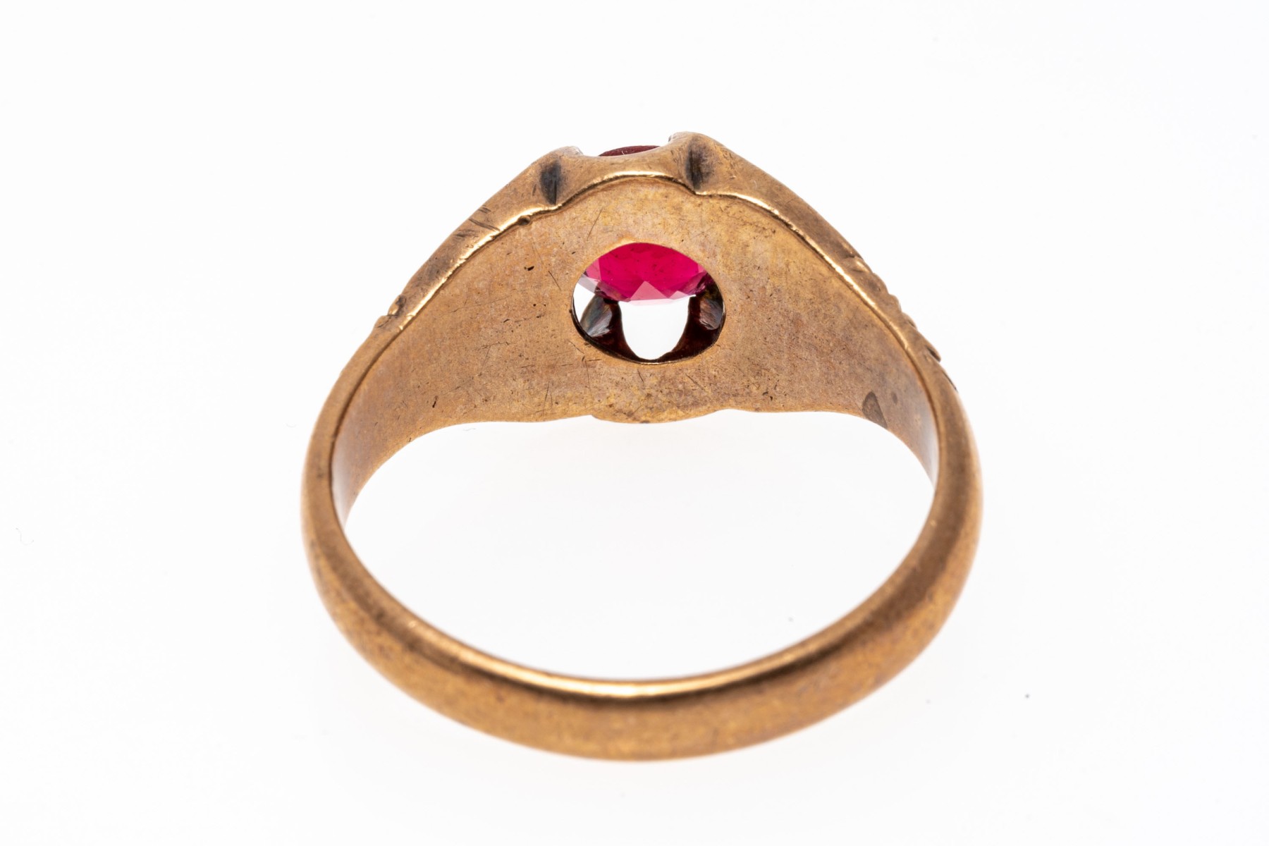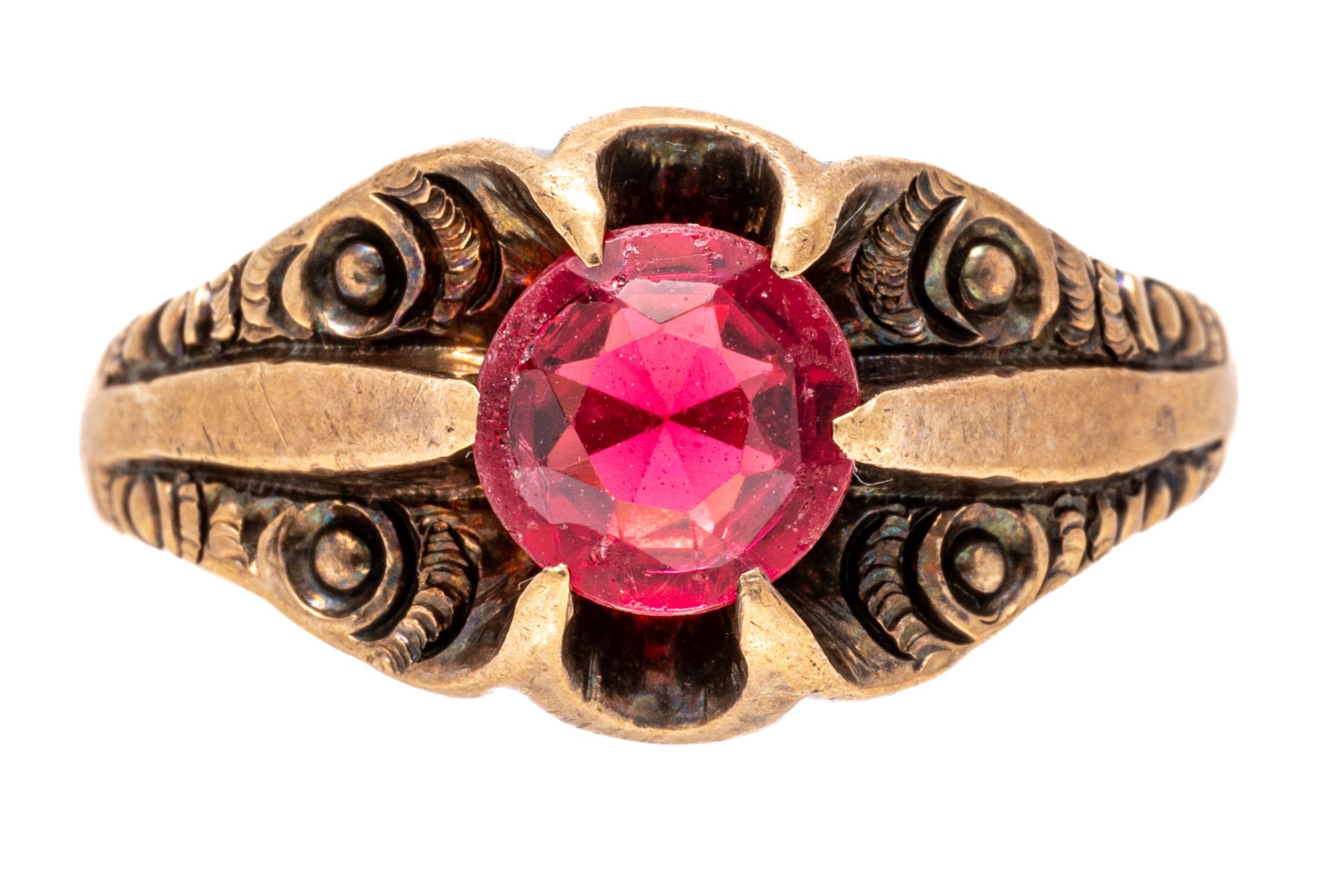 10k rose gold handsome vintage chased chunky solitaire ring, with red glass center, prong set