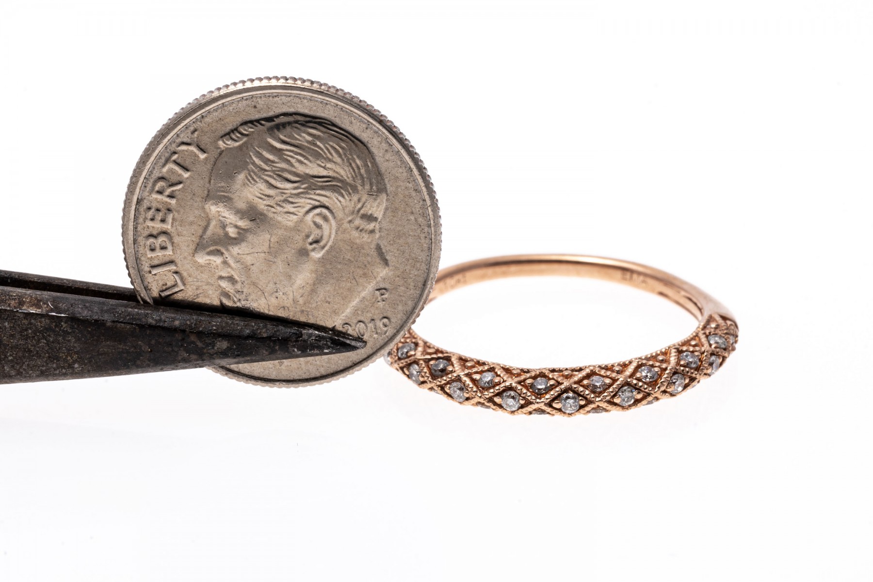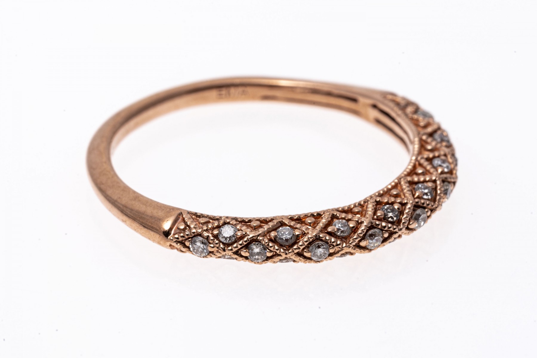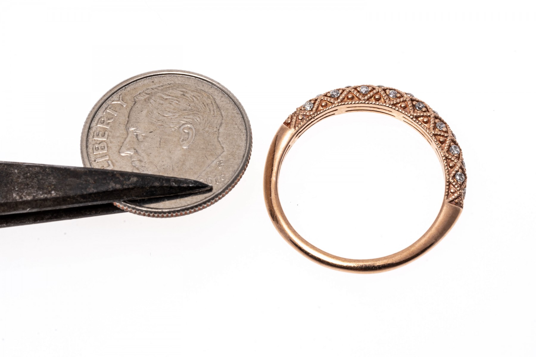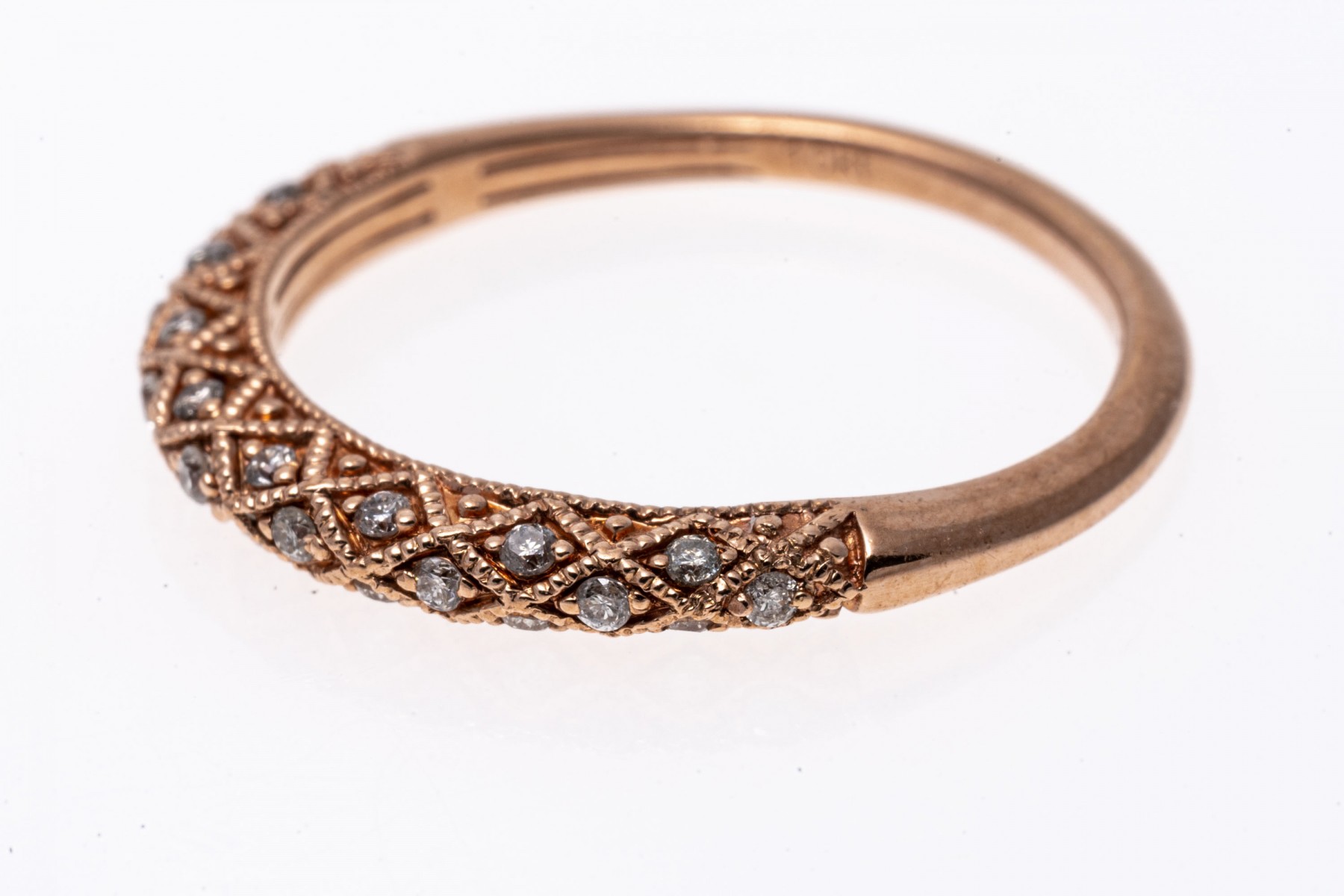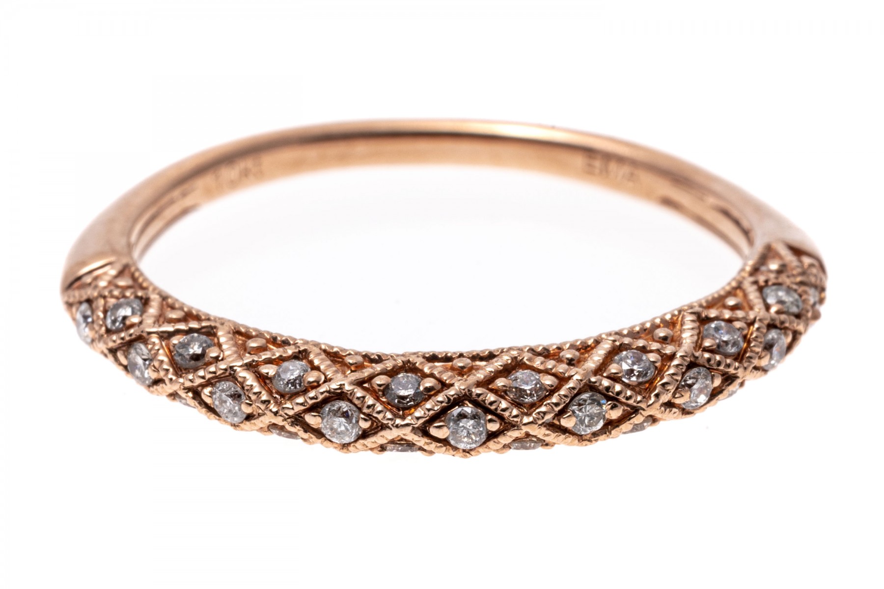 10k rose gold ring. This lovely band ring is an argyle pattern motif, decorated with beaded edging and set with round faceted diamonds, approximately 0.09 TCW. Ring size 7.