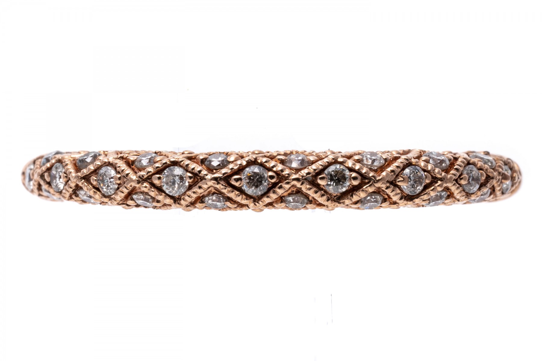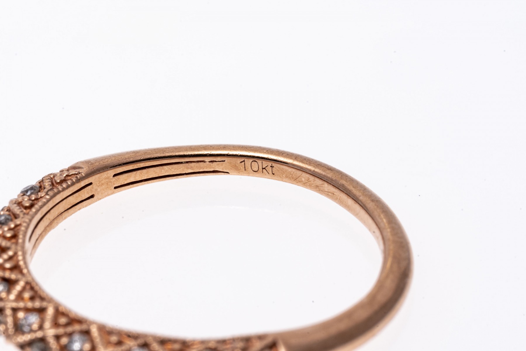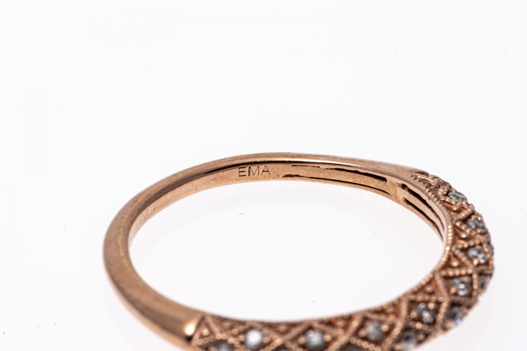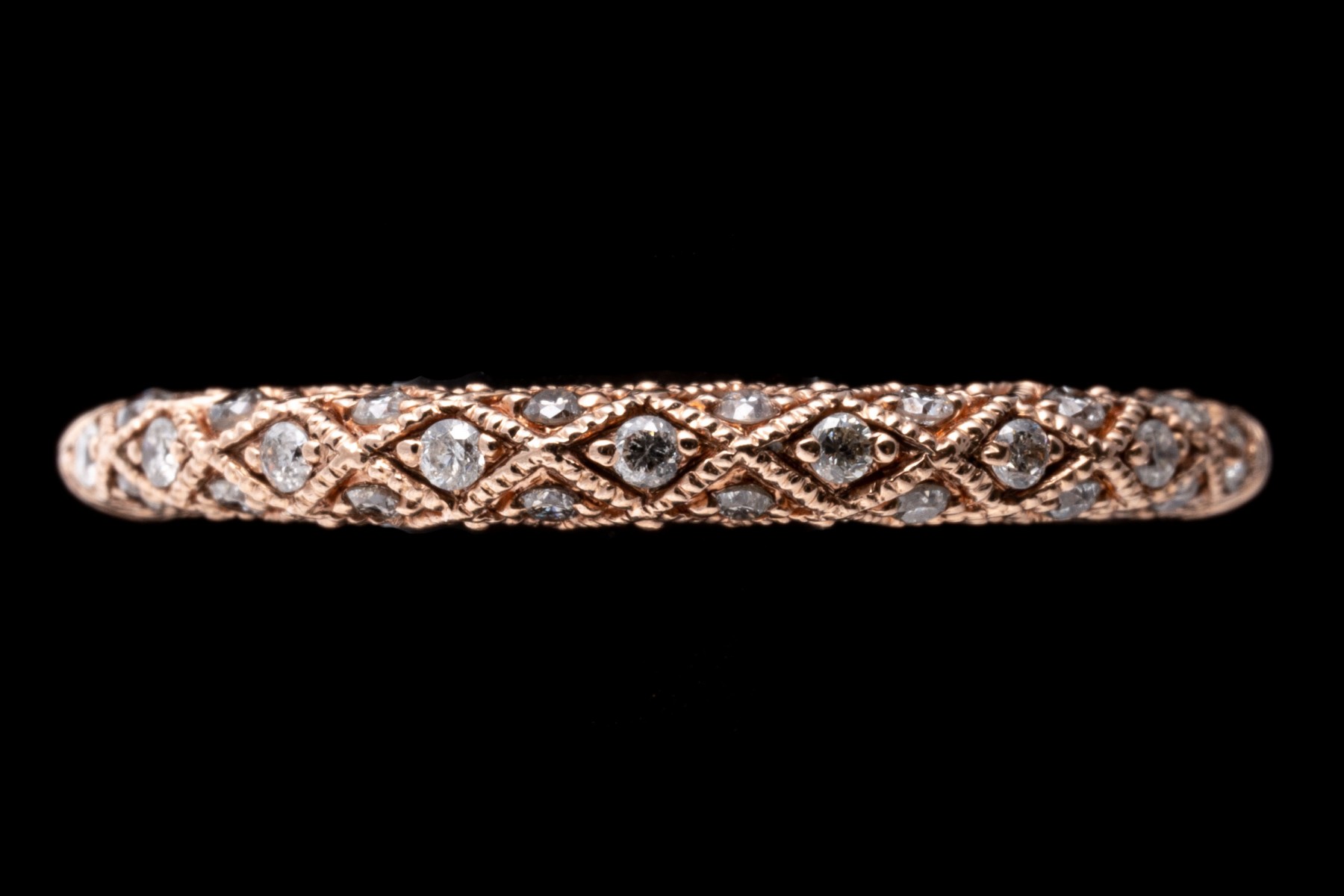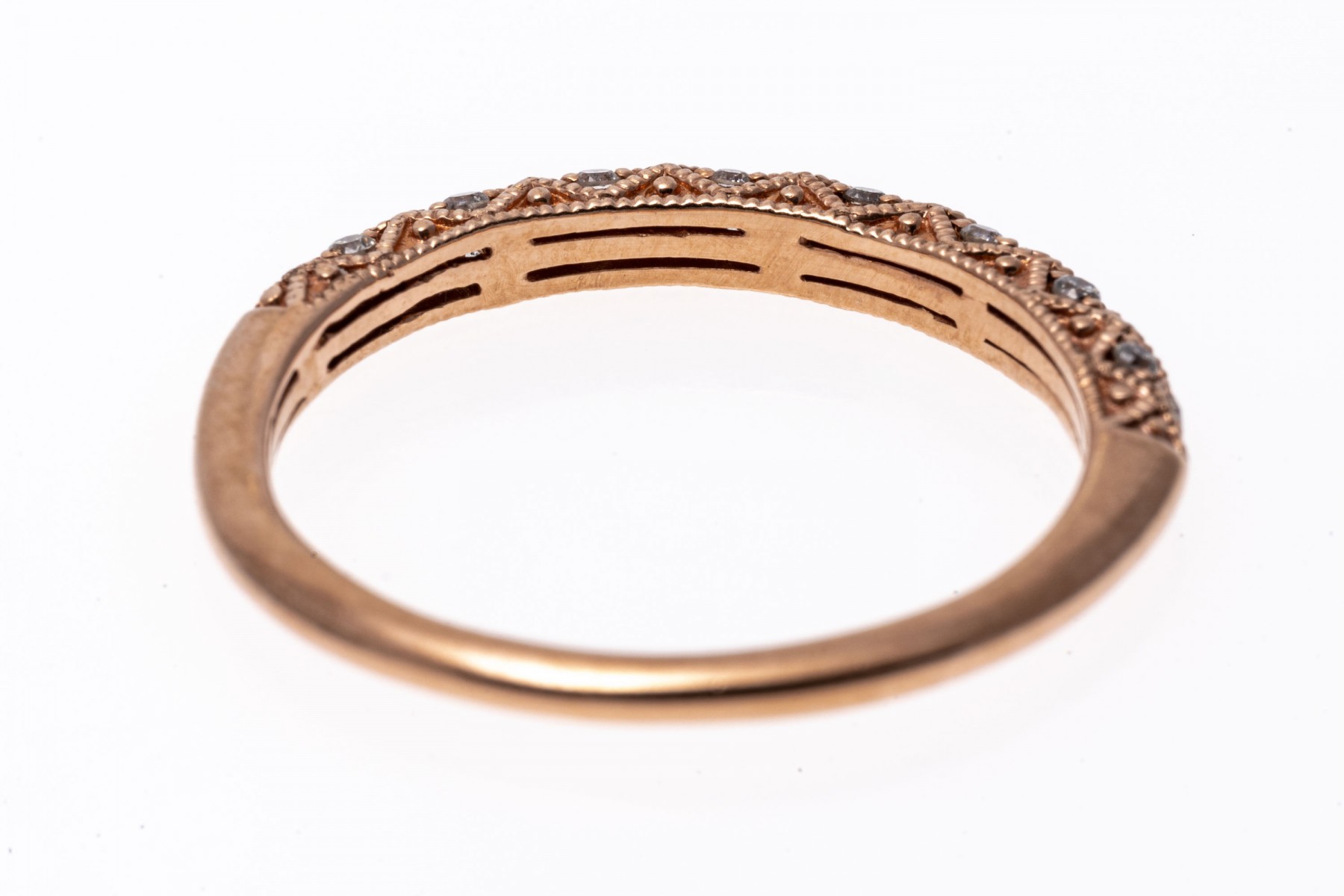 10k rose gold ring. This lovely band ring is an argyle pattern motif, decorated with beaded edging and set with round faceted diamonds, approximately 0.09 TCW. Ring size 7.