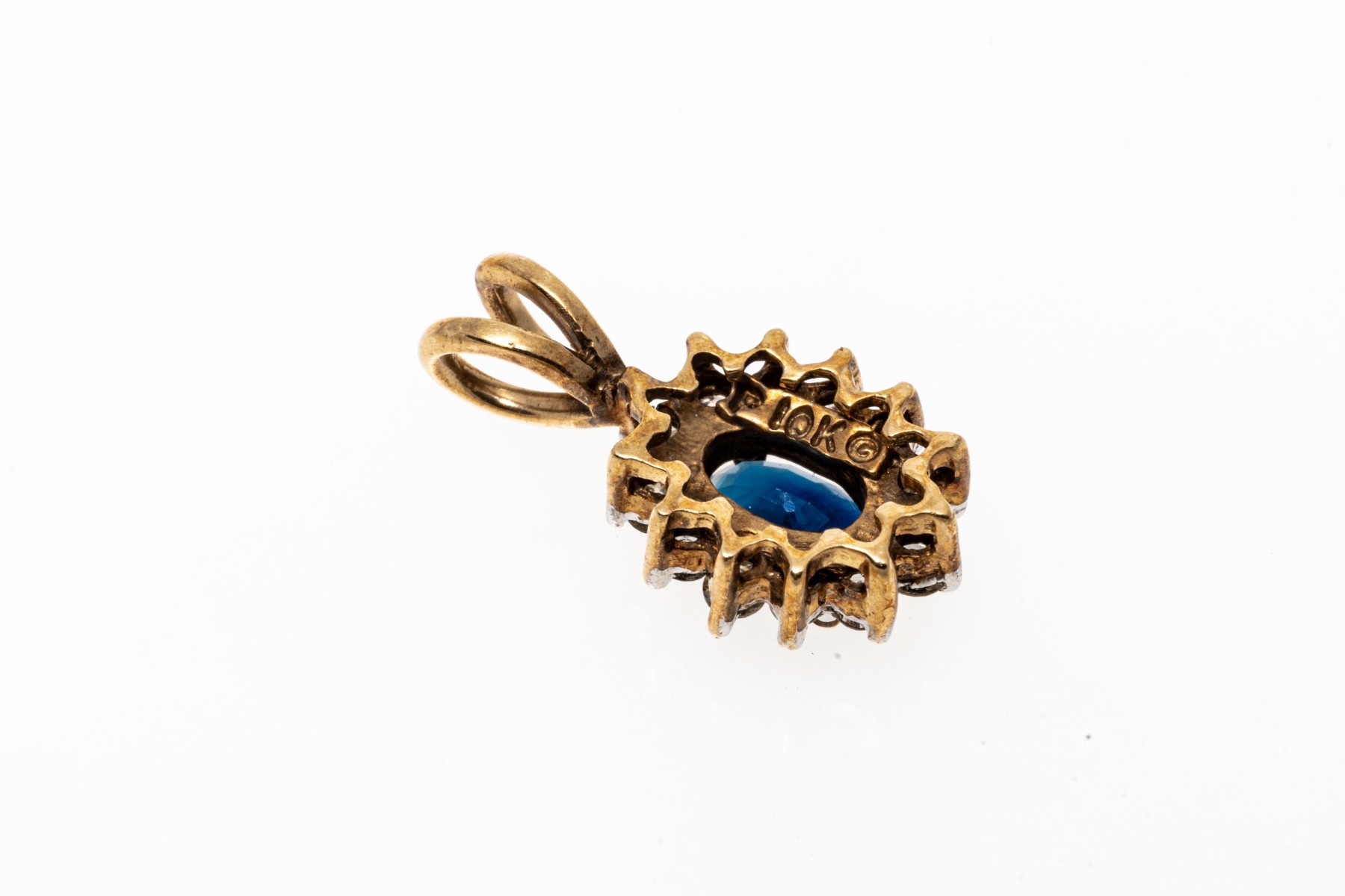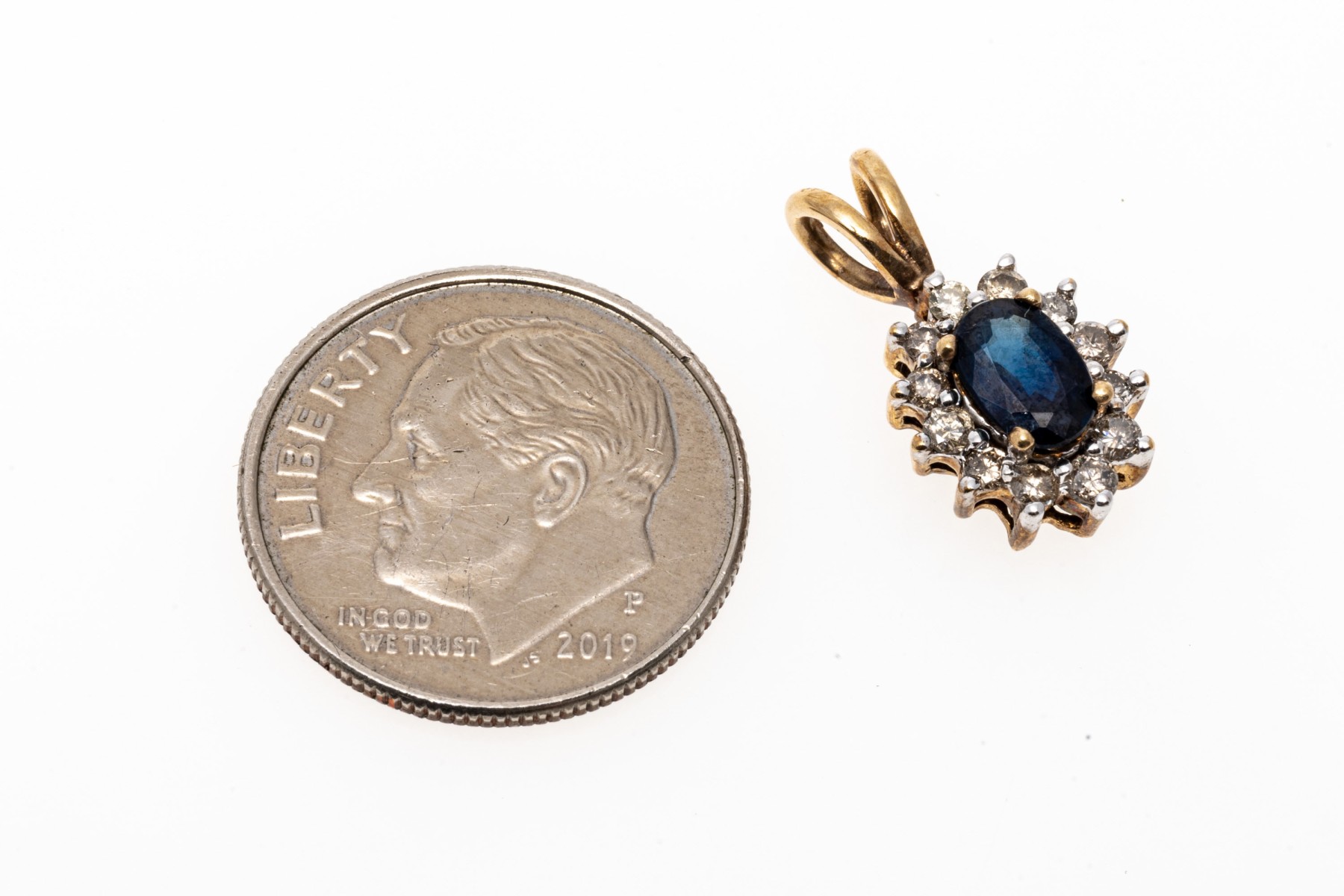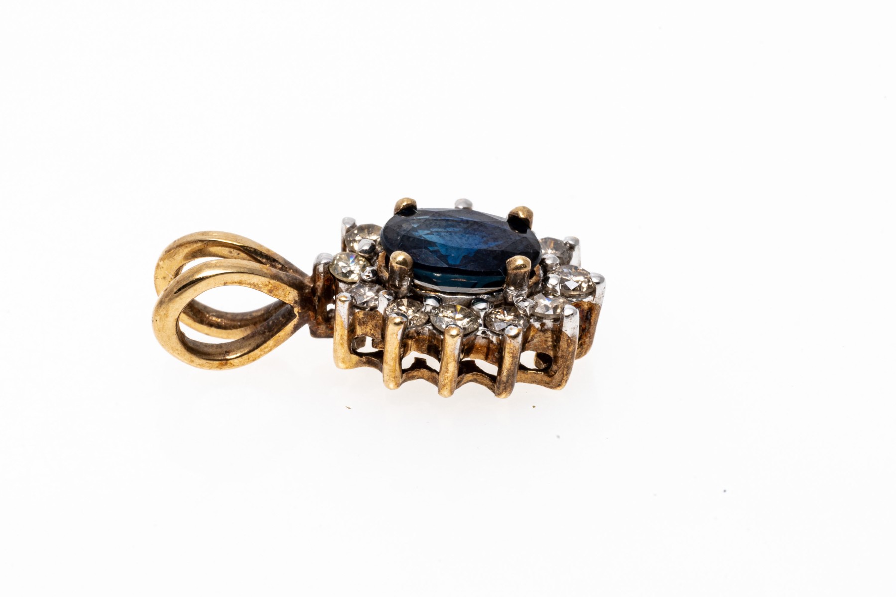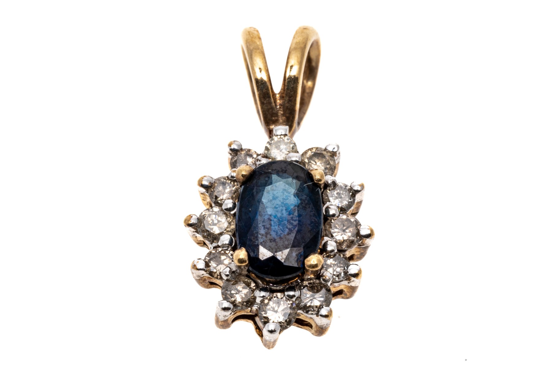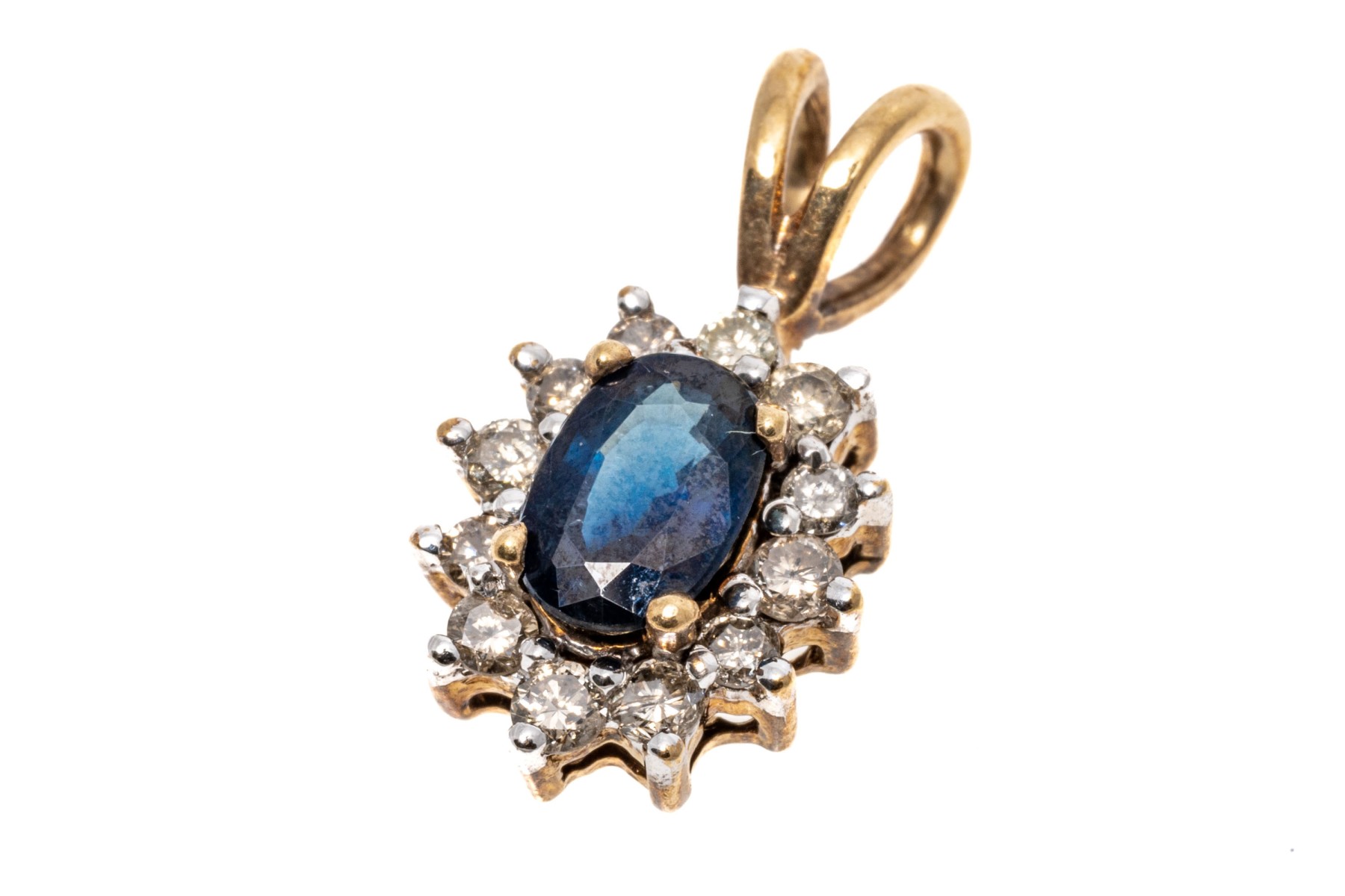 10K yellow gold pendant. A single oval cut sapphire is set with a halo of round brilliant cut diamonds. The sapphire is approximately 0.44 cts., and the diamonds are approximately 0.28 TCW.