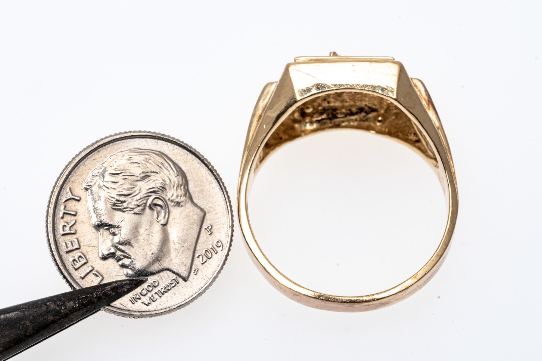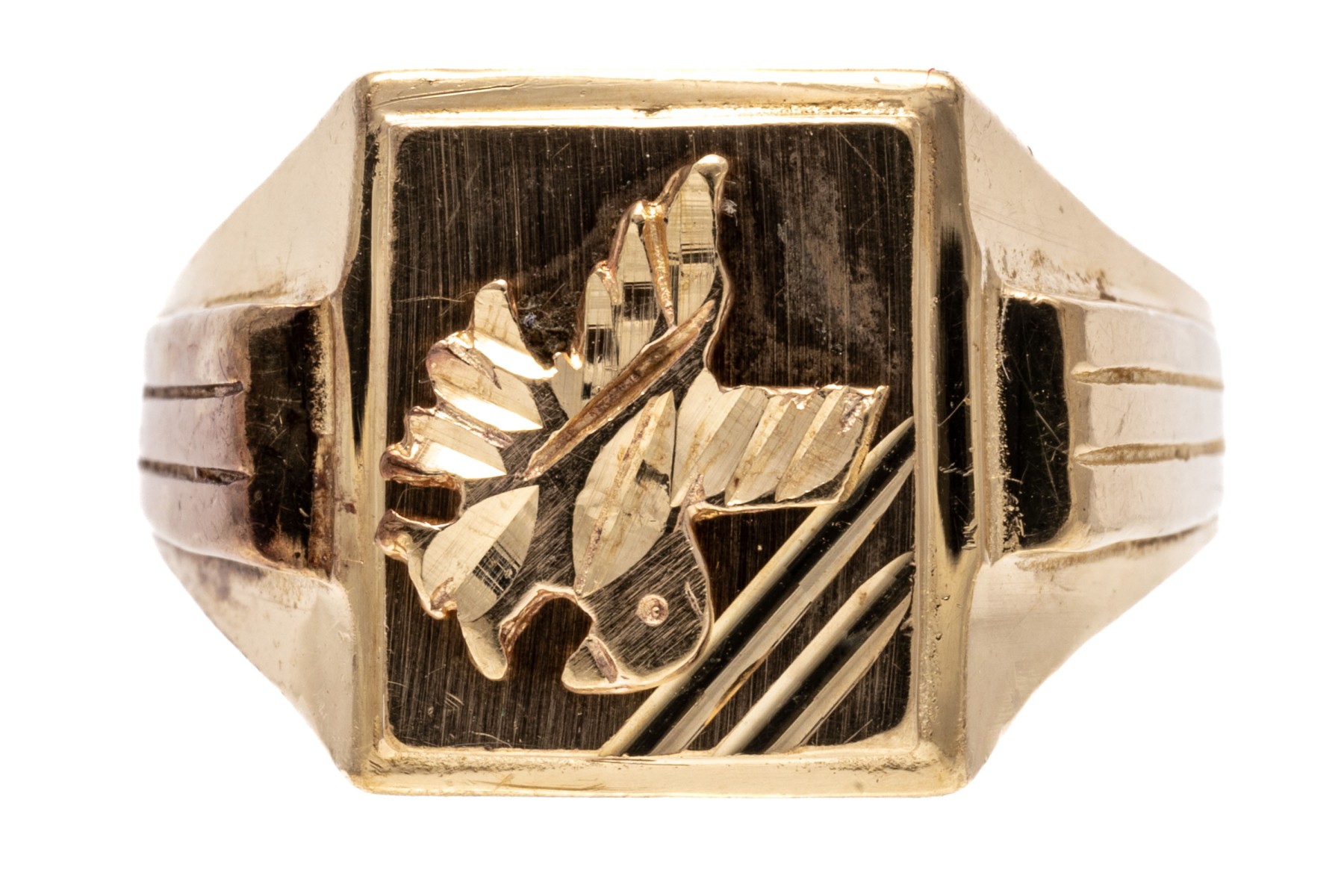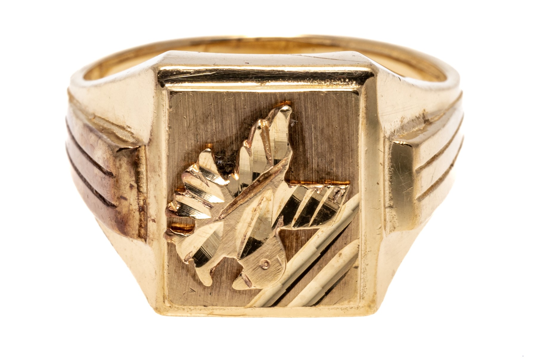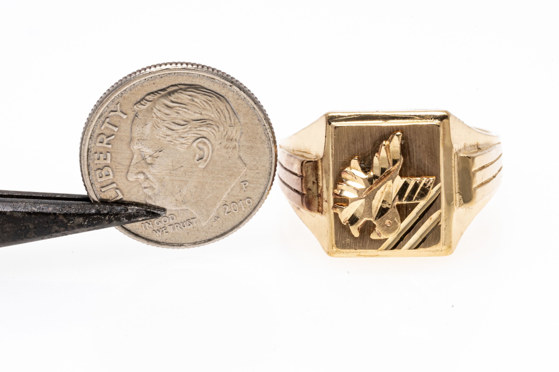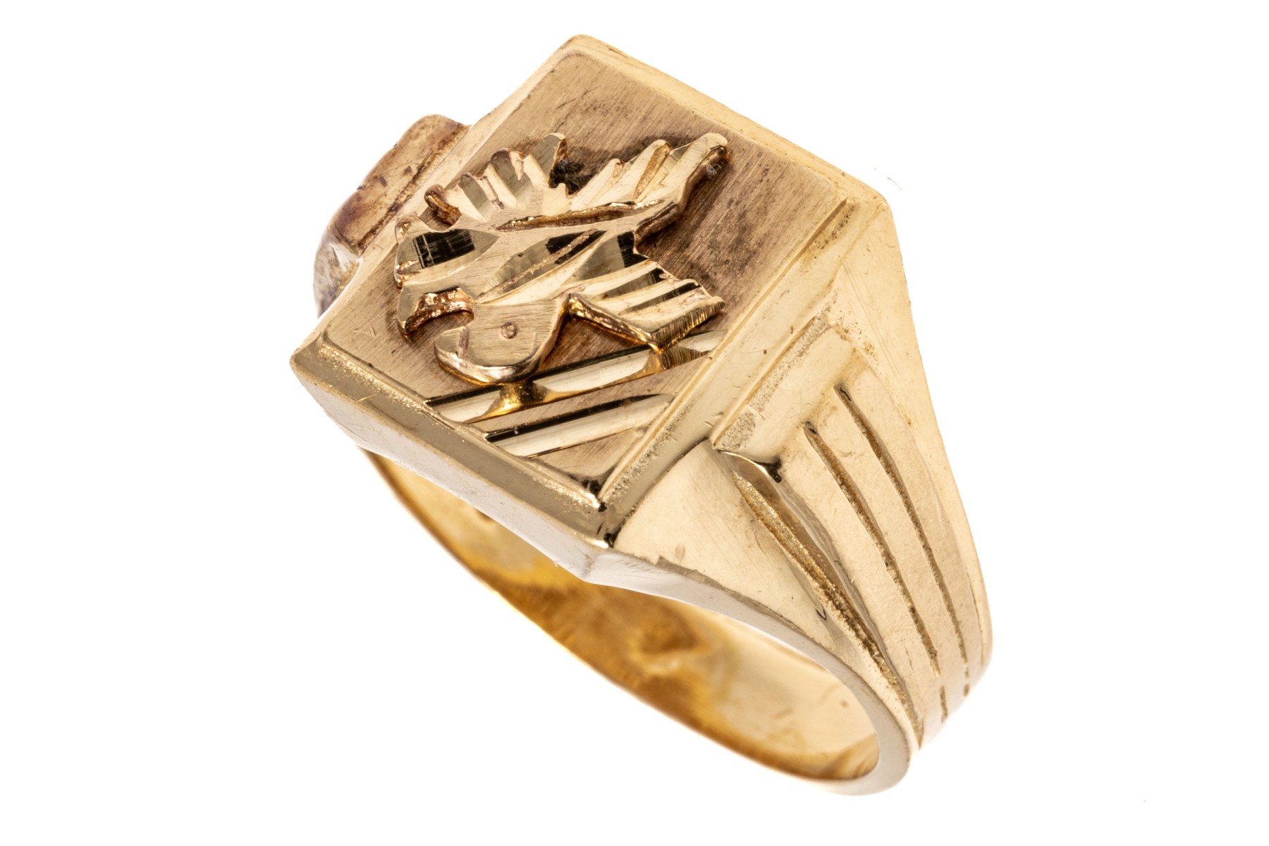 A 10K yellow gold ring. The ring's square face displays a bird with diamond cut accents. Raised ribbed shoulders. Ring size 9.
