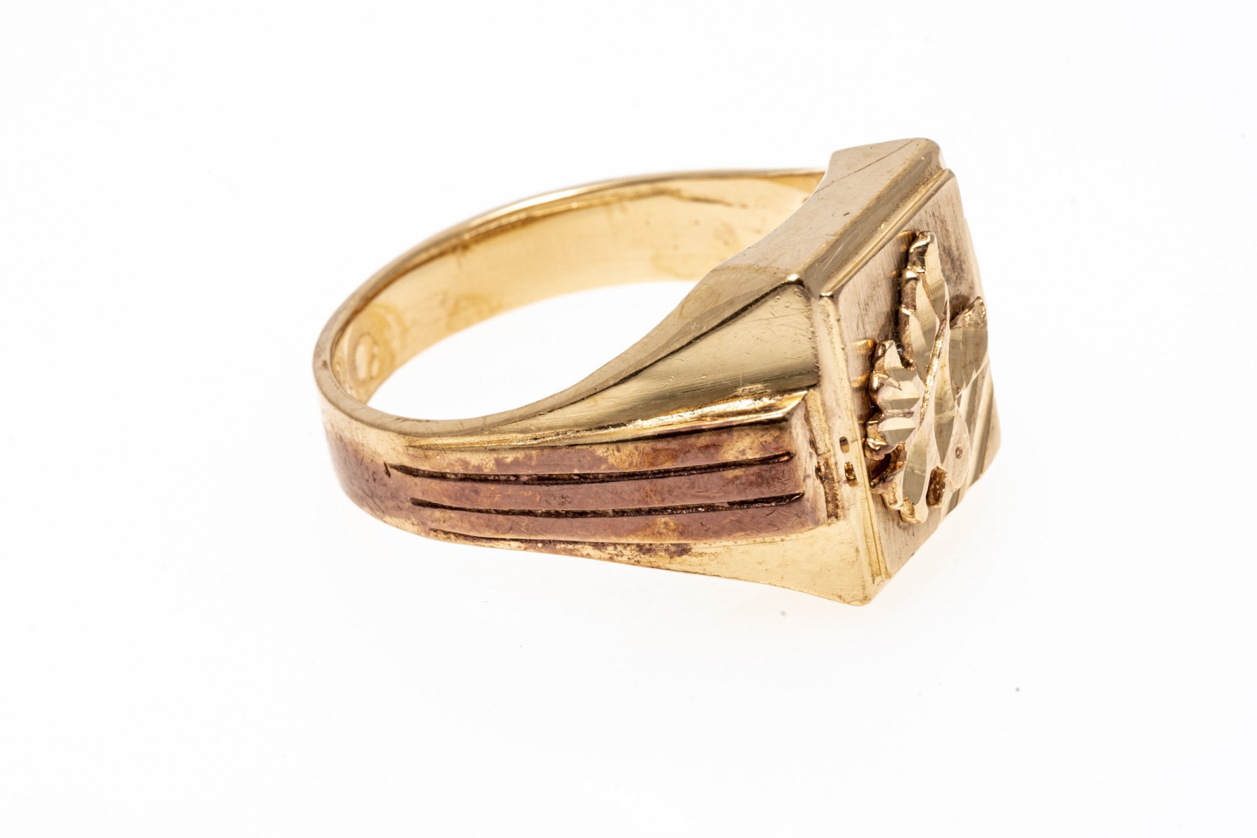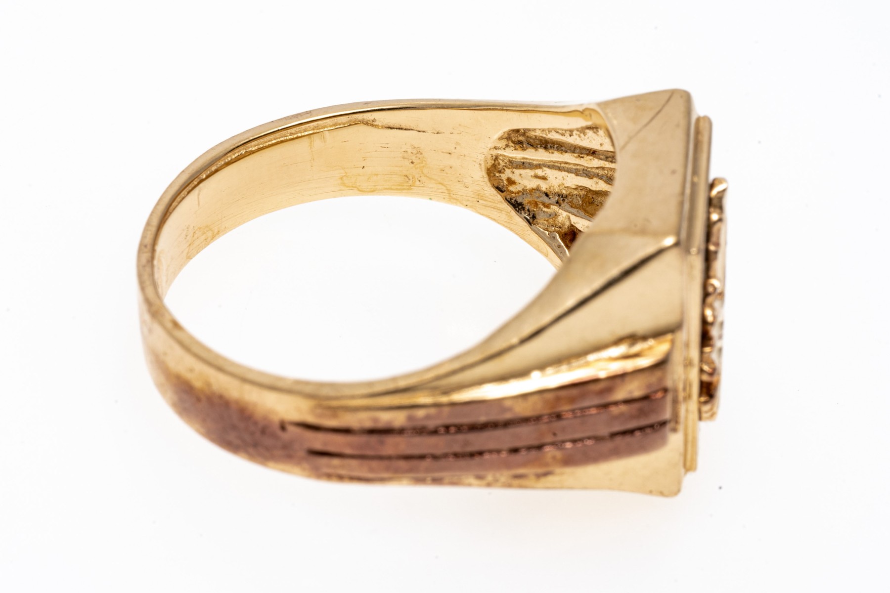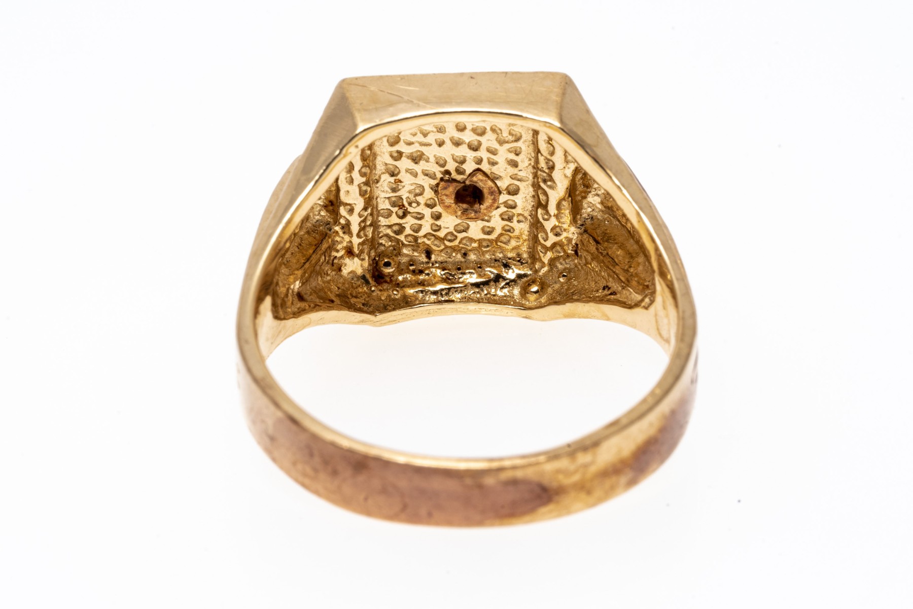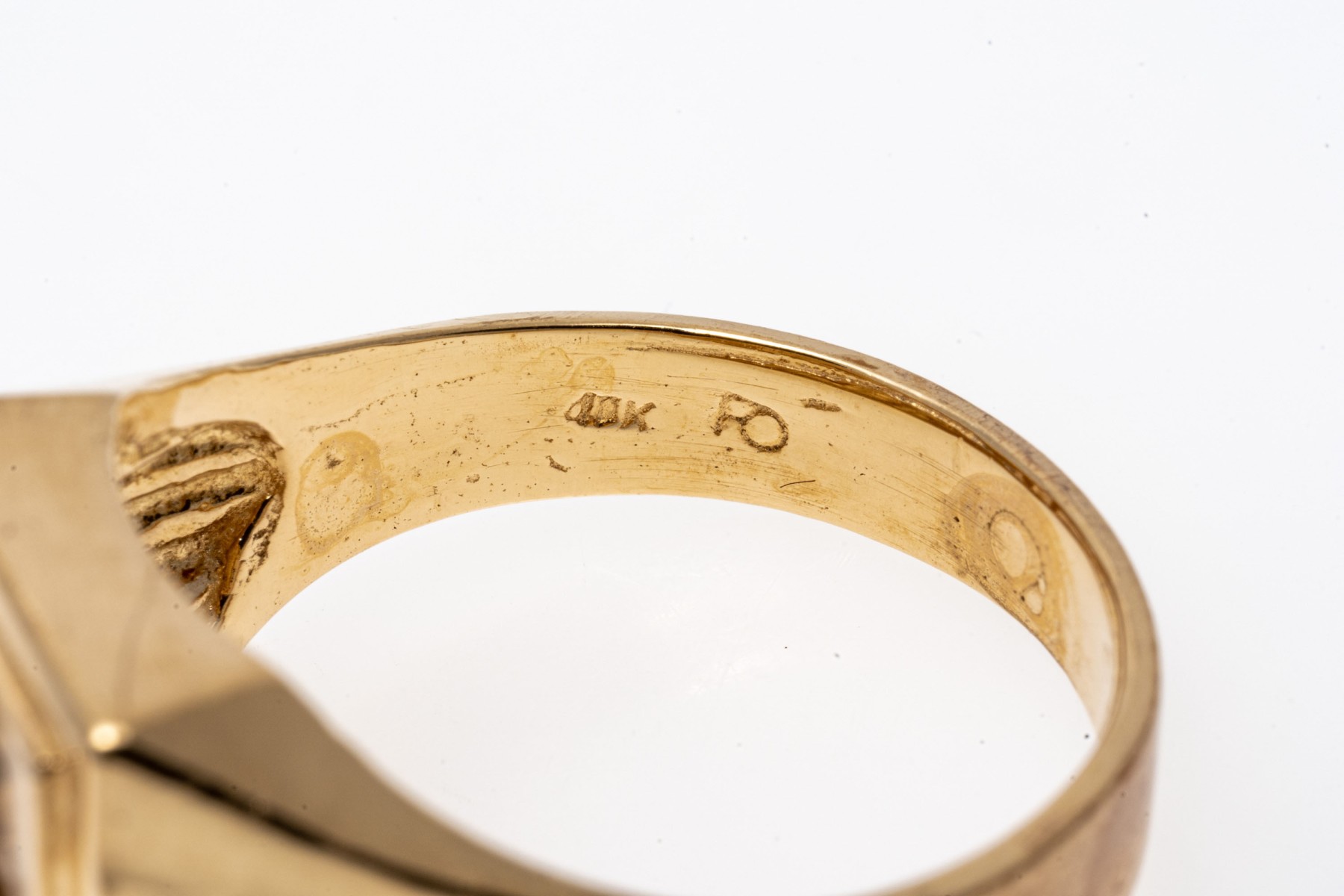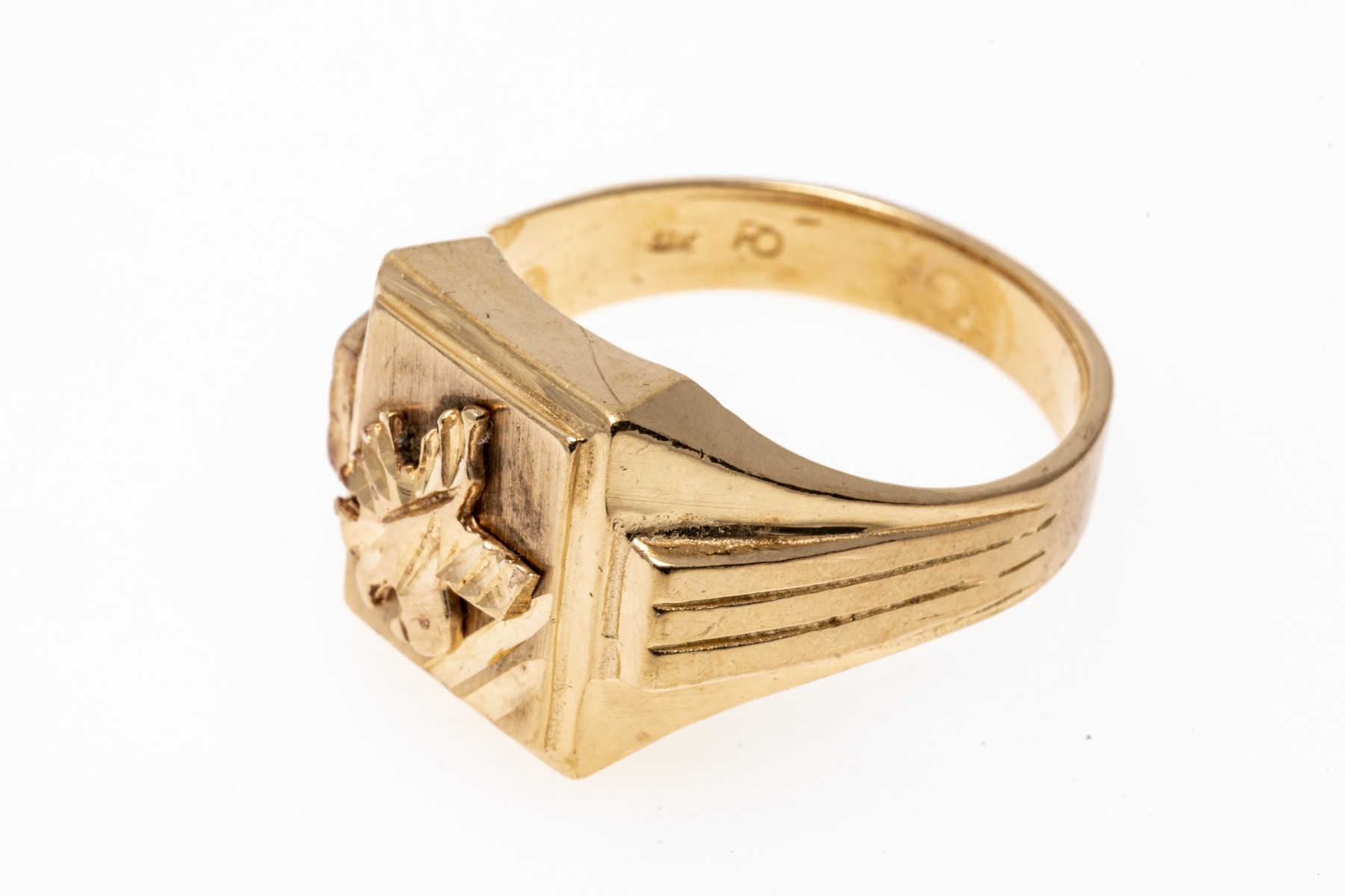 A 10K yellow gold ring. The ring's square face displays a bird with diamond cut accents. Raised ribbed shoulders. Ring size 9.
