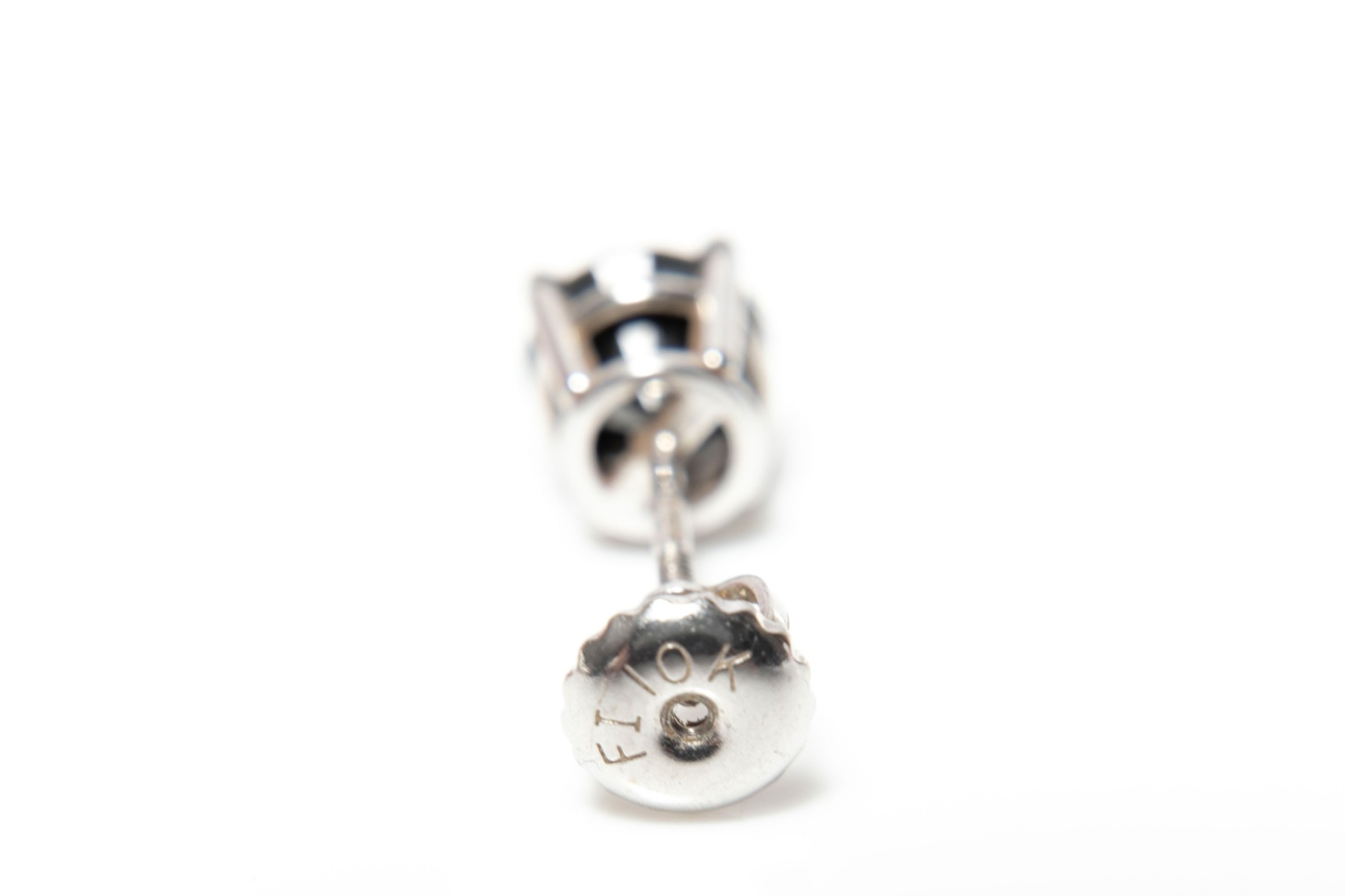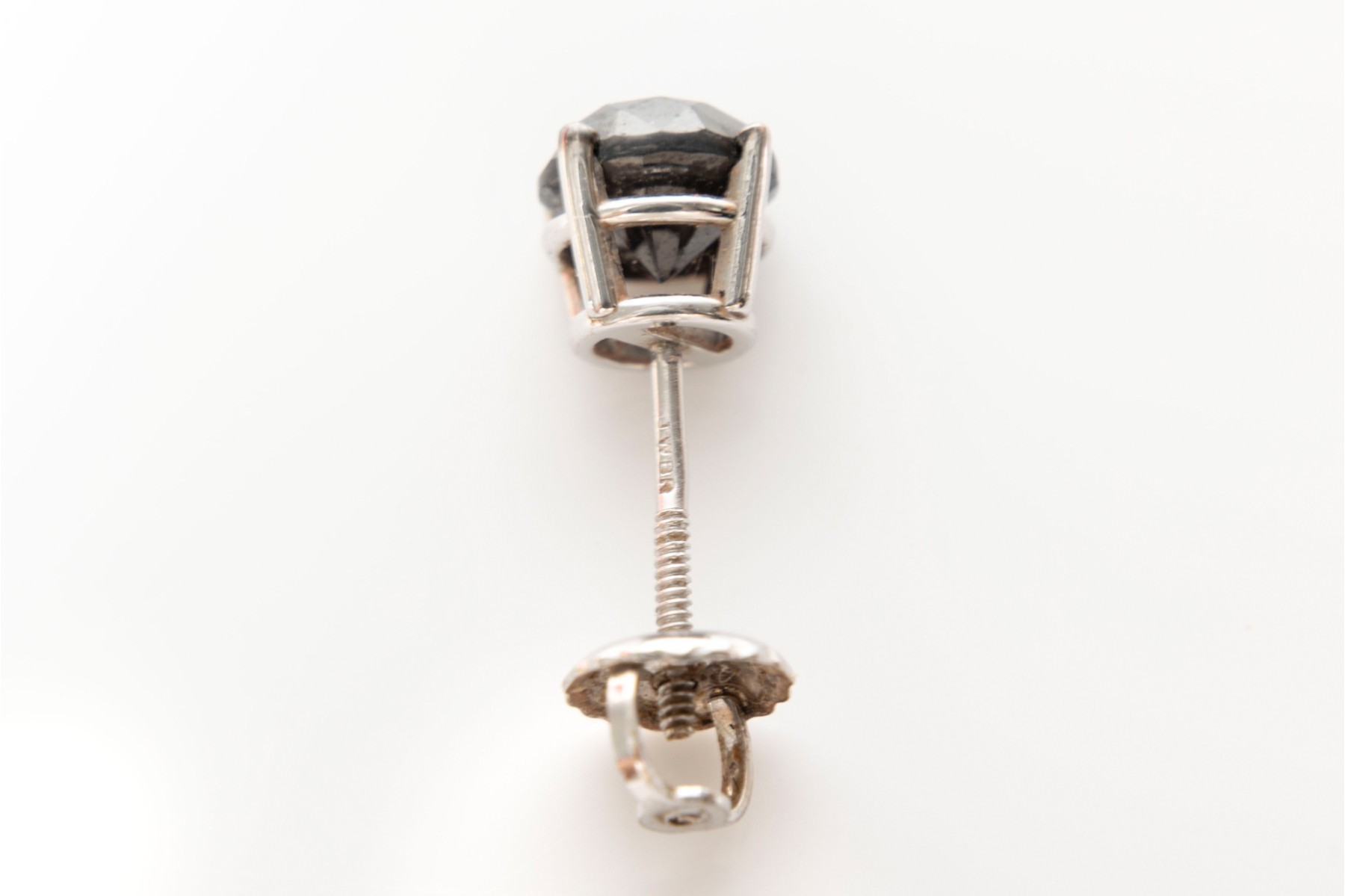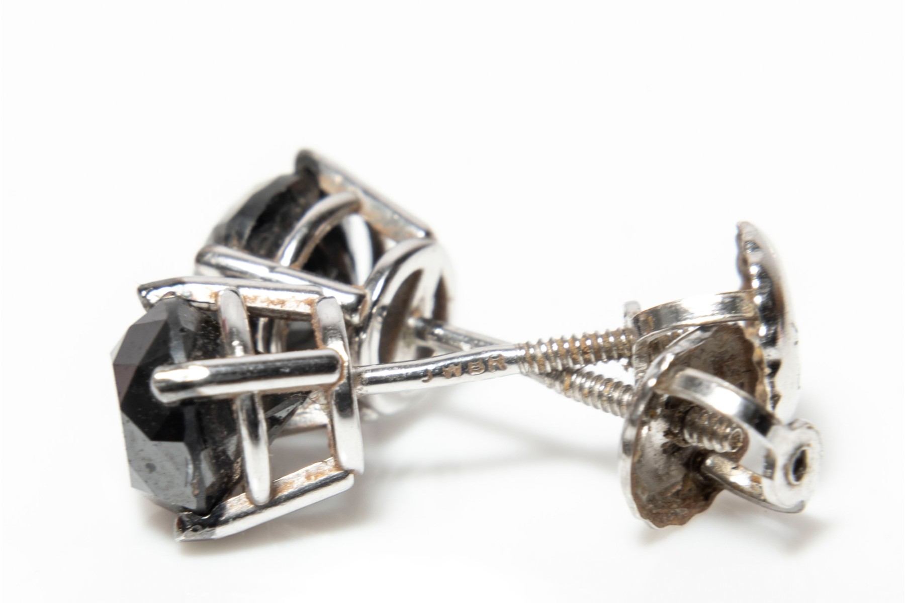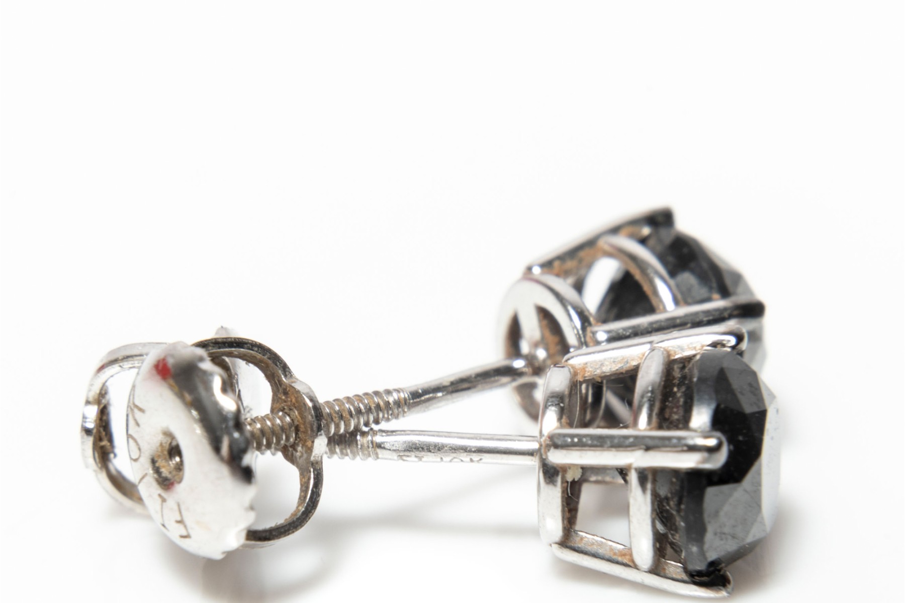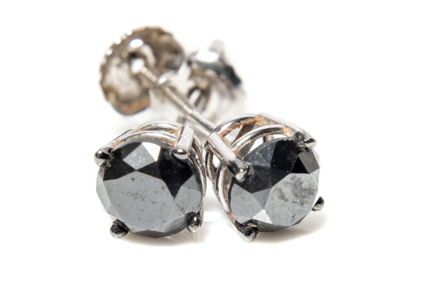 A pair of striking white gold studs displaying faceted round black diamonds in prong settings; approximately 1.50 TCW. Finished with threaded posts and screw backings.