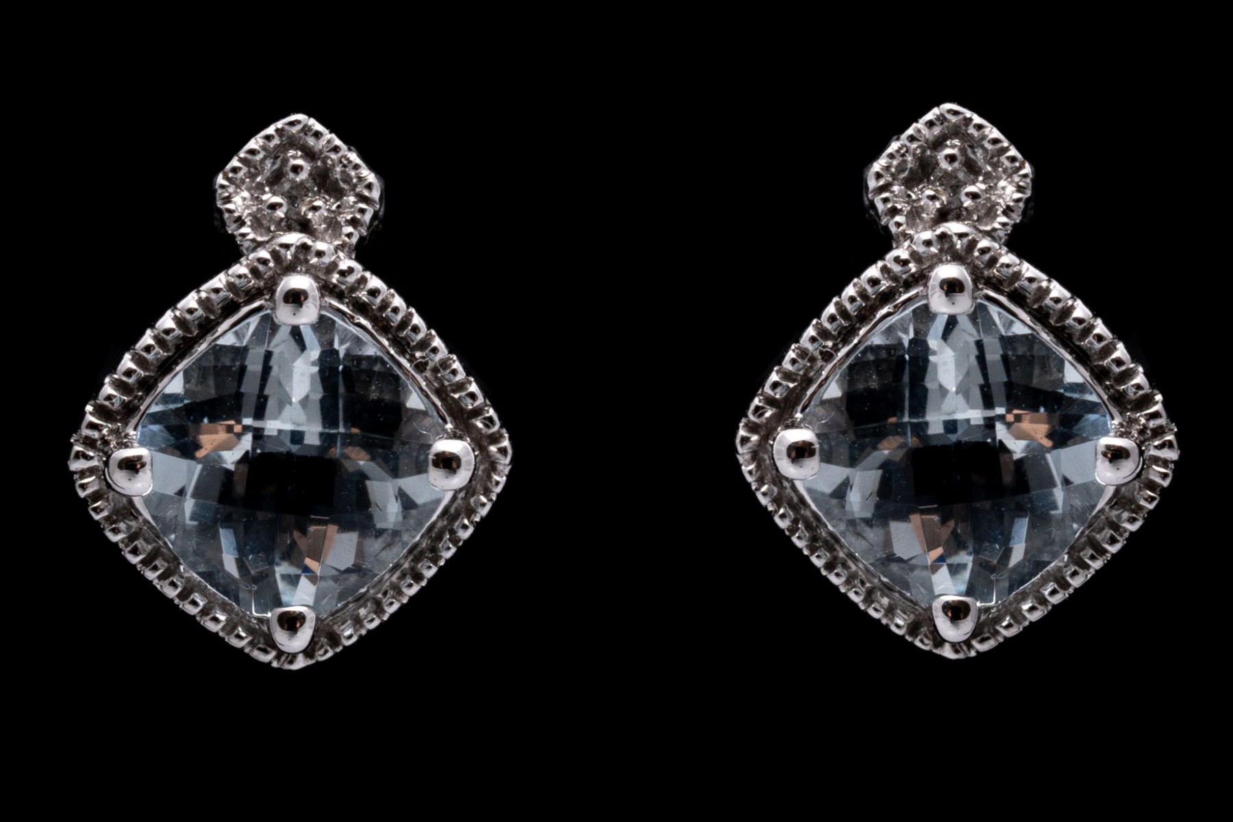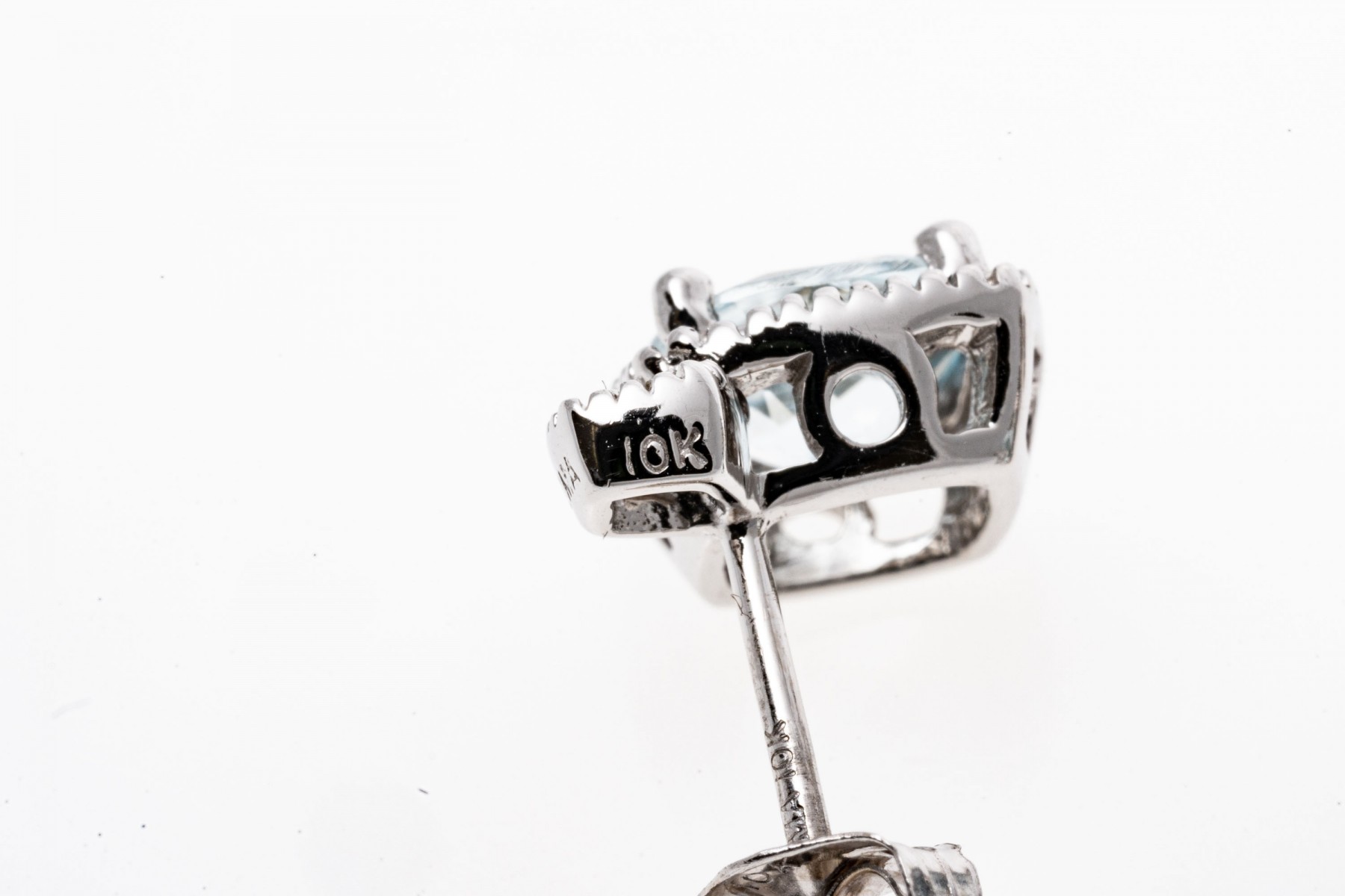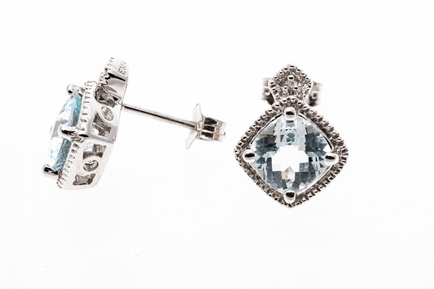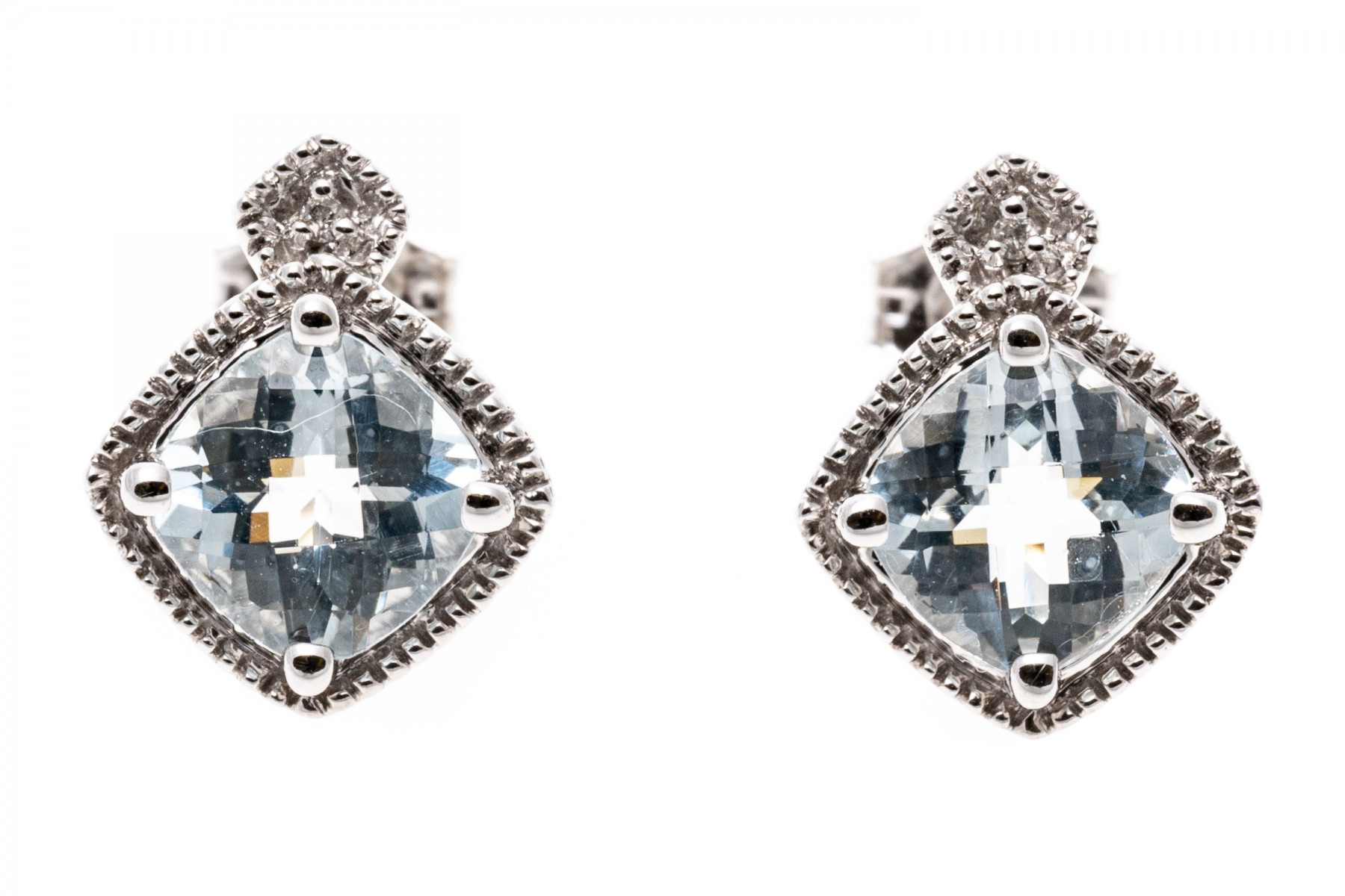 10k white gold earrings. These striking stud earrings contain square checkerboard cut, pale blue aquamarines, approximately 1.52 TCW. The earrings are set within a ribbed frame, and accented with a round faceted diamond, approximately 0.01 TCW. The earrings have post and clutch style backs.