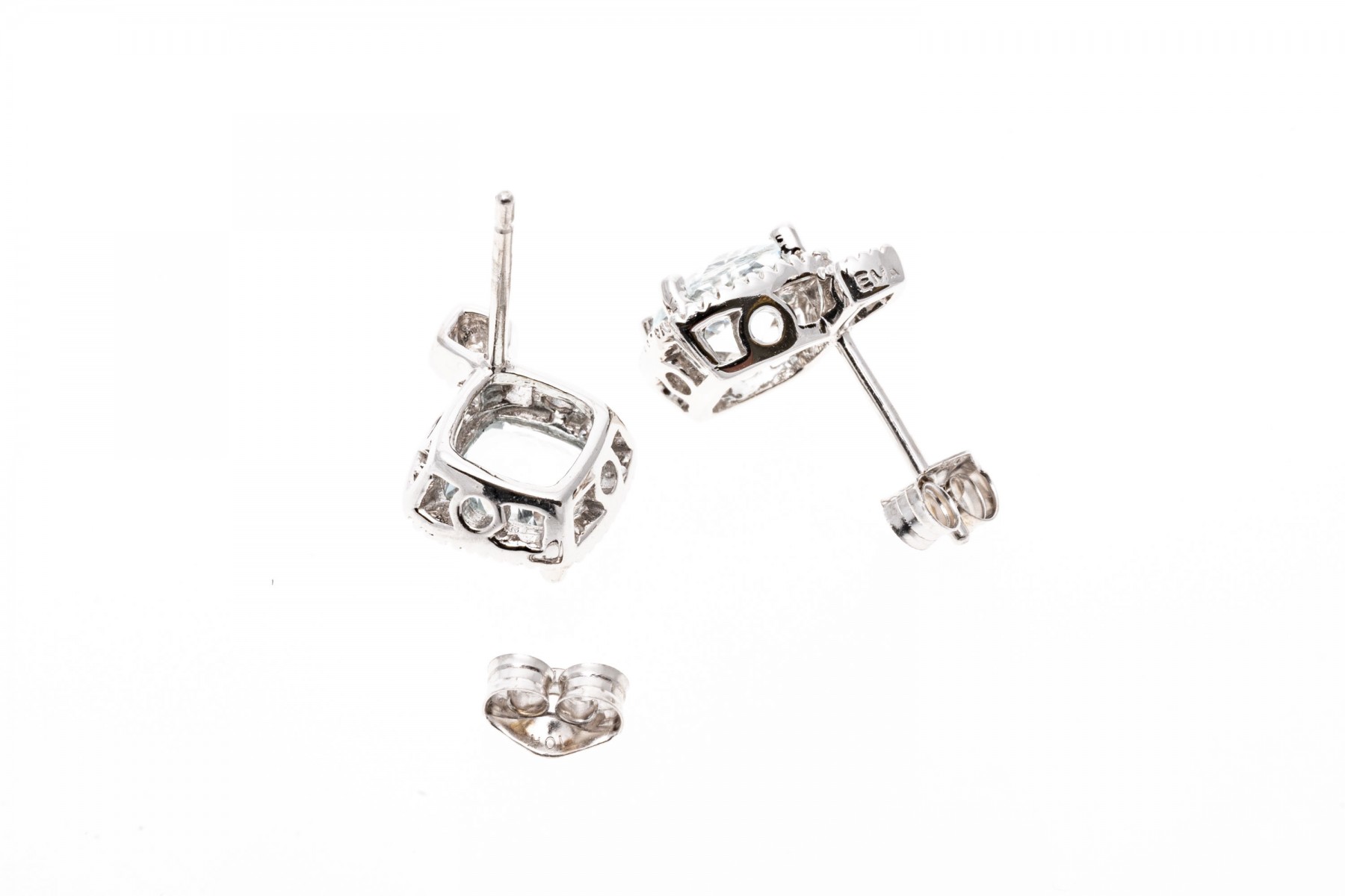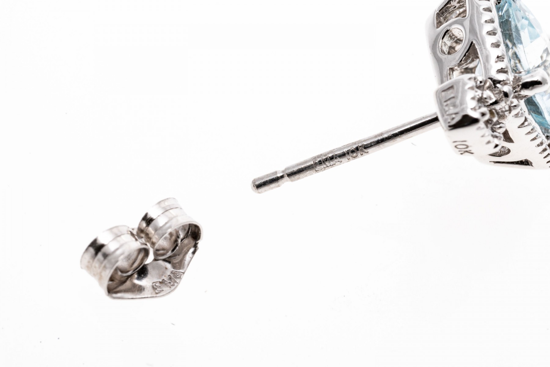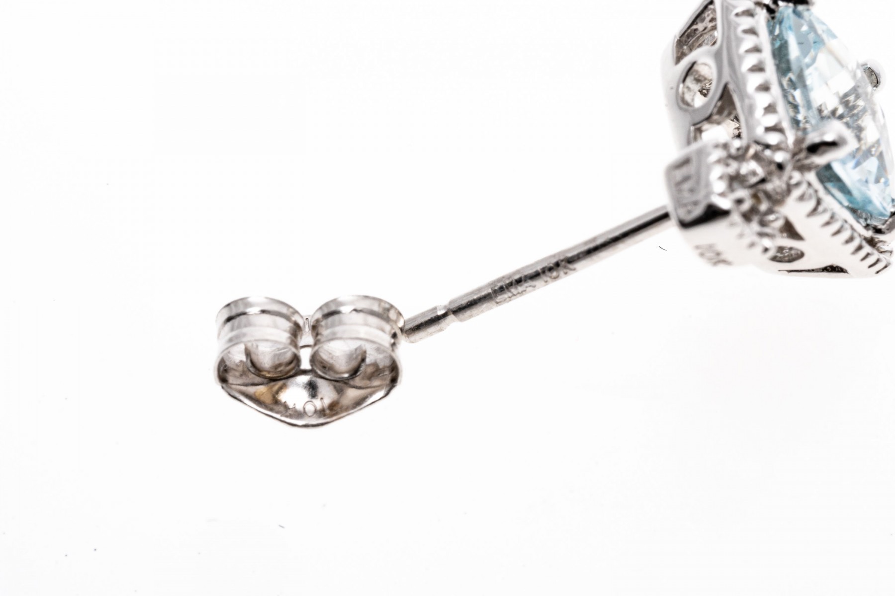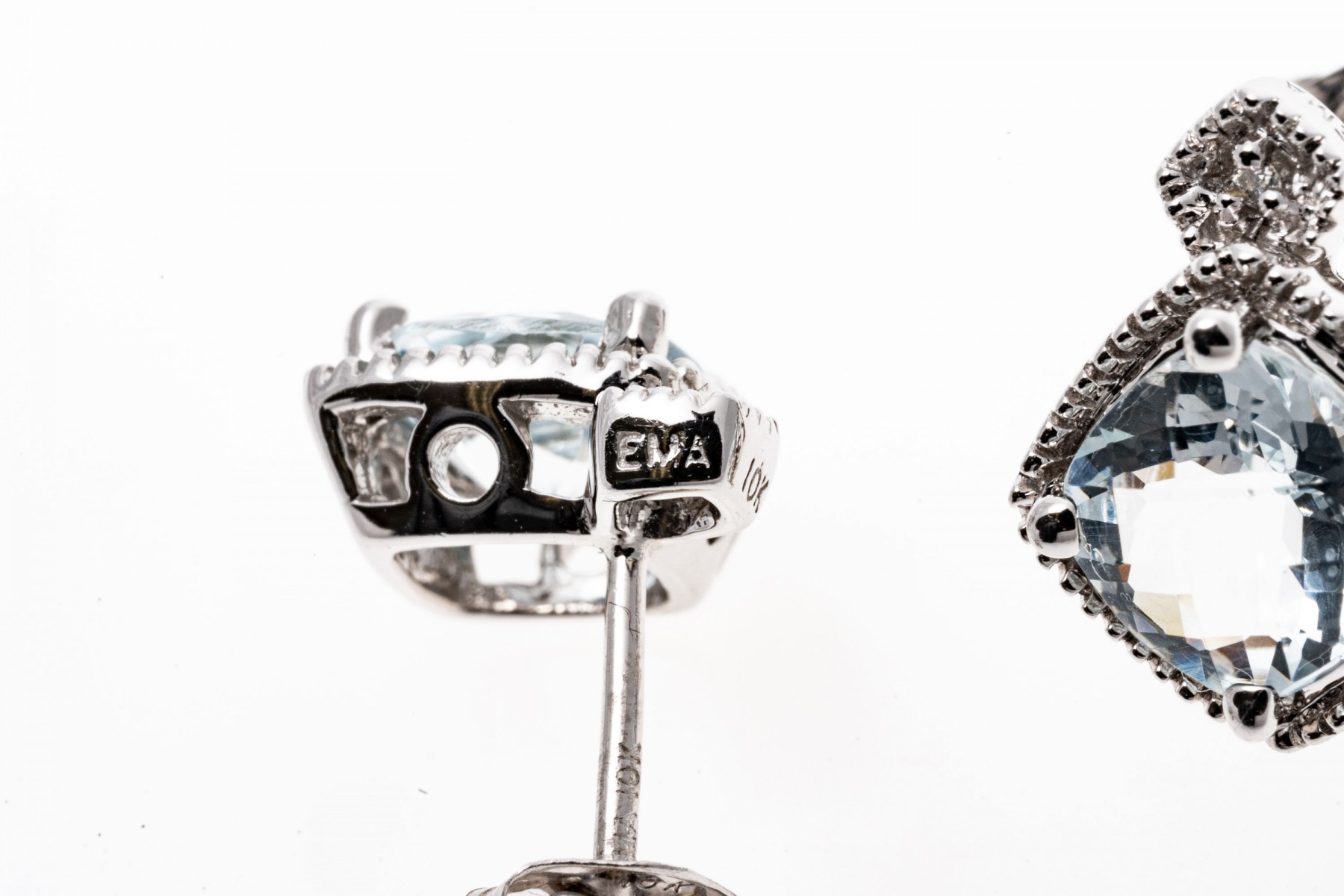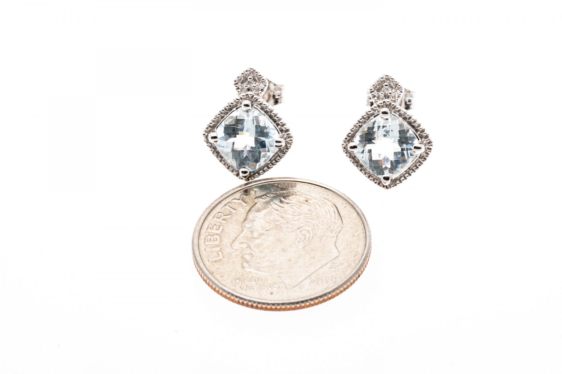 10k white gold earrings. These striking stud earrings contain square checkerboard cut, pale blue aquamarines, approximately 1.52 TCW. The earrings are set within a ribbed frame, and accented with a round faceted diamond, approximately 0.01 TCW. The earrings have post and clutch style backs.