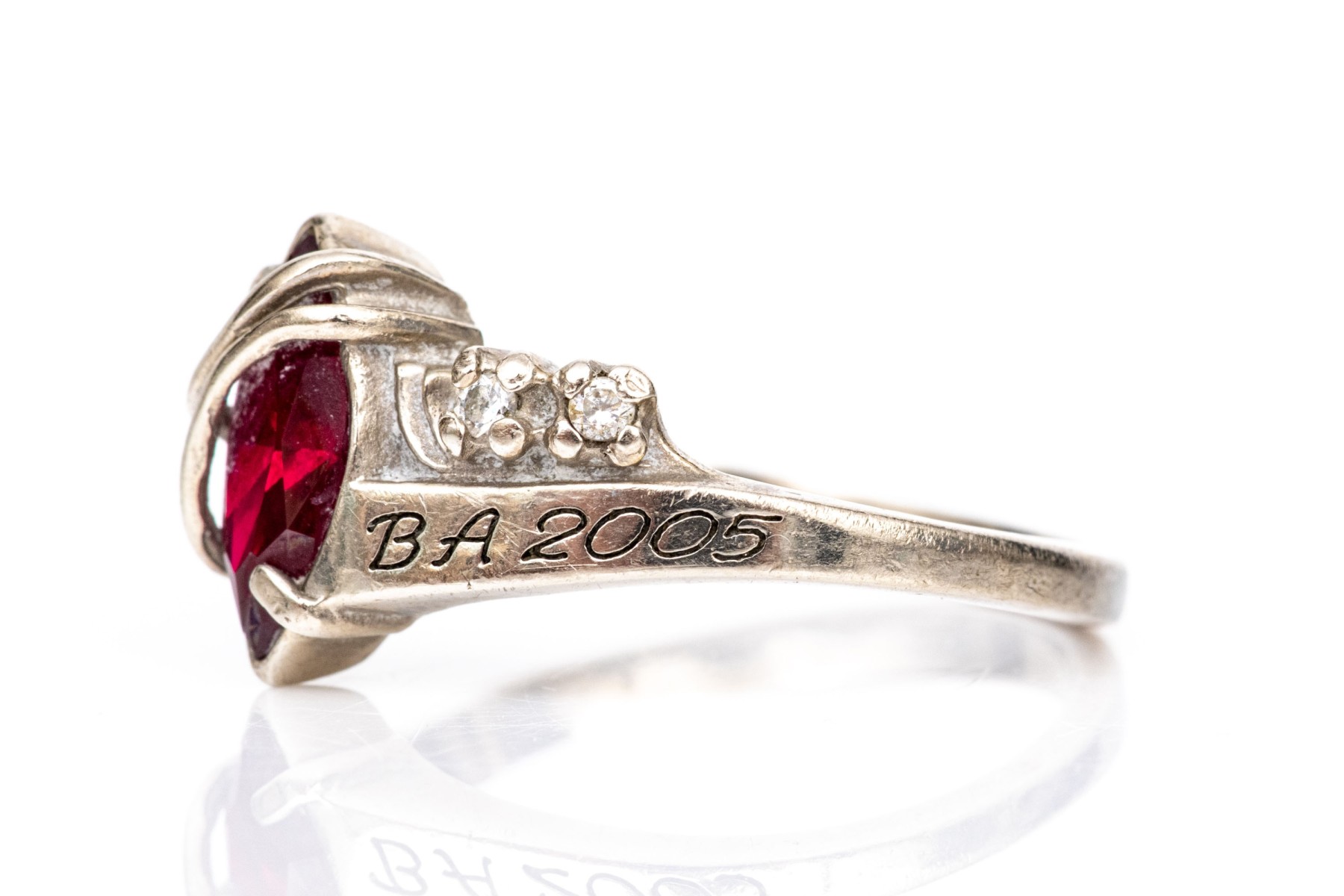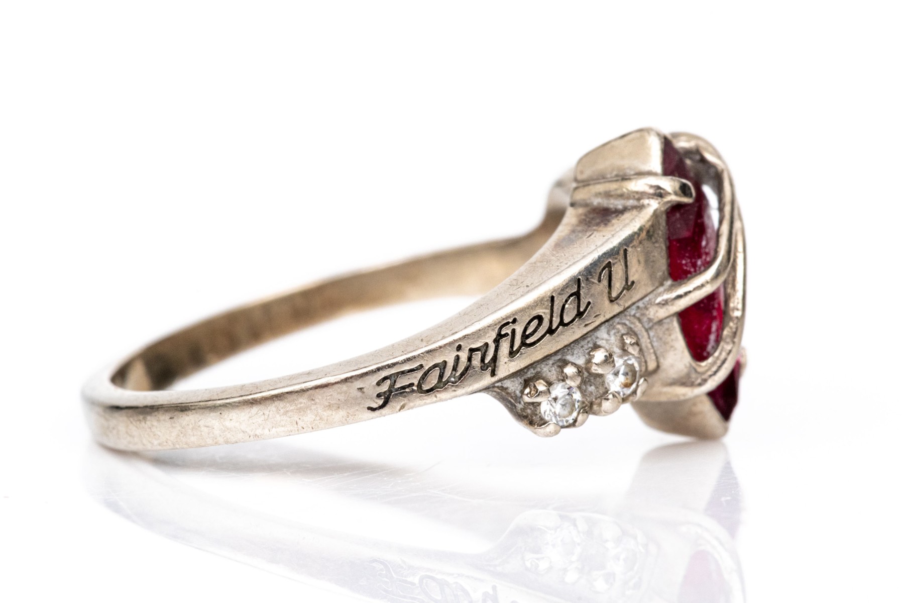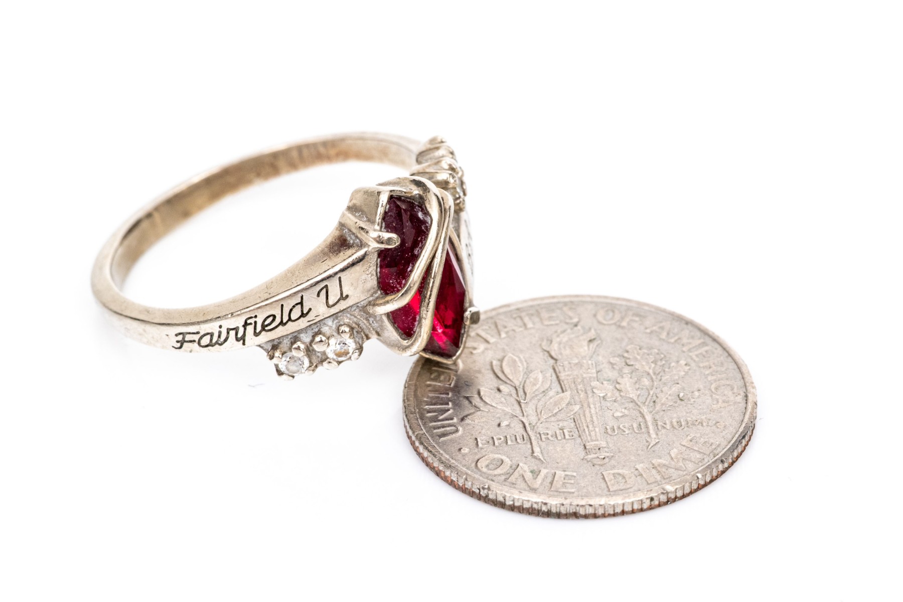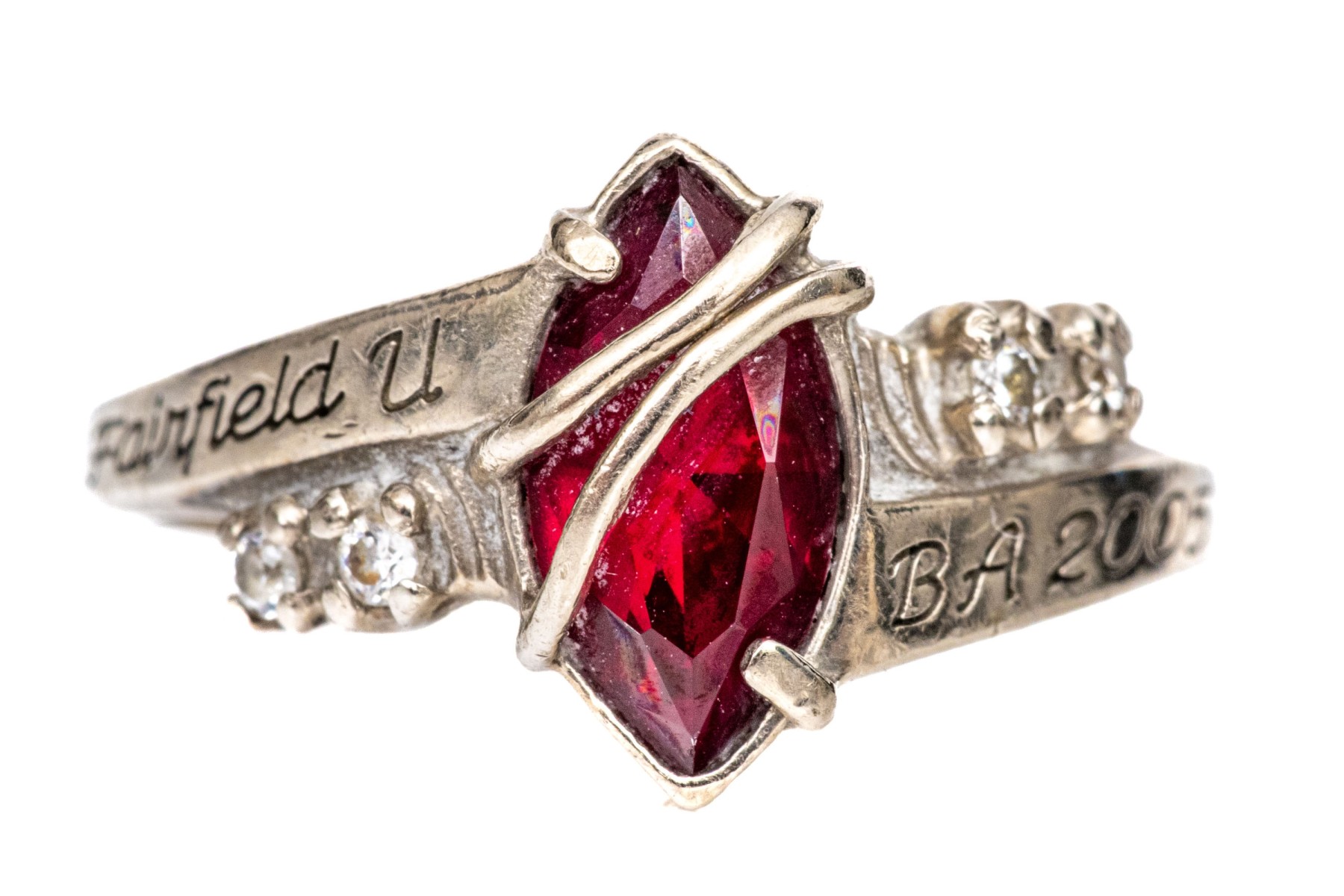 10k white gold class of 2005 Fairfield University burgundy and white cz class ring, size 6.25