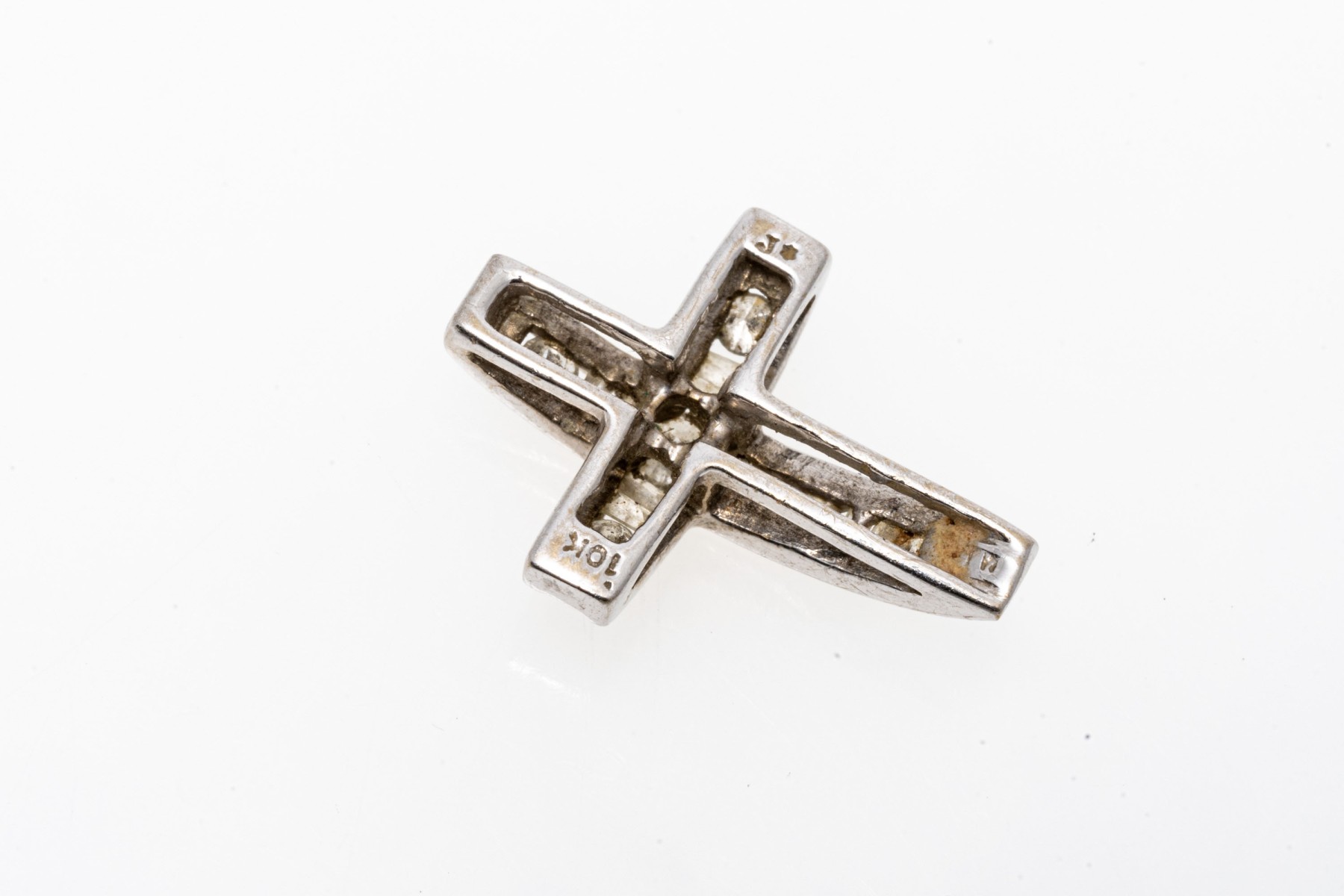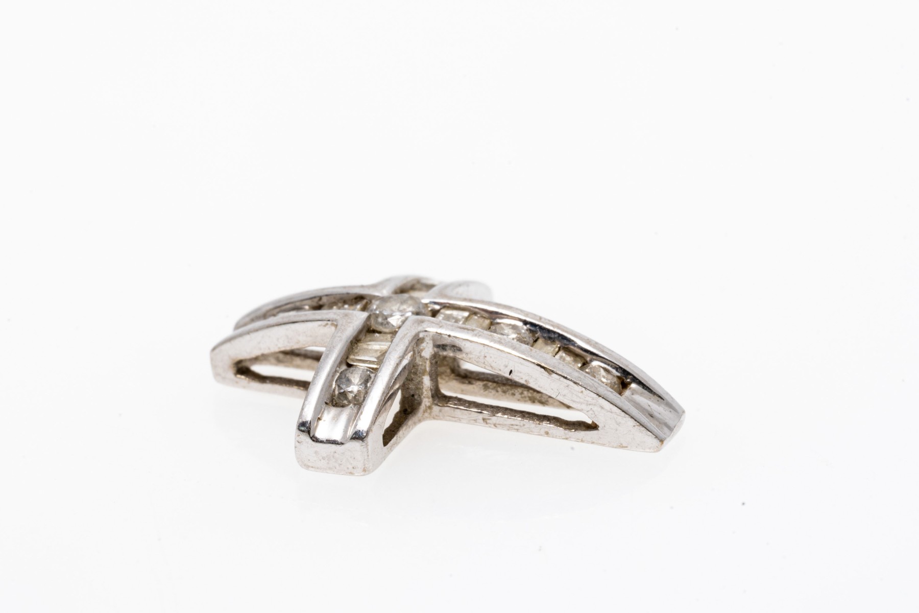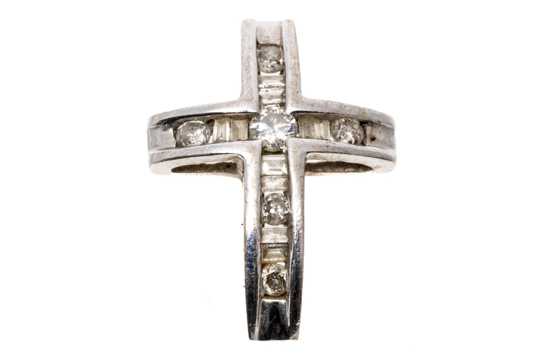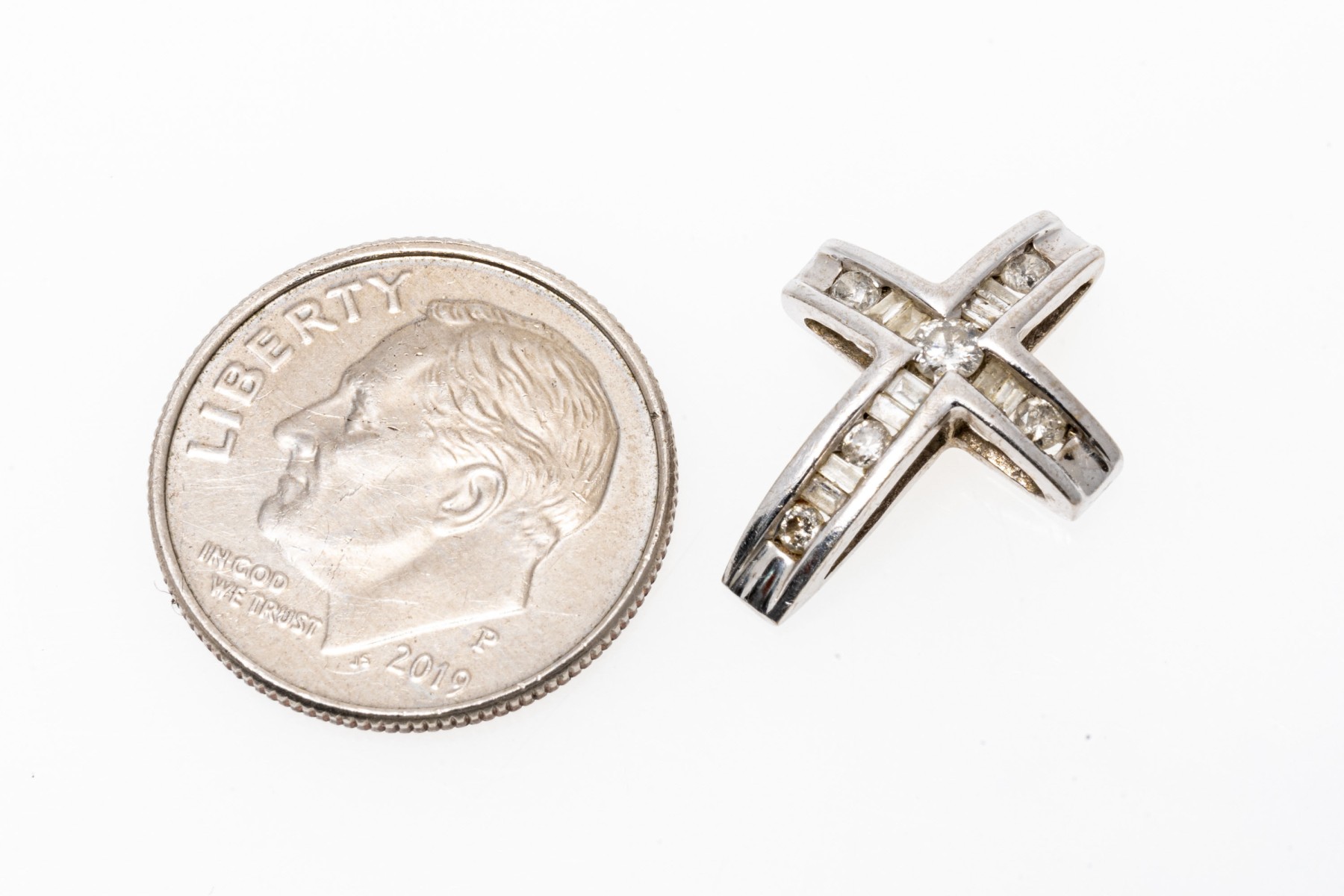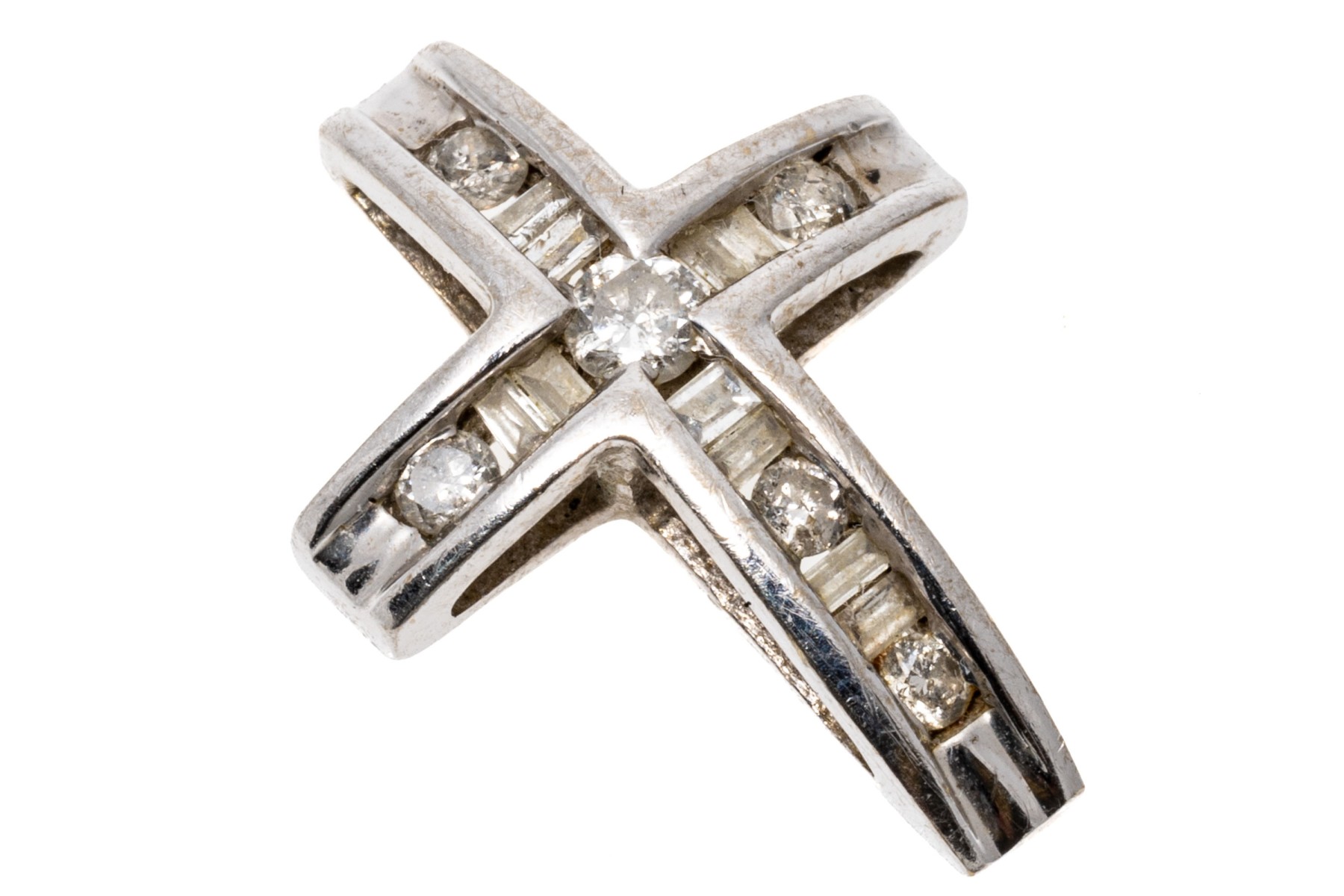 10k white gold contemporary channel set diamond and moissanite cross, baguette and round cut stones, finished with a hidden bale