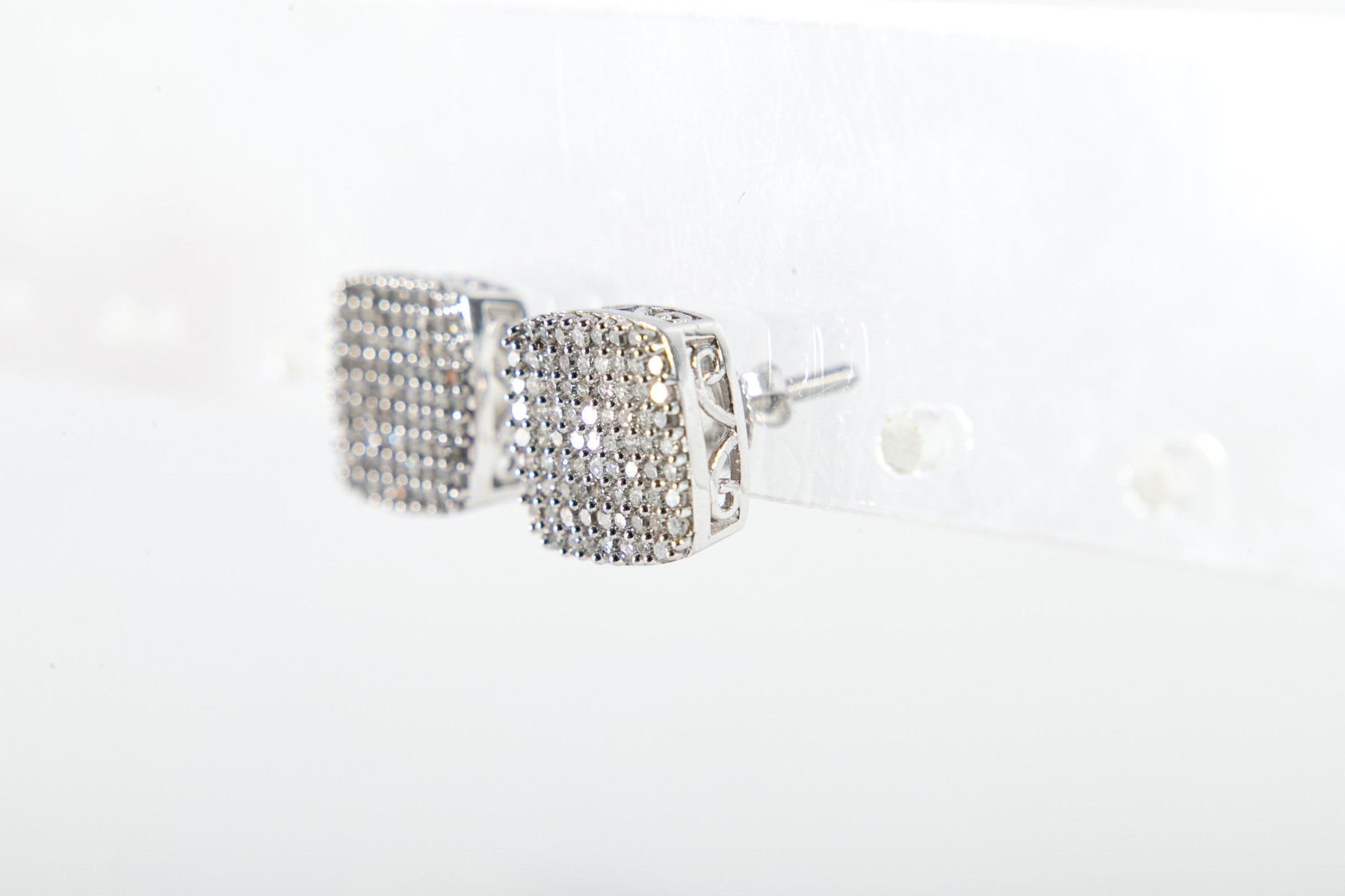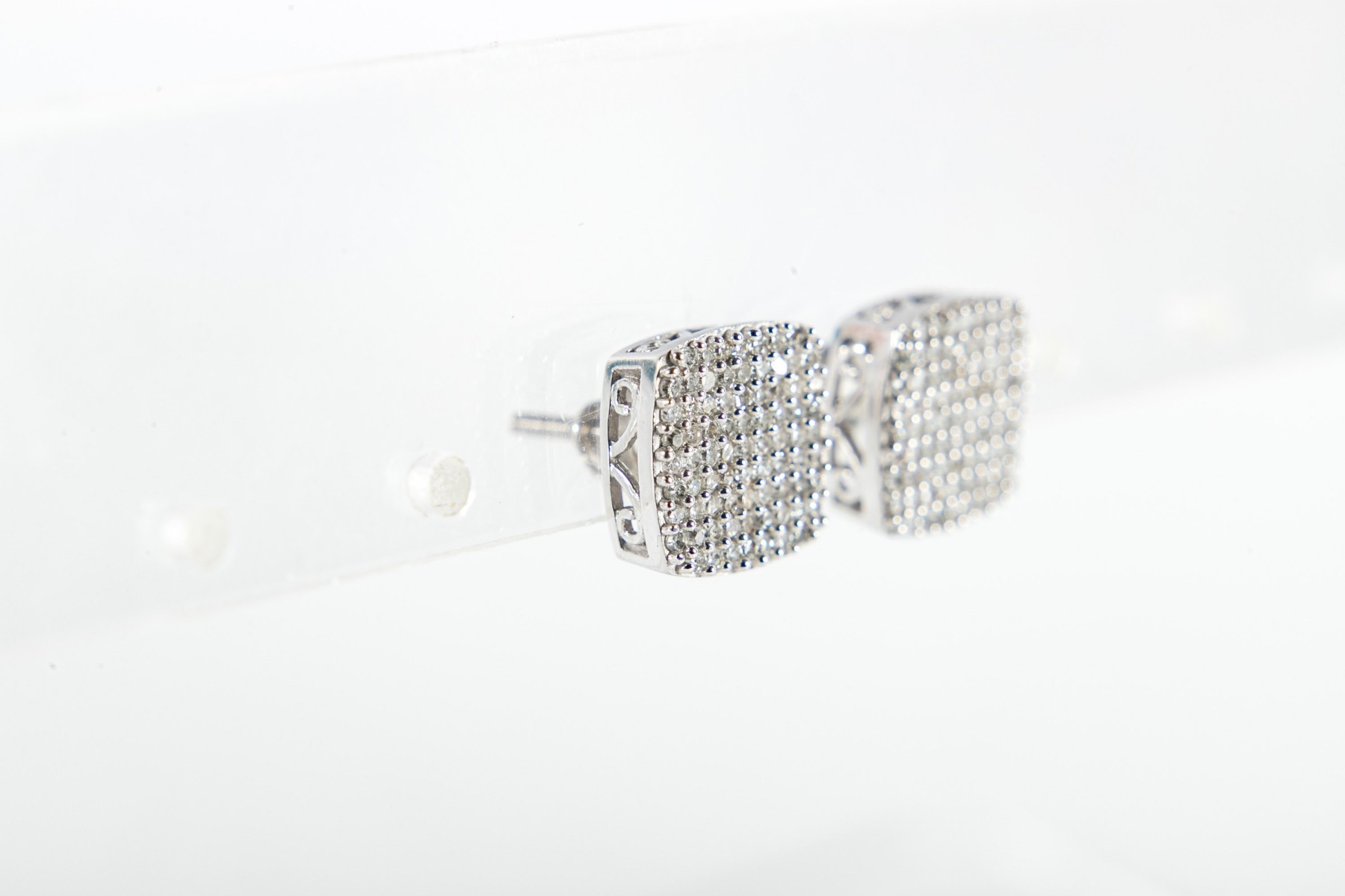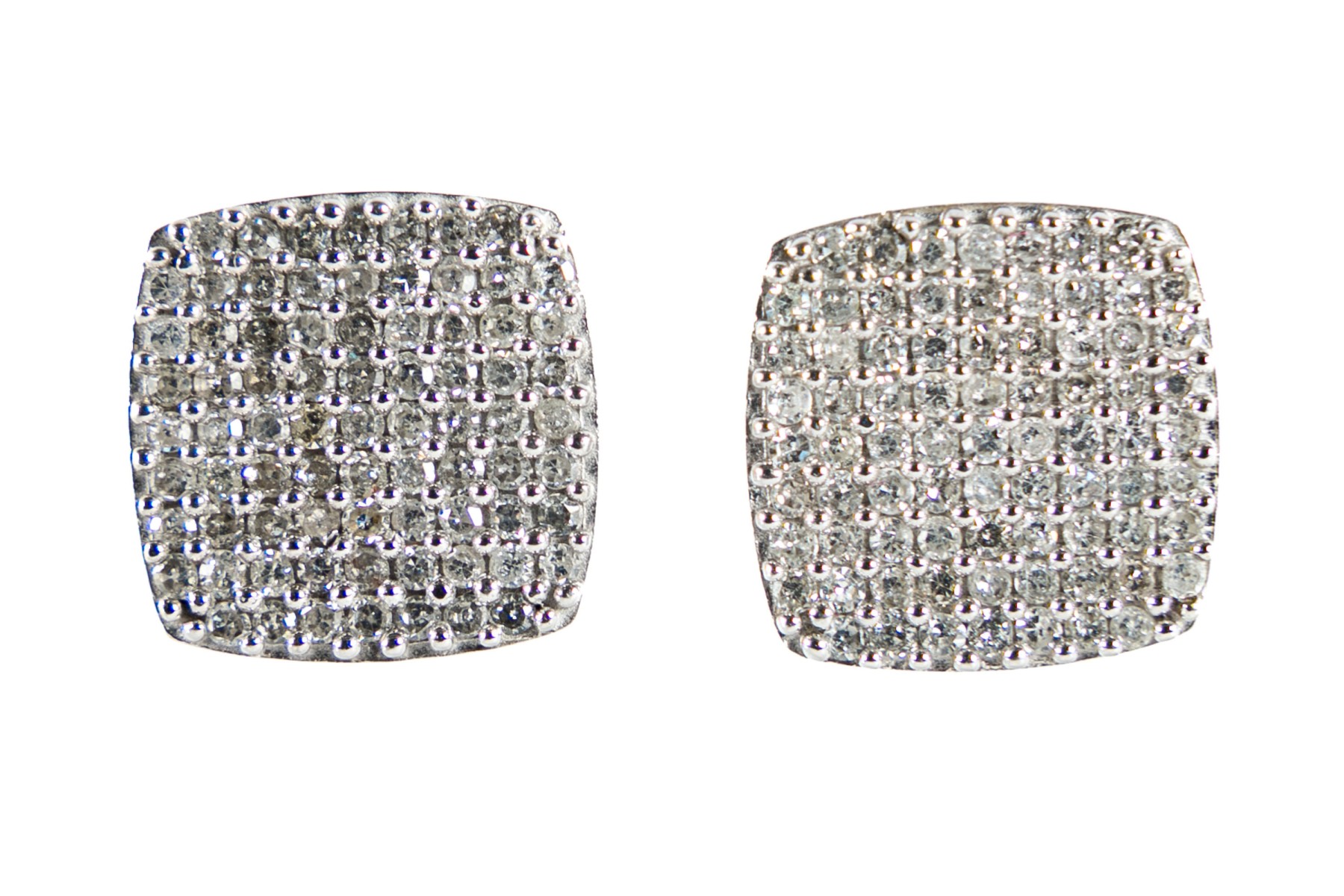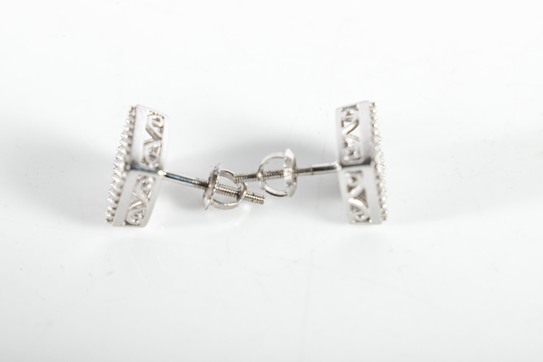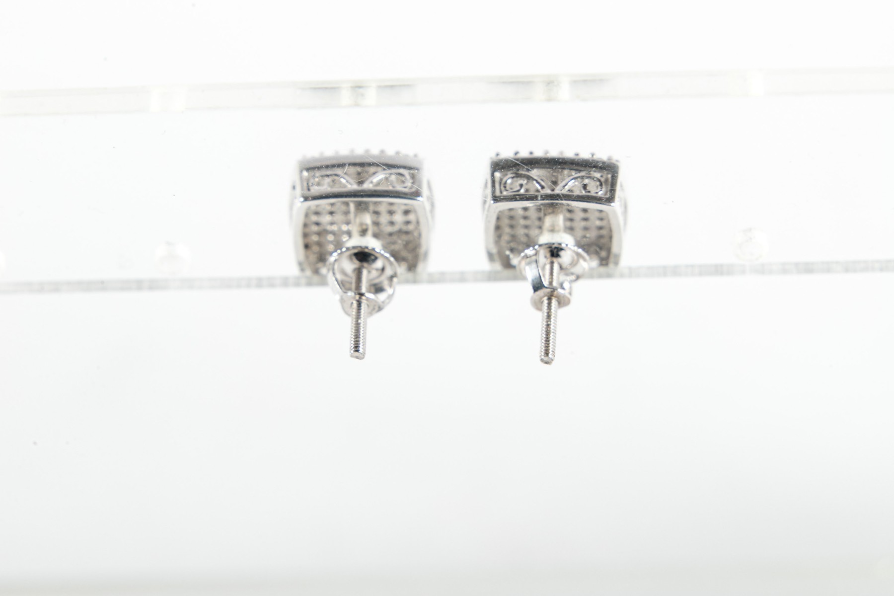 A stunning pair of white gold studs displaying rounded square pave heads of round diamonds on threaded screw-back posts.