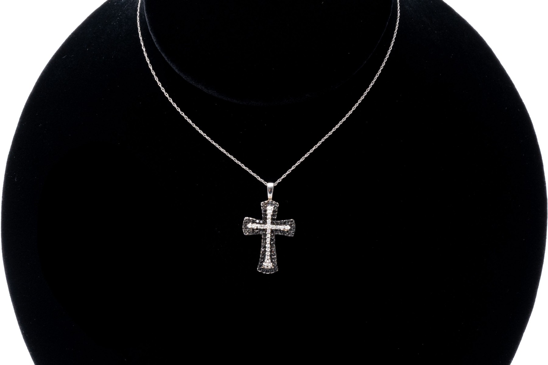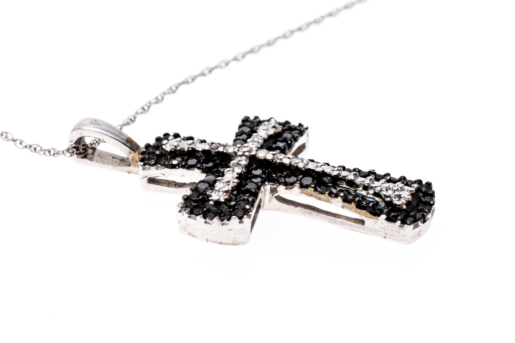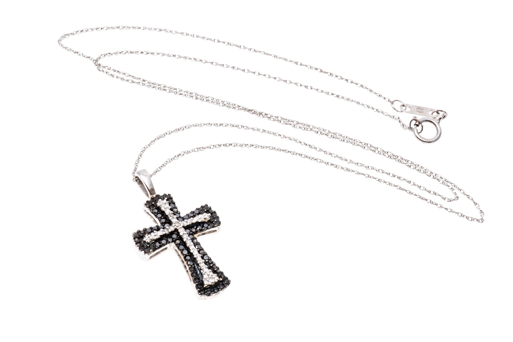 A pretty white gold necklace displaying a black and white diamond cross pendant hanging from a fine double-link cable chain with a spring ring clasp. The diamonds are approximately 0.12 TCW.