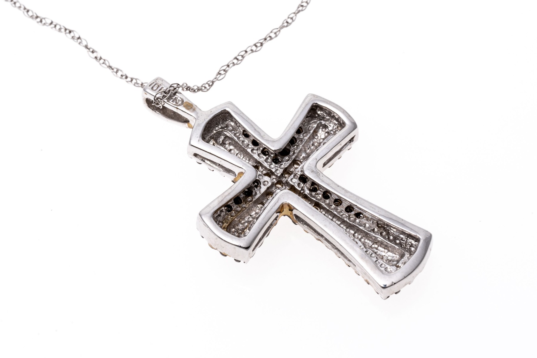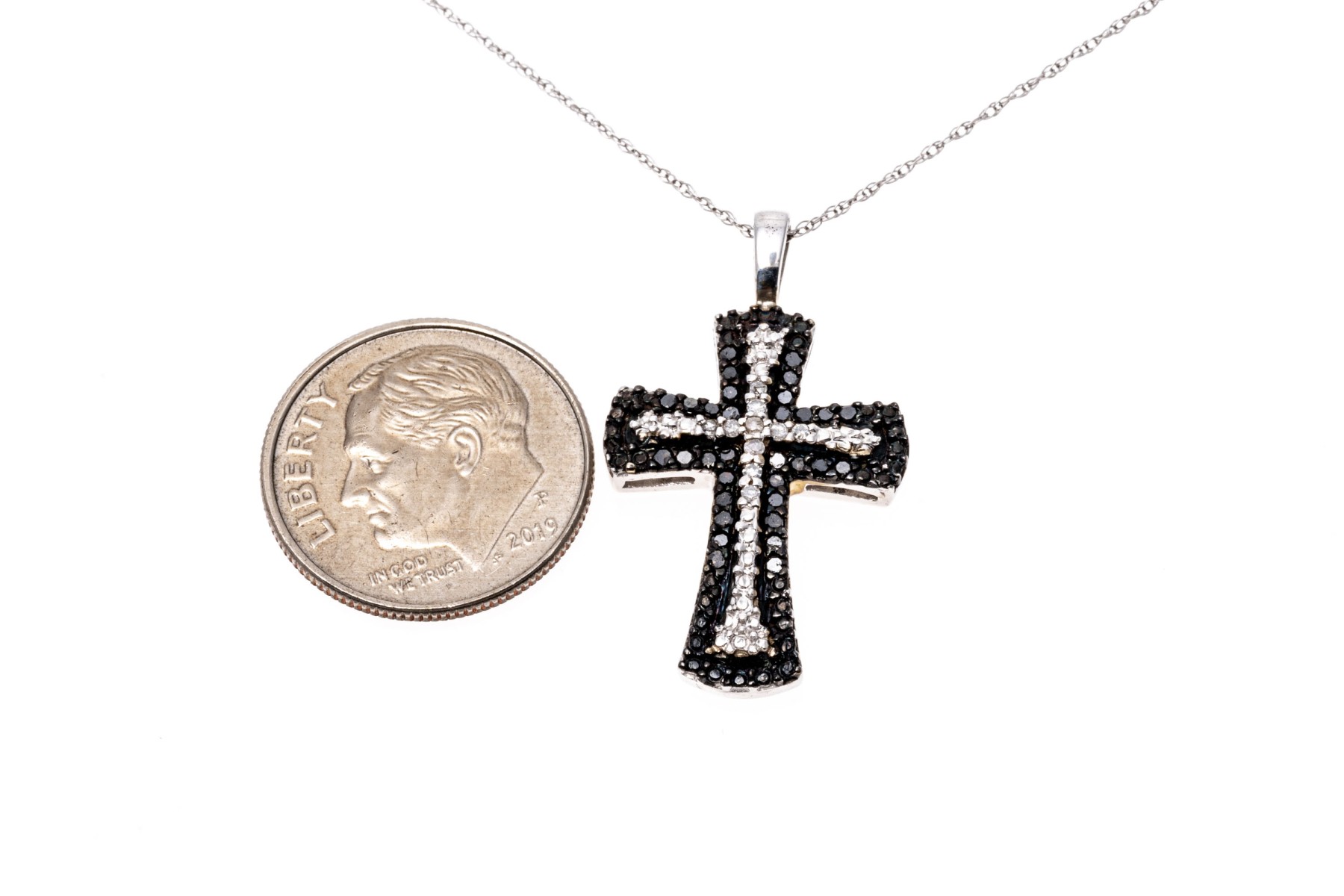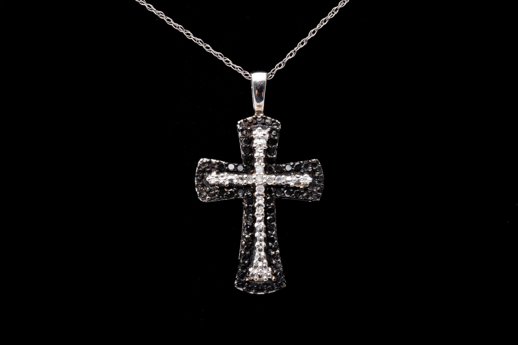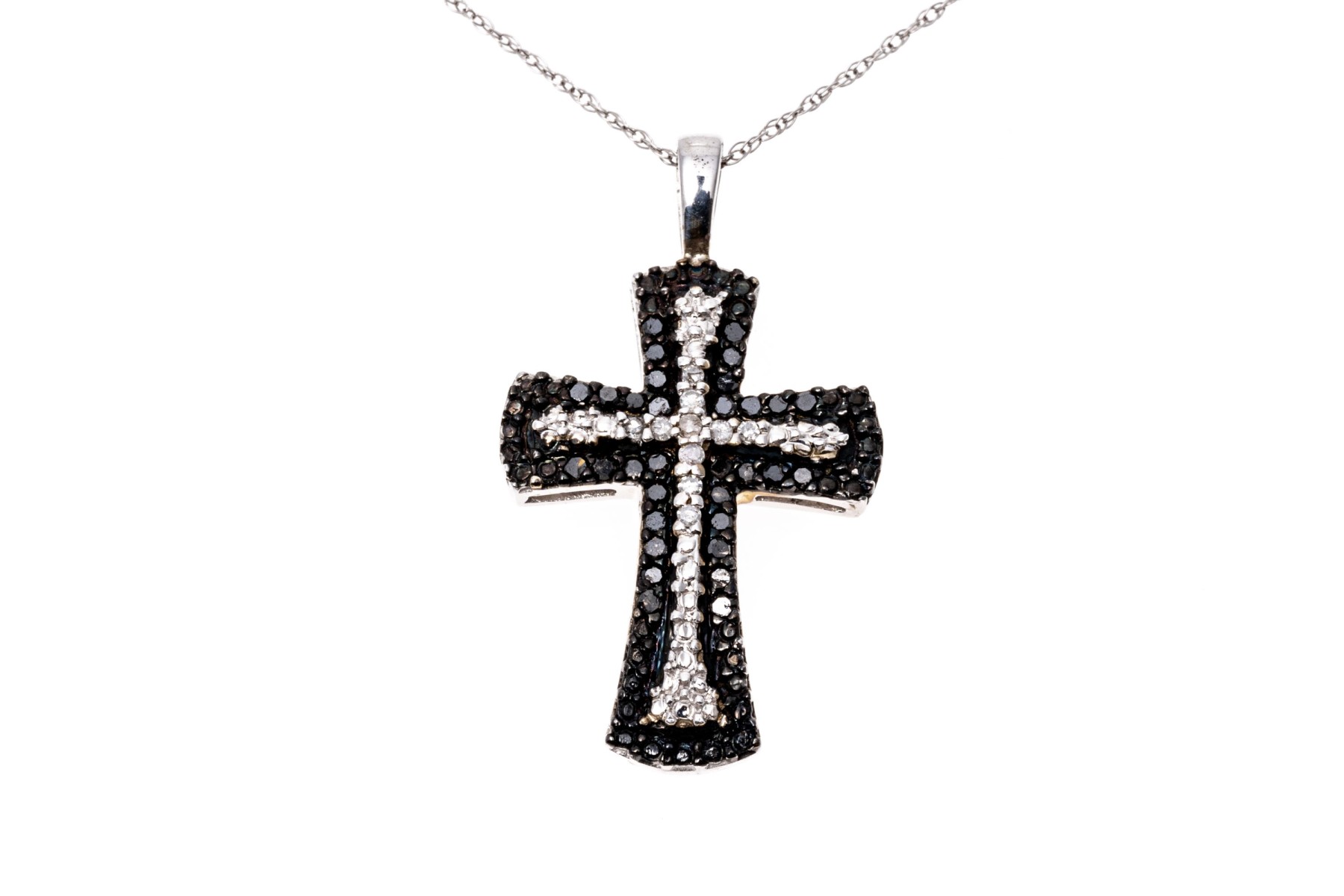 A pretty white gold necklace displaying a black and white diamond cross pendant hanging from a fine double-link cable chain with a spring ring clasp. The diamonds are approximately 0.12 TCW.