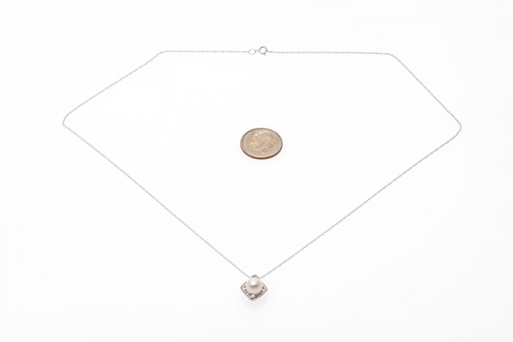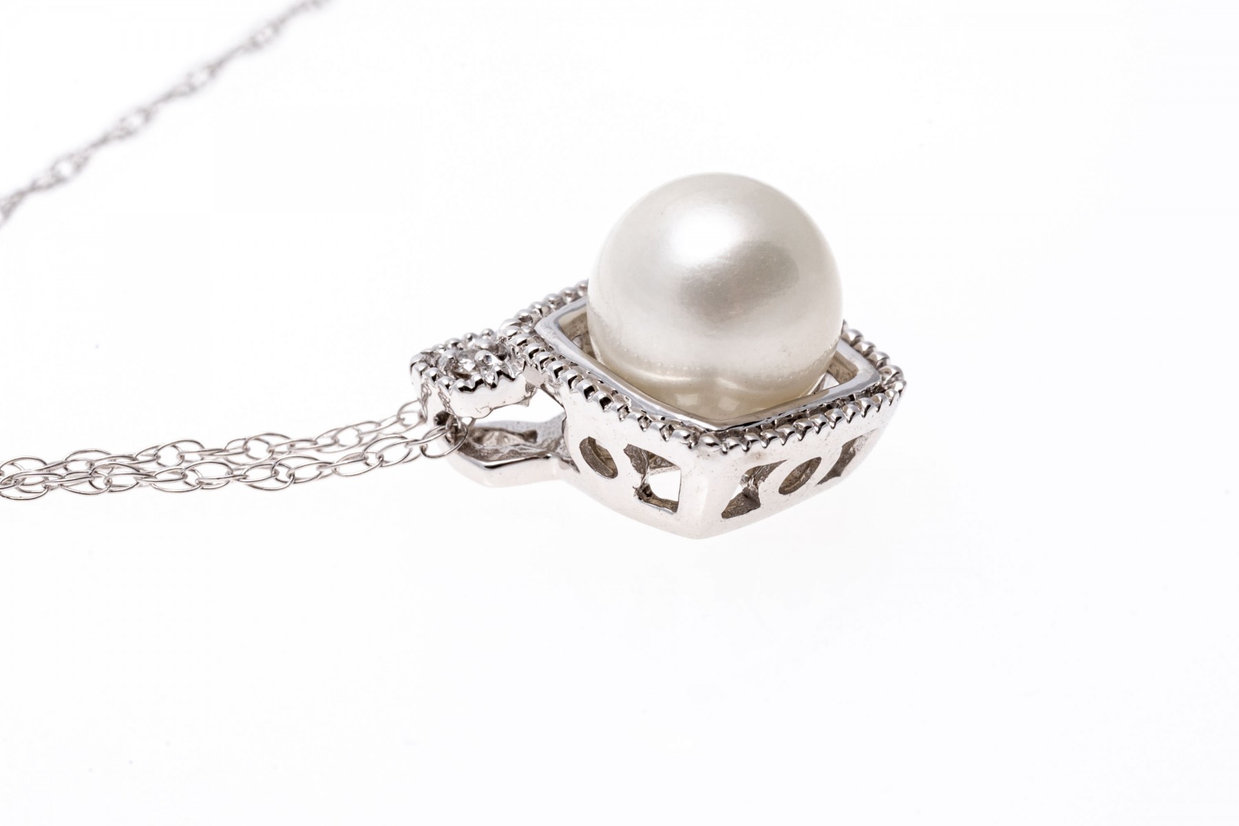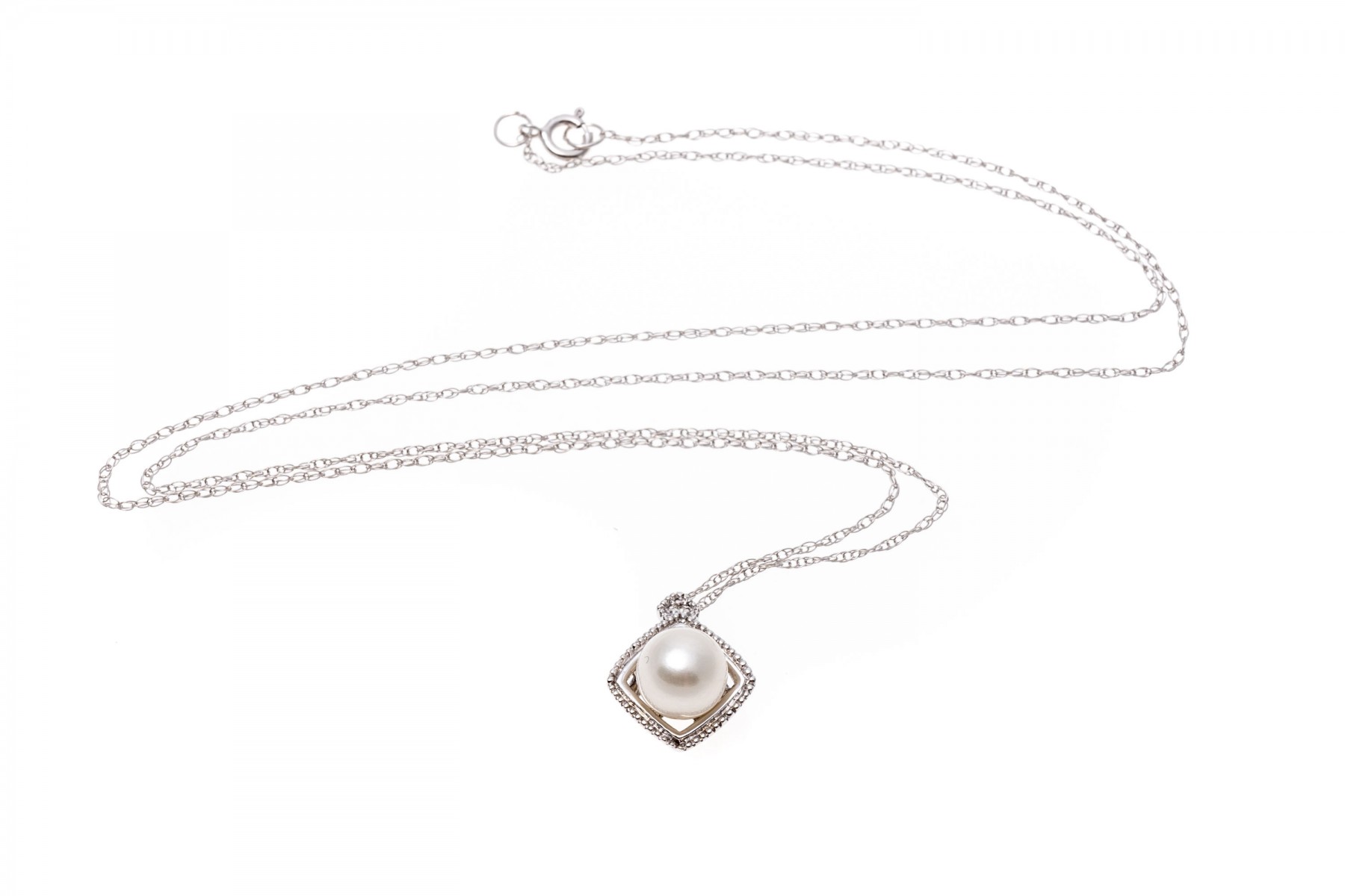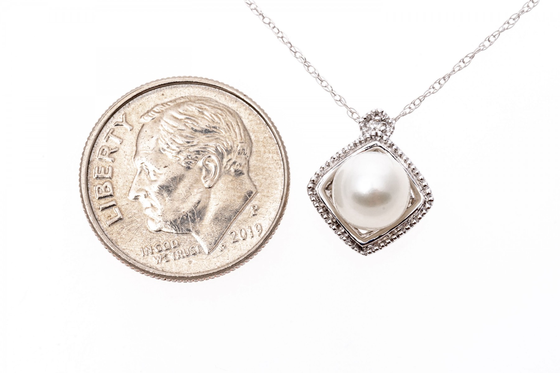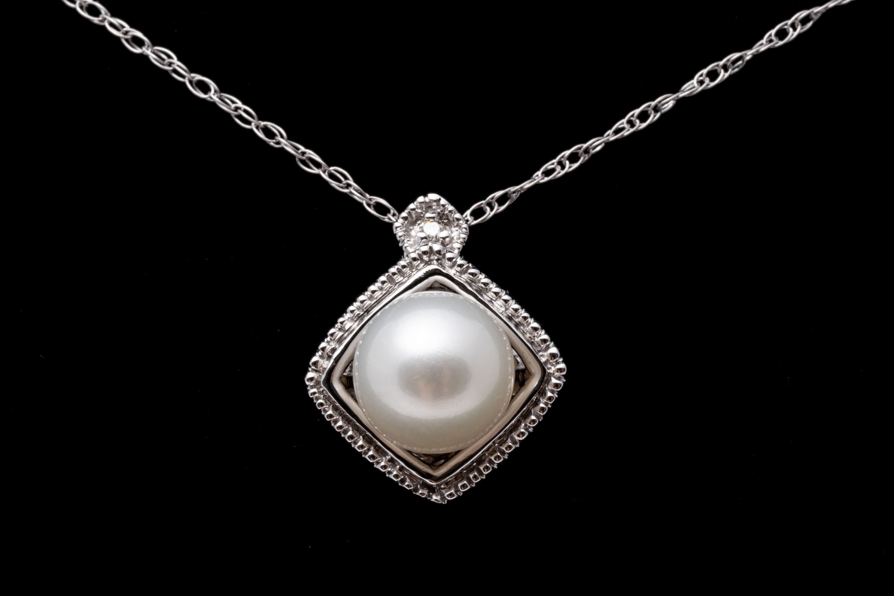 This tasteful 10K white gold necklace displays a slight pendant set with a single classic bright white 6.5mm pearl. Set above the pearl is a single accent diamond that adds a subtle shimmer to this pendant. Spring ring style clasp.