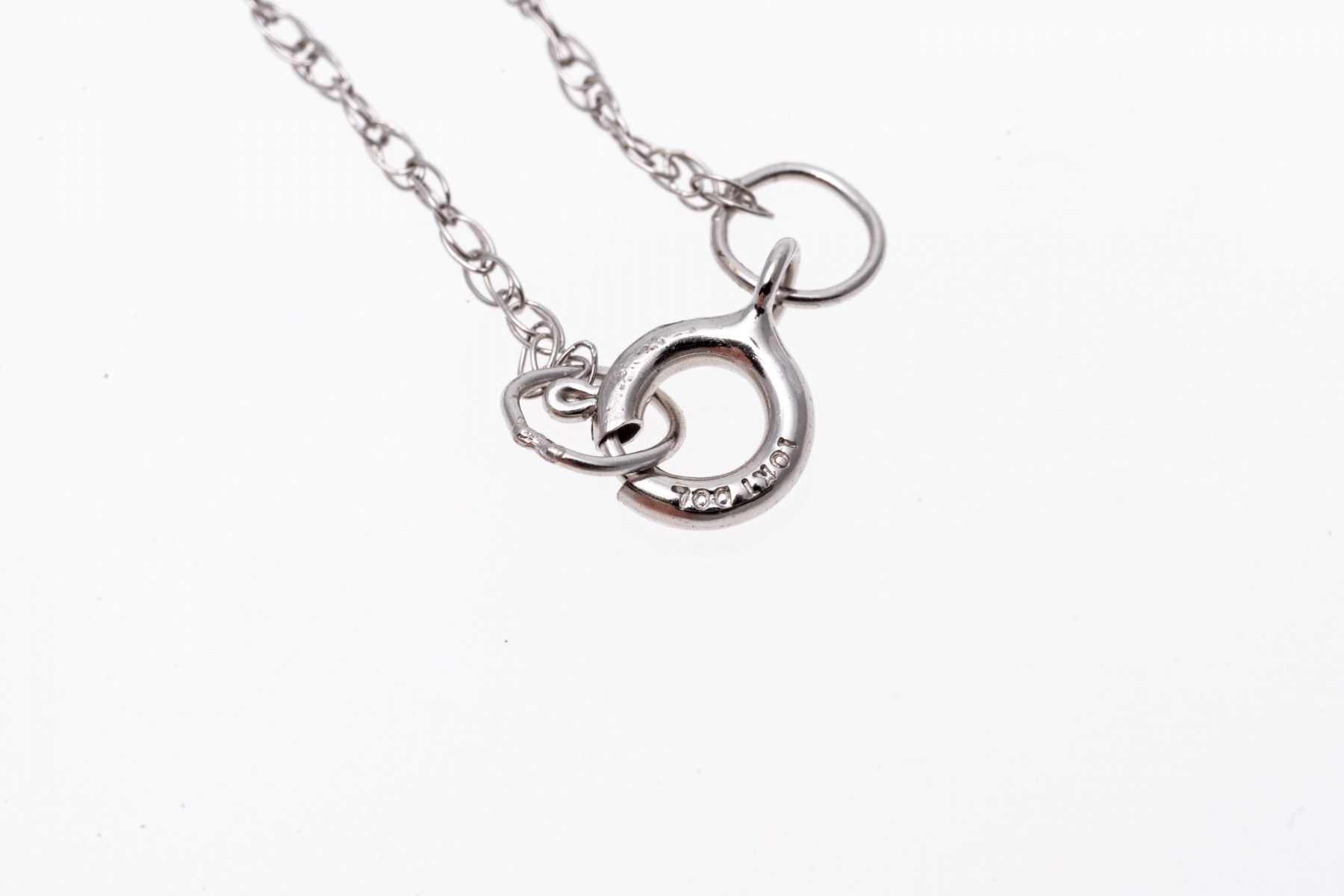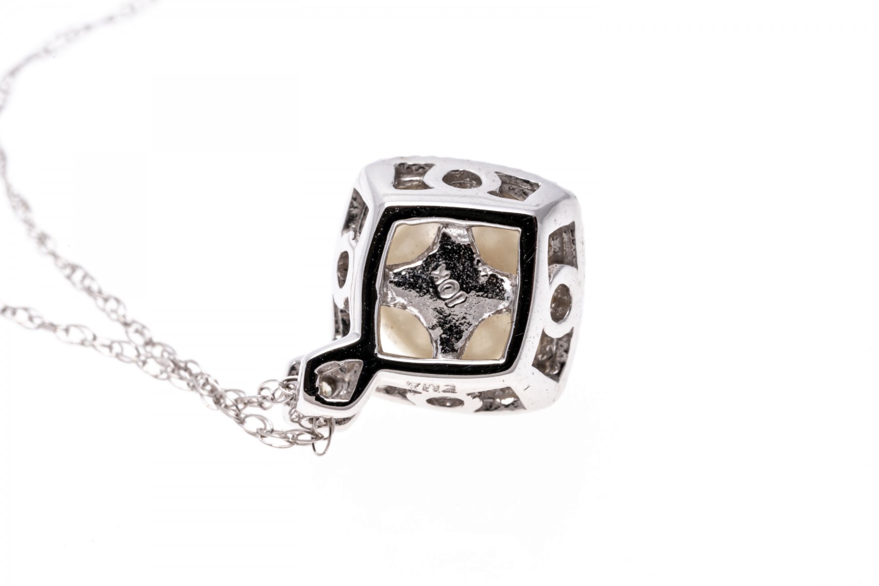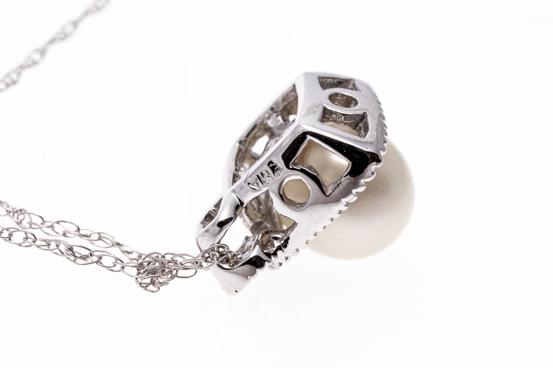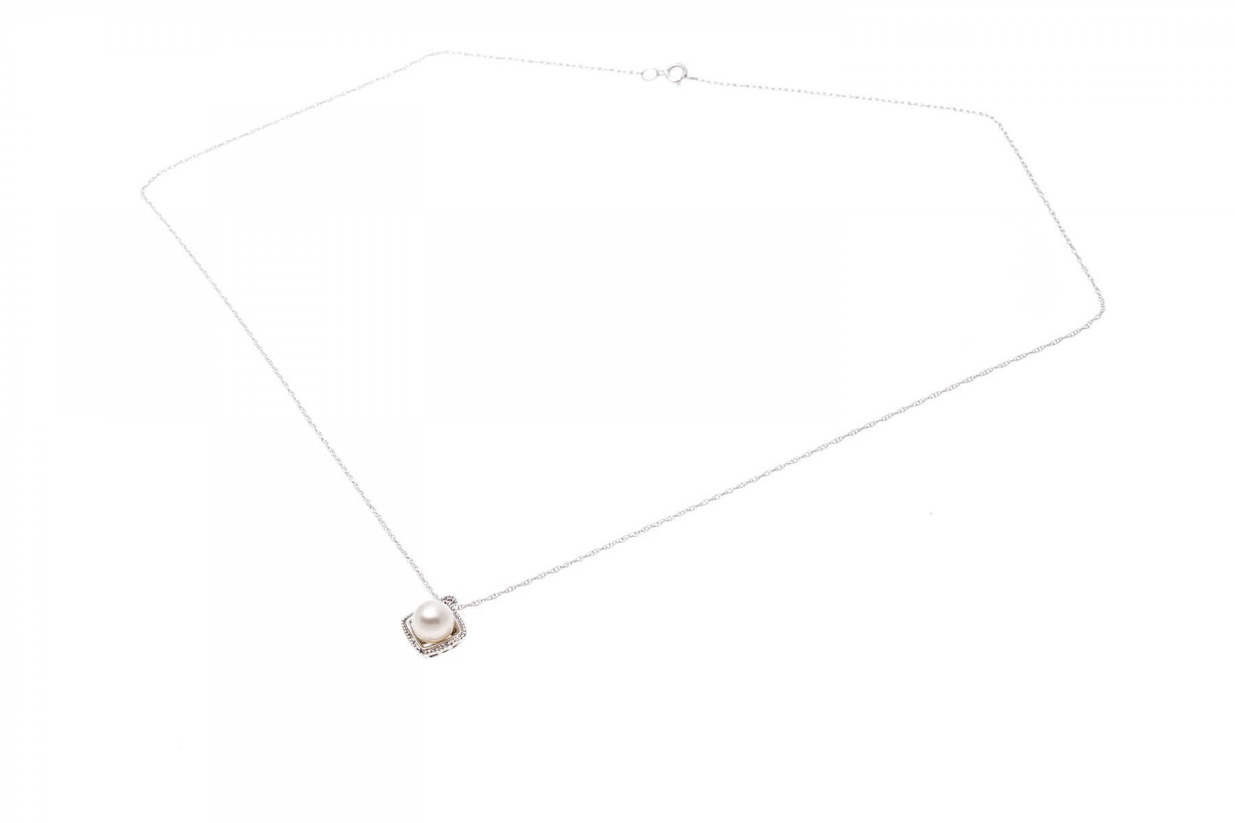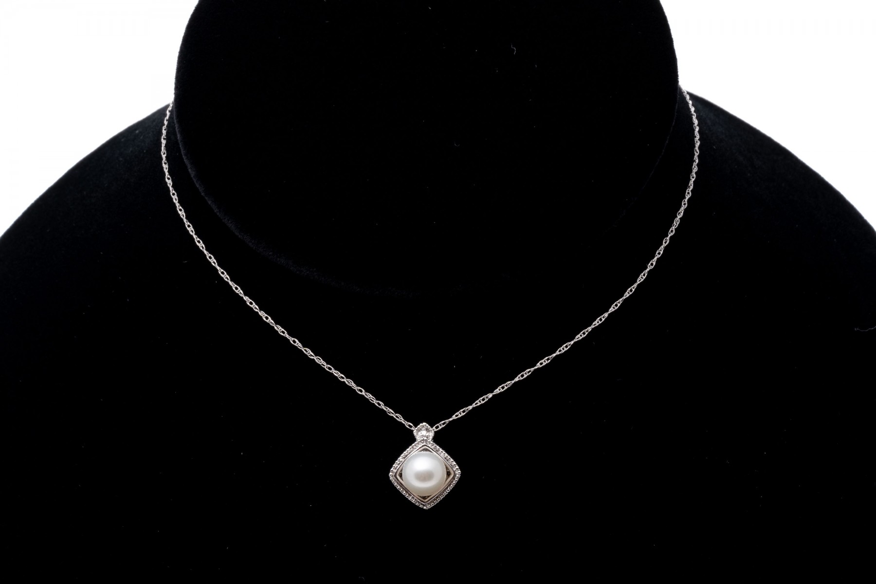 This tasteful 10K white gold necklace displays a slight pendant set with a single classic bright white 6.5mm pearl. Set above the pearl is a single accent diamond that adds a subtle shimmer to this pendant. Spring ring style clasp.