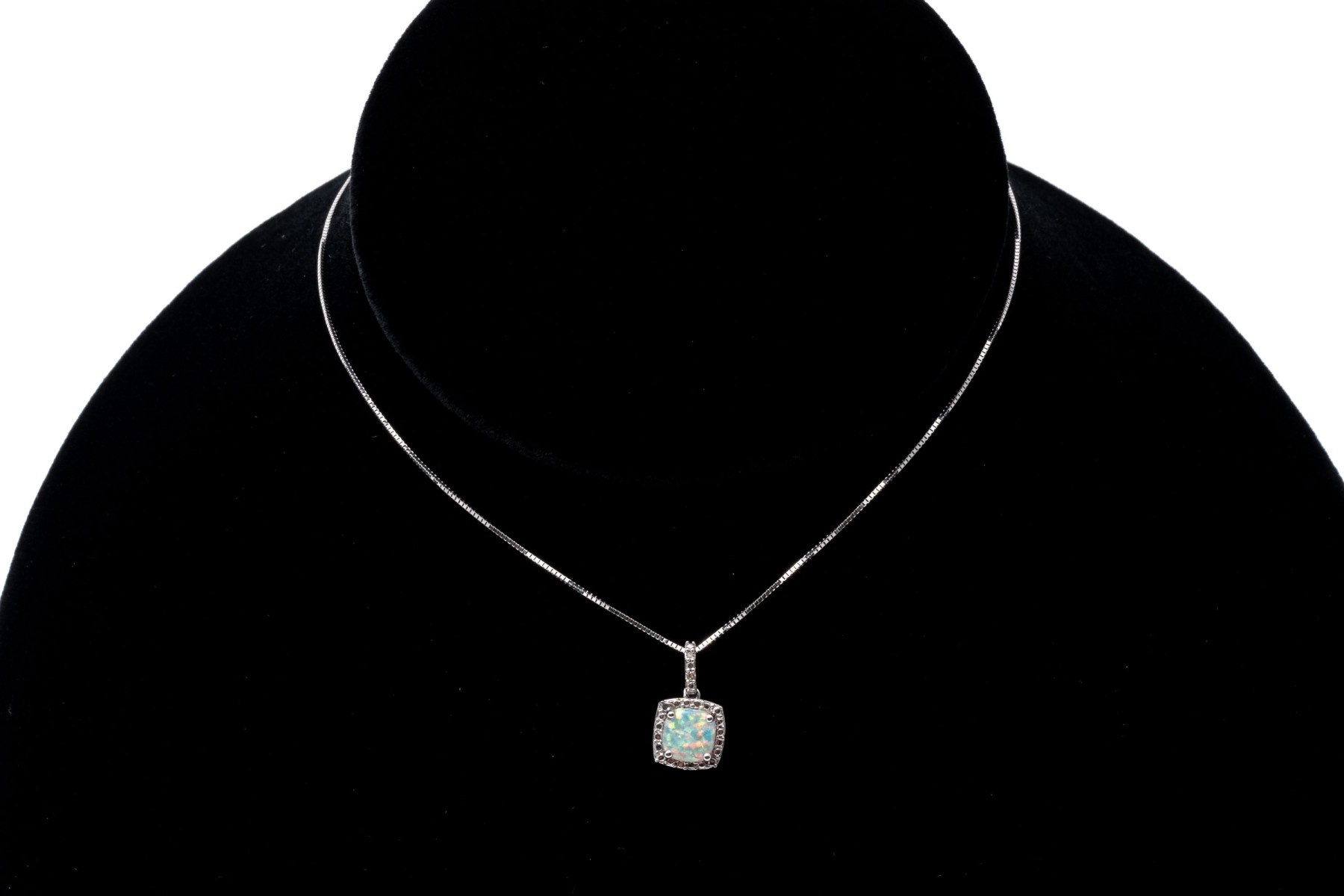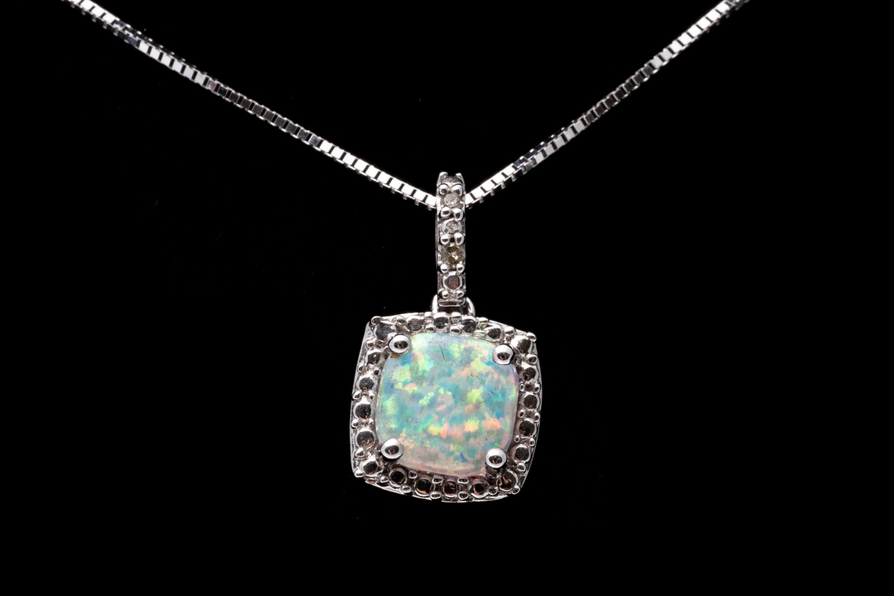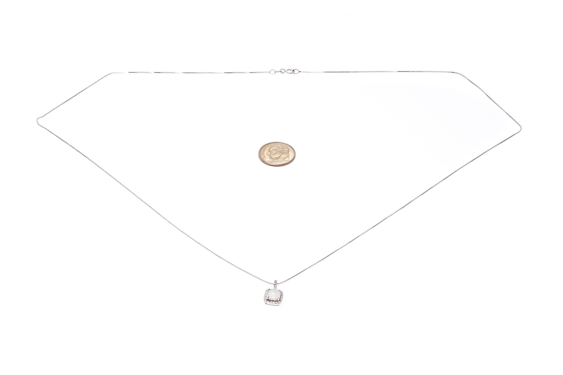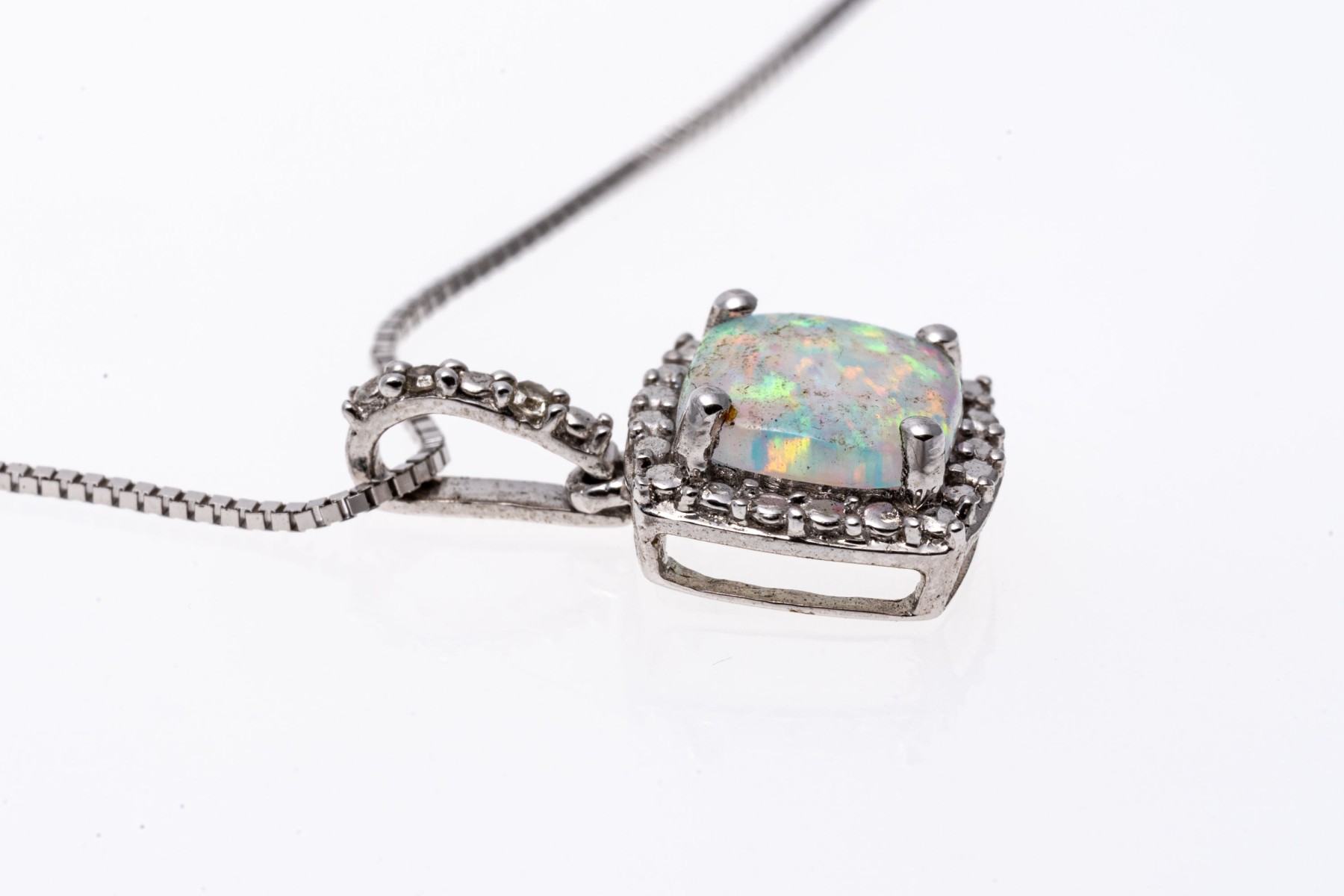A pretty white gold necklace displaying a square cabochon white opal with red and green iridescence, framed by beadwork designs leading to a bail accentuated with round diamonds, approximately 0.01 TCW. The pendant hangs from a fine box chain, finished with a spring ring clasp.