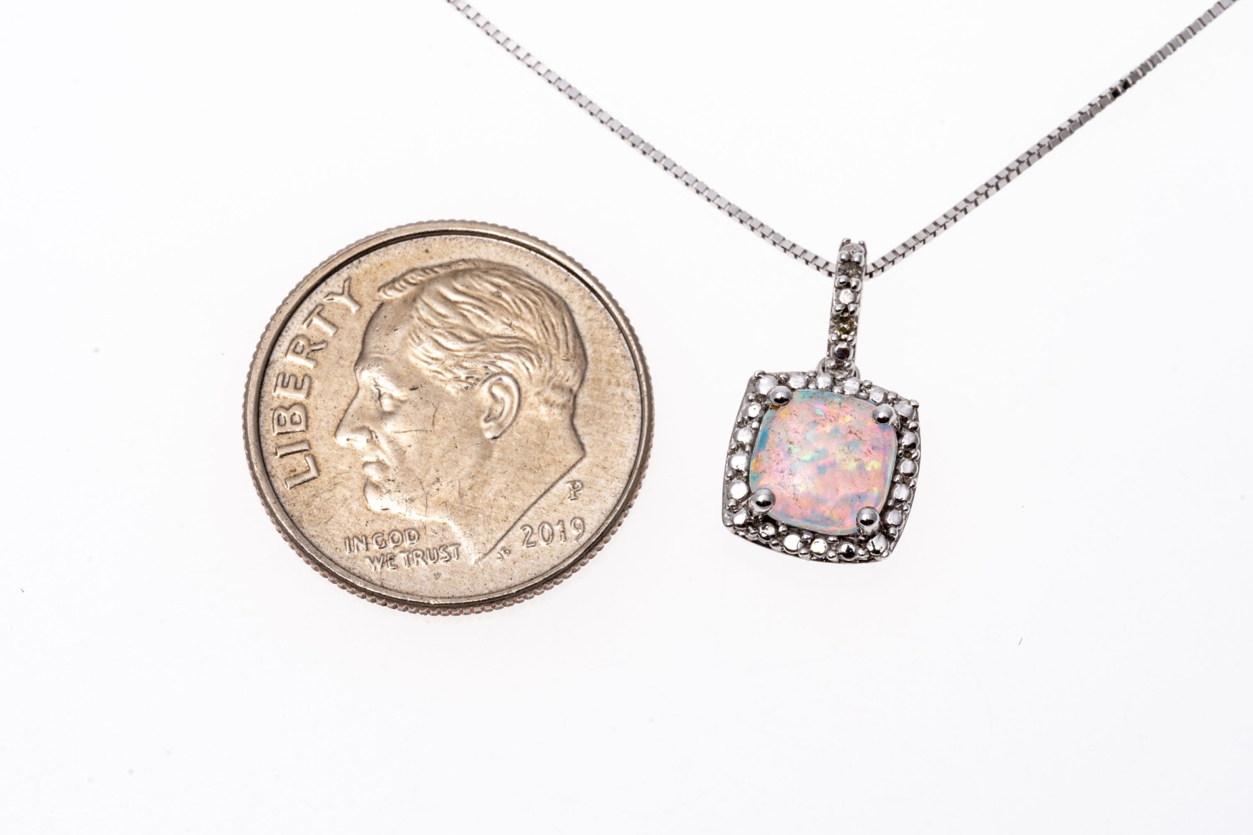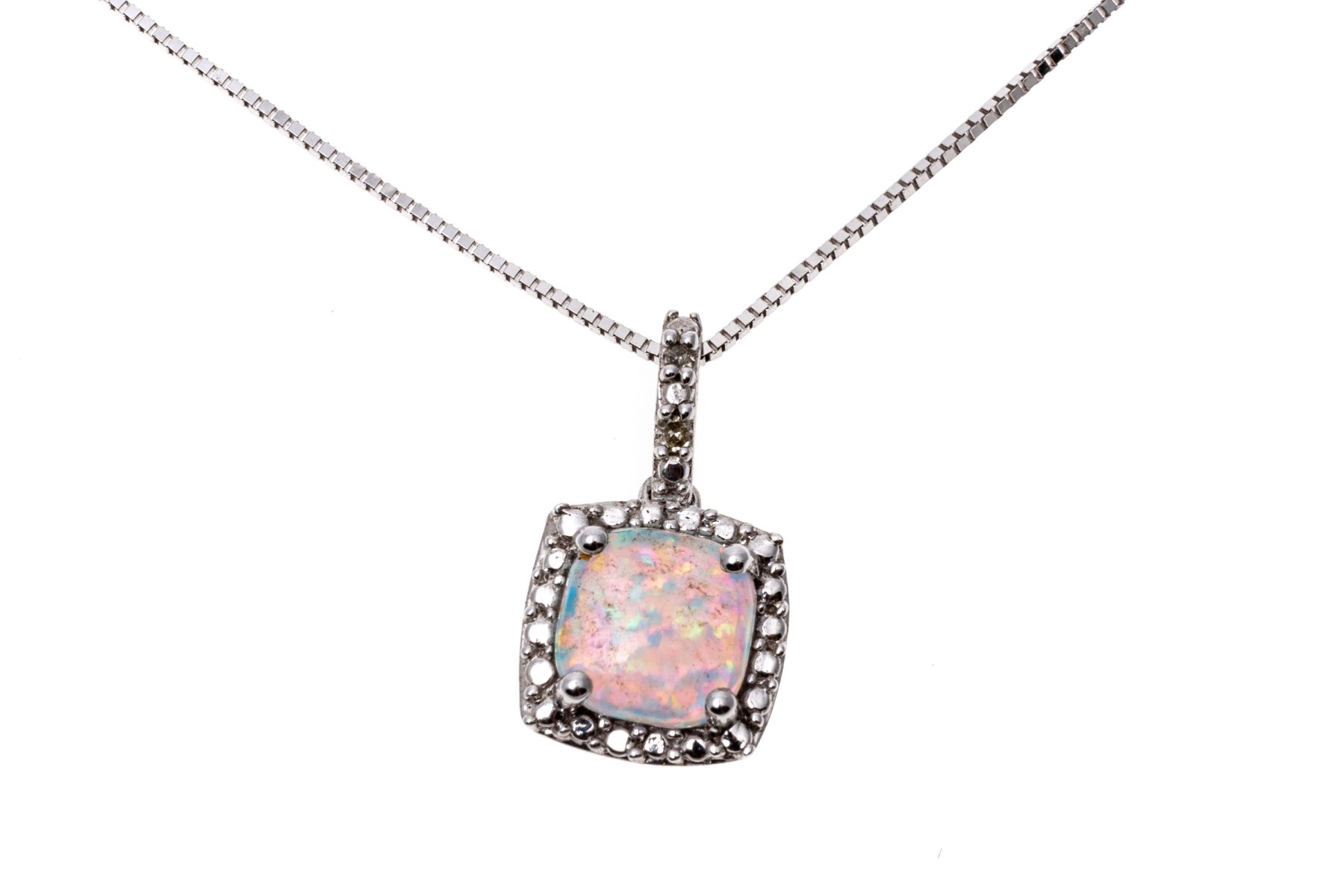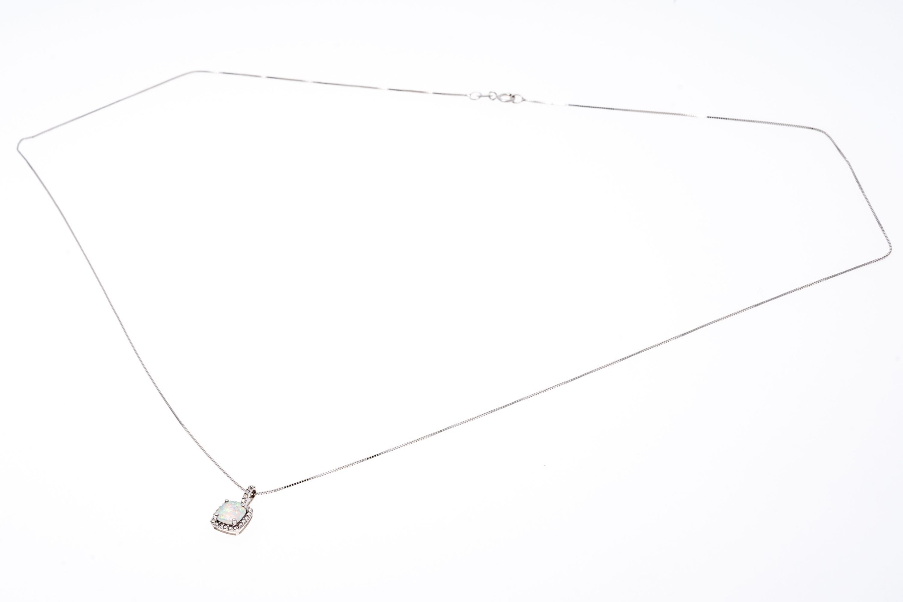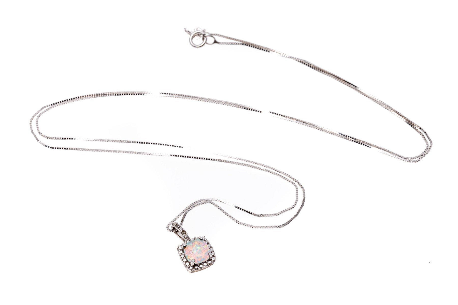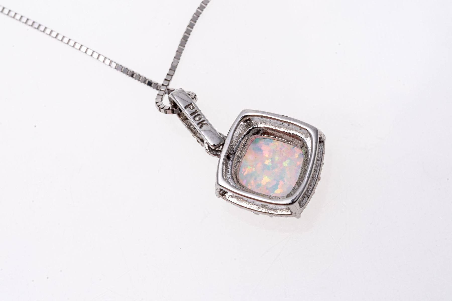 A pretty white gold necklace displaying a square cabochon white opal with red and green iridescence, framed by beadwork designs leading to a bail accentuated with round diamonds, approximately 0.01 TCW. The pendant hangs from a fine box chain, finished with a spring ring clasp.