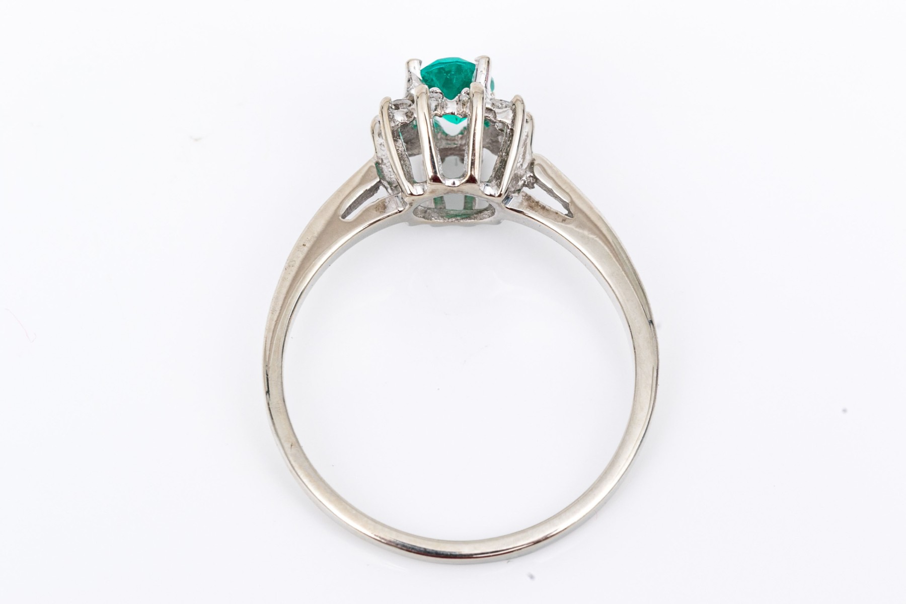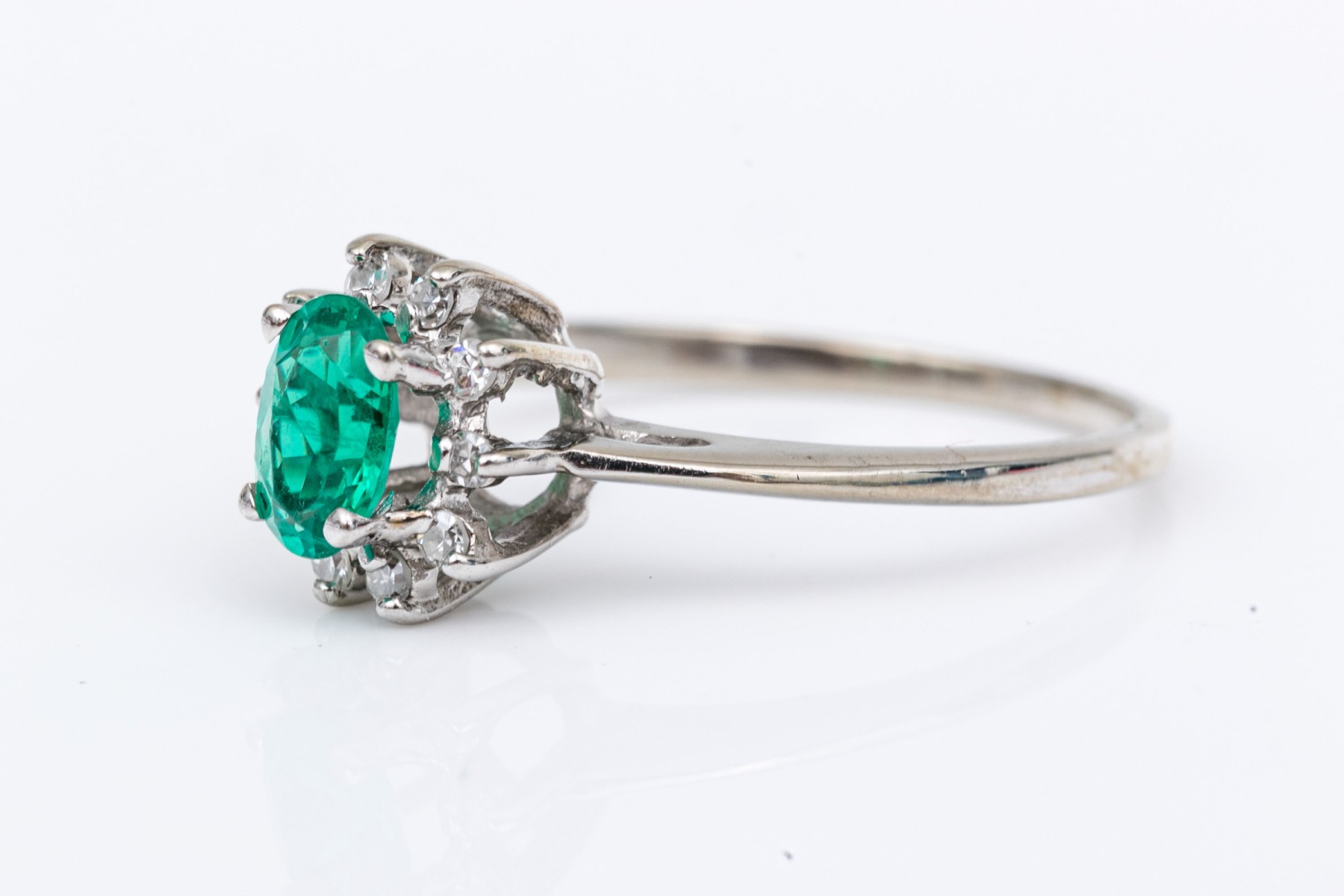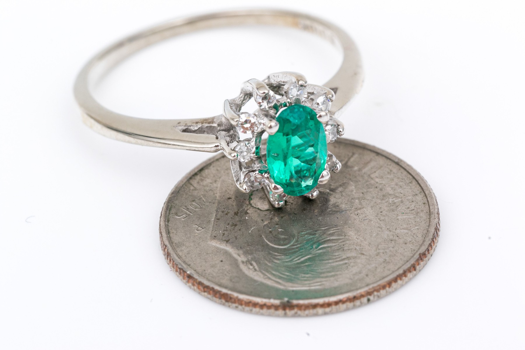 10k white gold striking blue green apatite and diamond halo ring, size 6.5. This interesting ring features a center oval faceted blue-green apatite, surrounded by a border of round faceted diamonds, app. 0.10 TCW, prong set
