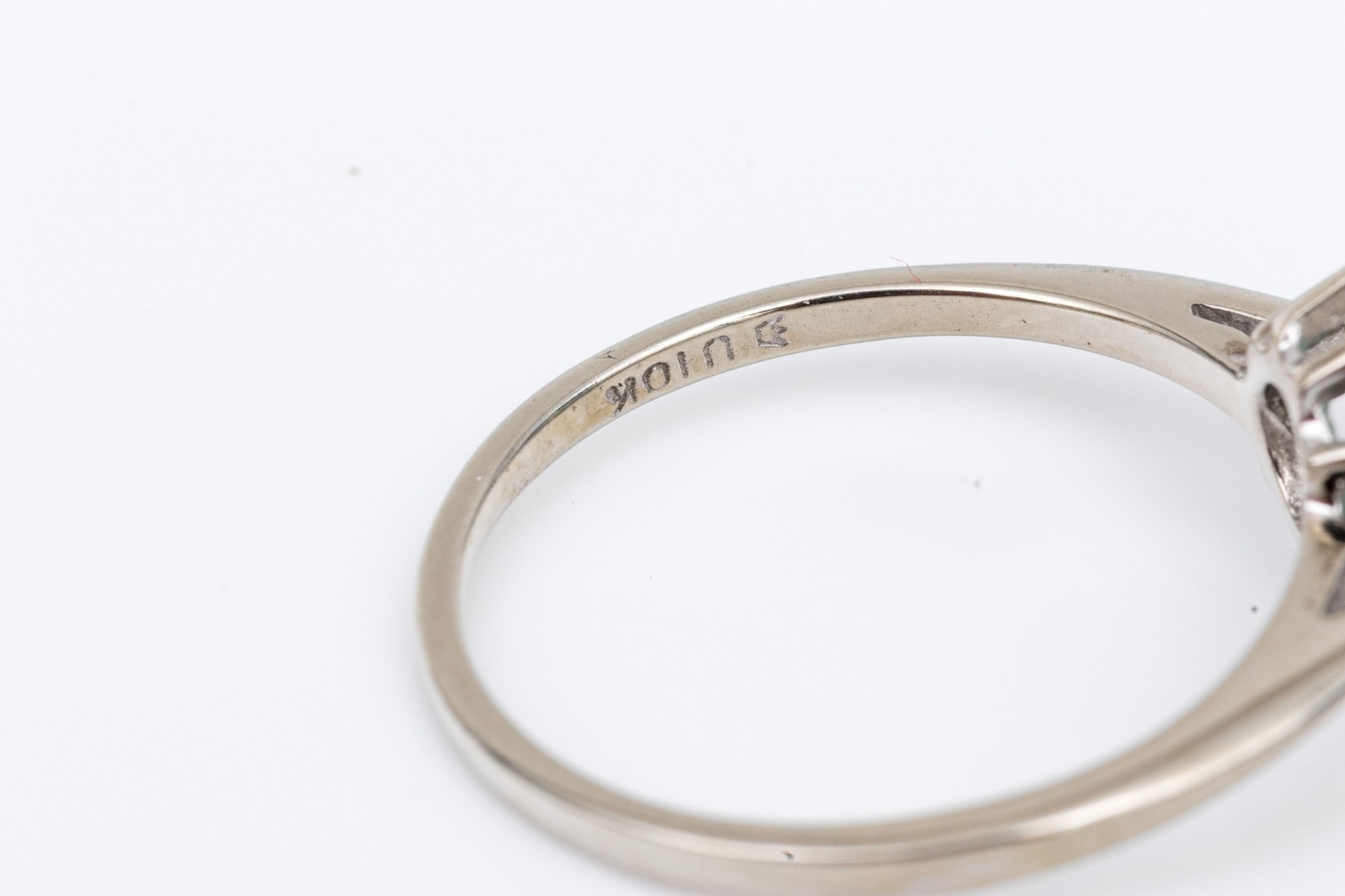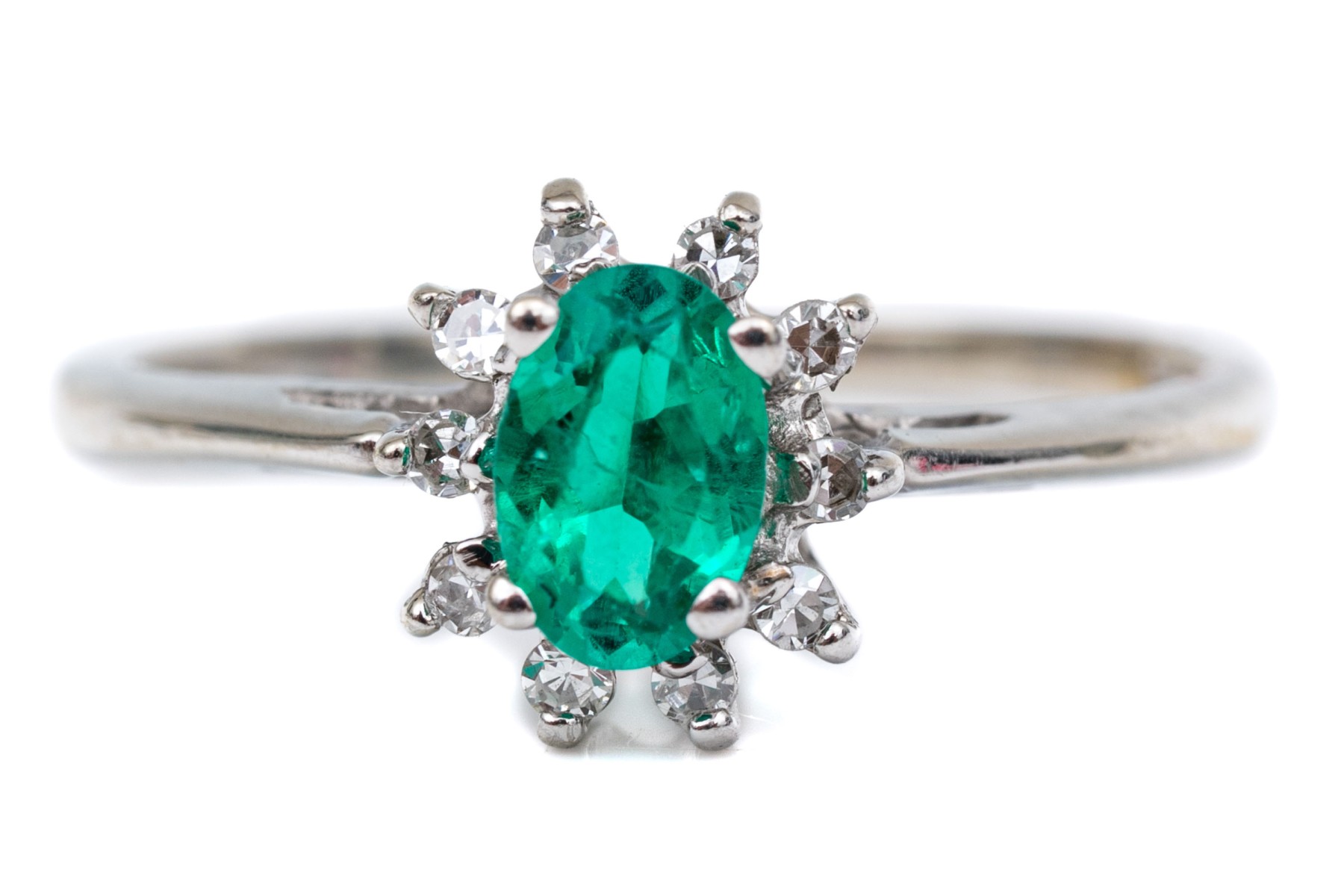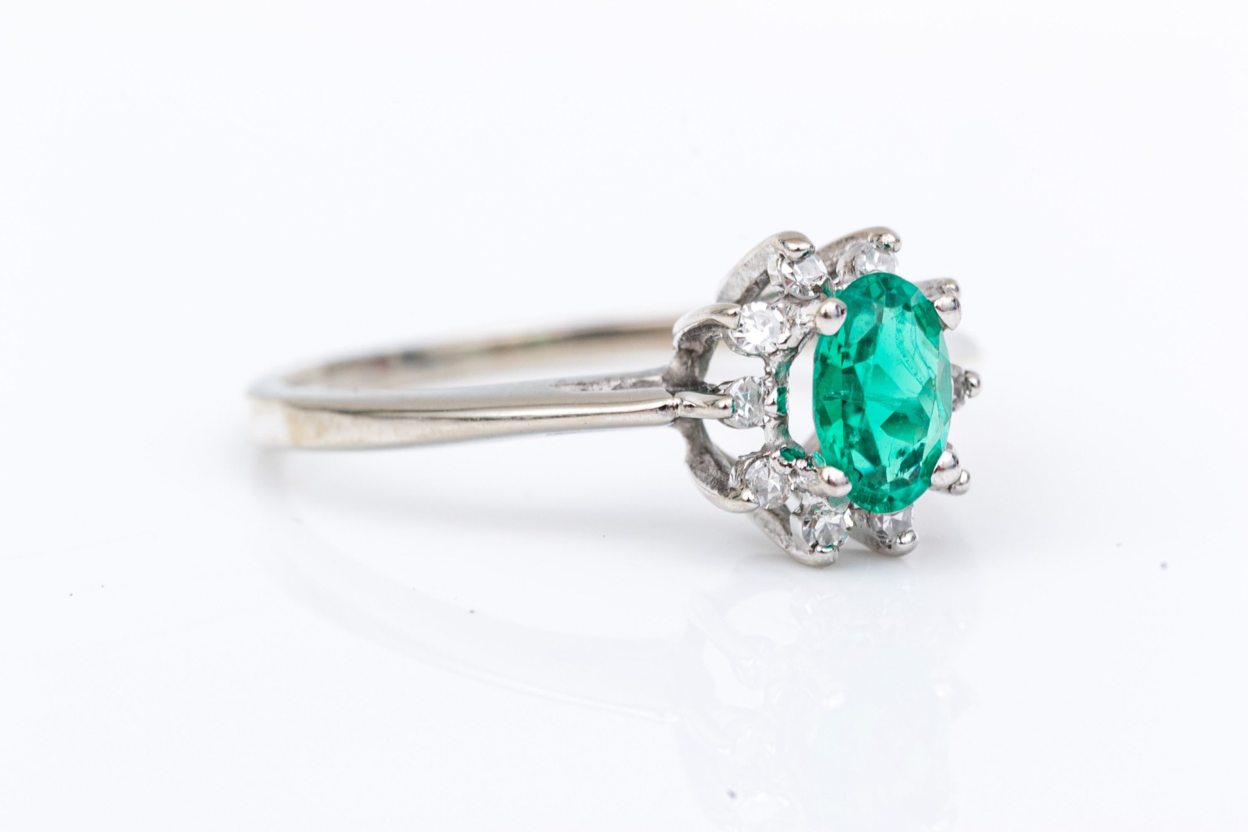 10k white gold striking blue green apatite and diamond halo ring, size 6.5. This interesting ring features a center oval faceted blue-green apatite, surrounded by a border of round faceted diamonds, app. 0.10 TCW, prong set