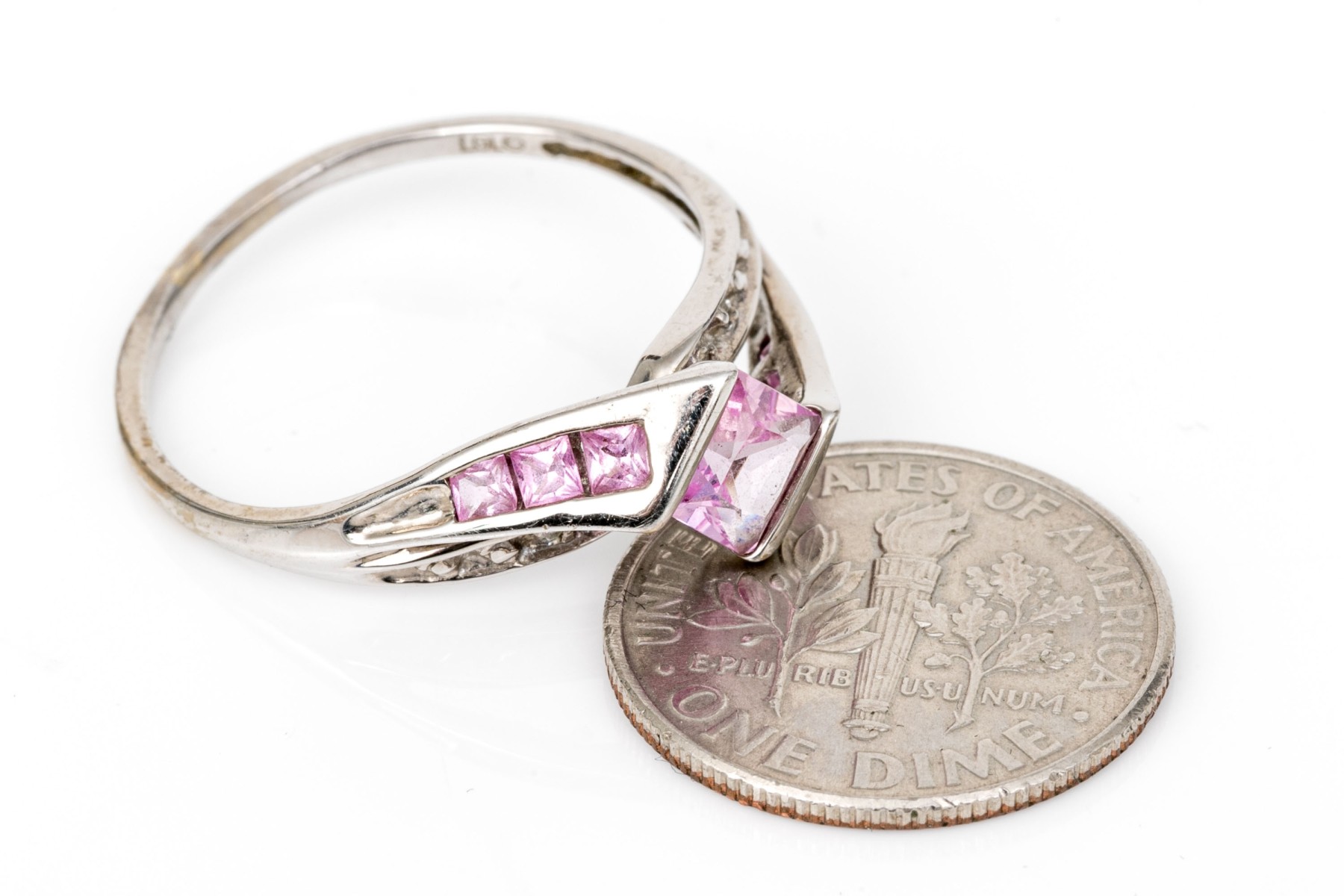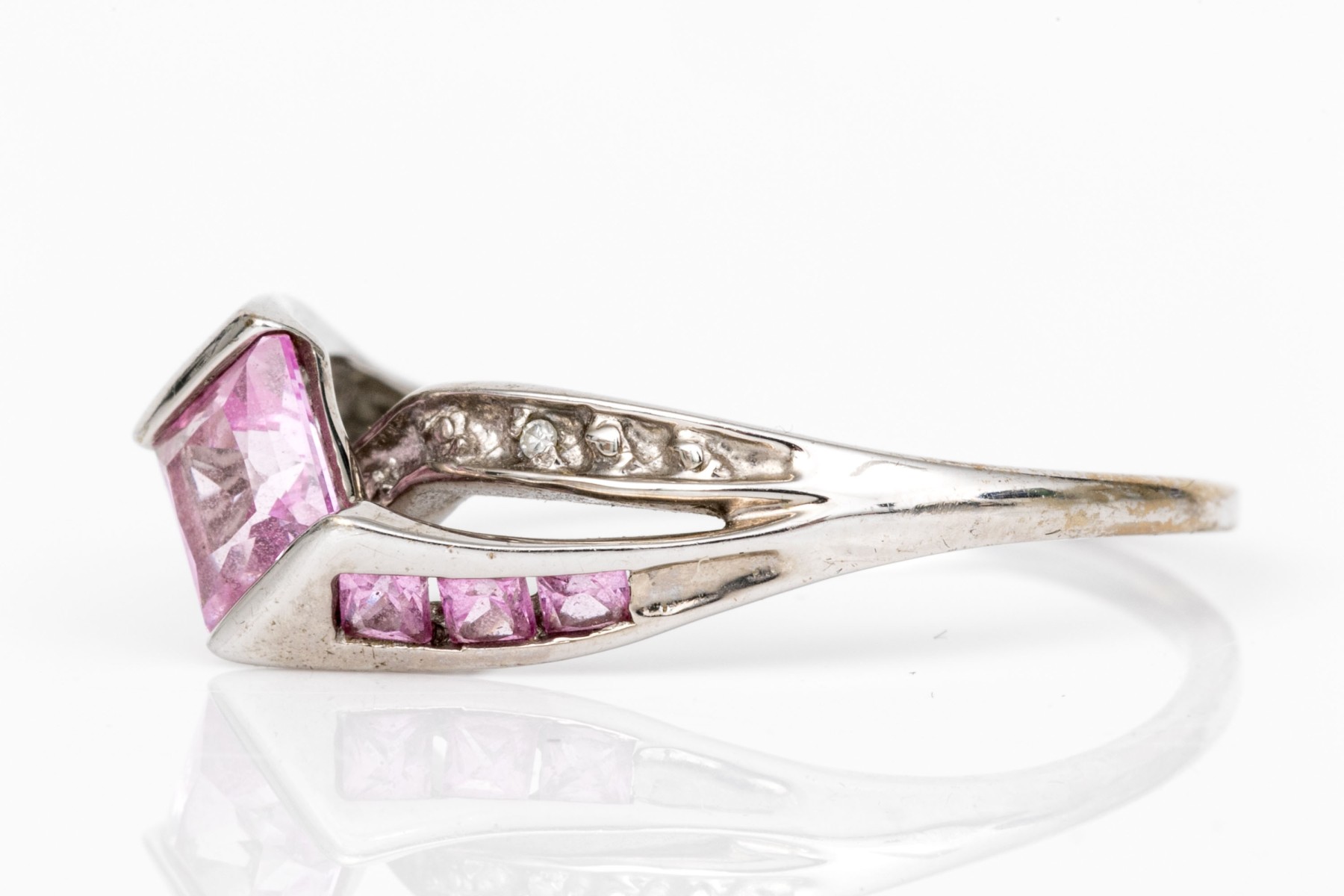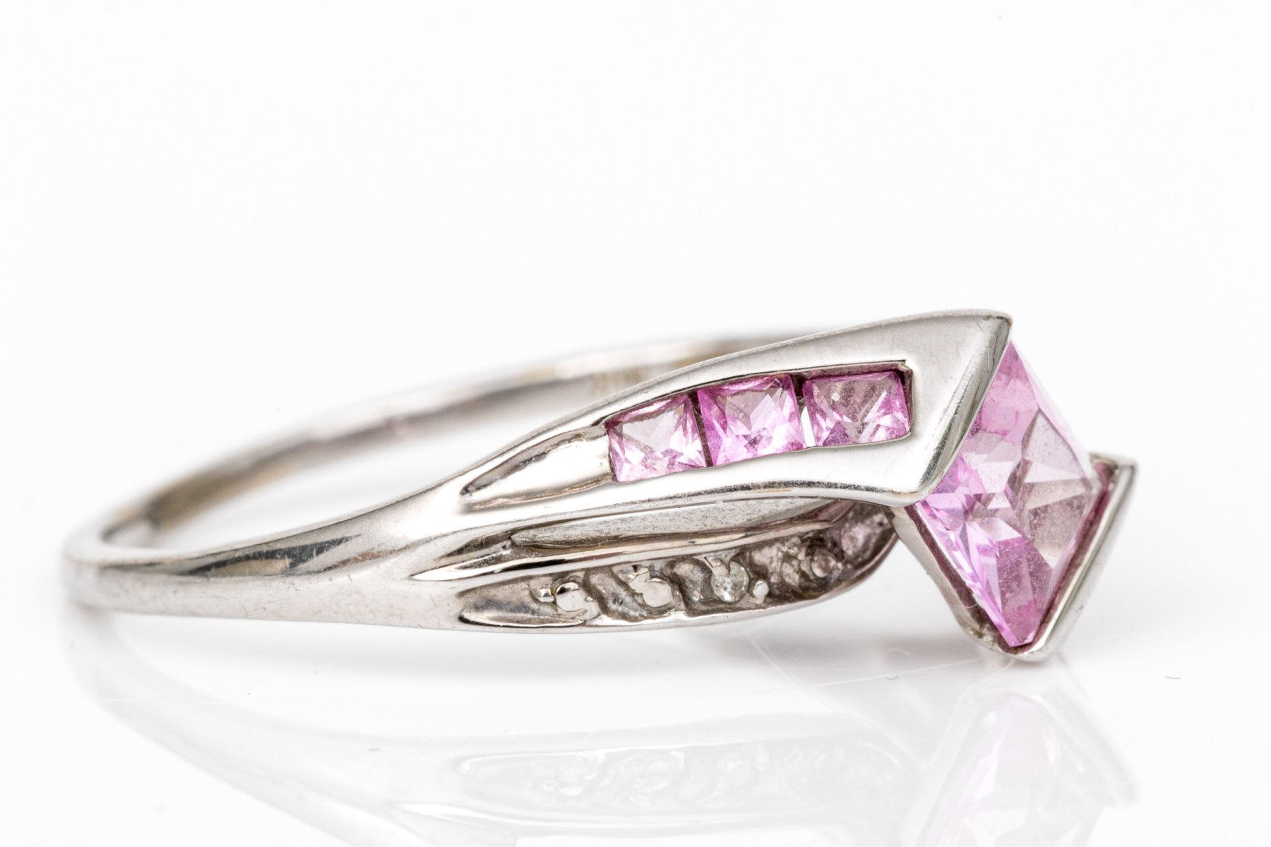 10k white gold synthetic pink and white sapphire set bypass ring, size 8.25