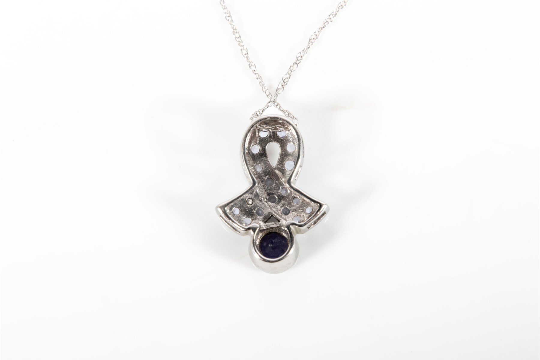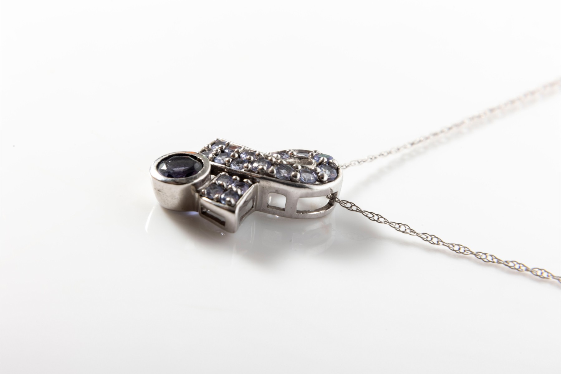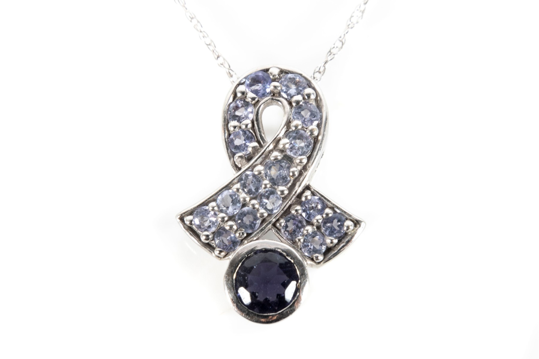 A pretty white gold necklace displaying a ribbon motif pendant with round tanzanites in bezel and prong settings, hanging from a fine double-link cable chain with a spring ring clasp.