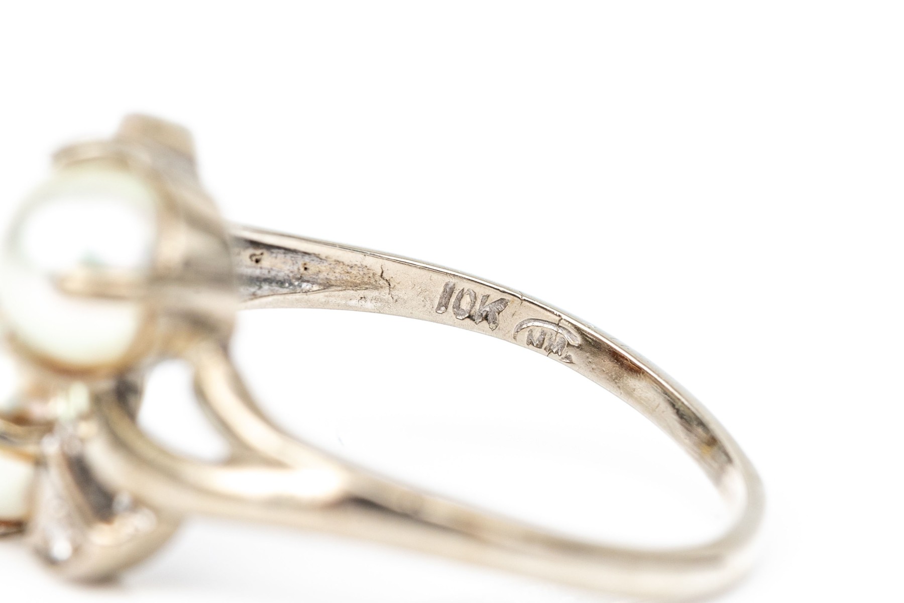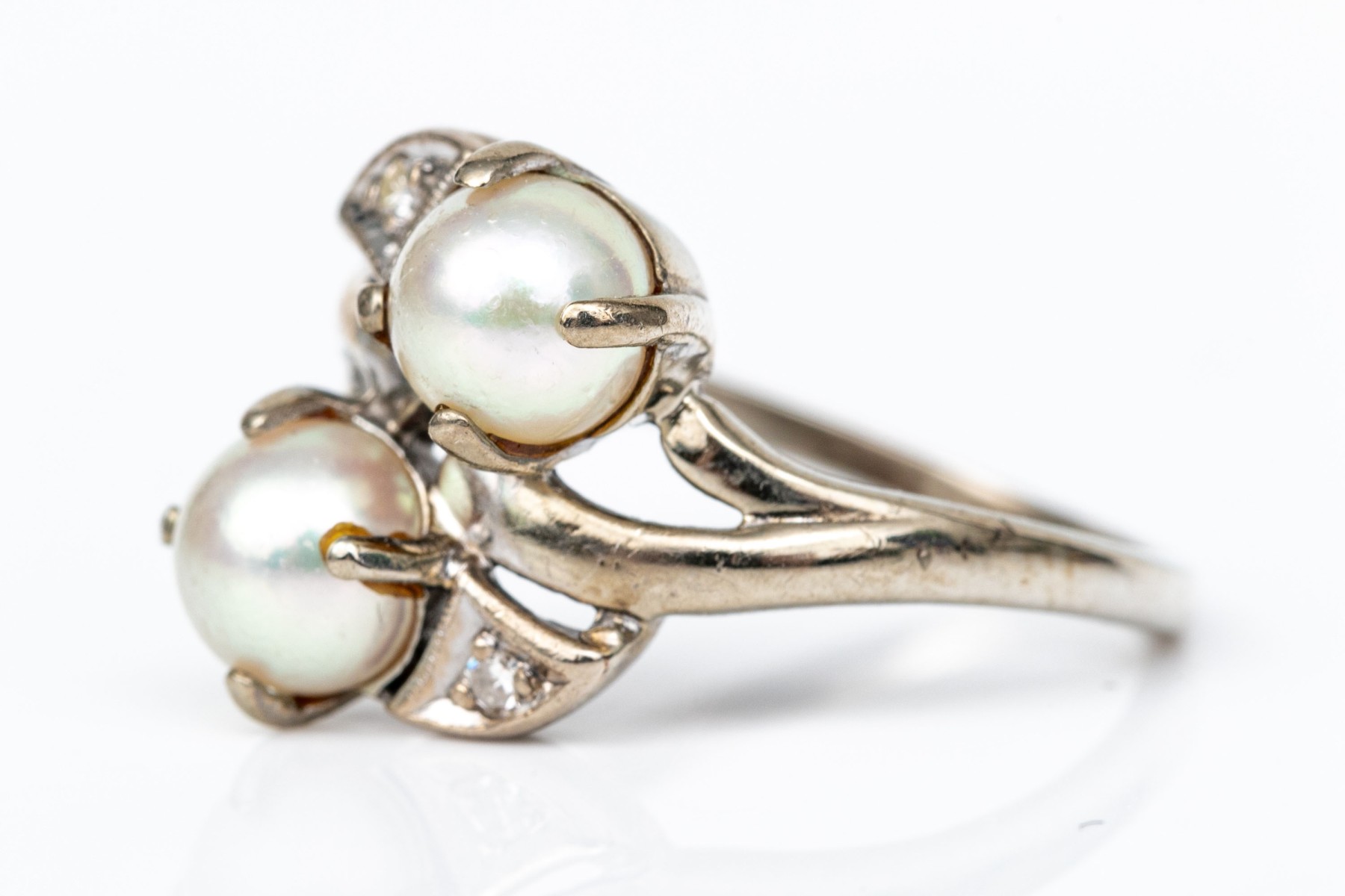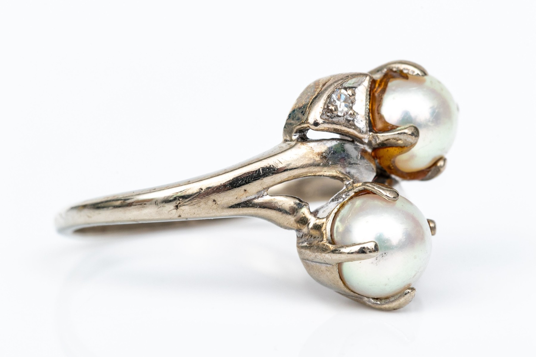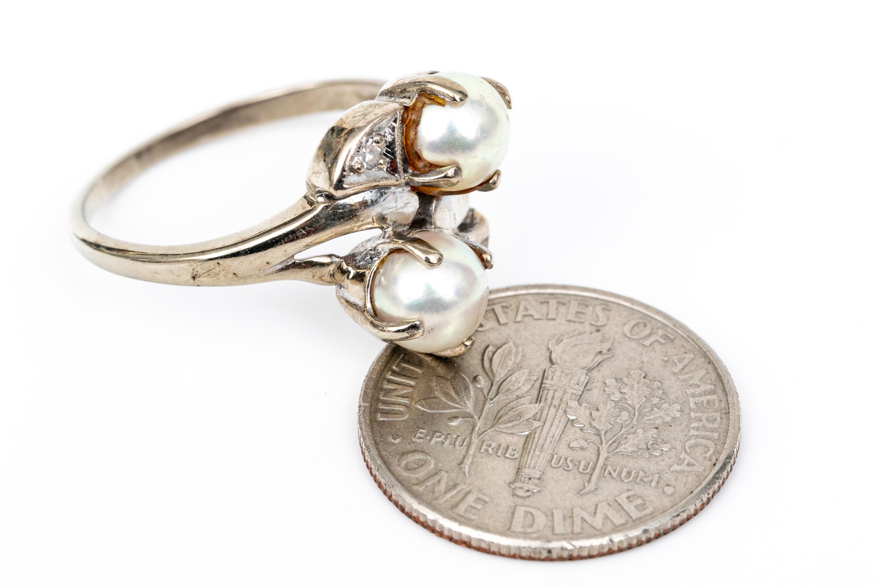 10k white gold vintage 5.5mm cultured pearl and diamond bypass ring, size 5.75, app. 0.02 TCW, prong set