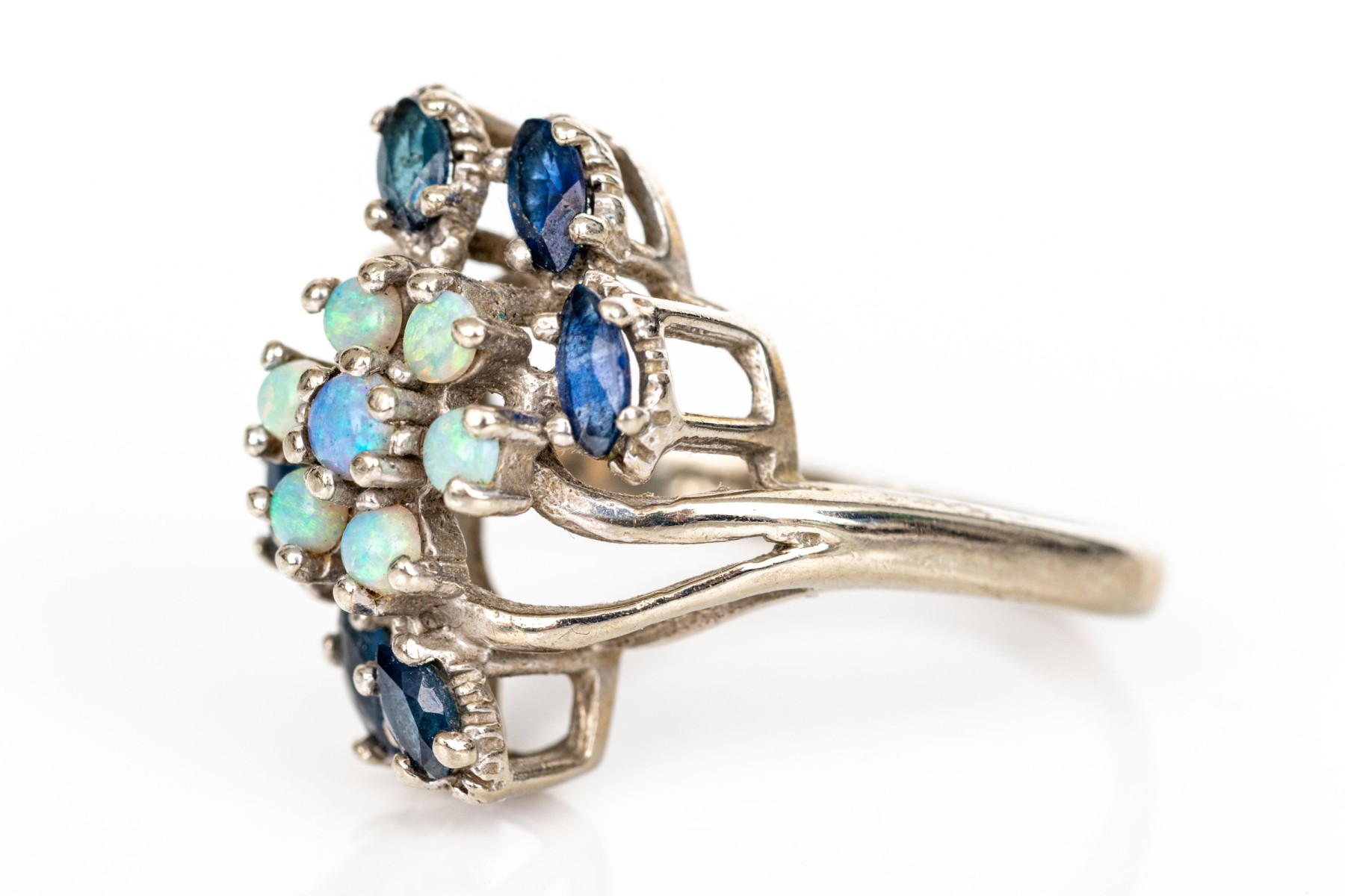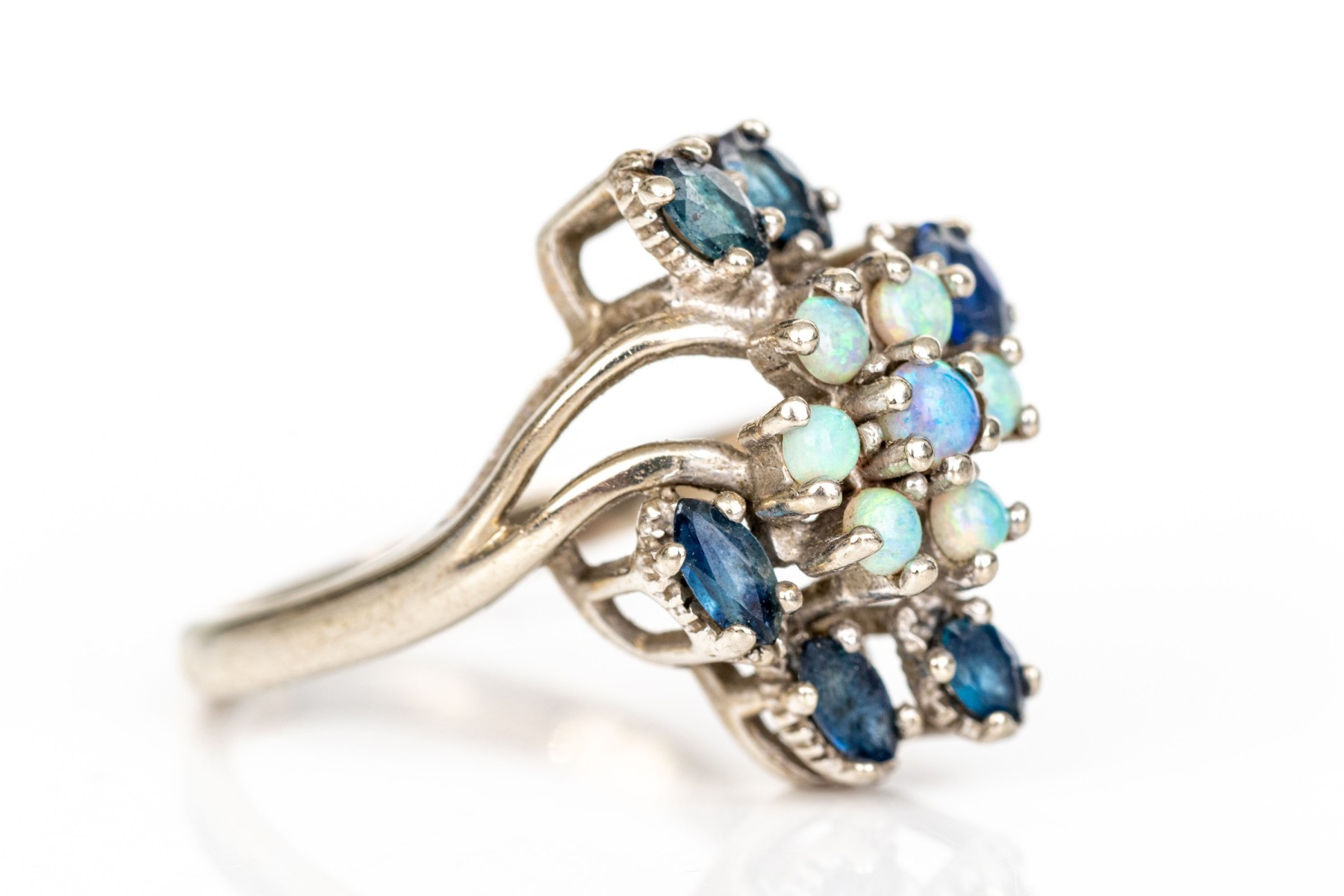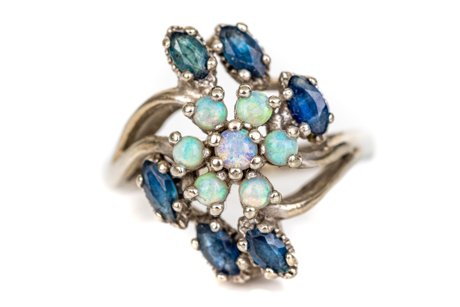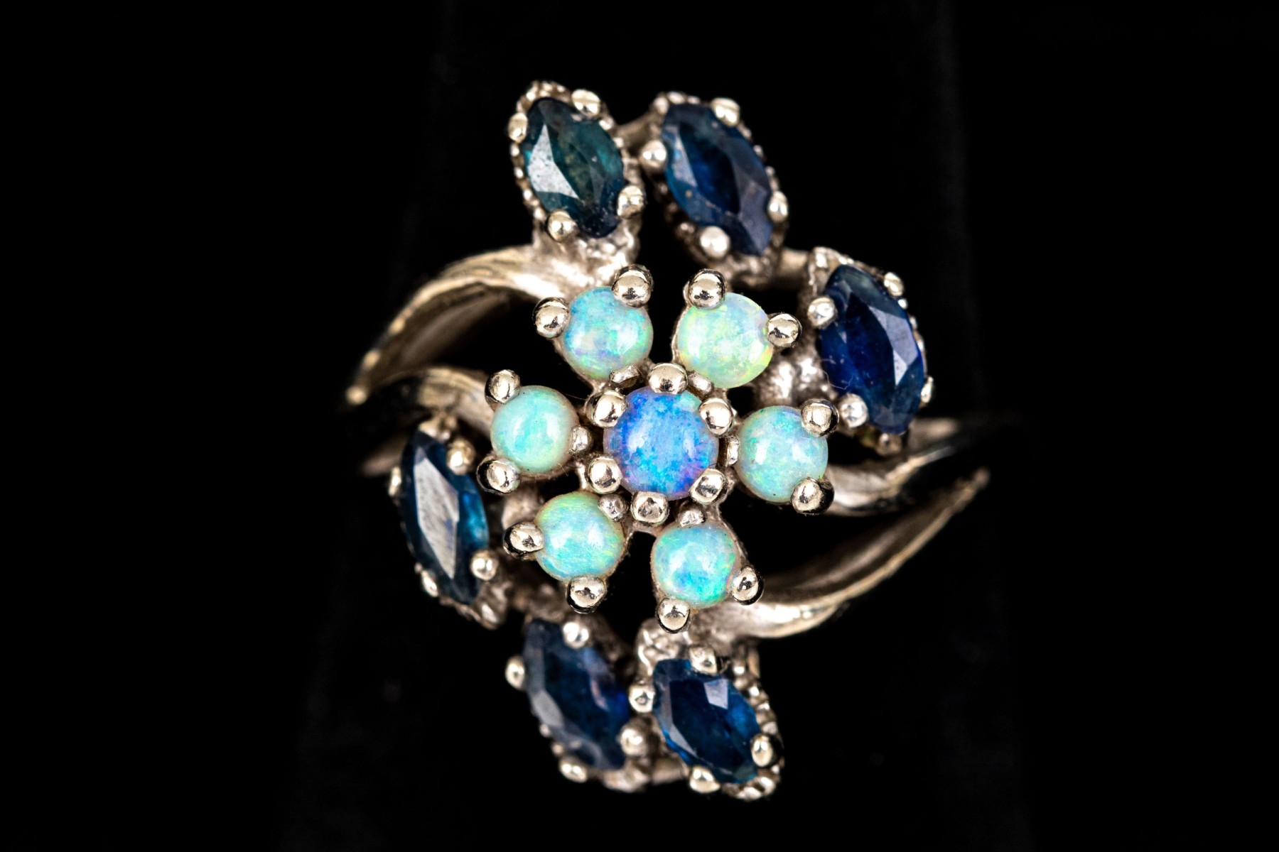 10k white gold vintage opal and blue sapphire cluster ring, size 6.75. This striking ring features a center cluster of round white opals, decorated with a border of marquise shaped blue sapphires, app. 0.24 TCW, prong set