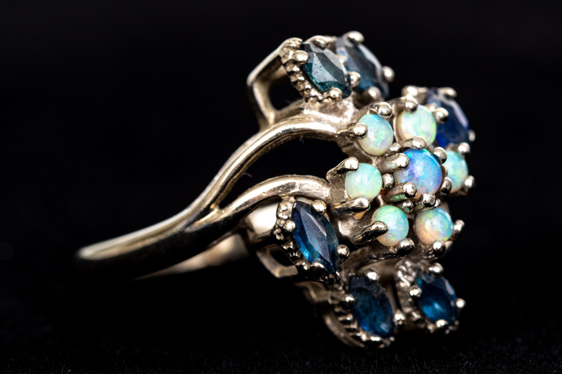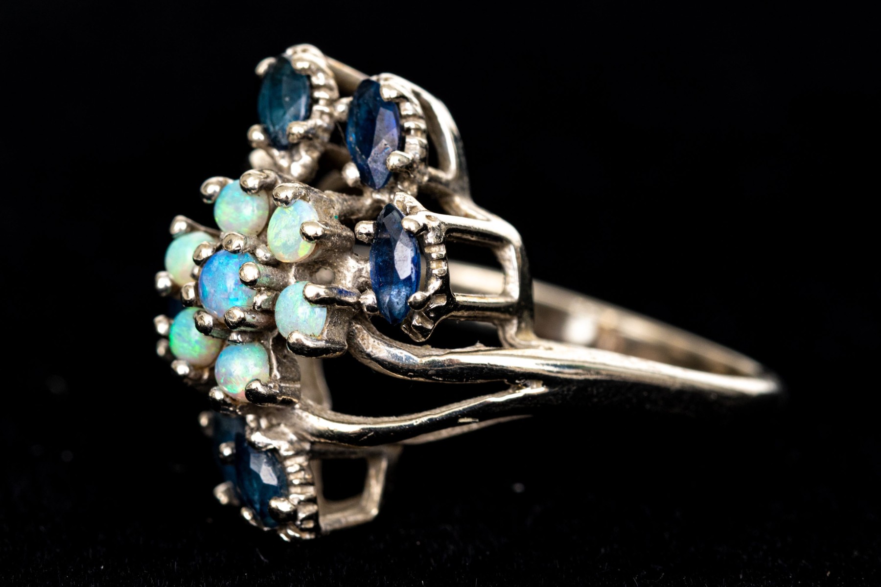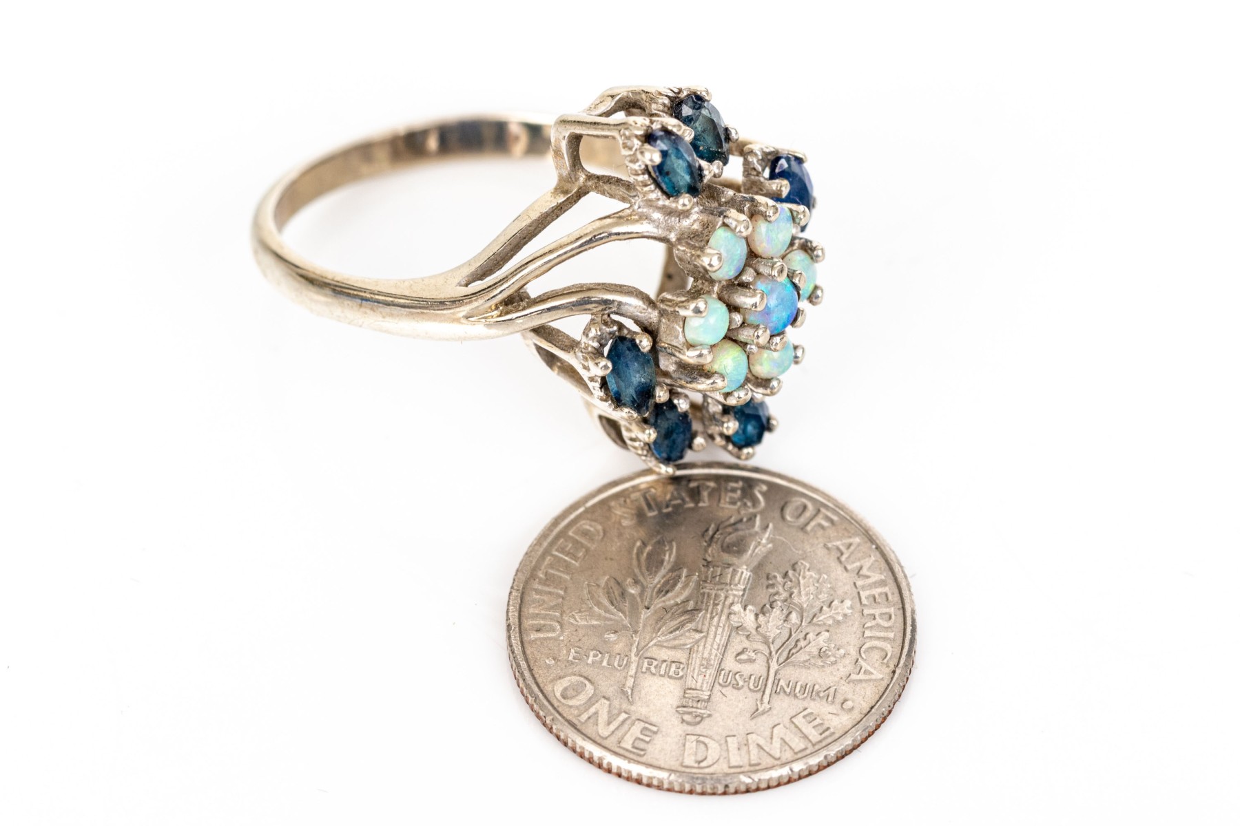 10k white gold vintage opal and blue sapphire cluster ring, size 6.75. This striking ring features a center cluster of round white opals, decorated with a border of marquise shaped blue sapphires, app. 0.24 TCW, prong set